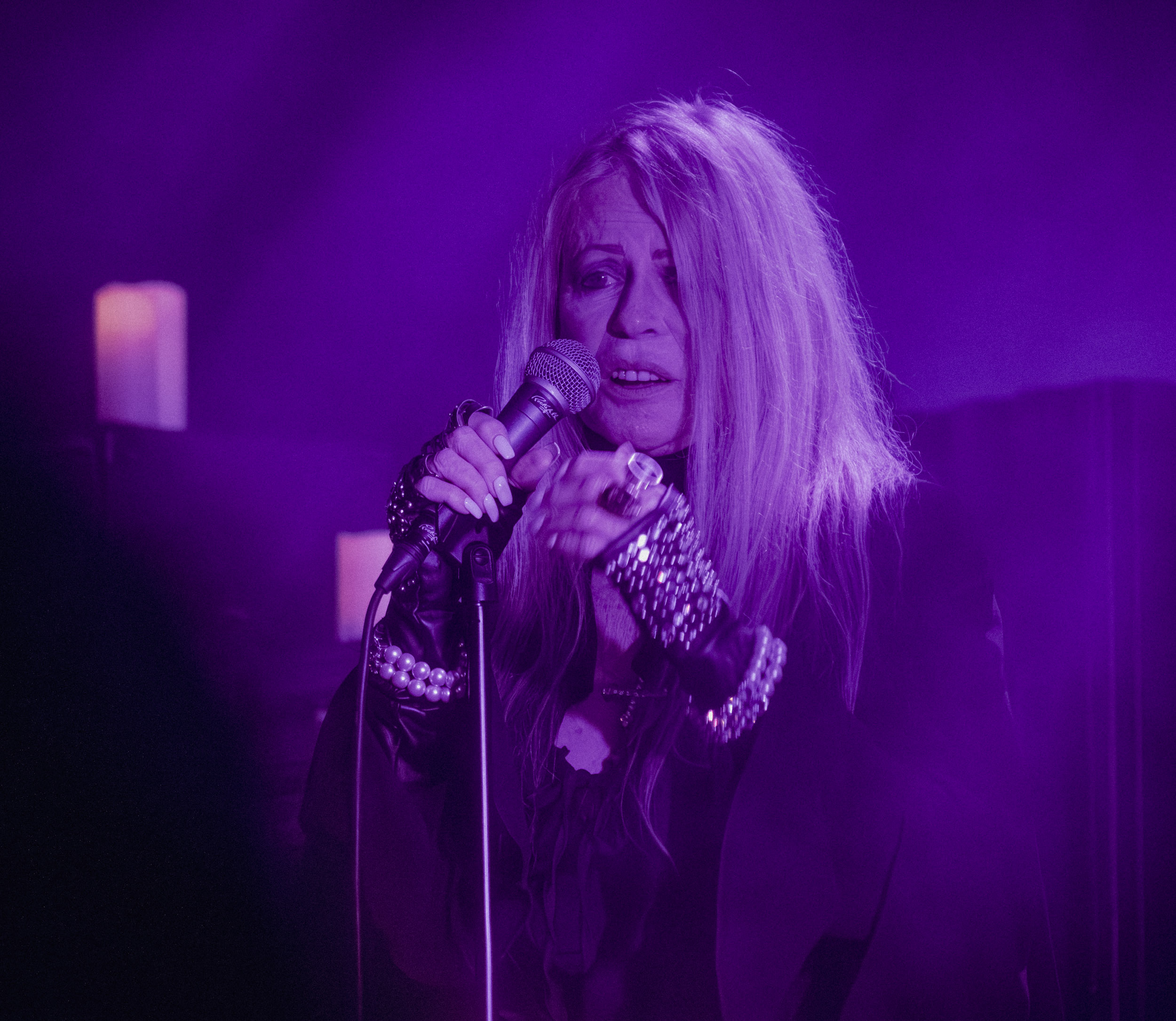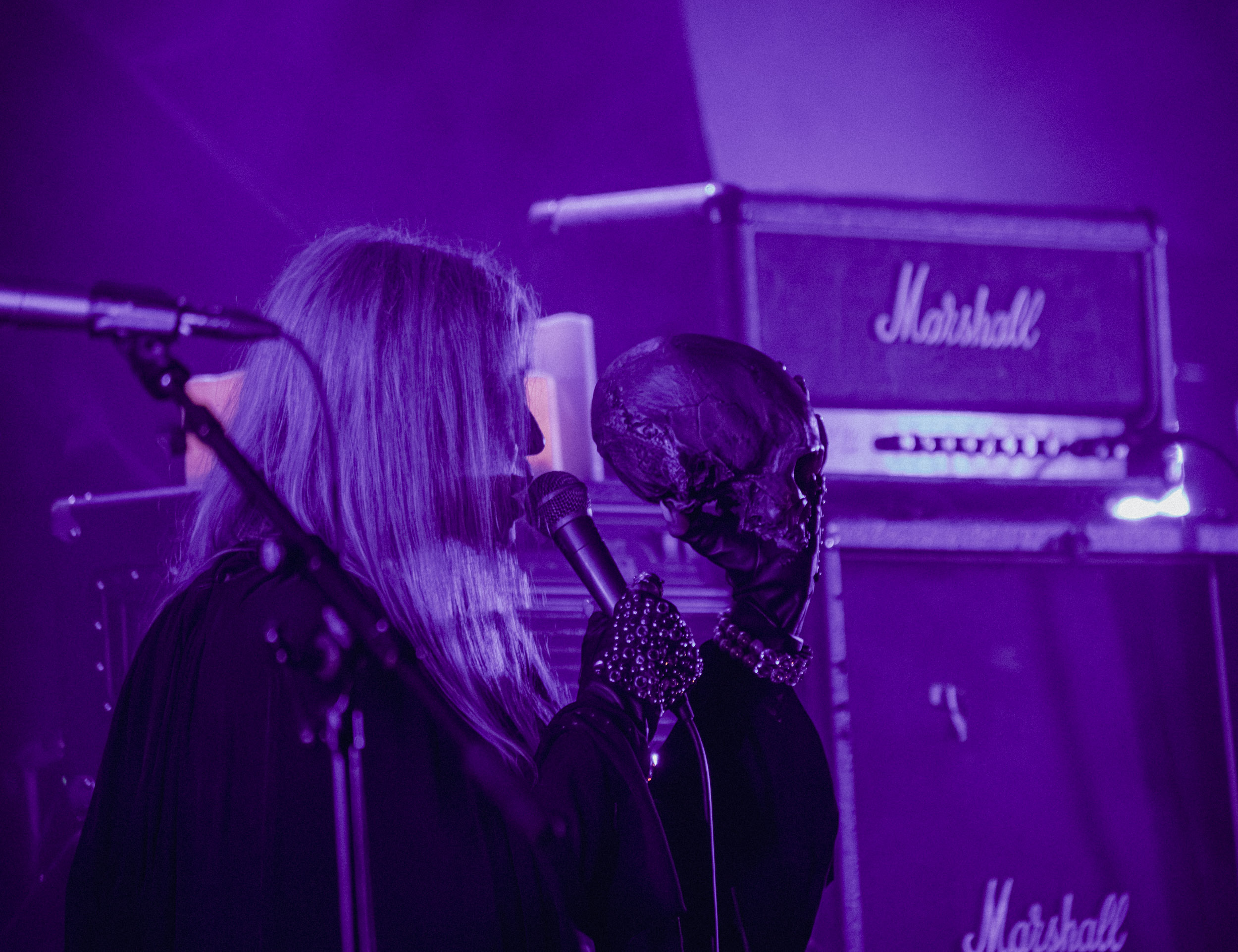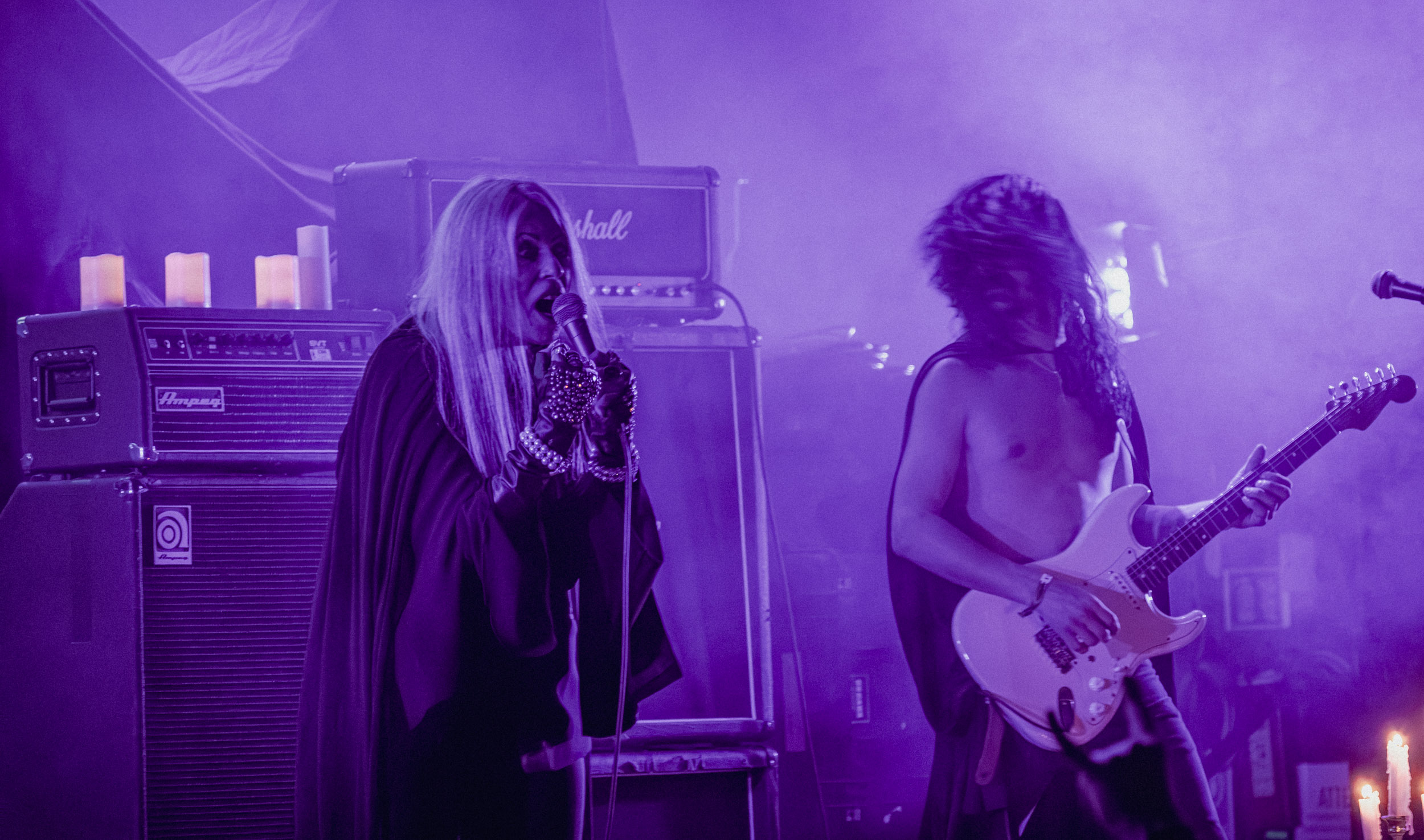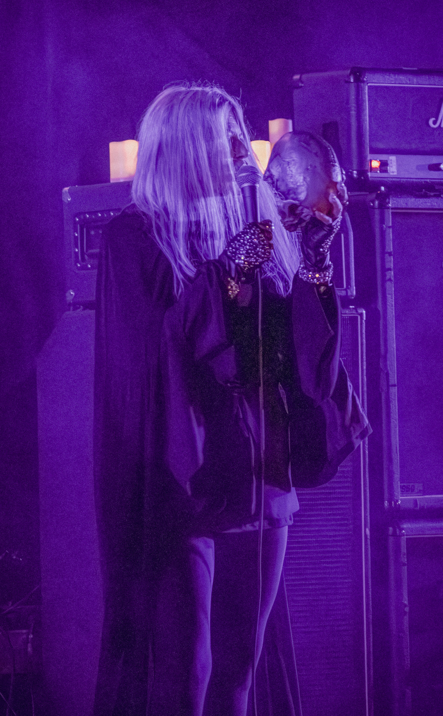 Au centre de la scène, Jinx Dawson s’impose immédiatement comme la grande prêtresse du sabbat. Drapée dans une tenue sombre, elle dirige la cérémonie avec un mélange de théâtralité et de charme vintage. Sa voix, étonnamment puissante, traverse sans difficulté le mur d’amplis et donne une dimension presque cérémonielle aux morceaux.
