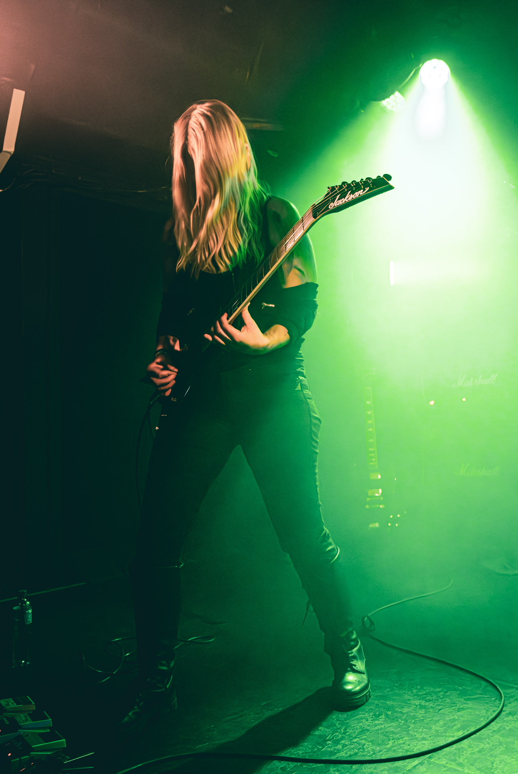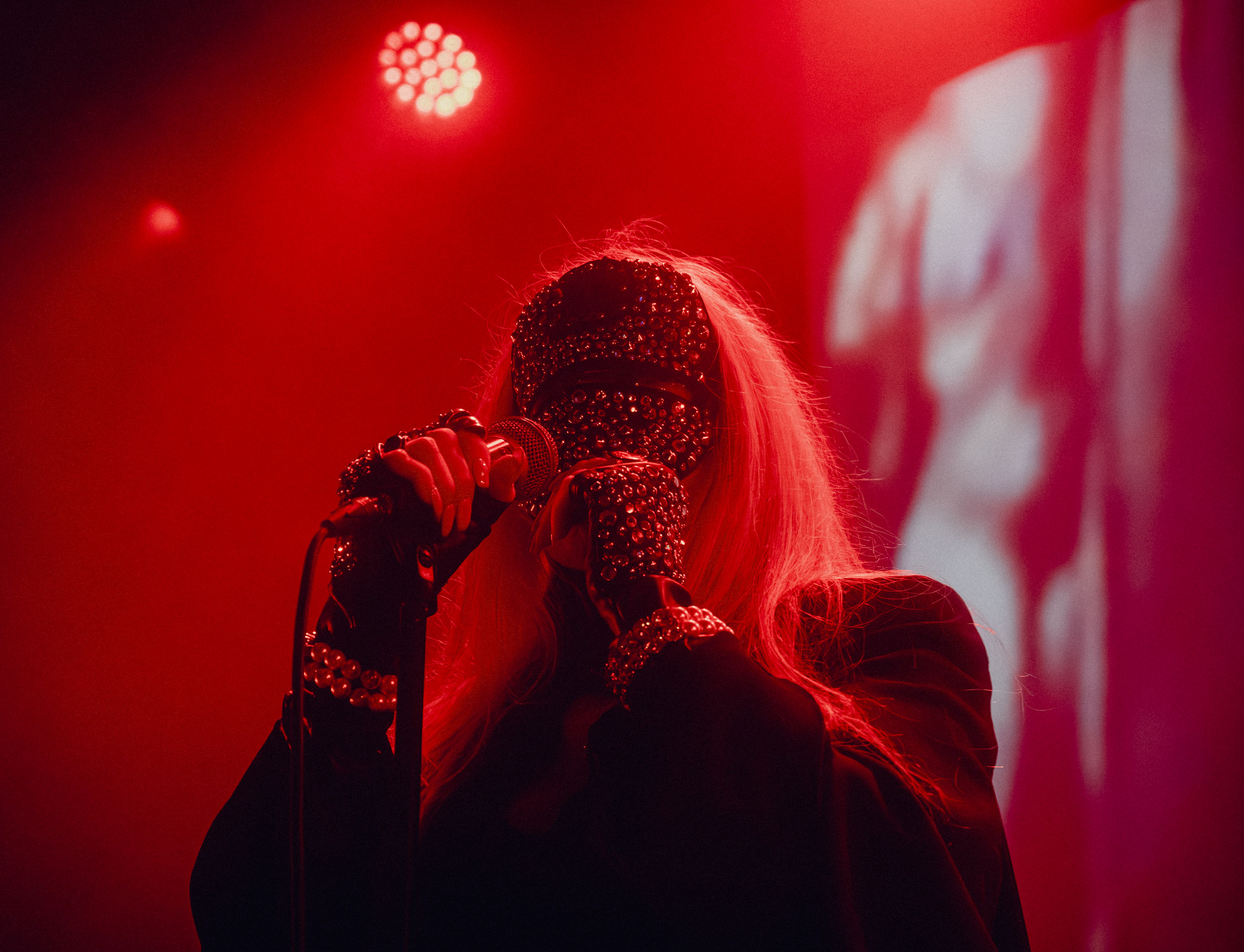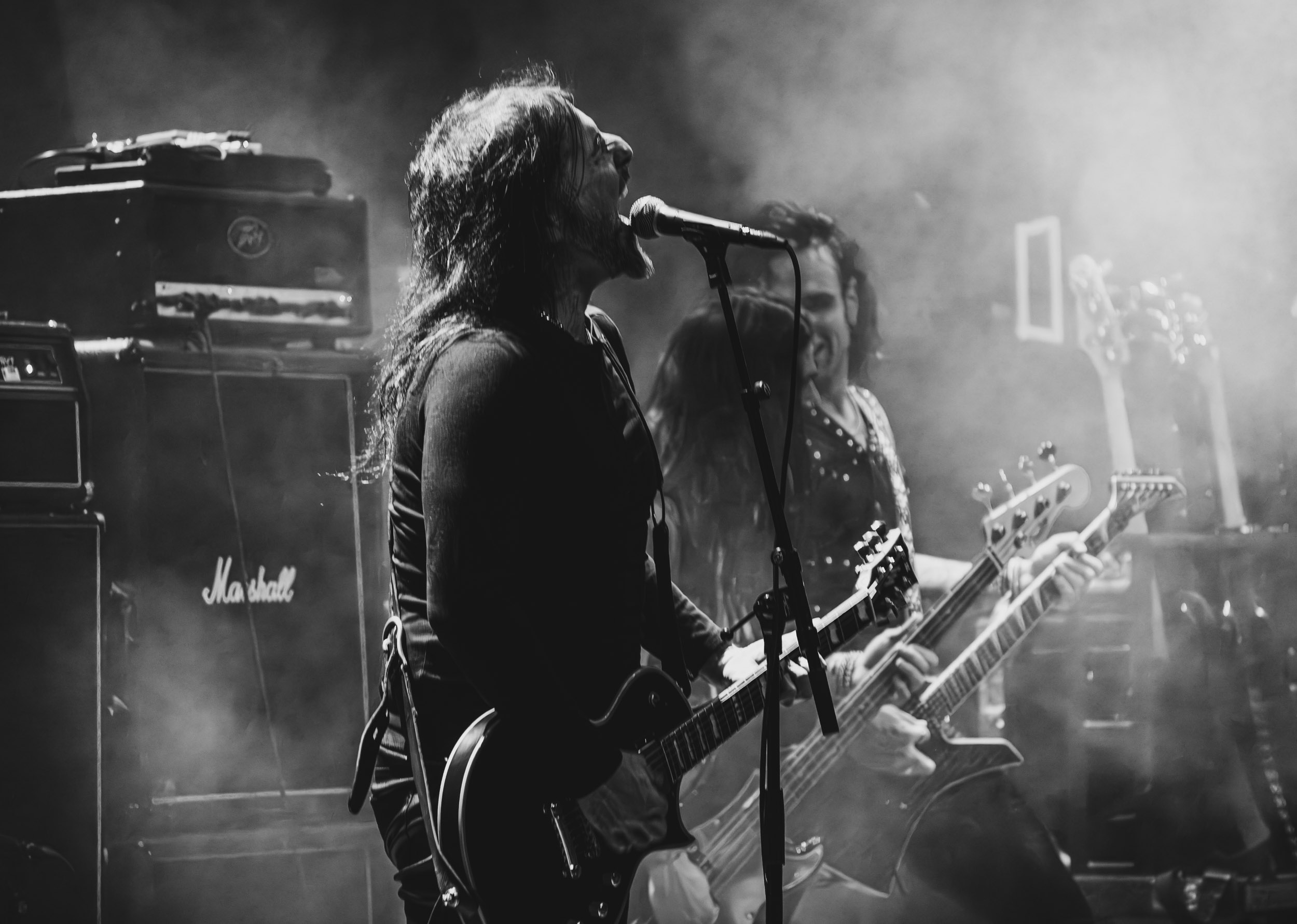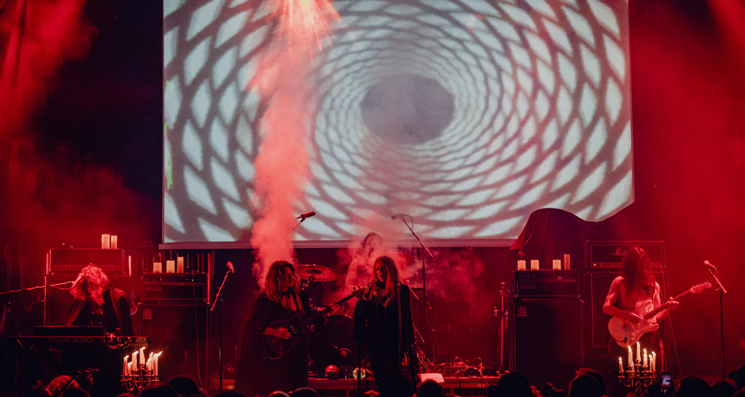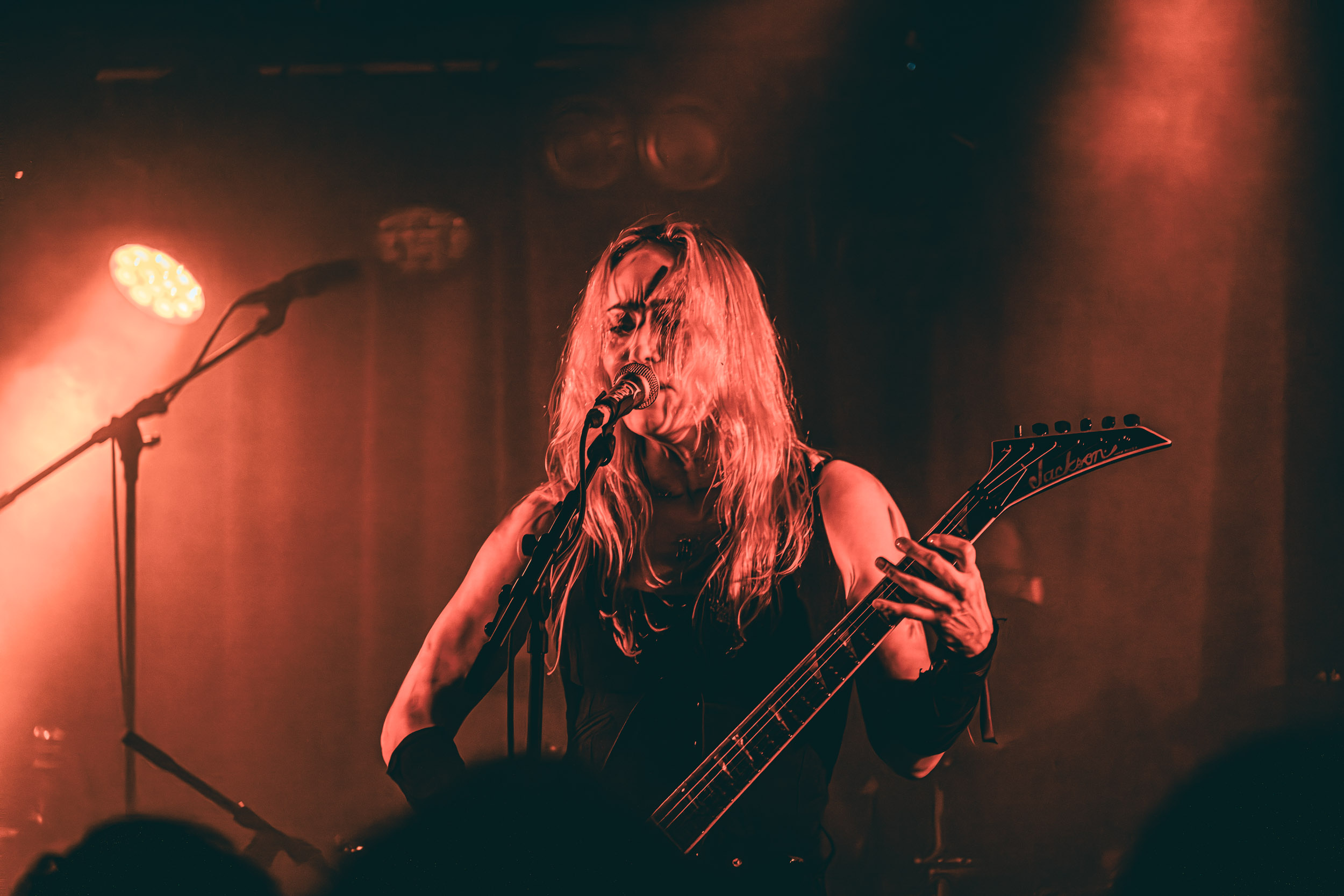 Au centre de la scène, Jinx Dawson s’impose immédiatement comme la grande prêtresse du sabbat. Drapée dans une tenue sombre, elle dirige la cérémonie avec un mélange de théâtralité et de charme vintage. Sa voix, étonnamment puissante, traverse sans difficulté le mur d’amplis et donne une dimension presque cérémonielle aux morceaux.