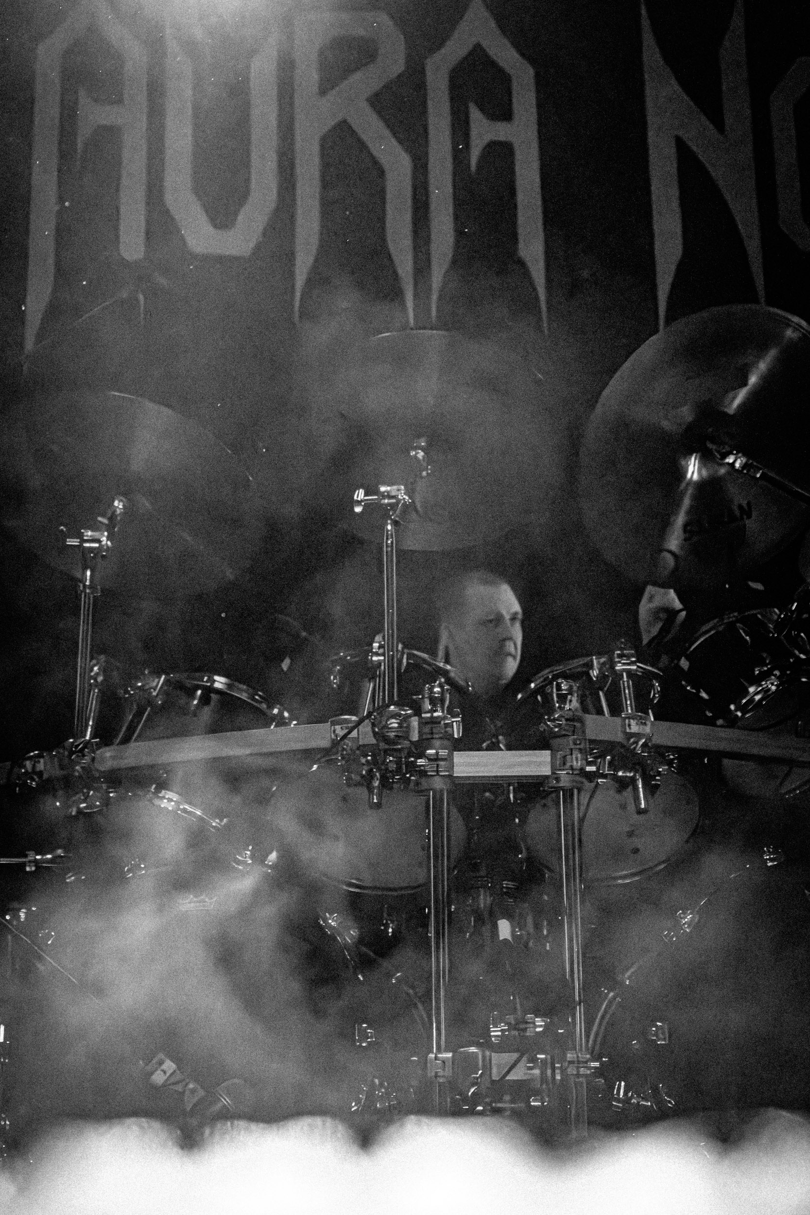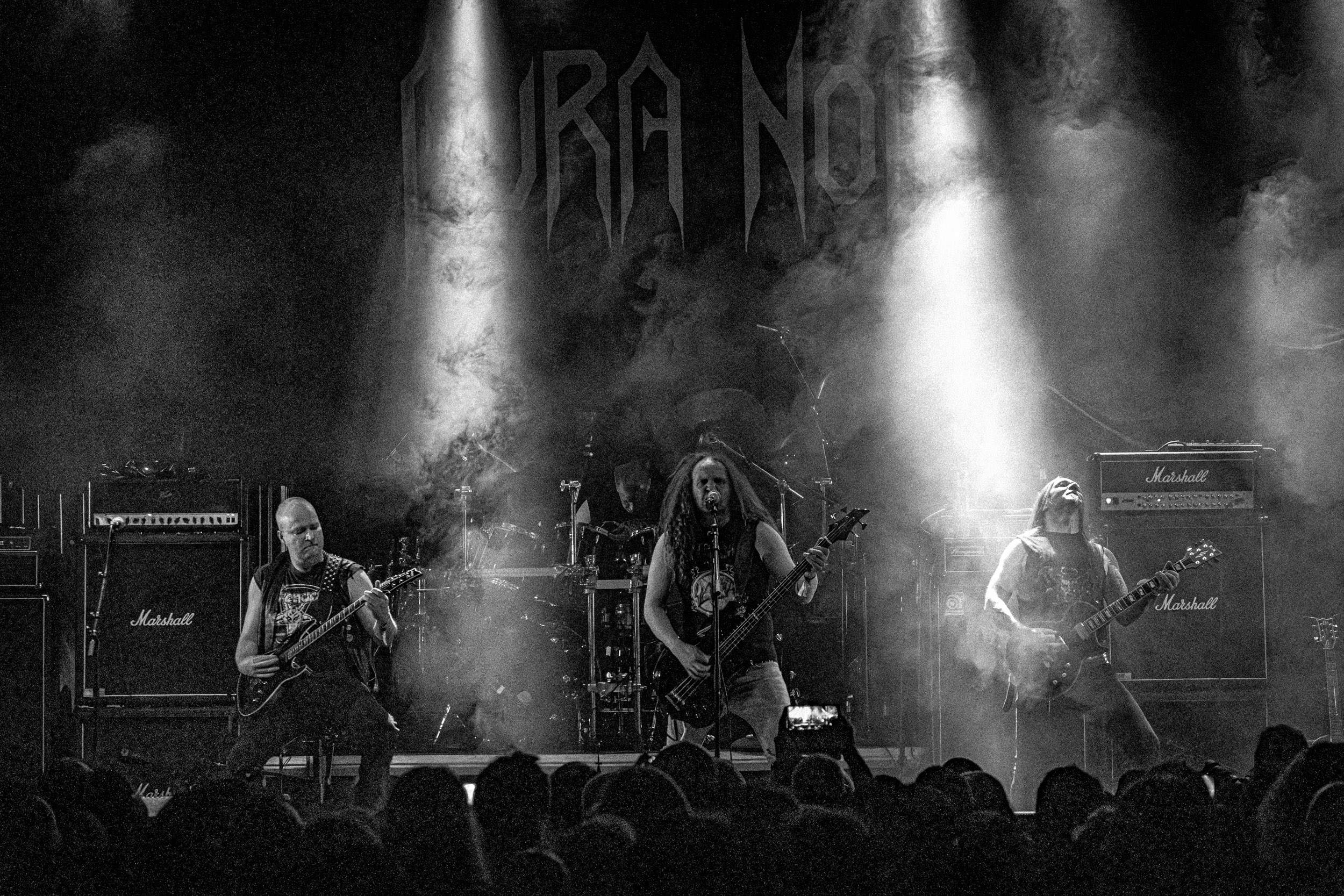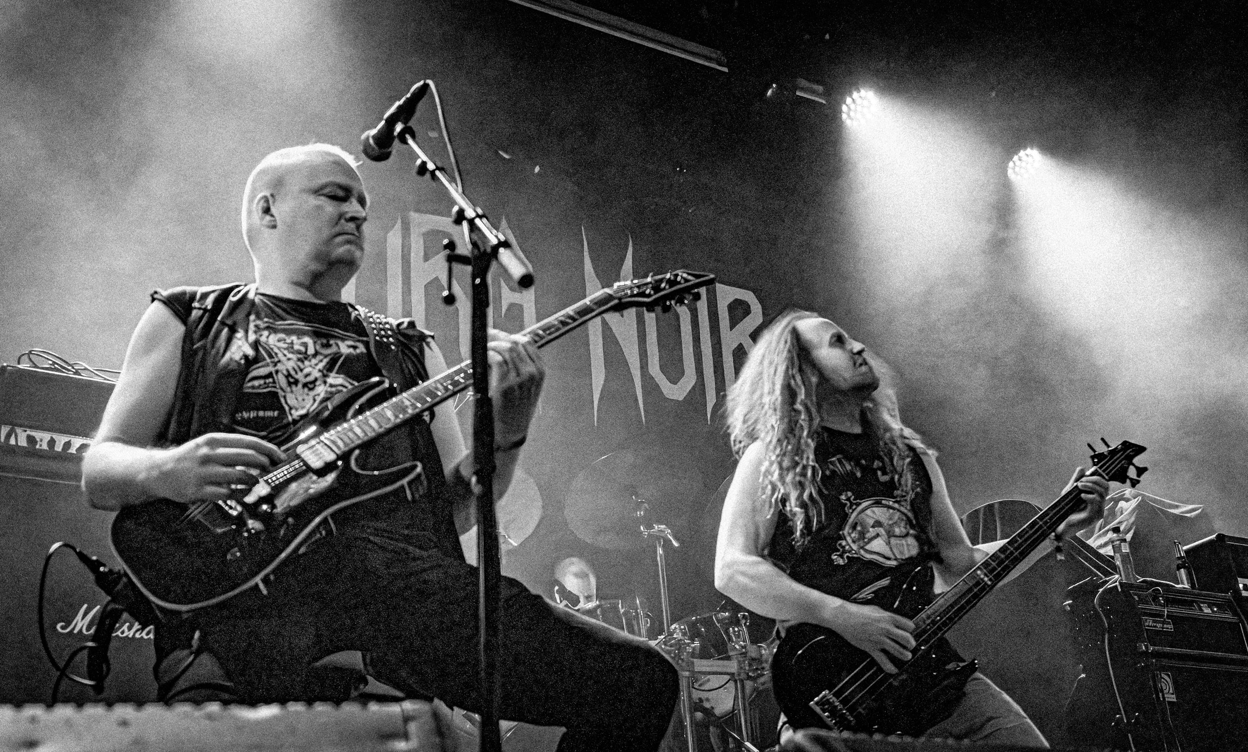 Aura Noir : Respecté dans le milieu black old school, Aura Noir est issu de la grande époque — comprenez les années 90 — mais propose une version du genre dopée au speed/thrash dont les influences, vénérées, justement, par les amateurs de black metal, remontent notamment à Venom ou encore à Motörhead. Avec un mur de Marshalls comme décor scénique et les T-shits de Venom et de l’EP Haunting the Chapel de Slayer que portent Aggressor et Apollyon, on obtient des images qui à elles seules montrent dans quel monde Aura Noir navigue et pourraient presque suffire en guise de compte-rendu de ce concert. Speed sans concessions et sans temps morts, façon machine de guerre, titres efficaces lorgnant vers le heavy, le set file à vitesse grand V pour le plus grand bonheur des amateurs de brutalité primaire, les deux frontmen assurant le chant à tour de rôle. [Oli]