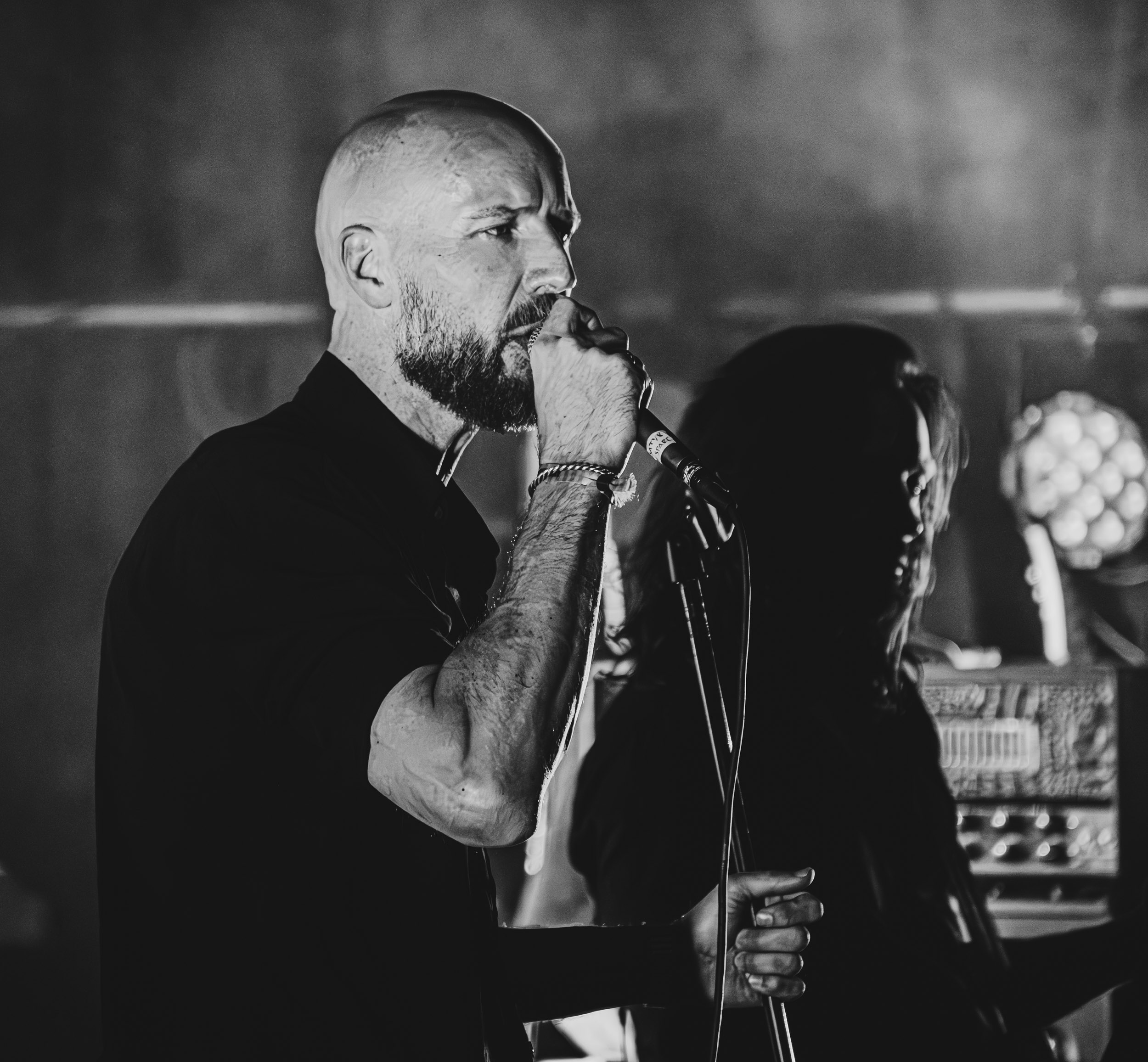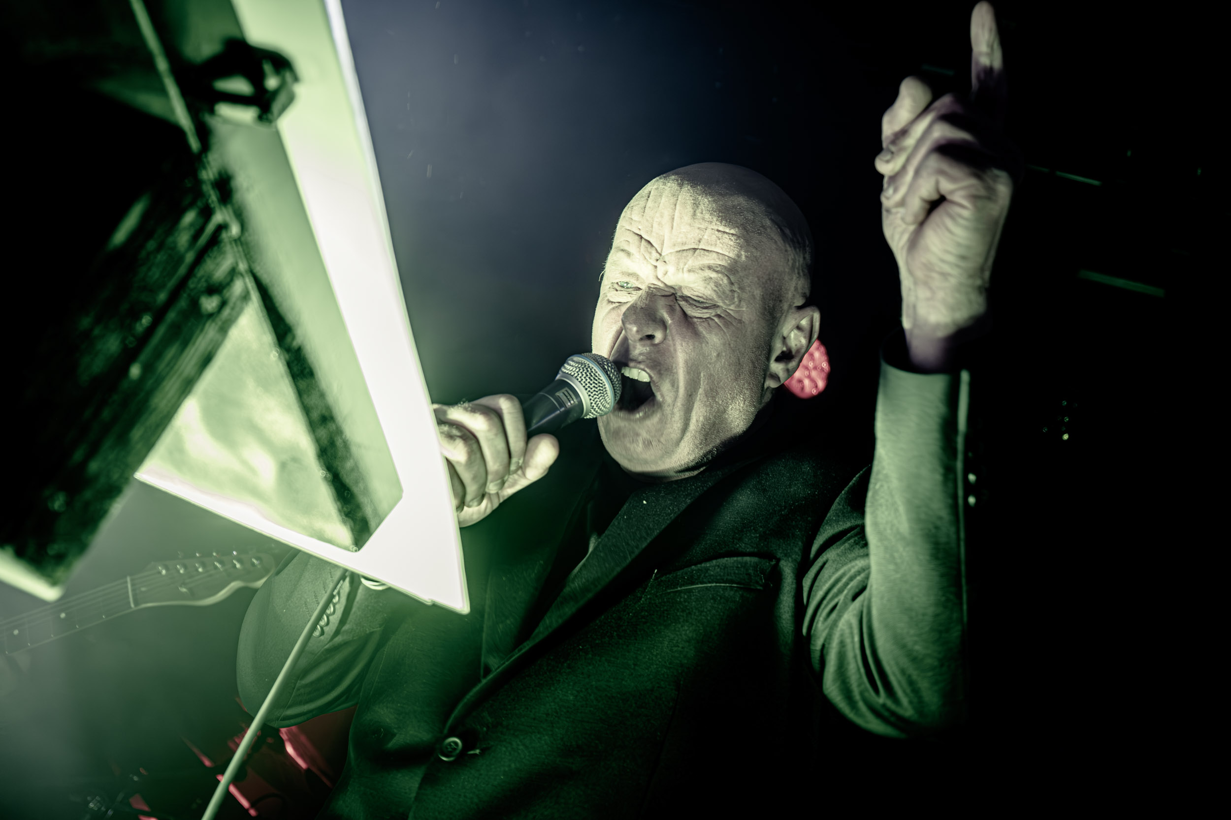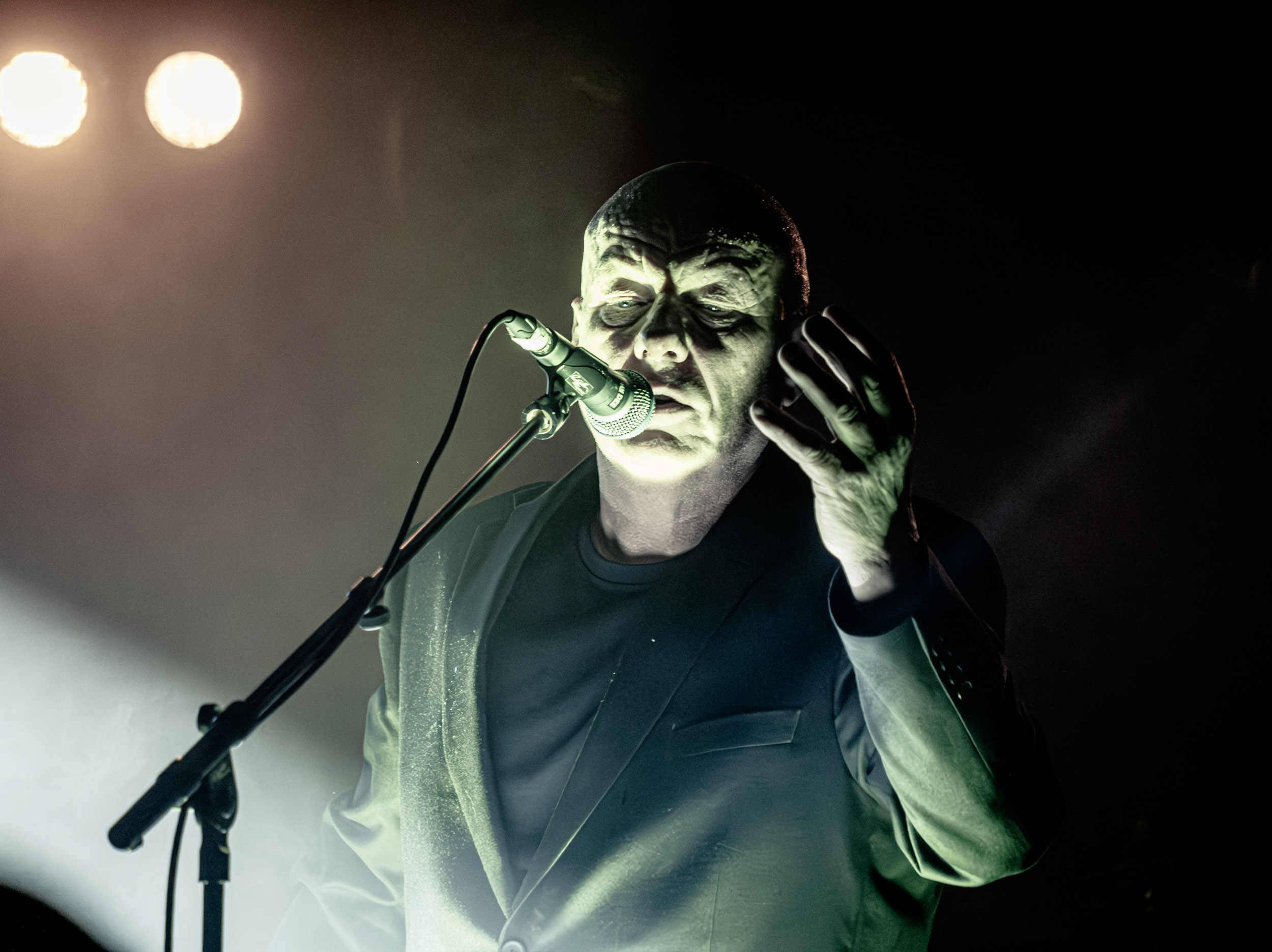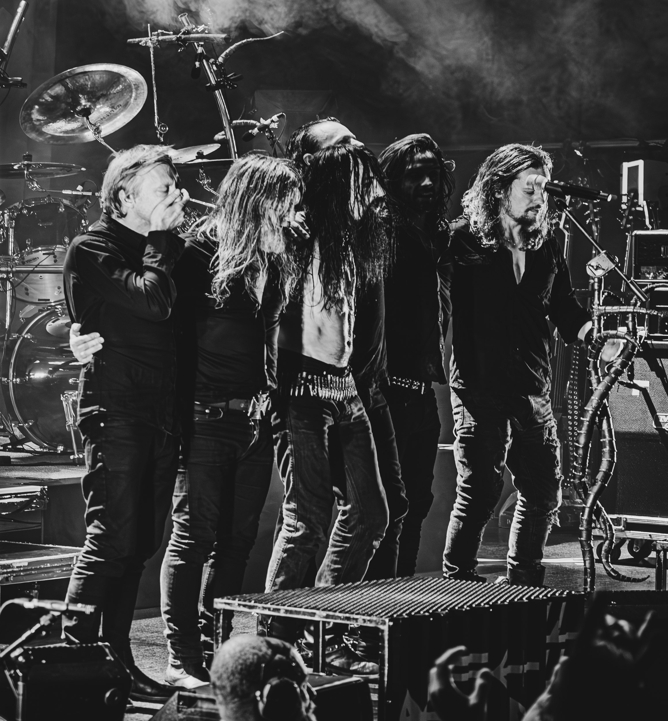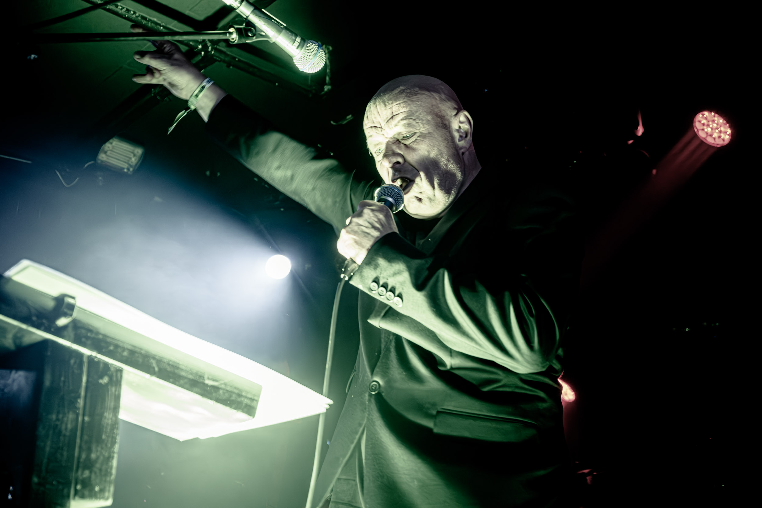 Schwein : En ce troisième jour de festival, en guise de seconde ouverture, c’est une nouvelle prestation pour le moins étonnante qui nous attend du côté de chez John Dee avec Schwein — qui, en dépit de son nom signifiant « cochon » en allemand, est bel et bien originaire d’ici même à Oslo. Le groupe tire en fait son nom du surnom de son créateur, Svein « Schwein » Solberg. Ses comparses et lui jouent en tout cas allègrement sur cette ambiguïté, dont ils profitent pour servir aux curieux de l’Inferno une dose de Neue Deutsche Härte — ou plutôt, ici, Neue Norge Härte — qui évoque Rammstein ou Eisbrecher, revisitée à leur façon, c’est-à-dire à la sauce black metal nordique. Le black metal industriel étant par nature un genre complexe à retranscrire sur scène, Schwein y met les grands moyens, son line-up live intégrant pas moins de deux claviéristes et trois guitaristes ! En comptant en plus les autres musiciens, dire que l’espace scénique est bien occupé est un euphémisme… Schwein, l’homme, n’a cependant pas besoin de s’agiter et de courir partout pour imposer sa présence. Debout derrière un pupitre et vêtu d’une élégante veste de costume noire, il se place en orateur dominant son audience, assénant un discours en vocalisations hargneuses que viennent compléter des expressions qui le sont tout autant et sa façon de jouer des mains. En plus de cette vindicte apparente, son visage très marqué au sens strict comme figuratif, que j’ai l’occasion d’observer de près dans le pit, témoigne d’un vécu qui doit tout autant l’être… Il n’en fallait pas moins pour véhiculer des thématiques quant à elles proches d’un Ministry — comme cela est souvent le cas dans le metal indus. L’introduction du set, une version détournée de God Save the Queen, annonçait la couleur à ce niveau. Bien que n’ayant pas accès à son contenu textuel, je ne doute pas une seconde que les politiques du monde entier doivent en prendre pour leur grade ! Schwein livre un show surprenant et déroutant, dans le bon sens des termes, qui passe toutefois sans s’arrêter et arrive vite à son terme, ce qui a de quoi laisser certains sur leur faim. [Ségolène]