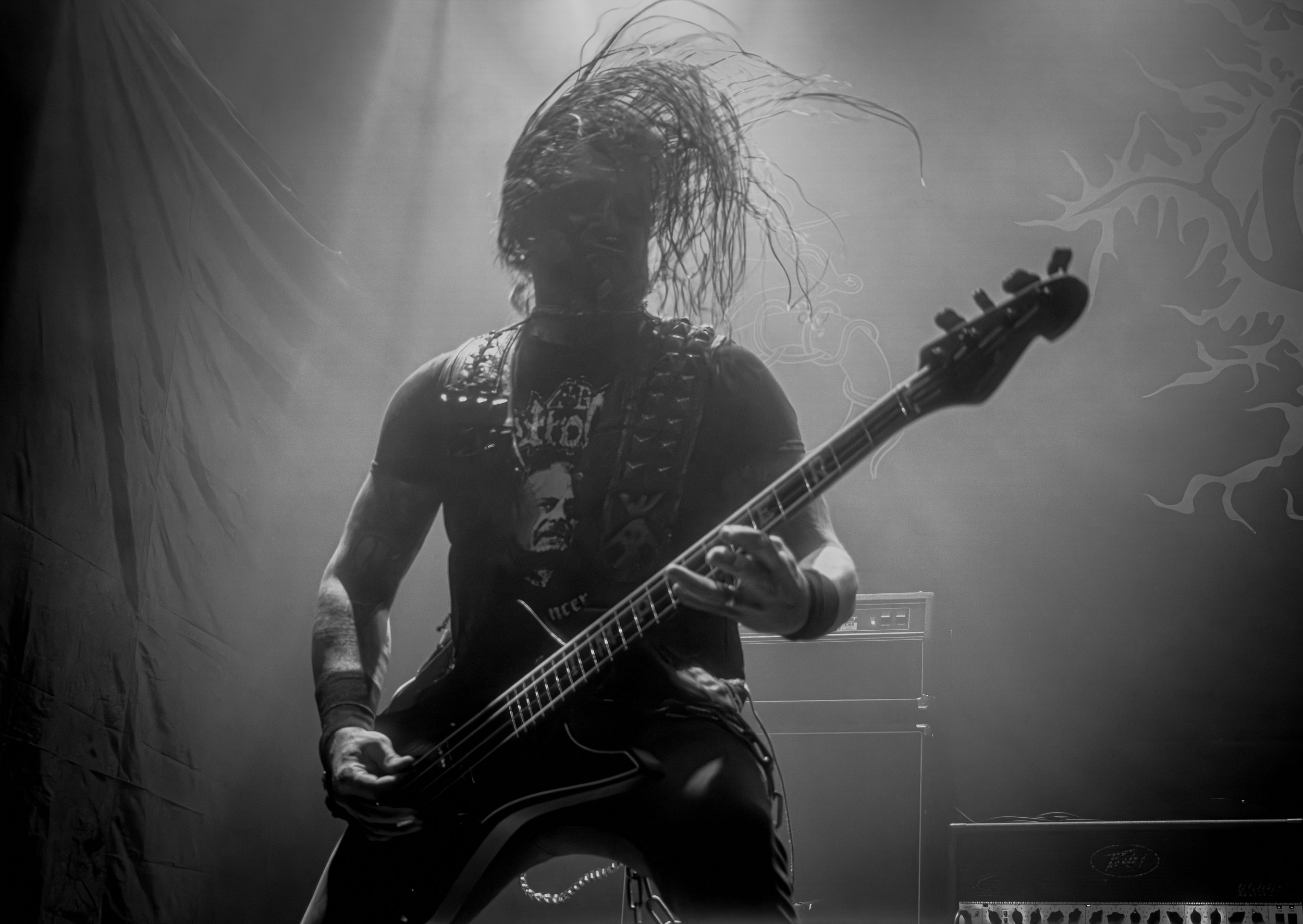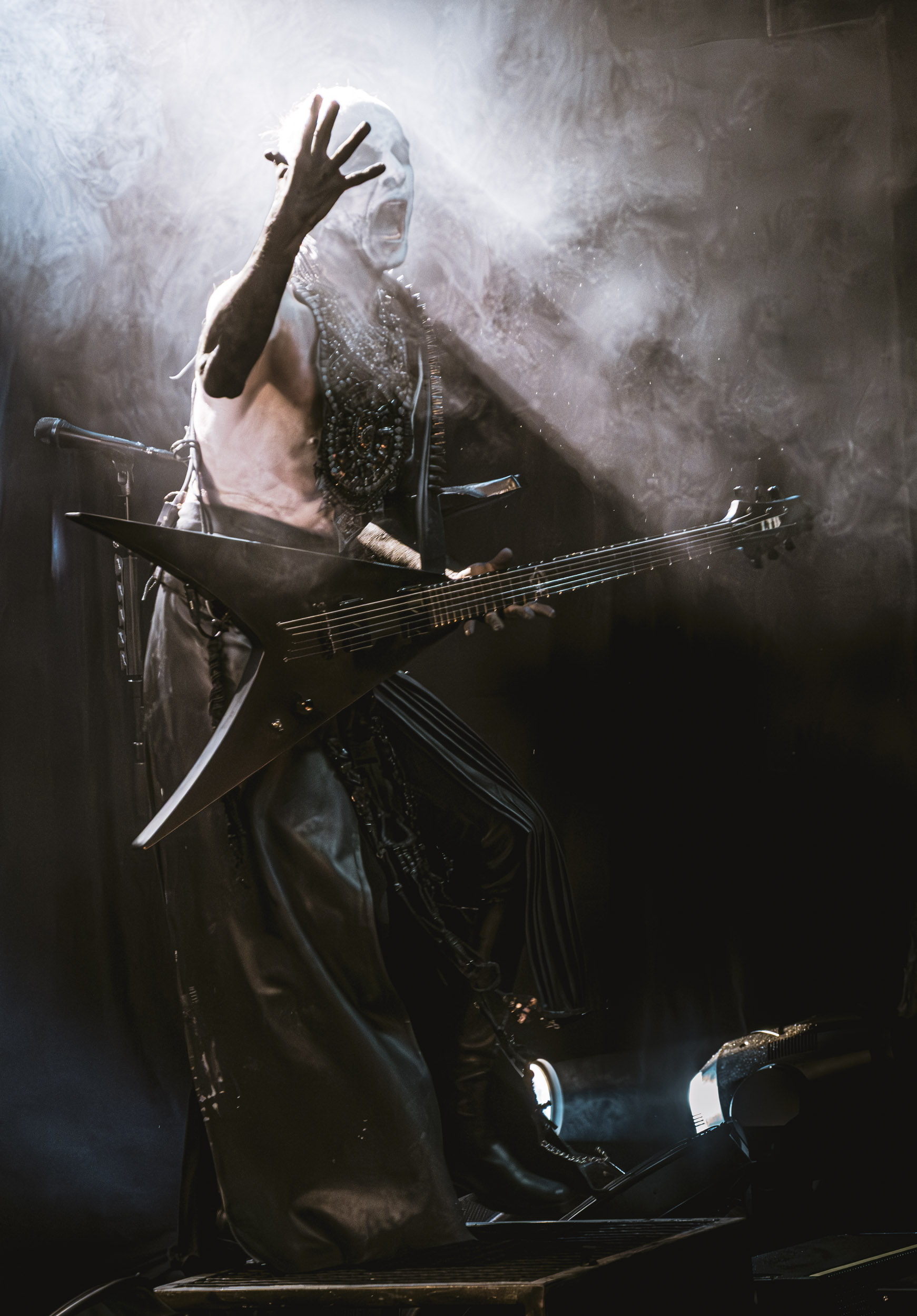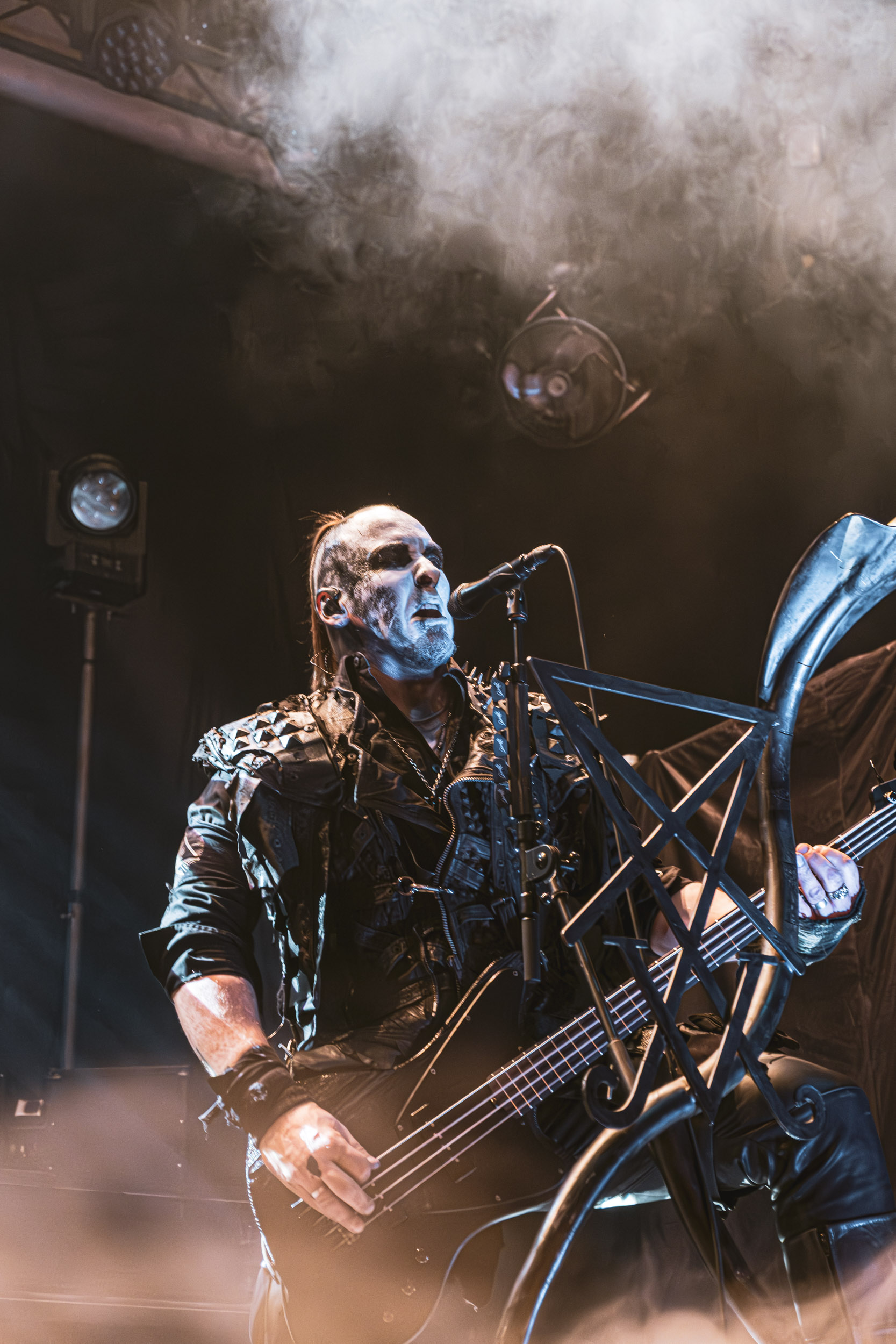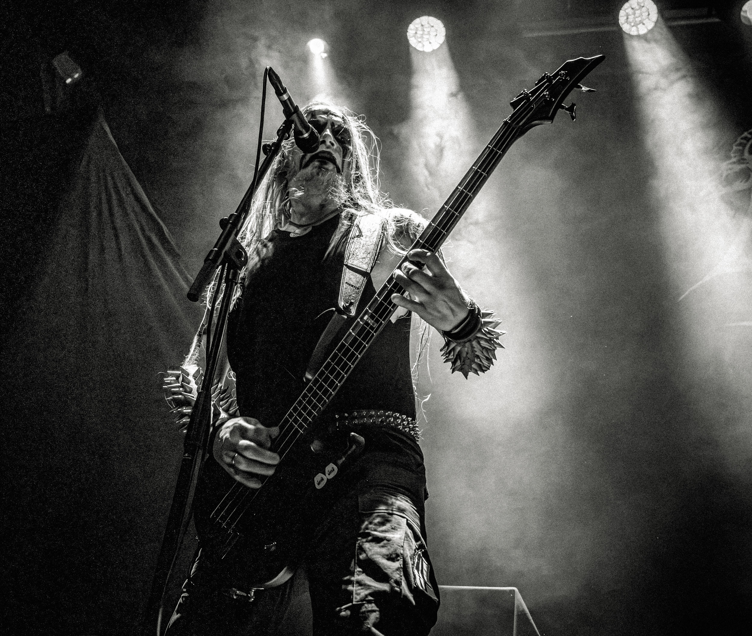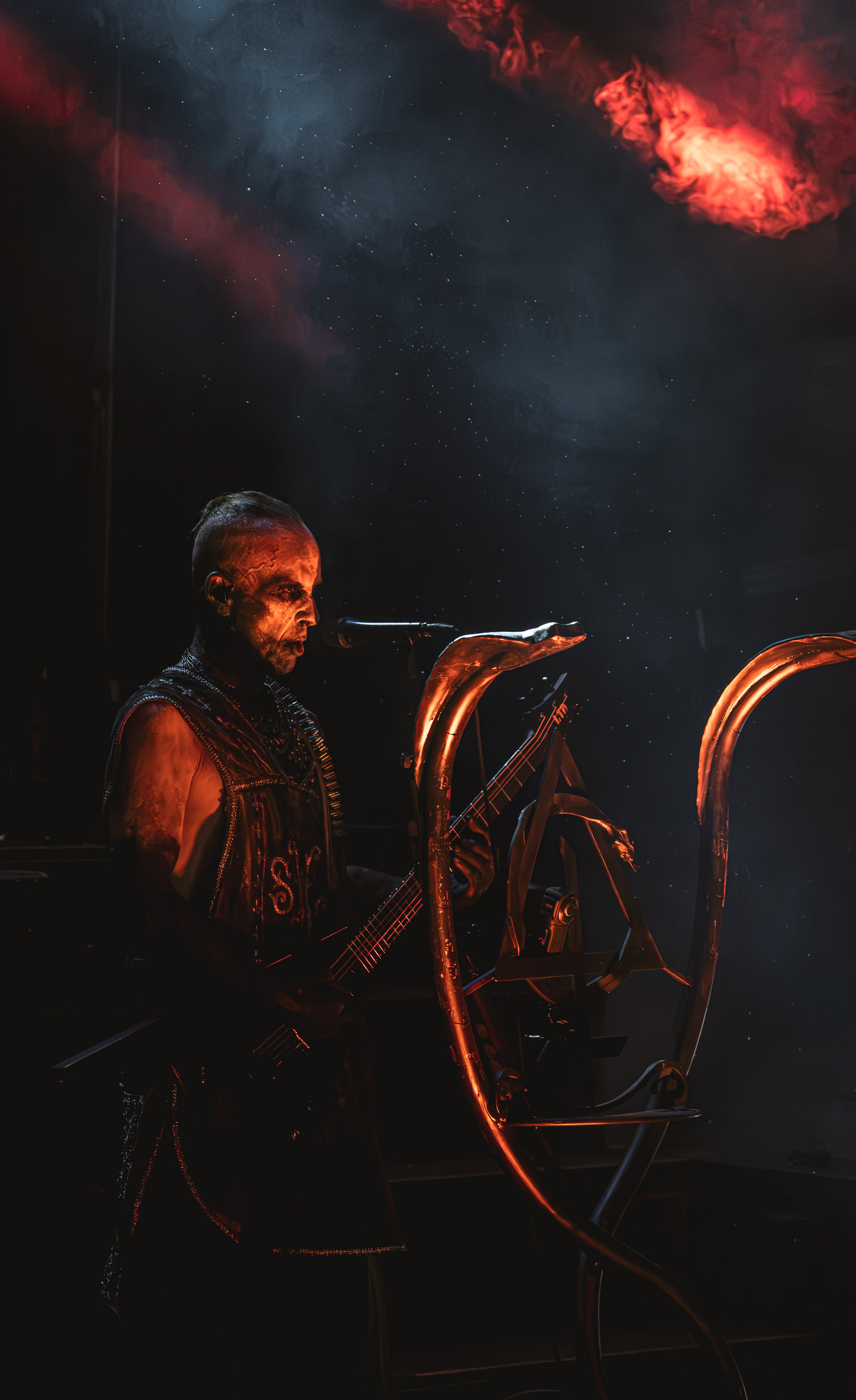 Celeste : Second représentant de la France à l’affiche de cette année après Seth, Celeste est aussi celui de Lyon. Autant dire, alors, que c’est alors un double élan patriotique qui me donne la motivation d’affronter une dernière fois les conditions photographiques compliquées de John Dee. Si je ne cache pas être fière de voir mes concitoyens se faire connaître et se produire à l’international, je ne cache pas non plus qu’ils ne me rendent pas la tâche facile — pour parler en euphémismes ! Affirmer que l’ambiance est sombre en semble un aussi, le groupe ne laissant pas entrer la lumière, au sens propre comme au figuré. Le style, mêlant blackened sludge et post-hardcore, est porteur de thématiques lourdes et graves, parmi lesquelles les violences domestiques. Du point de vue du langage scénique, cela se traduit par un son du même acabit — particulièrement au niveau de la basse — et, au niveau visuel, par une direction artistique oscillant entre quasi-absence d’éclairage et lumières rouges monochromes figurant du sang, éclairage que vient compléter une épaisse couche de fumée. Avec Celeste, tout n’est que noirceur, nihilisme et désespoir ; et cela, nul besoin de maîtriser la langue de Molière pour le comprendre. Du moins tel est le cas pour les spectateurs présents ce soir, chez qui la catharsis bien connue des fans les plus fidèles du groupe produit son effet. En outre, et peut-être est-ce lié au fait qu’ils jouent face à un public qui ne les connaît que peu, les musiciens tentent une petite interaction non-verbale avec les gens en les incitant à taper dans les mains… Je reconnais me laisser surprendre par ce mini-élan communicatif, différent de la distance à laquelle Celeste a habitué son public français ! Malheureusement pour lui, le quatuor pâtit du créneau horaire le plus désavantageux du running order, la majorité des spectateurs ayant pris de l’avance pour voir Behemoth, ce qui fait qu’il se retrouve à jouer devant un public clairsemé. La fumée envahissant l’espace clos de John Dee n’aide pas non plus, finissant par devenir étouffante — sérieusement, qui a eu l’idée de fermer la porte vers les escaliers ? — et, devant moi aussi prendre de l’avance pour shooter la tête d’affiche, je ne peux rester longtemps avant de remonter. J’aurai tout de même eu la satisfaction de reconnaître quelques extraits des productions récentes de Celeste que sont l’album Assassine(s) et l’EP Épilogue(s), ainsi que de tirer quelques images fortes, comme le groupe en offre à chaque fois.