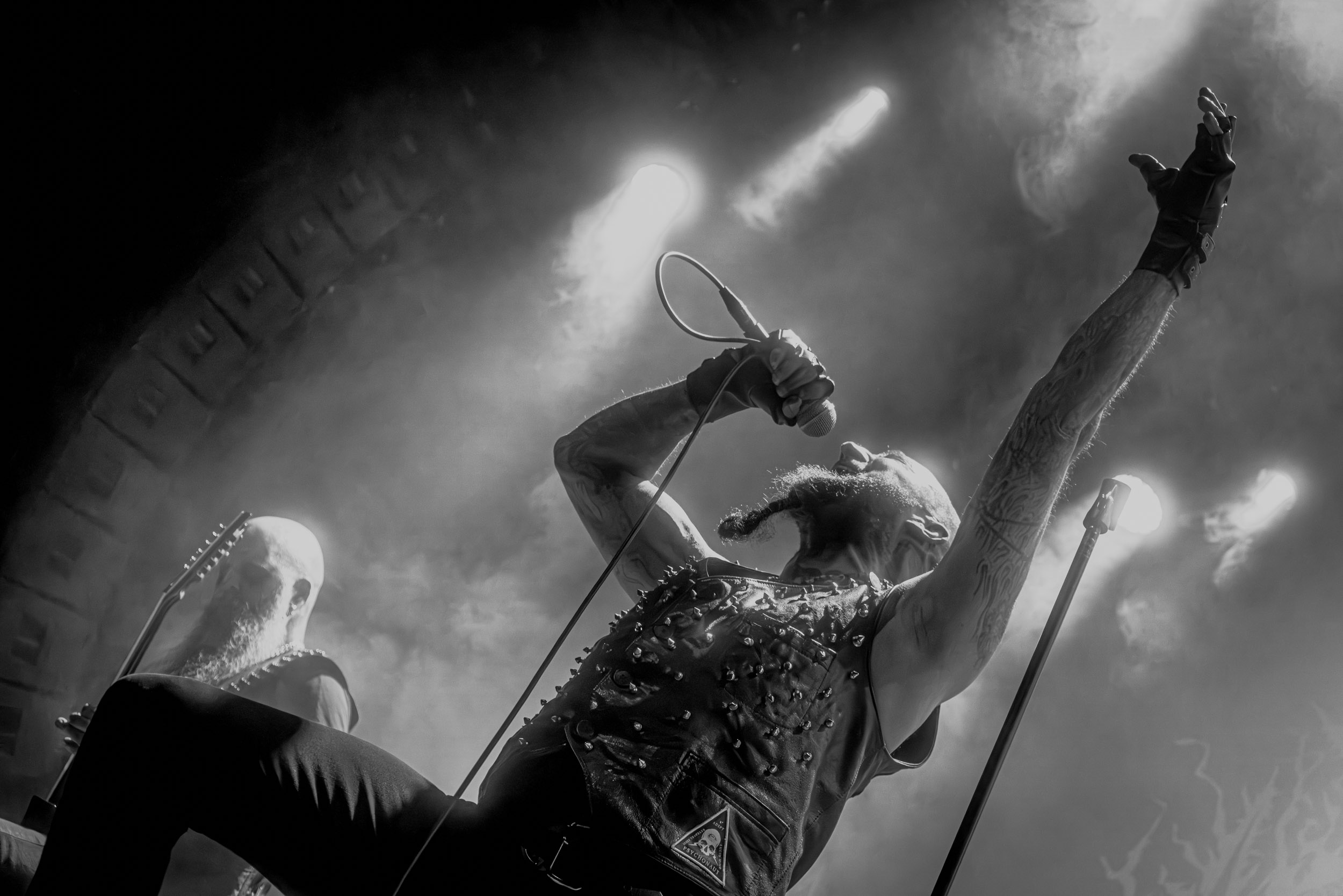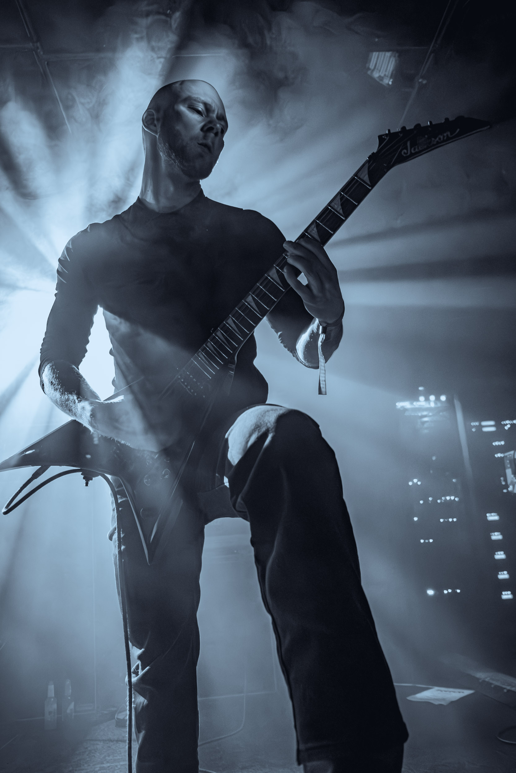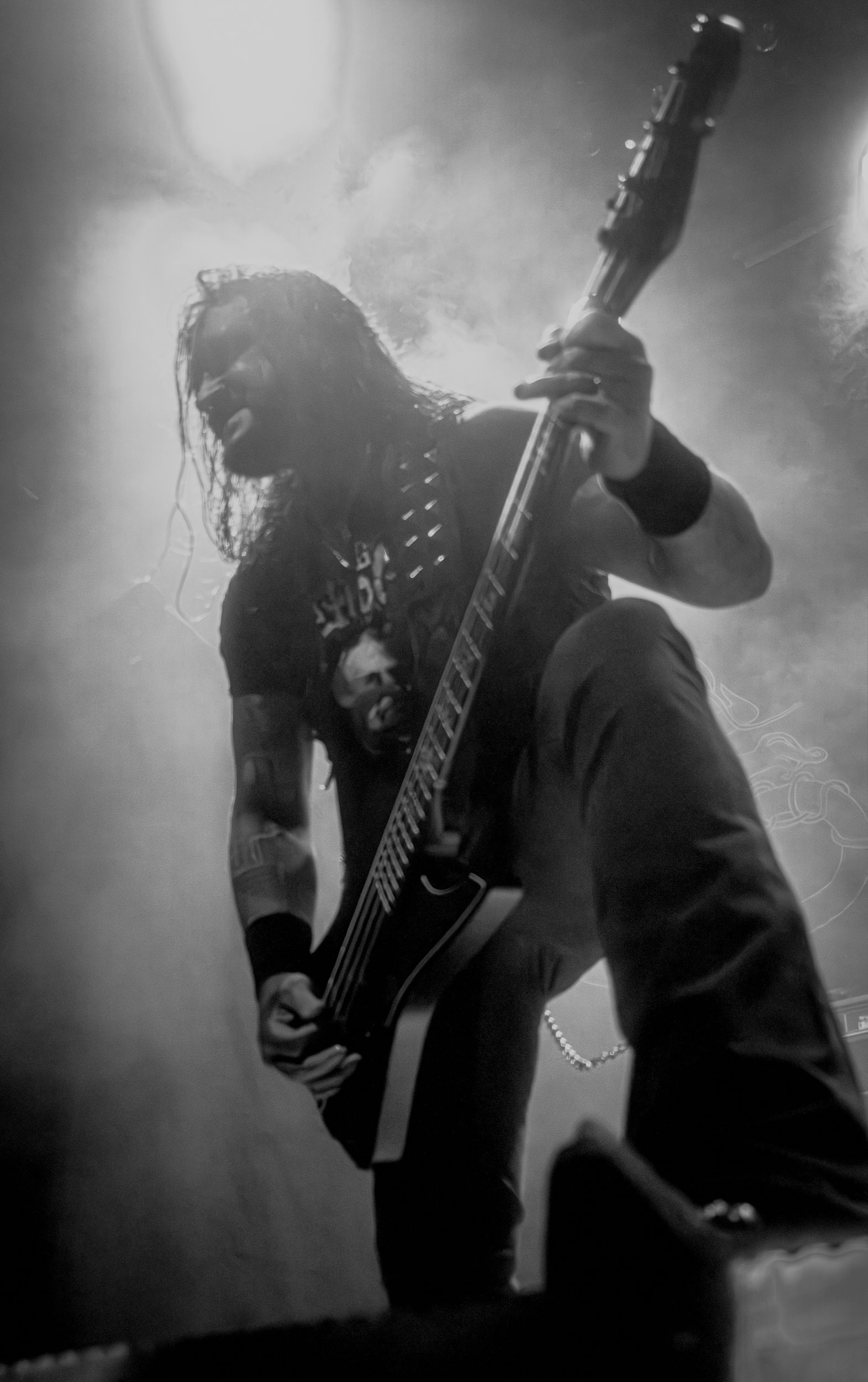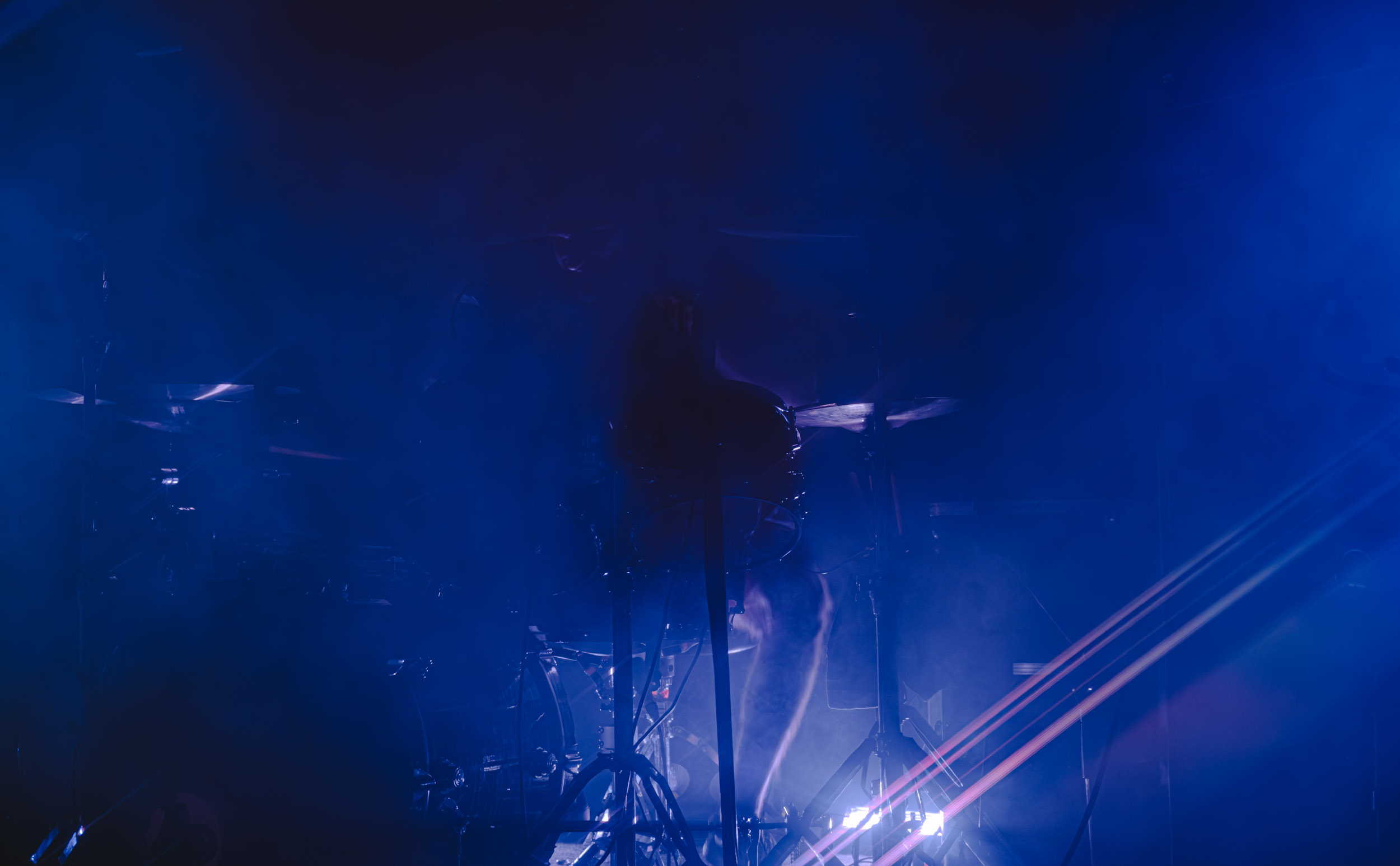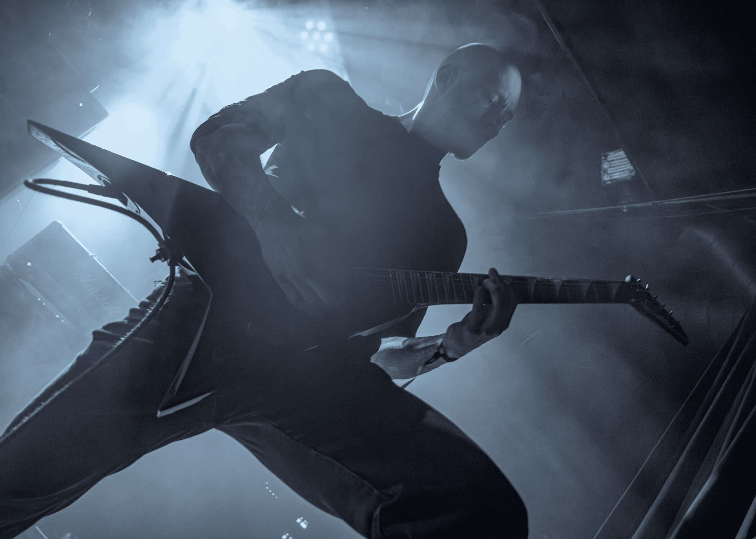 Celeste : Second représentant de la France à l’affiche de cette année après Seth, Celeste est aussi celui de Lyon. Autant dire, alors, que c’est alors un double élan patriotique qui me donne la motivation d’affronter une dernière fois les conditions photographiques compliquées de John Dee. Si je ne cache pas être fière de voir mes concitoyens se faire connaître et se produire à l’international, je ne cache pas non plus qu’ils ne me rendent pas la tâche facile — pour parler en euphémismes ! Affirmer que l’ambiance est sombre en semble un aussi, le groupe ne laissant pas entrer la lumière, au sens propre comme au figuré. Le style, mêlant blackened sludge et post-hardcore, est porteur de thématiques lourdes et graves, parmi lesquelles les violences domestiques. Du point de vue du langage scénique, cela se traduit par un son du même acabit — particulièrement au niveau de la basse — et, au niveau visuel, par une direction artistique oscillant entre quasi-absence d’éclairage et lumières rouges monochromes figurant du sang, éclairage que vient compléter une épaisse couche de fumée. Avec Celeste, tout n’est que noirceur, nihilisme et désespoir ; et cela, nul besoin de maîtriser la langue de Molière pour le comprendre. Du moins tel est le cas pour les spectateurs présents ce soir, chez qui la catharsis bien connue des fans les plus fidèles du groupe produit son effet. En outre, et peut-être est-ce lié au fait qu’ils jouent face à un public qui ne les connaît que peu, les musiciens tentent une petite interaction non-verbale avec les gens en les incitant à taper dans les mains… Je reconnais me laisser surprendre par ce mini-élan communicatif, différent de la distance à laquelle Celeste a habitué son public français ! Malheureusement pour lui, le quatuor pâtit du créneau horaire le plus désavantageux du running order, la majorité des spectateurs ayant pris de l’avance pour voir Behemoth, ce qui fait qu’il se retrouve à jouer devant un public clairsemé. La fumée envahissant l’espace clos de John Dee n’aide pas non plus, finissant par devenir étouffante — sérieusement, qui a eu l’idée de fermer la porte vers les escaliers ? — et, devant moi aussi prendre de l’avance pour shooter la tête d’affiche, je ne peux rester longtemps avant de remonter. J’aurai tout de même eu la satisfaction de reconnaître quelques extraits des productions récentes de Celeste que sont l’album Assassine(s) et l’EP Épilogue(s), ainsi que de tirer quelques images fortes, comme le groupe en offre à chaque fois.