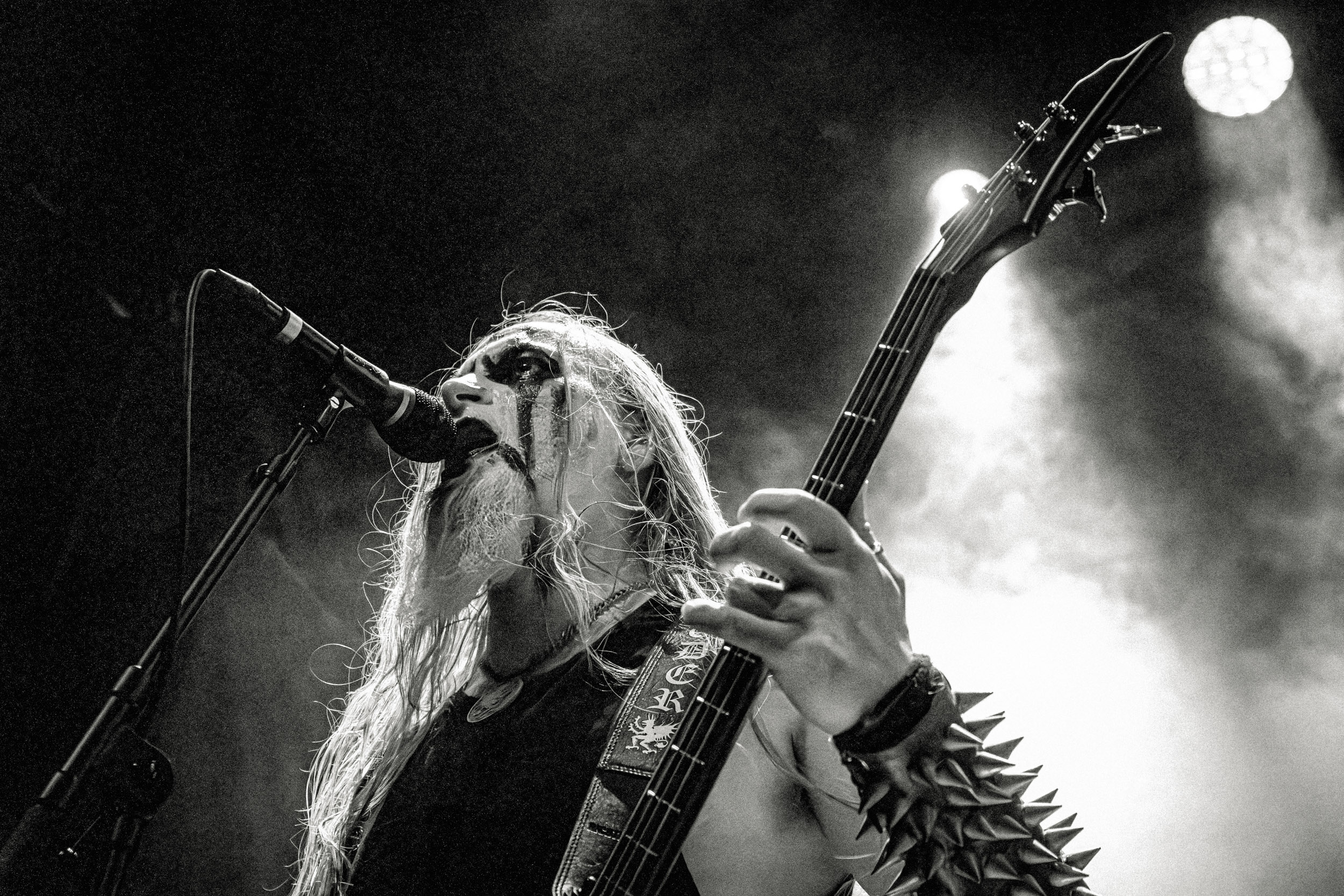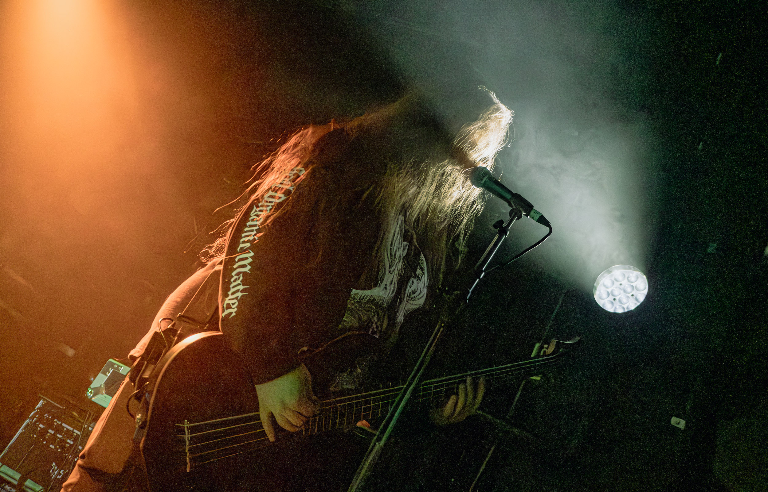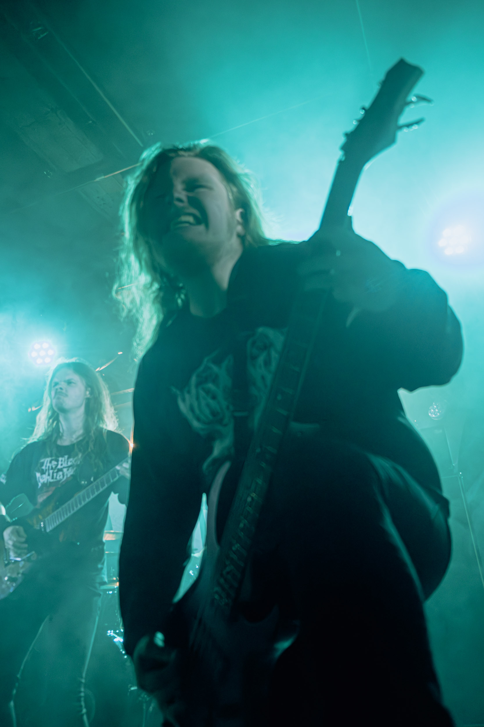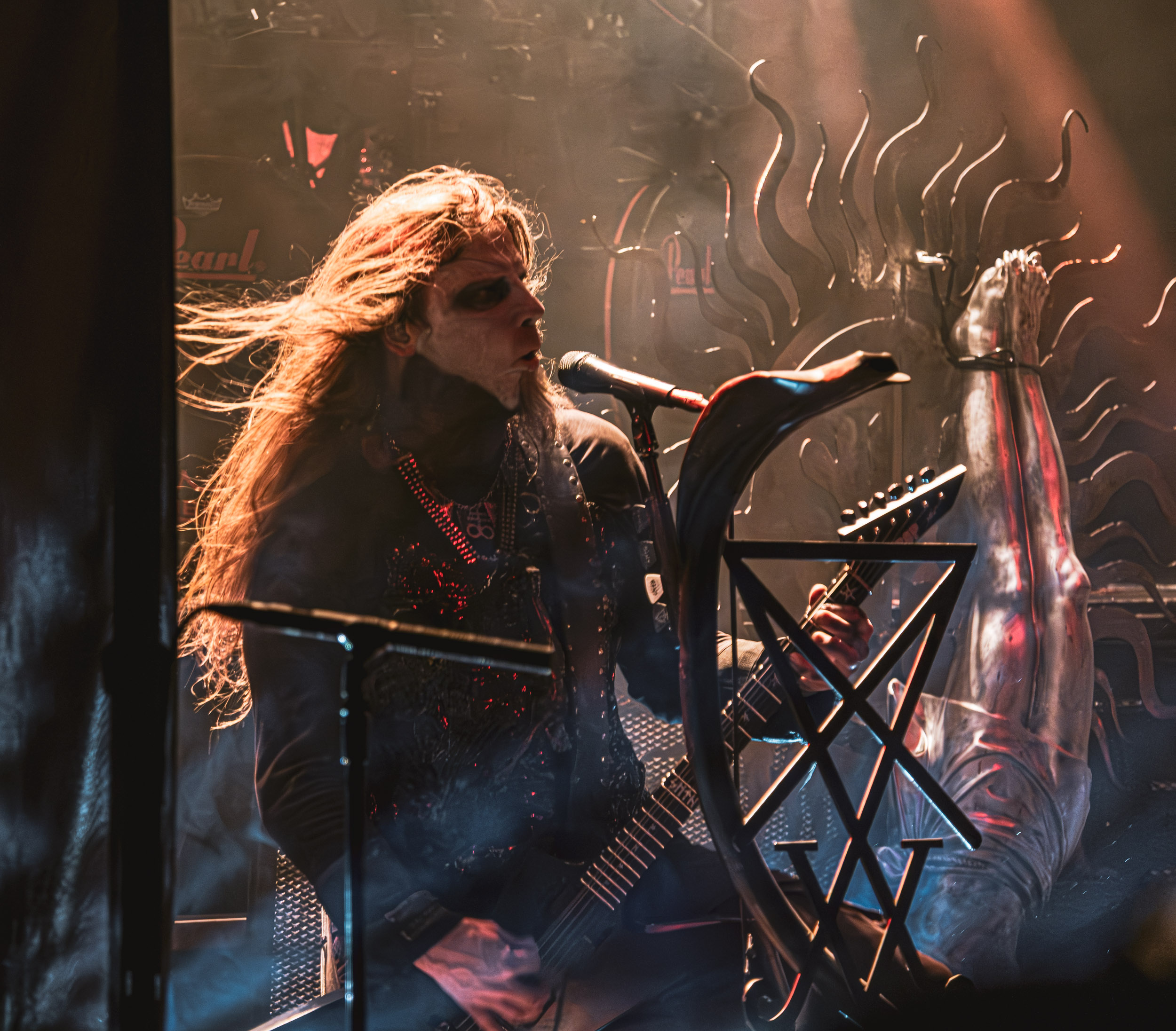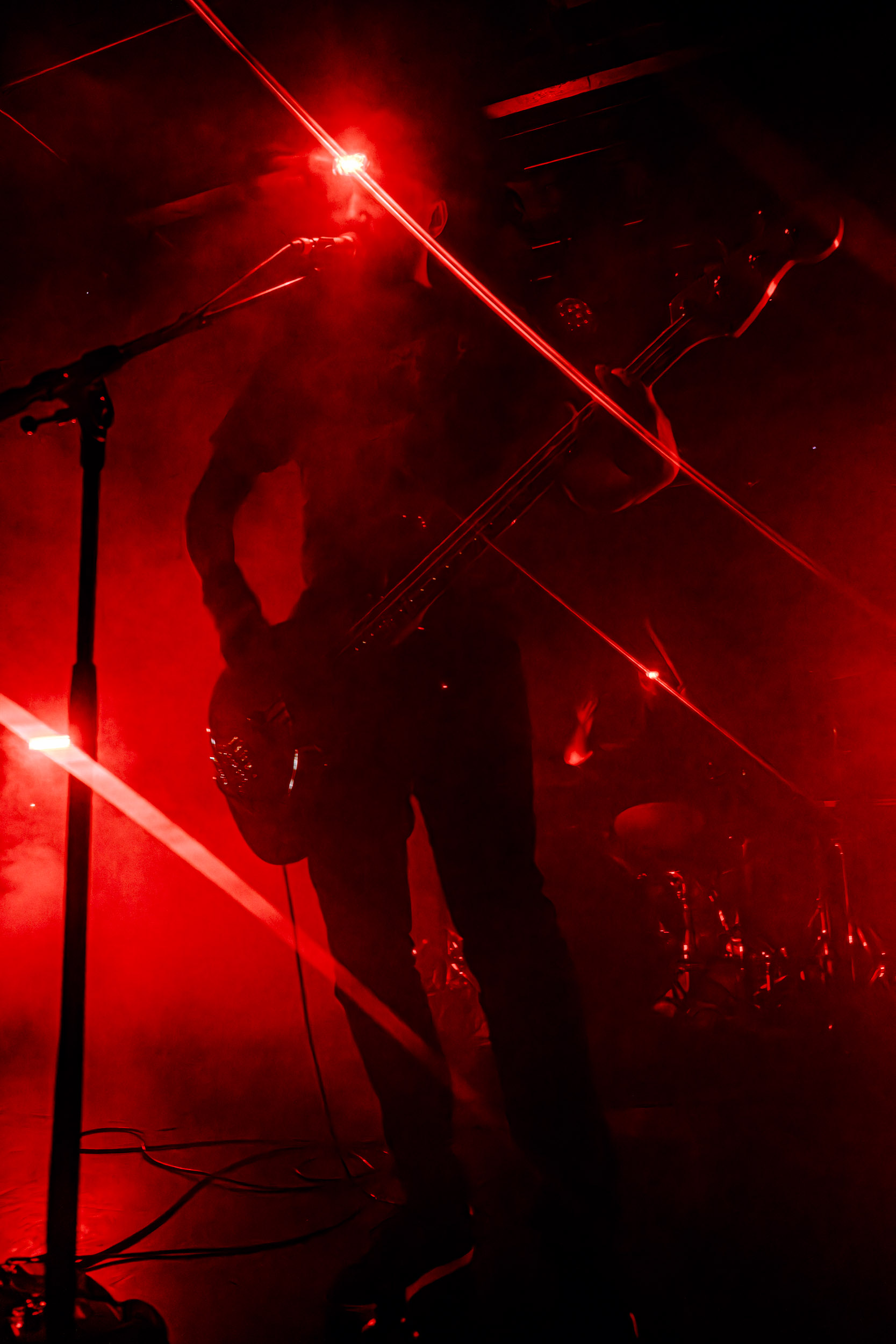Celeste : Second représentant de la France à l’affiche de cette année après Seth, Celeste est aussi celui de Lyon. Autant dire, alors, que c’est alors un double élan patriotique qui me donne la motivation d’affronter une dernière fois les conditions photographiques compliquées de John Dee. Si je ne cache pas être fière de voir mes concitoyens se faire connaître et se produire à l’international, je ne cache pas non plus qu’ils ne me rendent pas la tâche facile — pour parler en euphémismes ! Affirmer que l’ambiance est sombre en semble un aussi, le groupe ne laissant pas entrer la lumière, au sens propre comme au figuré. Le style, mêlant blackened sludge et post-hardcore, est porteur de thématiques lourdes et graves, parmi lesquelles les violences domestiques. Du point de vue du langage scénique, cela se traduit par un son du même acabit — particulièrement au niveau de la basse — et, au niveau visuel, par une direction artistique oscillant entre quasi-absence d’éclairage et lumières rouges monochromes figurant du sang, éclairage que vient compléter une épaisse couche de fumée. Avec Celeste, tout n’est que noirceur, nihilisme et désespoir ; et cela, nul besoin de maîtriser la langue de Molière pour le comprendre. Du moins tel est le cas pour les spectateurs présents ce soir, chez qui la catharsis bien connue des fans les plus fidèles du groupe produit son effet. En outre, et peut-être est-ce lié au fait qu’ils jouent face à un public qui ne les connaît que peu, les musiciens tentent une petite interaction non-verbale avec les gens en les incitant à taper dans les mains… Je reconnais me laisser surprendre par ce mini-élan communicatif, différent de la distance à laquelle Celeste a habitué son public français ! Malheureusement pour lui, le quatuor pâtit du créneau horaire le plus désavantageux du running order, la majorité des spectateurs ayant pris de l’avance pour voir Behemoth, ce qui fait qu’il se retrouve à jouer devant un public clairsemé. La fumée envahissant l’espace clos de John Dee n’aide pas non plus, finissant par devenir étouffante — sérieusement, qui a eu l’idée de fermer la porte vers les escaliers ? — et, devant moi aussi prendre de l’avance pour shooter la tête d’affiche, je ne peux rester longtemps avant de remonter. J’aurai tout de même eu la satisfaction de reconnaître quelques extraits des productions récentes de Celeste que sont l’album Assassine(s) et l’EP Épilogue(s), ainsi que de tirer quelques images fortes, comme le groupe en offre à chaque fois.