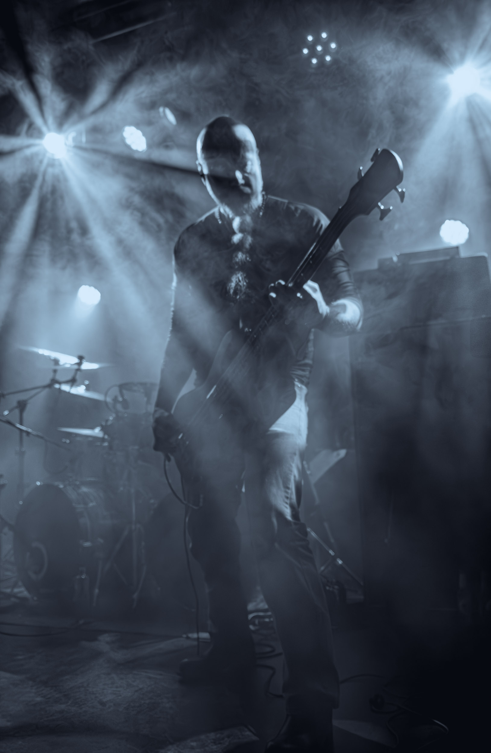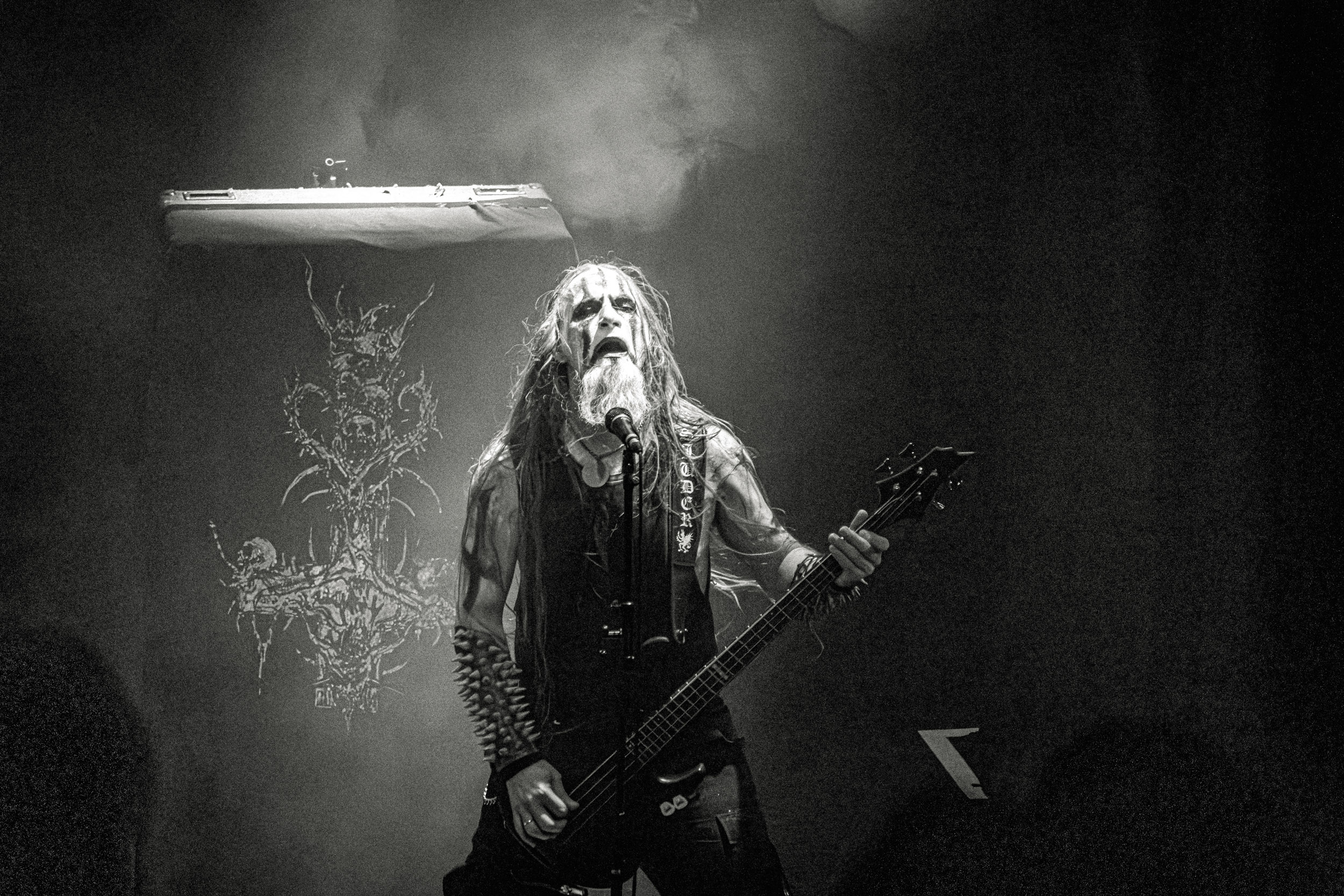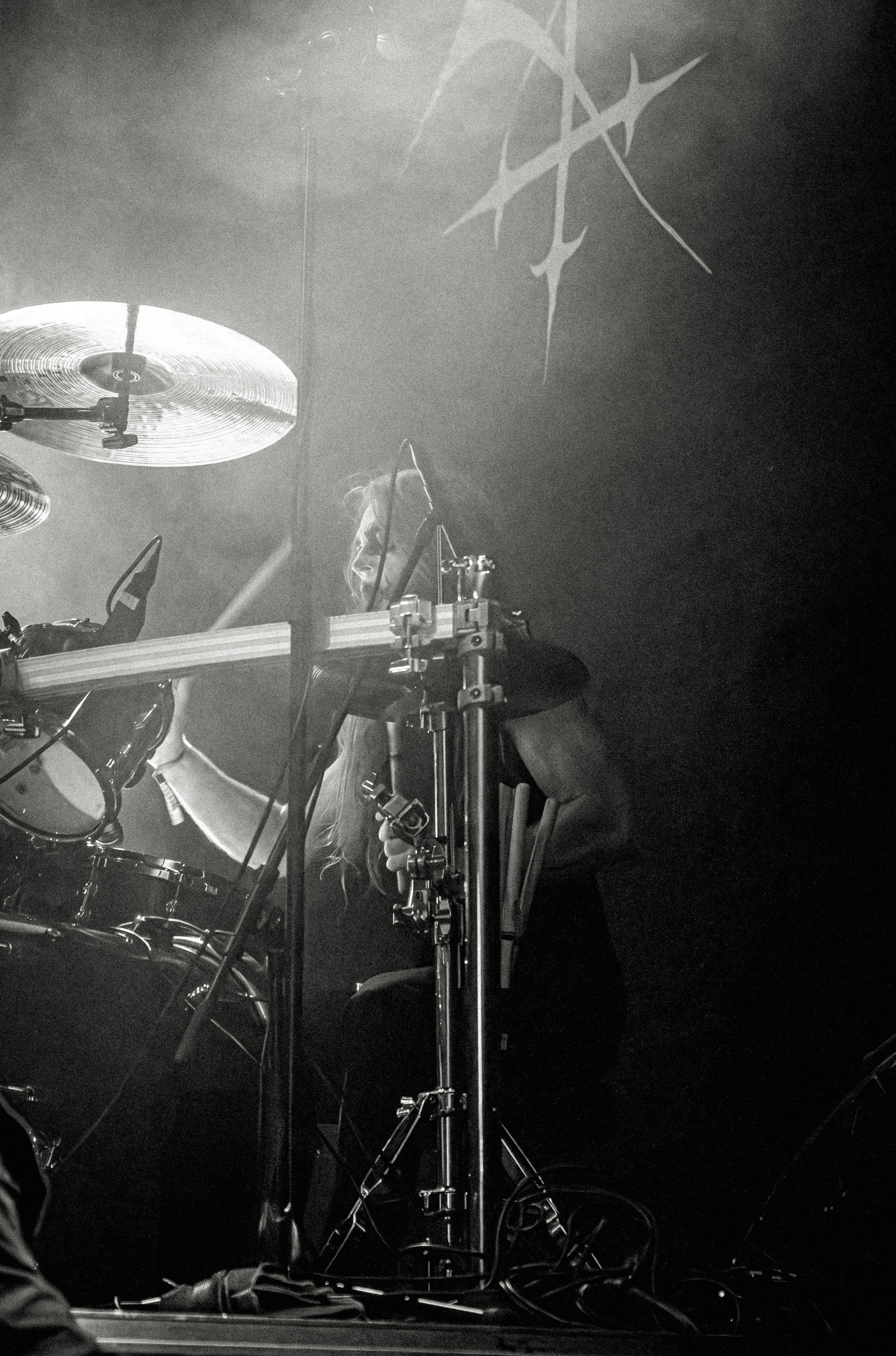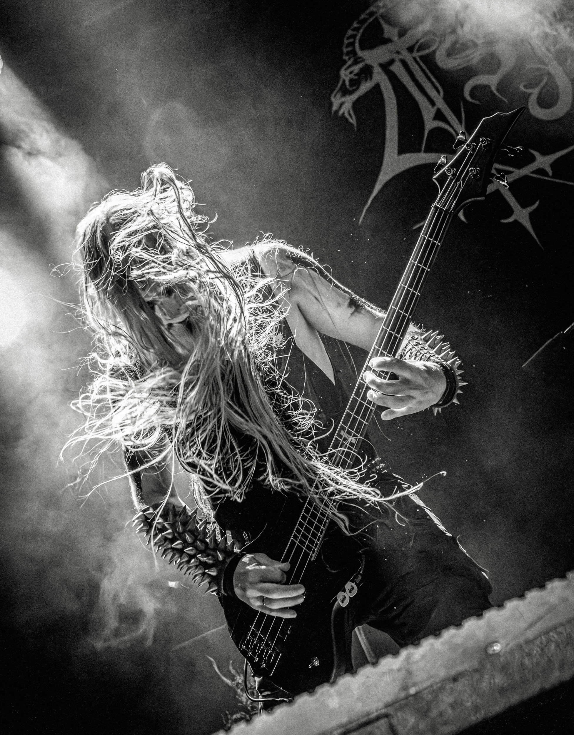 Celeste : Second représentant de la France à l’affiche de cette année après Seth, Celeste est aussi celui de Lyon. Autant dire, alors, que c’est alors un double élan patriotique qui me donne la motivation d’affronter une dernière fois les conditions photographiques compliquées de John Dee. Si je ne cache pas être fière de voir mes concitoyens se faire connaître et se produire à l’international, je ne cache pas non plus qu’ils ne me rendent pas la tâche facile — pour parler en euphémismes ! Affirmer que l’ambiance est sombre en semble un aussi, le groupe ne laissant pas entrer la lumière, au sens propre comme au figuré. Le style, mêlant blackened sludge et post-hardcore, est porteur de thématiques lourdes et graves, parmi lesquelles les violences domestiques. Du point de vue du langage scénique, cela se traduit par un son du même acabit — particulièrement au niveau de la basse — et, au niveau visuel, par une direction artistique oscillant entre quasi-absence d’éclairage et lumières rouges monochromes figurant du sang, éclairage que vient compléter une épaisse couche de fumée. Avec Celeste, tout n’est que noirceur, nihilisme et désespoir ; et cela, nul besoin de maîtriser la langue de Molière pour le comprendre. Du moins tel est le cas pour les spectateurs présents ce soir, chez qui la catharsis bien connue des fans les plus fidèles du groupe produit son effet. En outre, et peut-être est-ce lié au fait qu’ils jouent face à un public qui ne les connaît que peu, les musiciens tentent une petite interaction non-verbale avec les gens en les incitant à taper dans les mains… Je reconnais me laisser surprendre par ce mini-élan communicatif, différent de la distance à laquelle Celeste a habitué son public français ! Malheureusement pour lui, le quatuor pâtit du créneau horaire le plus désavantageux du running order, la majorité des spectateurs ayant pris de l’avance pour voir Behemoth, ce qui fait qu’il se retrouve à jouer devant un public clairsemé. La fumée envahissant l’espace clos de John Dee n’aide pas non plus, finissant par devenir étouffante — sérieusement, qui a eu l’idée de fermer la porte vers les escaliers ? — et, devant moi aussi prendre de l’avance pour shooter la tête d’affiche, je ne peux rester longtemps avant de remonter. J’aurai tout de même eu la satisfaction de reconnaître quelques extraits des productions récentes de Celeste que sont l’album Assassine(s) et l’EP Épilogue(s), ainsi que de tirer quelques images fortes, comme le groupe en offre à chaque fois.