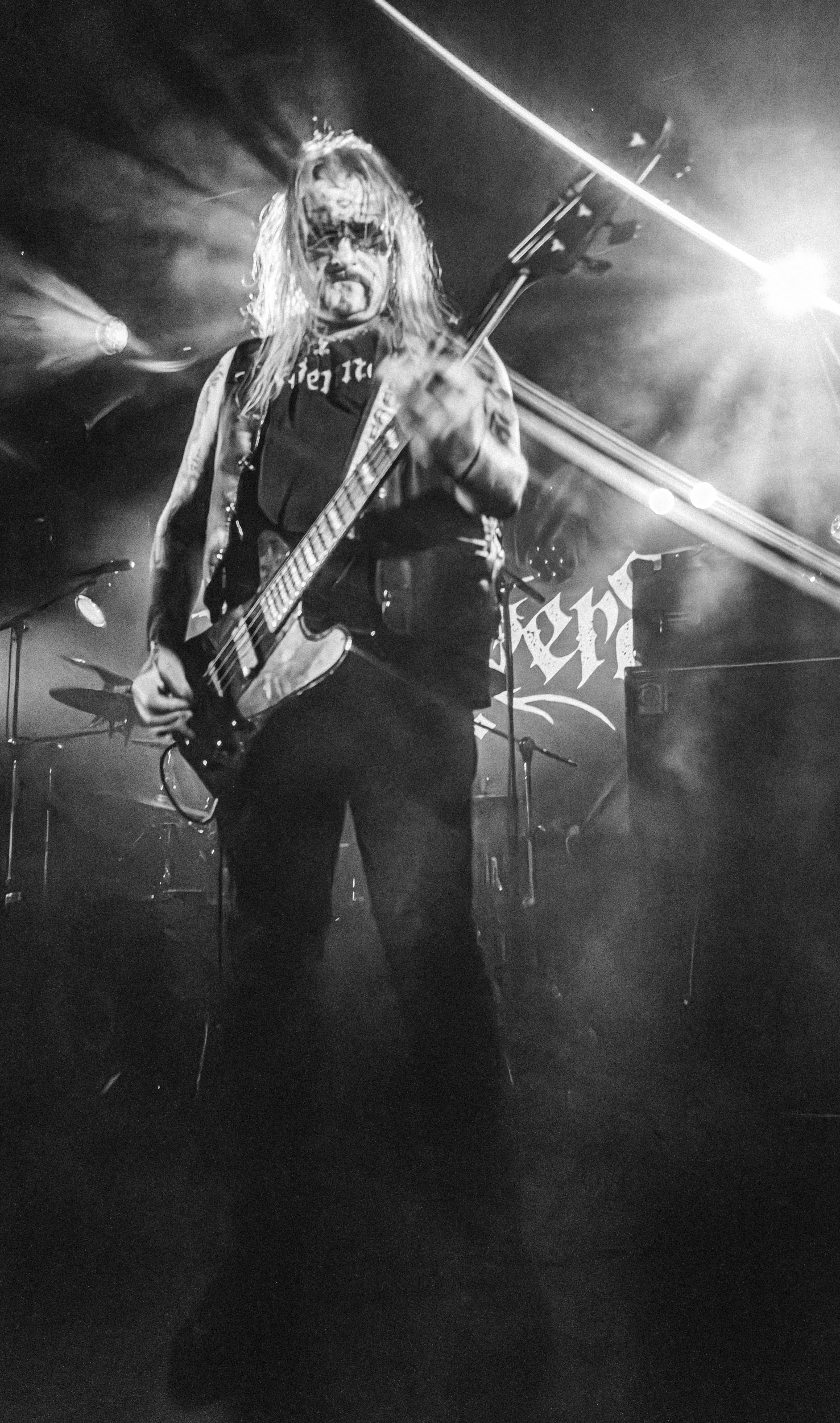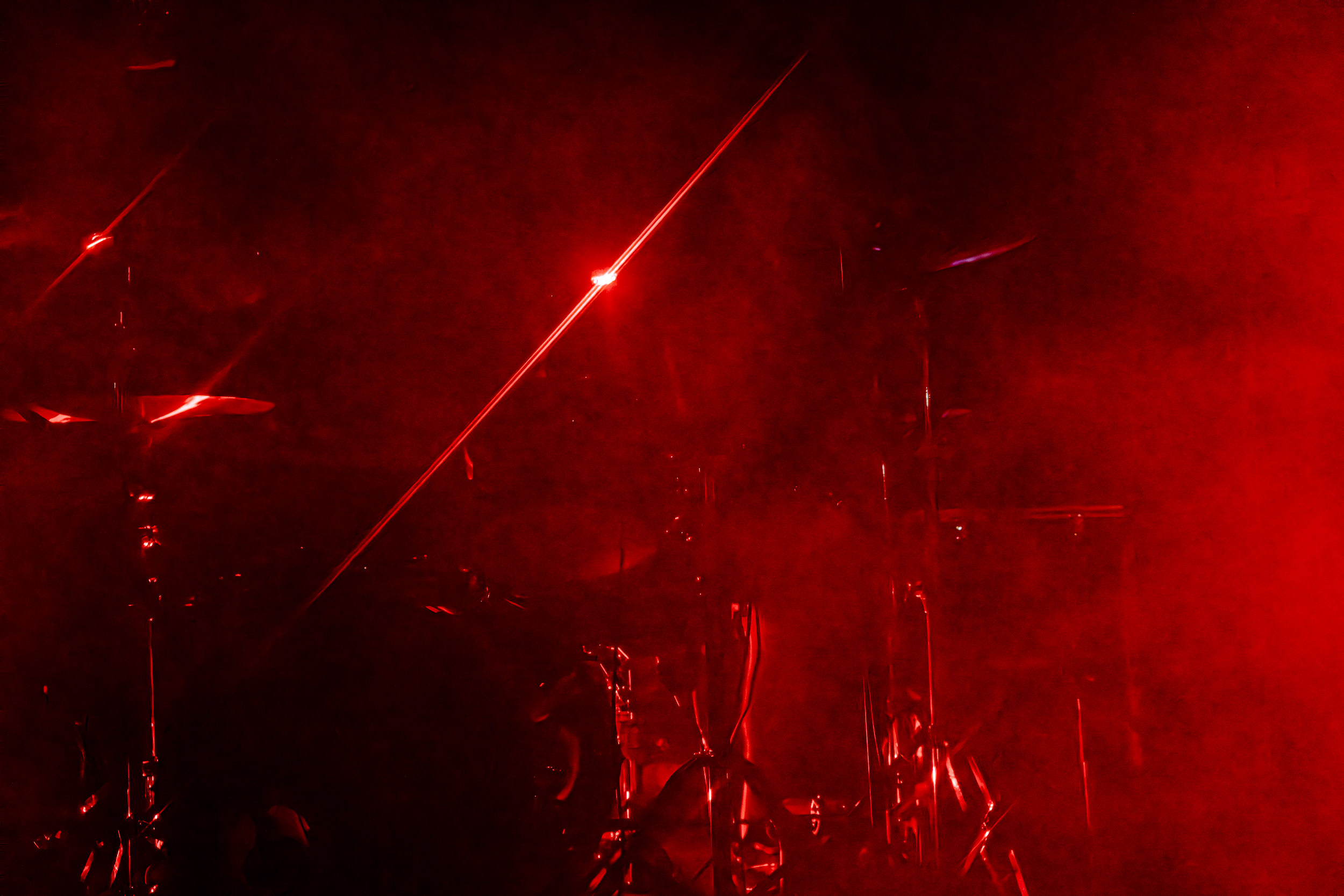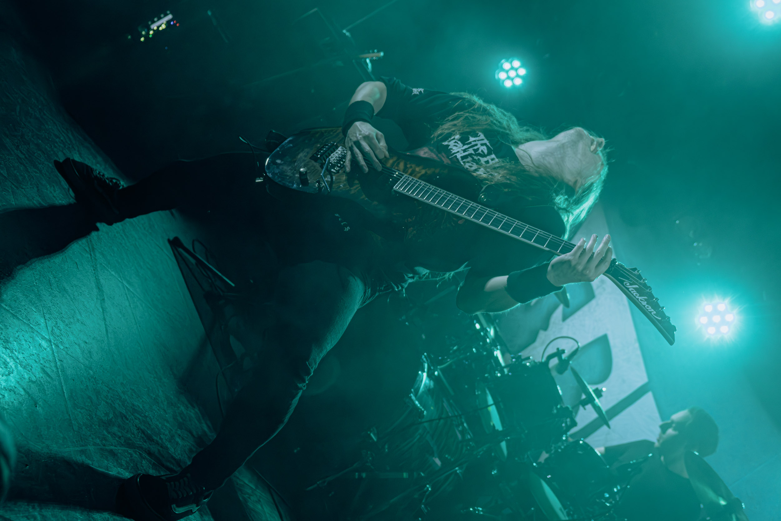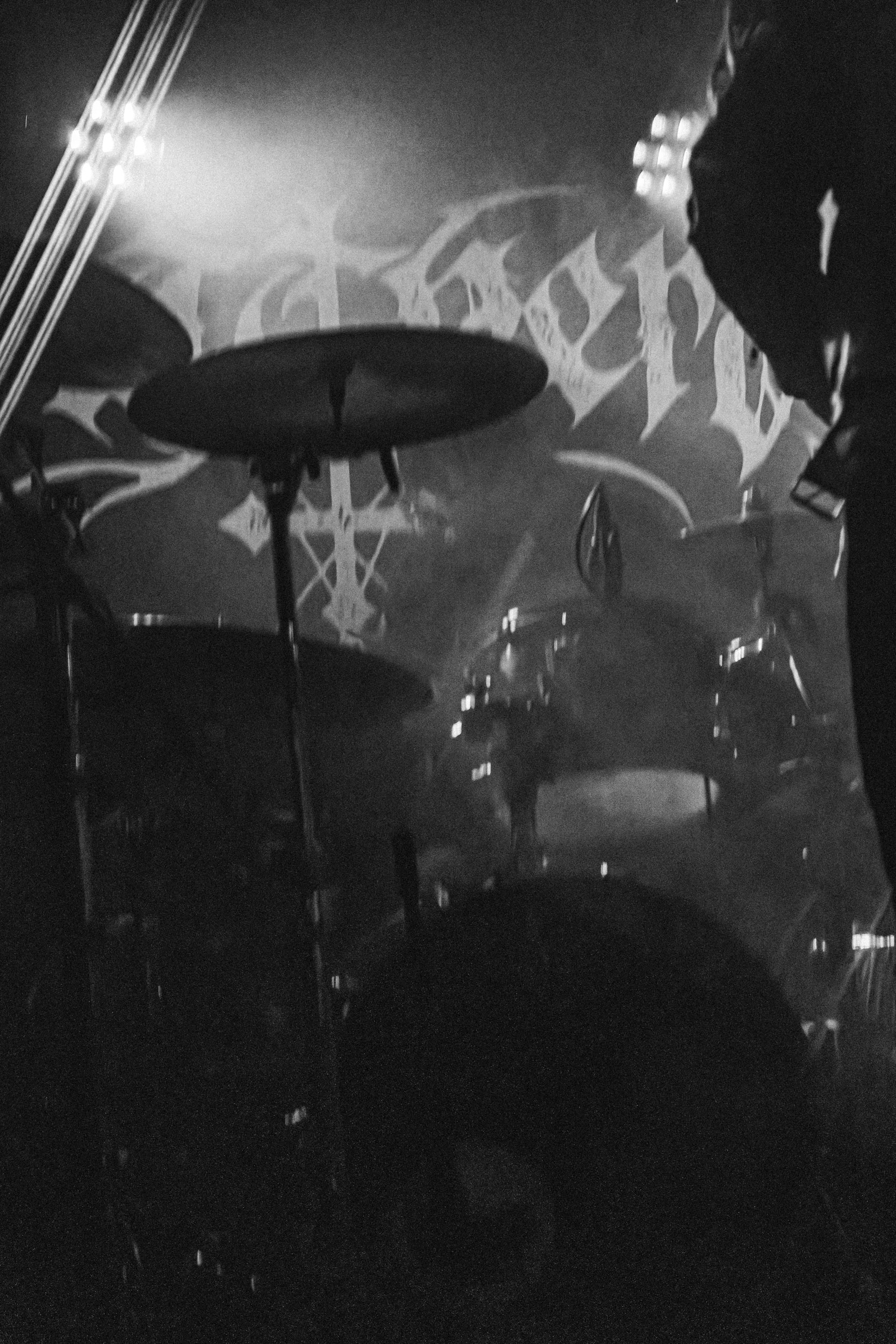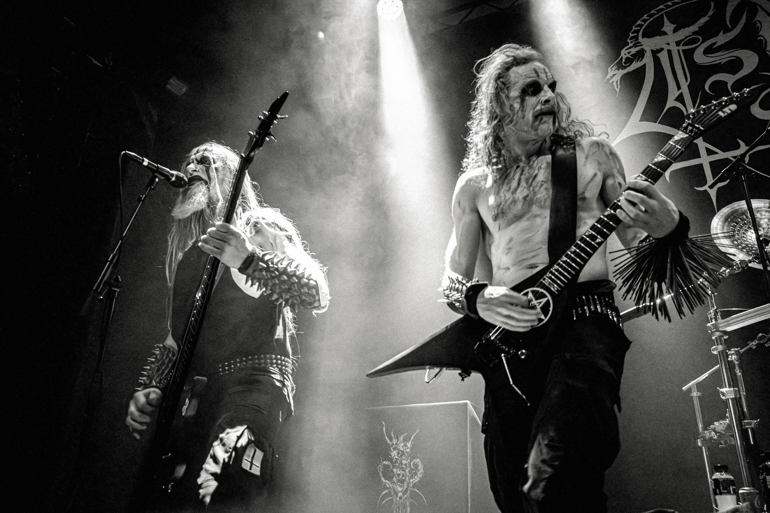 Celeste : Second représentant de la France à l’affiche de cette année après Seth, Celeste est aussi celui de Lyon. Autant dire, alors, que c’est alors un double élan patriotique qui me donne la motivation d’affronter une dernière fois les conditions photographiques compliquées de John Dee. Si je ne cache pas être fière de voir mes concitoyens se faire connaître et se produire à l’international, je ne cache pas non plus qu’ils ne me rendent pas la tâche facile — pour parler en euphémismes ! Affirmer que l’ambiance est sombre en semble un aussi, le groupe ne laissant pas entrer la lumière, au sens propre comme au figuré. Le style, mêlant blackened sludge et post-hardcore, est porteur de thématiques lourdes et graves, parmi lesquelles les violences domestiques. Du point de vue du langage scénique, cela se traduit par un son du même acabit — particulièrement au niveau de la basse — et, au niveau visuel, par une direction artistique oscillant entre quasi-absence d’éclairage et lumières rouges monochromes figurant du sang, éclairage que vient compléter une épaisse couche de fumée. Avec Celeste, tout n’est que noirceur, nihilisme et désespoir ; et cela, nul besoin de maîtriser la langue de Molière pour le comprendre. Du moins tel est le cas pour les spectateurs présents ce soir, chez qui la catharsis bien connue des fans les plus fidèles du groupe produit son effet. En outre, et peut-être est-ce lié au fait qu’ils jouent face à un public qui ne les connaît que peu, les musiciens tentent une petite interaction non-verbale avec les gens en les incitant à taper dans les mains… Je reconnais me laisser surprendre par ce mini-élan communicatif, différent de la distance à laquelle Celeste a habitué son public français ! Malheureusement pour lui, le quatuor pâtit du créneau horaire le plus désavantageux du running order, la majorité des spectateurs ayant pris de l’avance pour voir Behemoth, ce qui fait qu’il se retrouve à jouer devant un public clairsemé. La fumée envahissant l’espace clos de John Dee n’aide pas non plus, finissant par devenir étouffante — sérieusement, qui a eu l’idée de fermer la porte vers les escaliers ? — et, devant moi aussi prendre de l’avance pour shooter la tête d’affiche, je ne peux rester longtemps avant de remonter. J’aurai tout de même eu la satisfaction de reconnaître quelques extraits des productions récentes de Celeste que sont l’album Assassine(s) et l’EP Épilogue(s), ainsi que de tirer quelques images fortes, comme le groupe en offre à chaque fois.