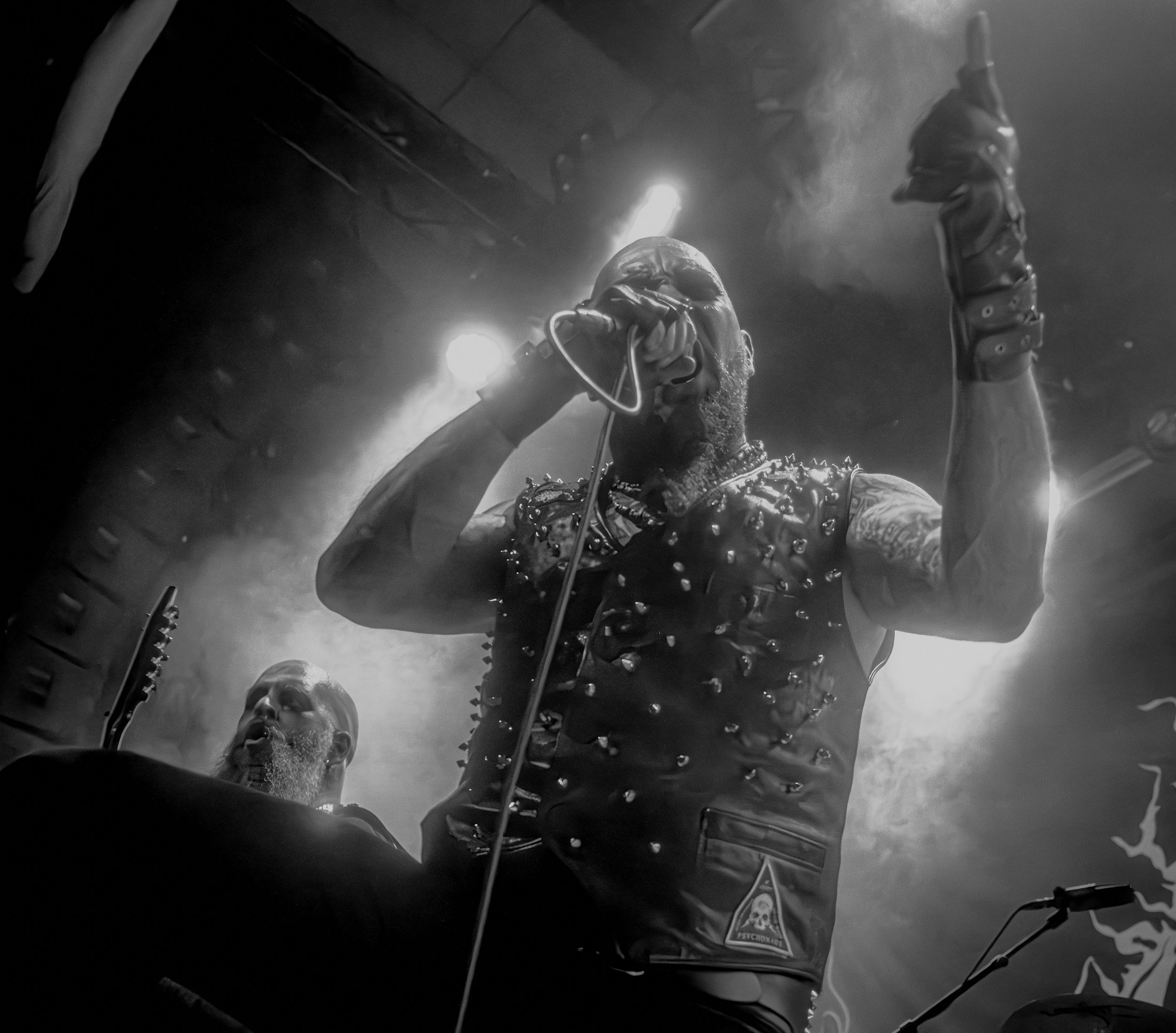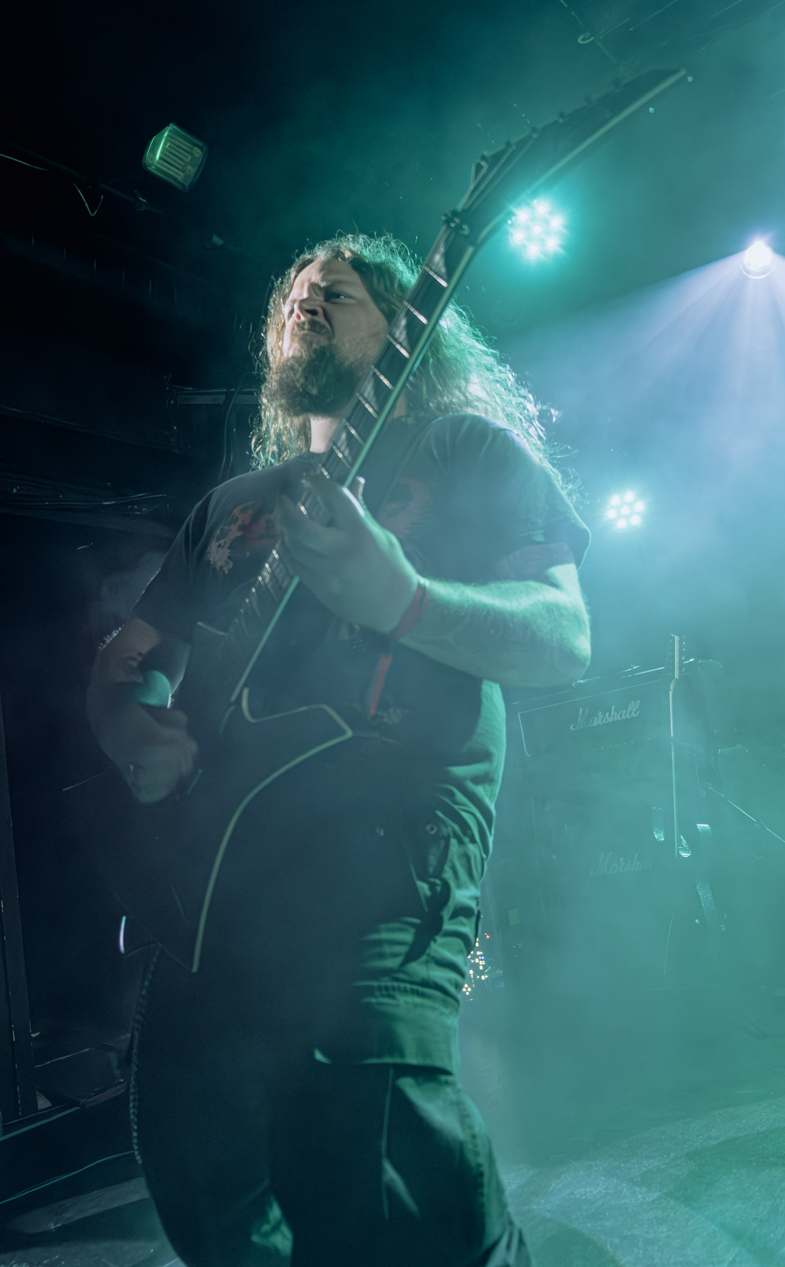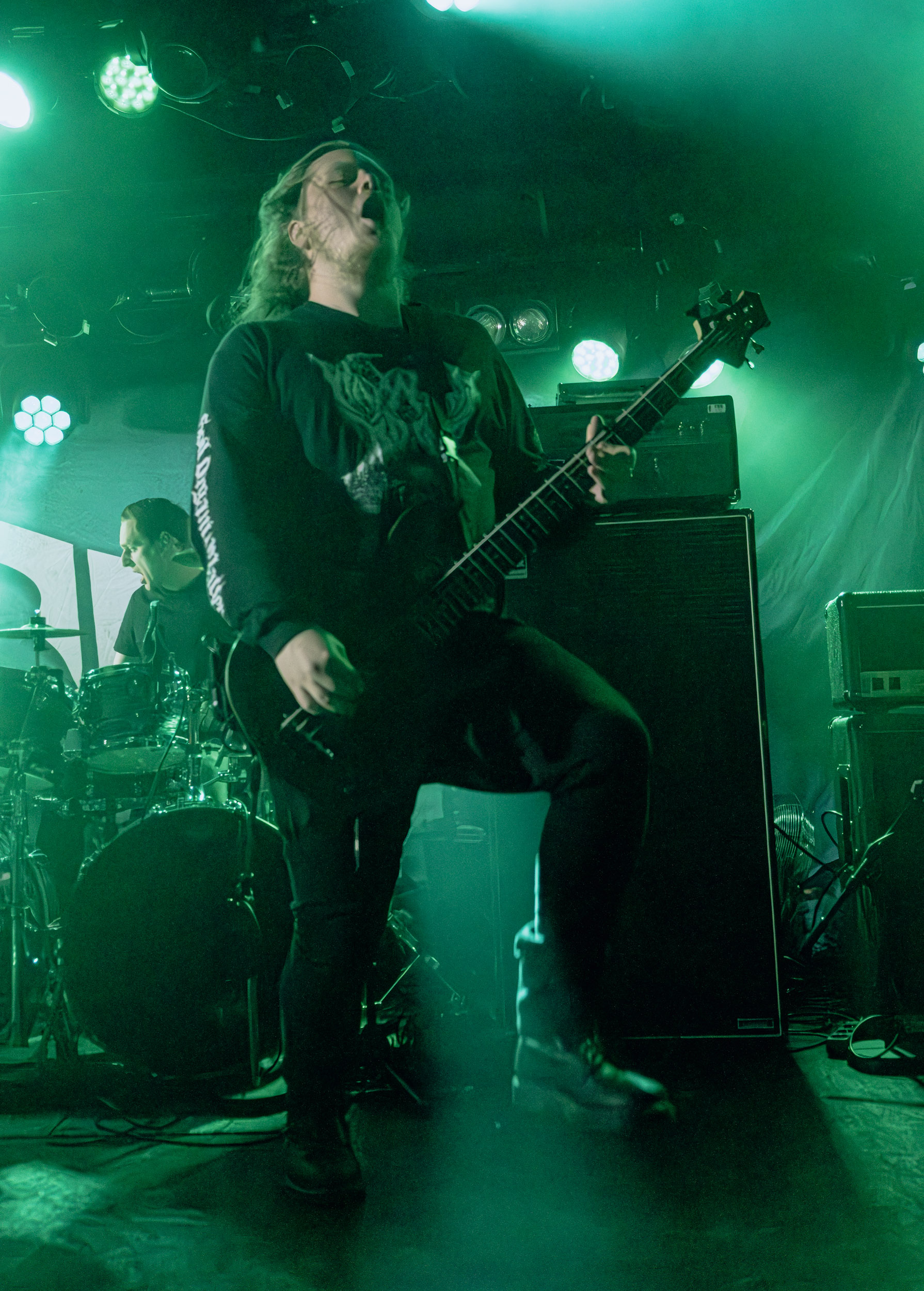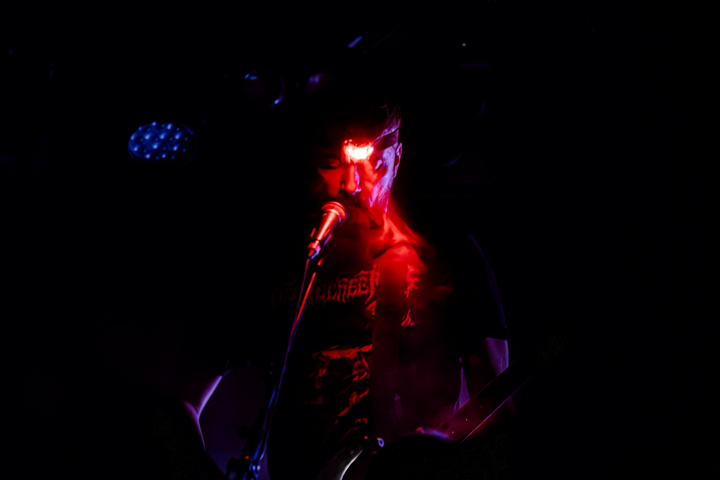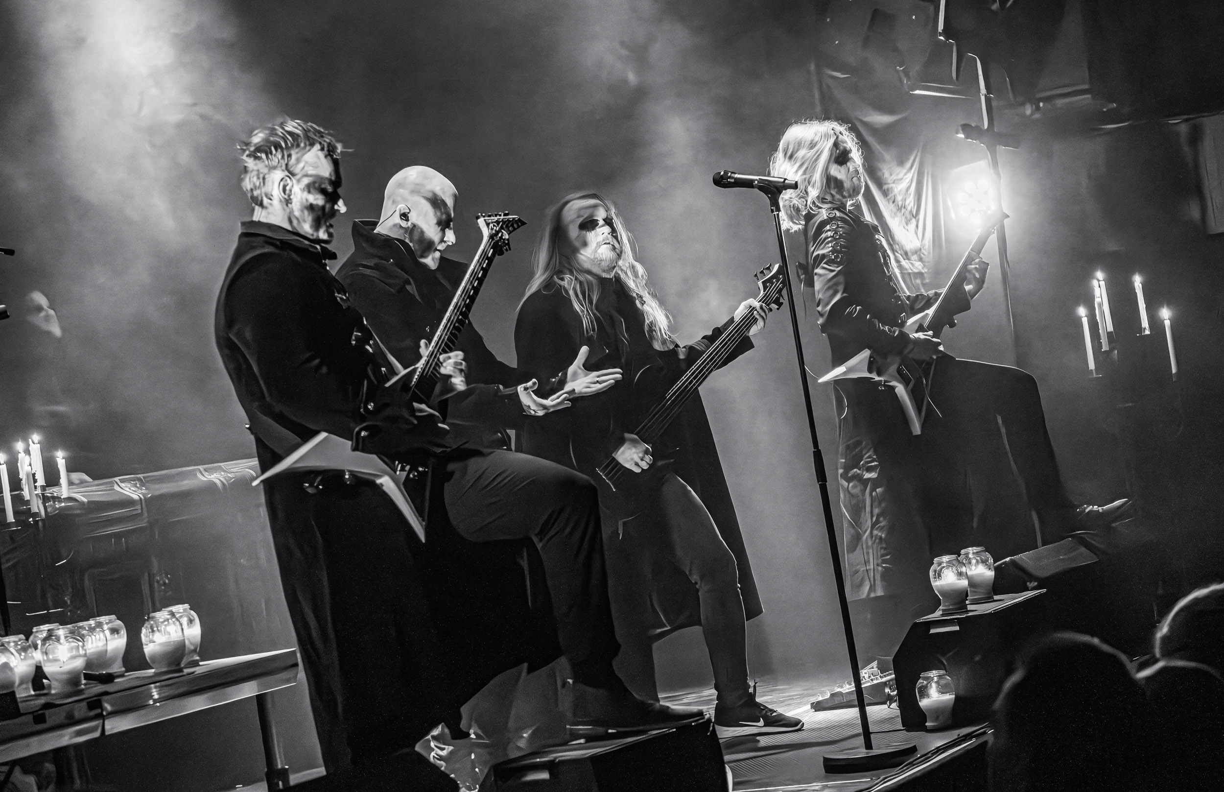 Celeste : Second représentant de la France à l’affiche de cette année après Seth, Celeste est aussi celui de Lyon. Autant dire, alors, que c’est alors un double élan patriotique qui me donne la motivation d’affronter une dernière fois les conditions photographiques compliquées de John Dee. Si je ne cache pas être fière de voir mes concitoyens se faire connaître et se produire à l’international, je ne cache pas non plus qu’ils ne me rendent pas la tâche facile — pour parler en euphémismes ! Affirmer que l’ambiance est sombre en semble un aussi, le groupe ne laissant pas entrer la lumière, au sens propre comme au figuré. Le style, mêlant blackened sludge et post-hardcore, est porteur de thématiques lourdes et graves, parmi lesquelles les violences domestiques. Du point de vue du langage scénique, cela se traduit par un son du même acabit — particulièrement au niveau de la basse — et, au niveau visuel, par une direction artistique oscillant entre quasi-absence d’éclairage et lumières rouges monochromes figurant du sang, éclairage que vient compléter une épaisse couche de fumée. Avec Celeste, tout n’est que noirceur, nihilisme et désespoir ; et cela, nul besoin de maîtriser la langue de Molière pour le comprendre. Du moins tel est le cas pour les spectateurs présents ce soir, chez qui la catharsis bien connue des fans les plus fidèles du groupe produit son effet. En outre, et peut-être est-ce lié au fait qu’ils jouent face à un public qui ne les connaît que peu, les musiciens tentent une petite interaction non-verbale avec les gens en les incitant à taper dans les mains… Je reconnais me laisser surprendre par ce mini-élan communicatif, différent de la distance à laquelle Celeste a habitué son public français ! Malheureusement pour lui, le quatuor pâtit du créneau horaire le plus désavantageux du running order, la majorité des spectateurs ayant pris de l’avance pour voir Behemoth, ce qui fait qu’il se retrouve à jouer devant un public clairsemé. La fumée envahissant l’espace clos de John Dee n’aide pas non plus, finissant par devenir étouffante — sérieusement, qui a eu l’idée de fermer la porte vers les escaliers ? — et, devant moi aussi prendre de l’avance pour shooter la tête d’affiche, je ne peux rester longtemps avant de remonter. J’aurai tout de même eu la satisfaction de reconnaître quelques extraits des productions récentes de Celeste que sont l’album Assassine(s) et l’EP Épilogue(s), ainsi que de tirer quelques images fortes, comme le groupe en offre à chaque fois.
