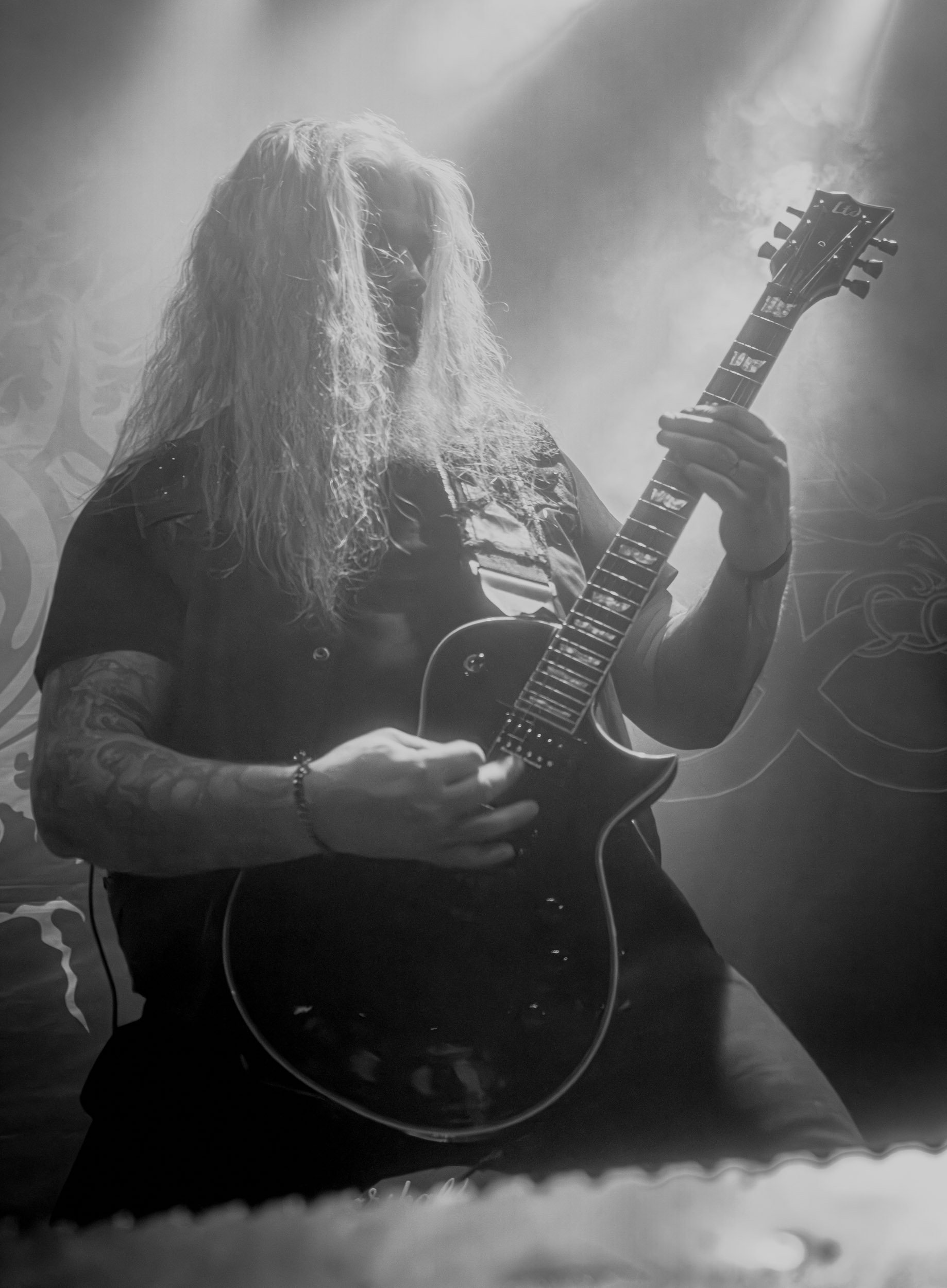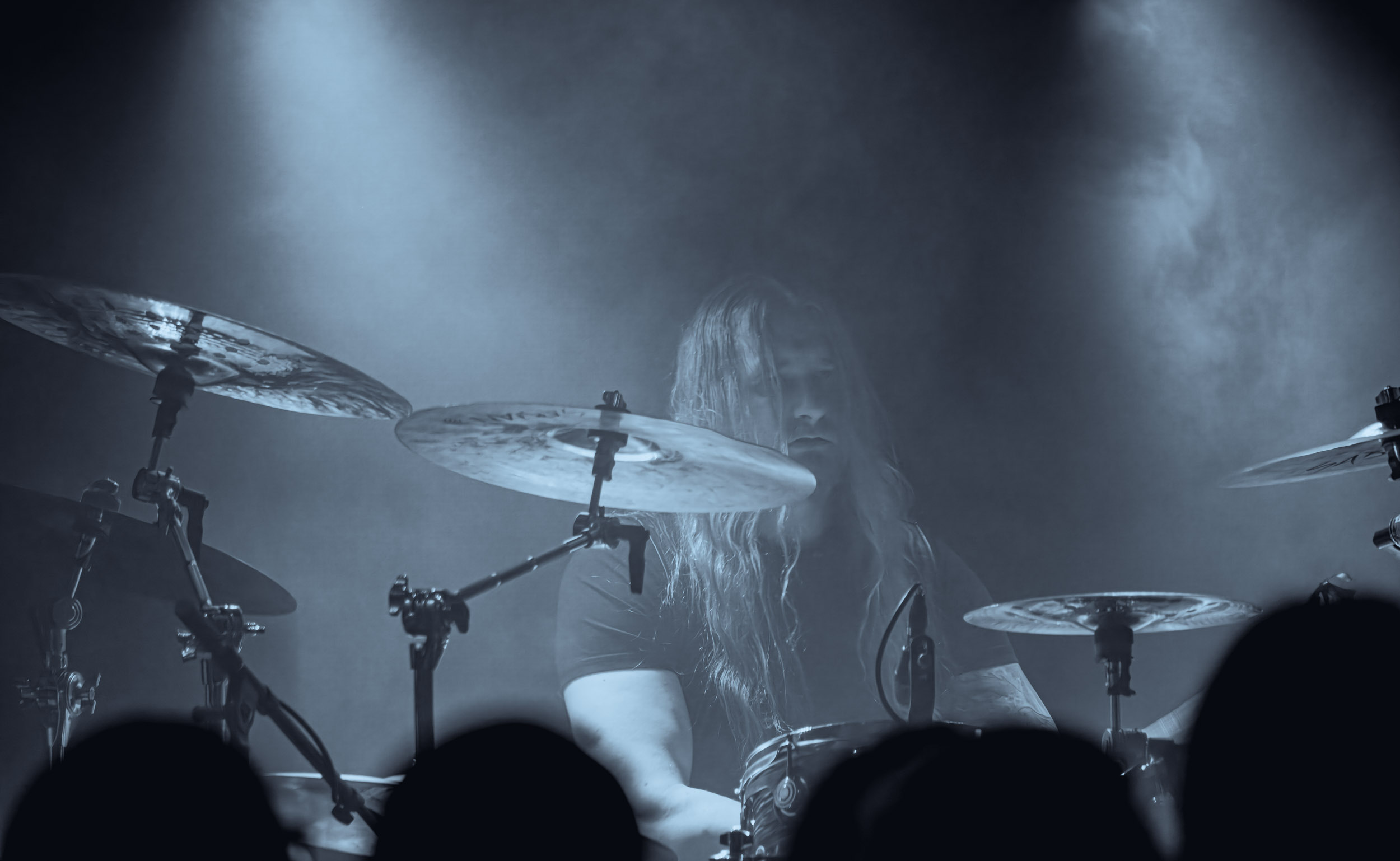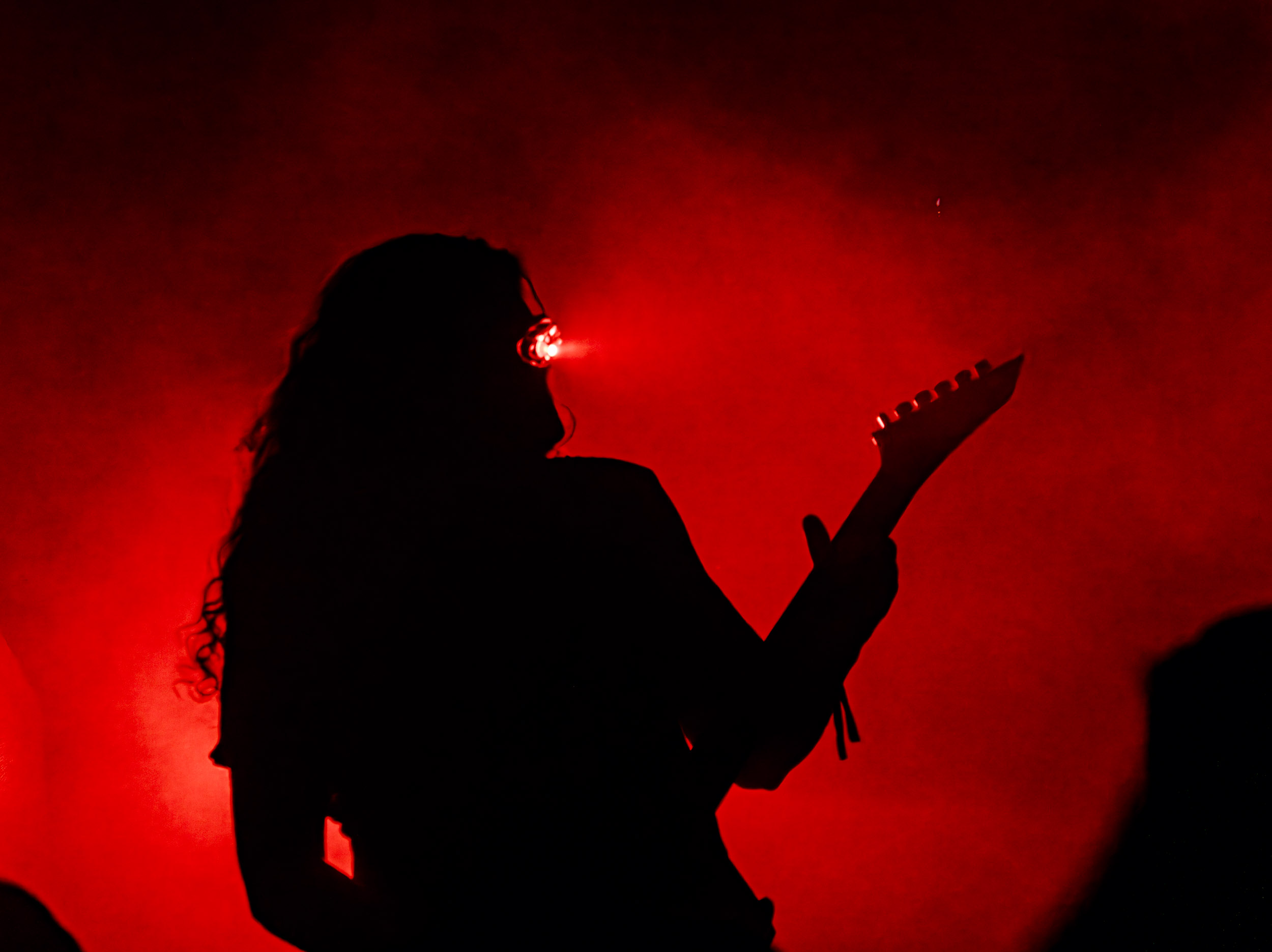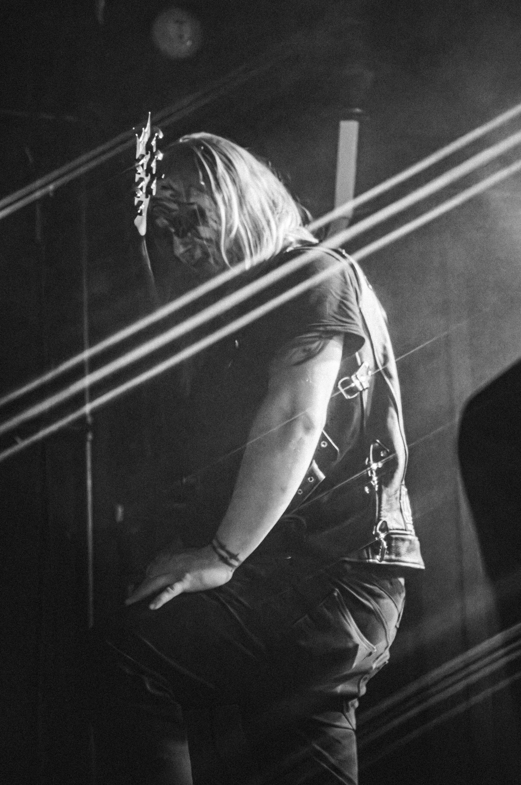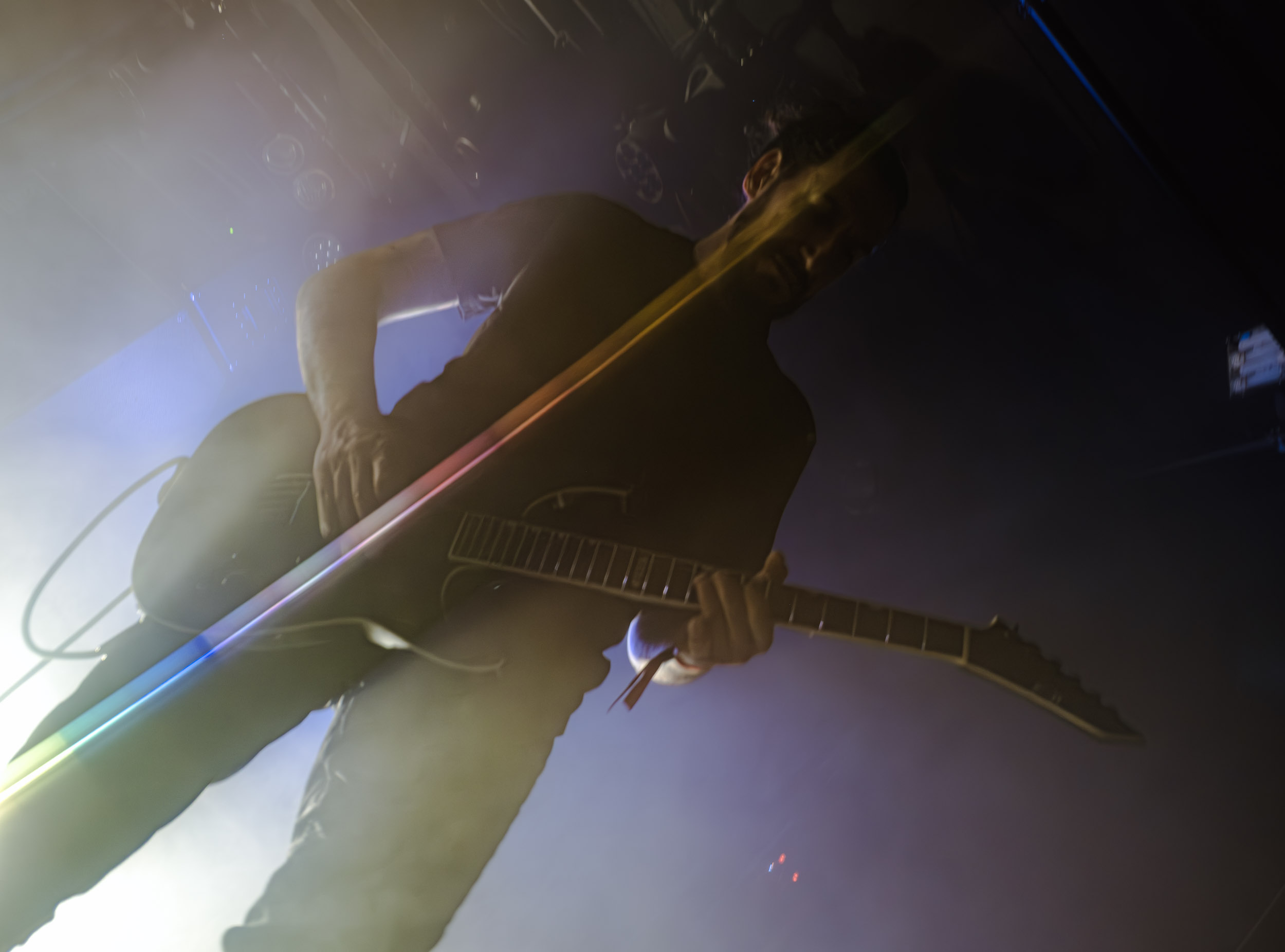 Celeste : Second représentant de la France à l’affiche de cette année après Seth, Celeste est aussi celui de Lyon. Autant dire, alors, que c’est alors un double élan patriotique qui me donne la motivation d’affronter une dernière fois les conditions photographiques compliquées de John Dee. Si je ne cache pas être fière de voir mes concitoyens se faire connaître et se produire à l’international, je ne cache pas non plus qu’ils ne me rendent pas la tâche facile — pour parler en euphémismes ! Affirmer que l’ambiance est sombre en semble un aussi, le groupe ne laissant pas entrer la lumière, au sens propre comme au figuré. Le style, mêlant blackened sludge et post-hardcore, est porteur de thématiques lourdes et graves, parmi lesquelles les violences domestiques. Du point de vue du langage scénique, cela se traduit par un son du même acabit — particulièrement au niveau de la basse — et, au niveau visuel, par une direction artistique oscillant entre quasi-absence d’éclairage et lumières rouges monochromes figurant du sang, éclairage que vient compléter une épaisse couche de fumée. Avec Celeste, tout n’est que noirceur, nihilisme et désespoir ; et cela, nul besoin de maîtriser la langue de Molière pour le comprendre. Du moins tel est le cas pour les spectateurs présents ce soir, chez qui la catharsis bien connue des fans les plus fidèles du groupe produit son effet. En outre, et peut-être est-ce lié au fait qu’ils jouent face à un public qui ne les connaît que peu, les musiciens tentent une petite interaction non-verbale avec les gens en les incitant à taper dans les mains… Je reconnais me laisser surprendre par ce mini-élan communicatif, différent de la distance à laquelle Celeste a habitué son public français ! Malheureusement pour lui, le quatuor pâtit du créneau horaire le plus désavantageux du running order, la majorité des spectateurs ayant pris de l’avance pour voir Behemoth, ce qui fait qu’il se retrouve à jouer devant un public clairsemé. La fumée envahissant l’espace clos de John Dee n’aide pas non plus, finissant par devenir étouffante — sérieusement, qui a eu l’idée de fermer la porte vers les escaliers ? — et, devant moi aussi prendre de l’avance pour shooter la tête d’affiche, je ne peux rester longtemps avant de remonter. J’aurai tout de même eu la satisfaction de reconnaître quelques extraits des productions récentes de Celeste que sont l’album Assassine(s) et l’EP Épilogue(s), ainsi que de tirer quelques images fortes, comme le groupe en offre à chaque fois.