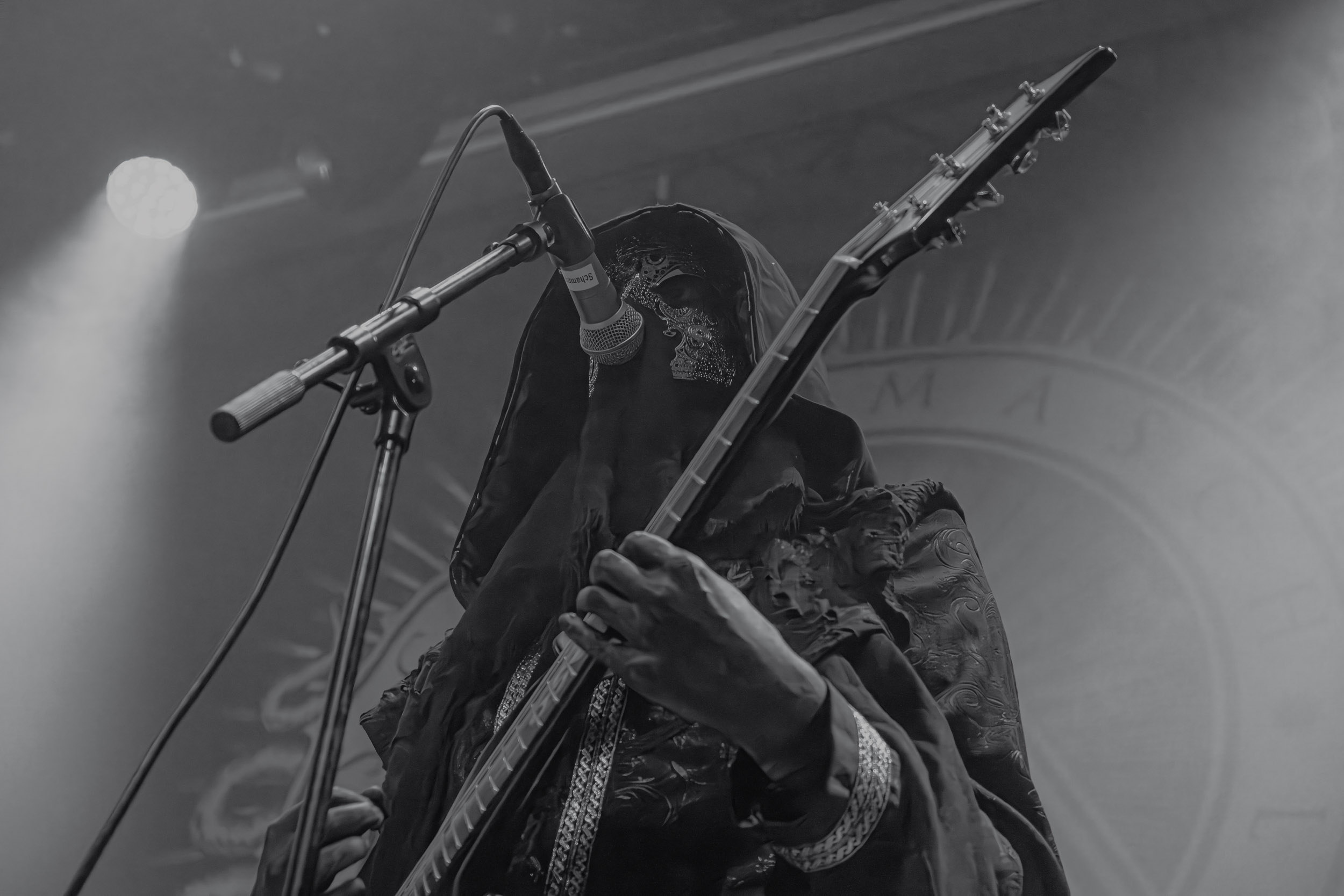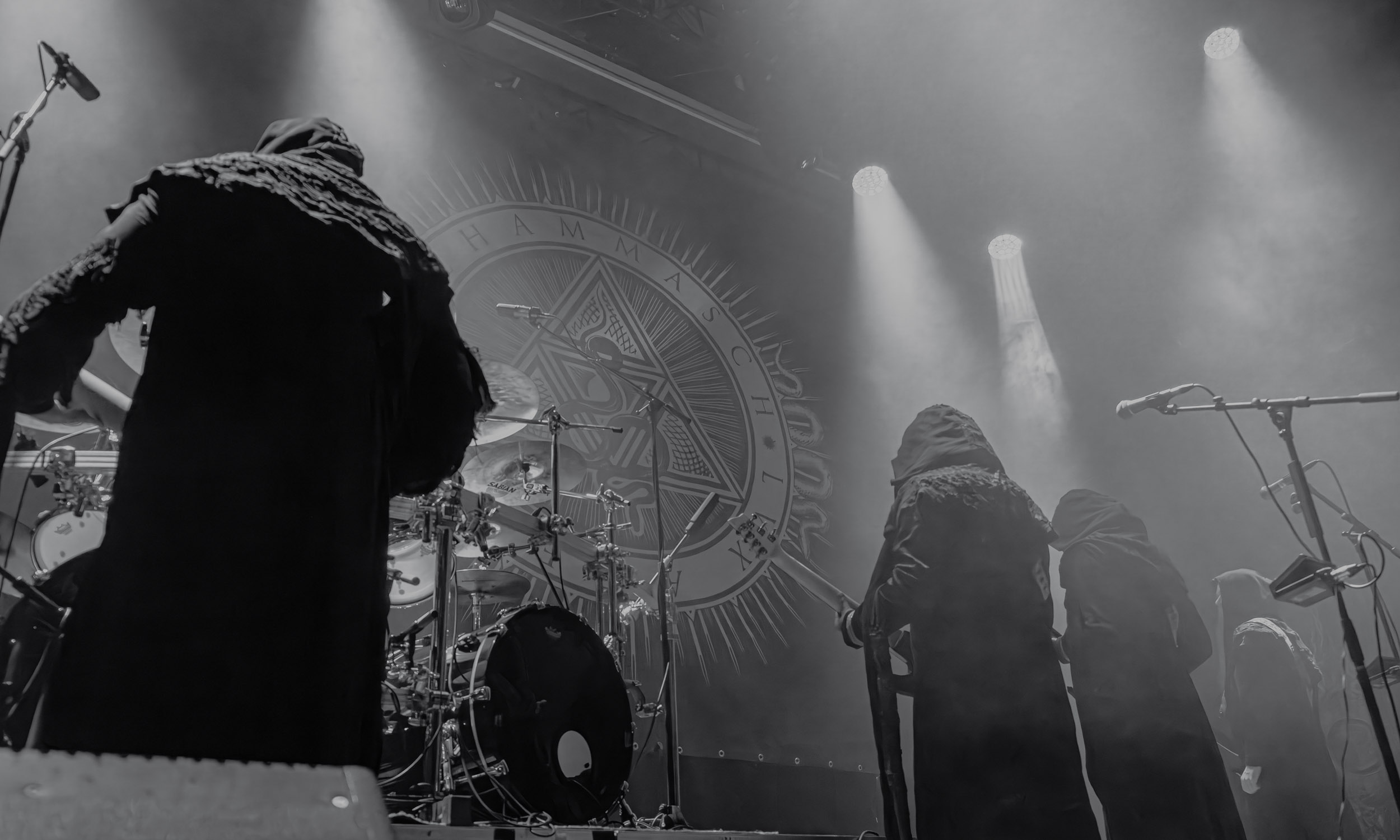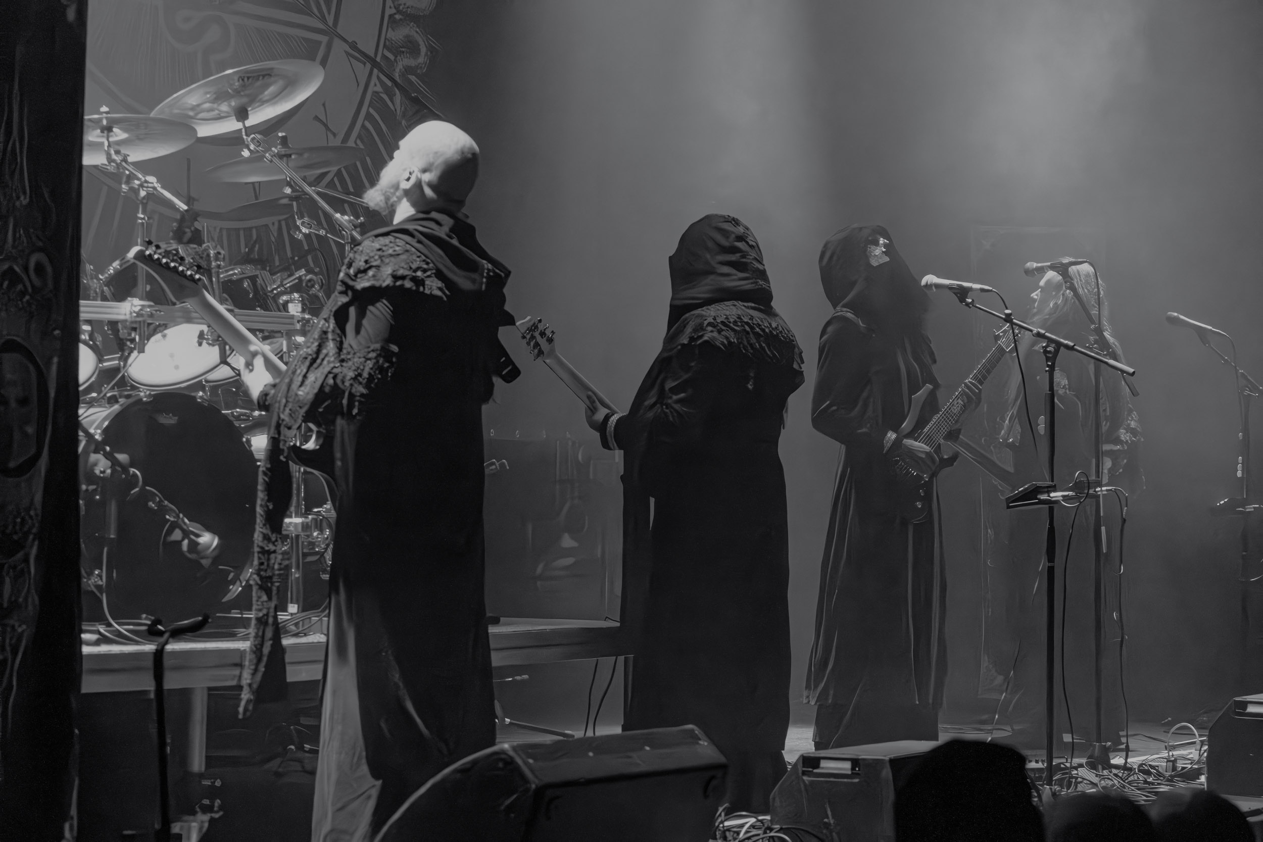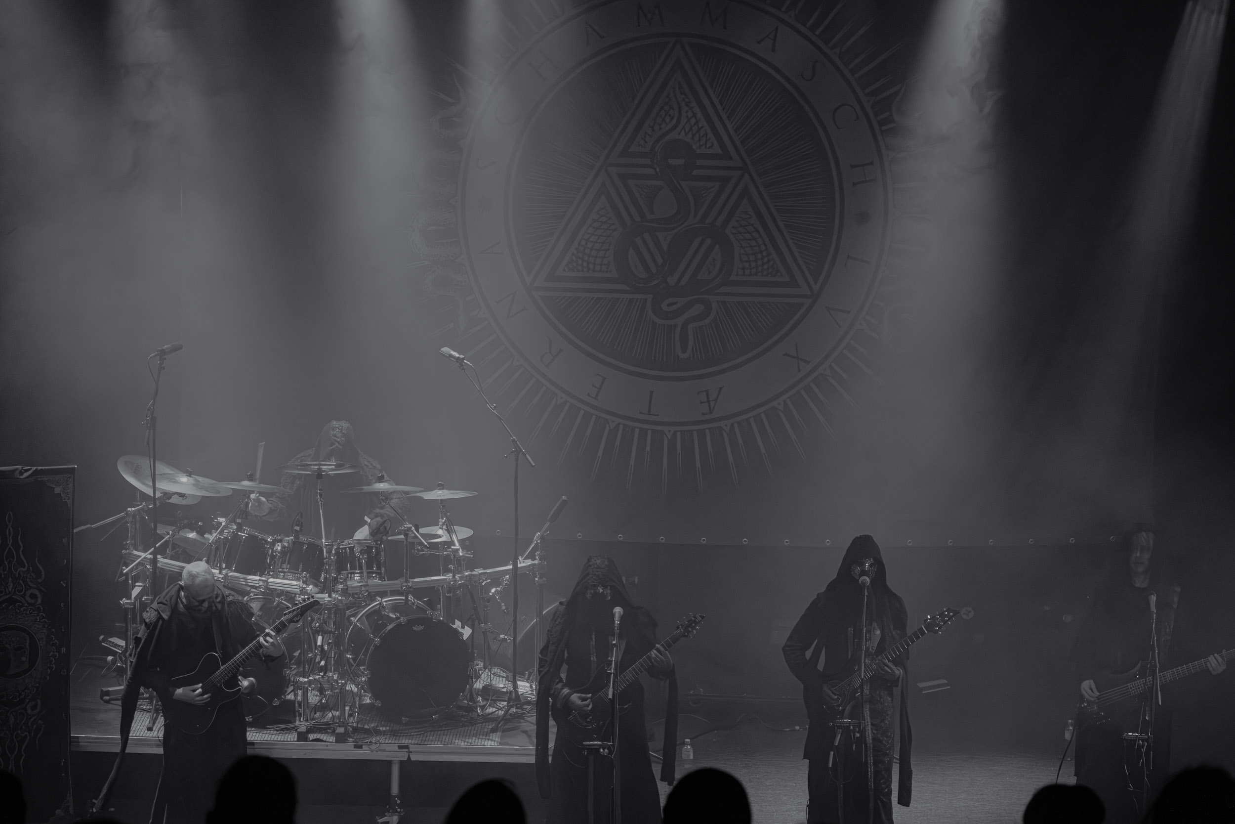 Schammasch : Schammasch comptait parmi les formations dont j’avais le plus hâte de découvrir la performance scénique à l’Inferno 2025, son écoute préparatoire ne m’ayant pas laissée indifférente. Coupons d’emblée court à tout suspense : mes premiers moments dans le pit, au plus près du groupe, me mènent à comprendre que je n’en sortirai pas indemne. Classable de prime abord dans la grande catégorie du « black metal encapuchonné avec masques en option », Schammasch n’a pas de mal à prouver qu’il est bien plus que cela. Revendiquant son appartenance à la branche avant-gardiste du genre, le quintet originaire de Bâle en Suisse allemande illustre son propos par un style musical qui, pour le résumer grossièrement et à défaut de meilleurs termes, semble issu d’une rencontre du troisième type entre black metal et Killing Joke, pour ne citer que la référence la plus prégnante. Le son est dense à l’extrême, courtoisie de trois guitares à huit cordes, dont la présence d’aucune n’est superflue, d’une basse qui en compte cinq, d’une batterie dont les vibrations se répandent dans le sol et de micros chargés en réverbération. Au-delà d’un simple concert, c’est à un véritable rituel cérémoniel qu’assiste le public de l’Inferno, dont l’atmosphère captive tout aussi bien qu’elle suscite une forme de malaise. Schammasch ouvre les portes vers une dimension parallèle sans pour autant prendre le public par la main pour lui en faciliter l’accès, et il apparaît clair qu’il faut s’accrocher à ce que l’on peut pour ne pas rester sur le carreau… y compris lorsque vient le moment du retour sur Terre. Une fois dans la dimension Schammasch, il devient en effet tout aussi compliqué de la quitter, et plus dure sera la chute à la sortie ! Un voyage qui prend de court et malmène ses passagers, mais en vaut plus que largement la chandelle.