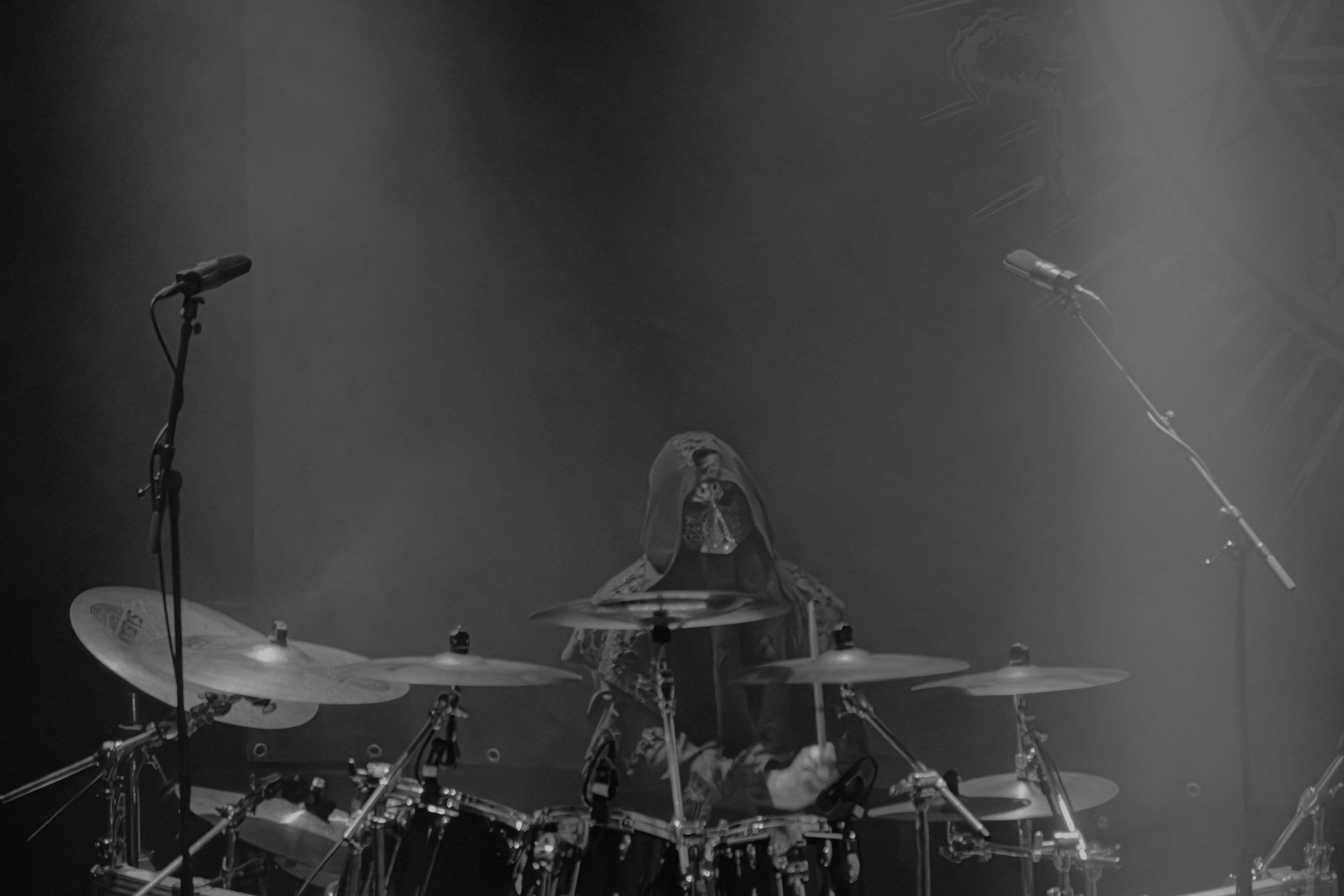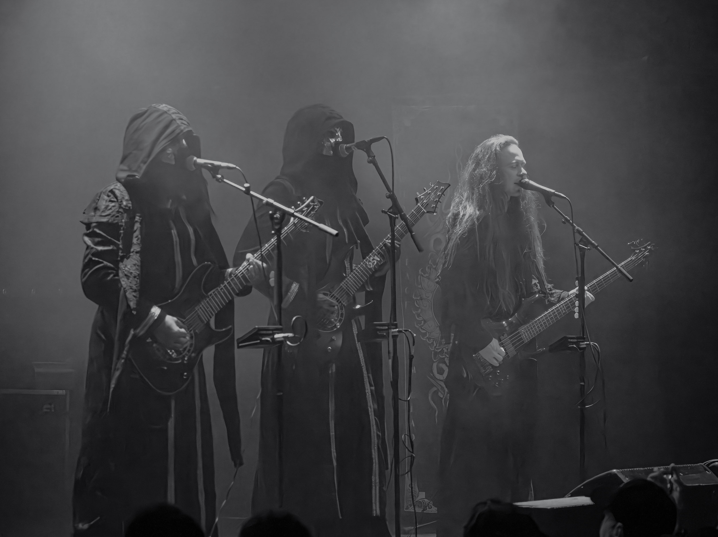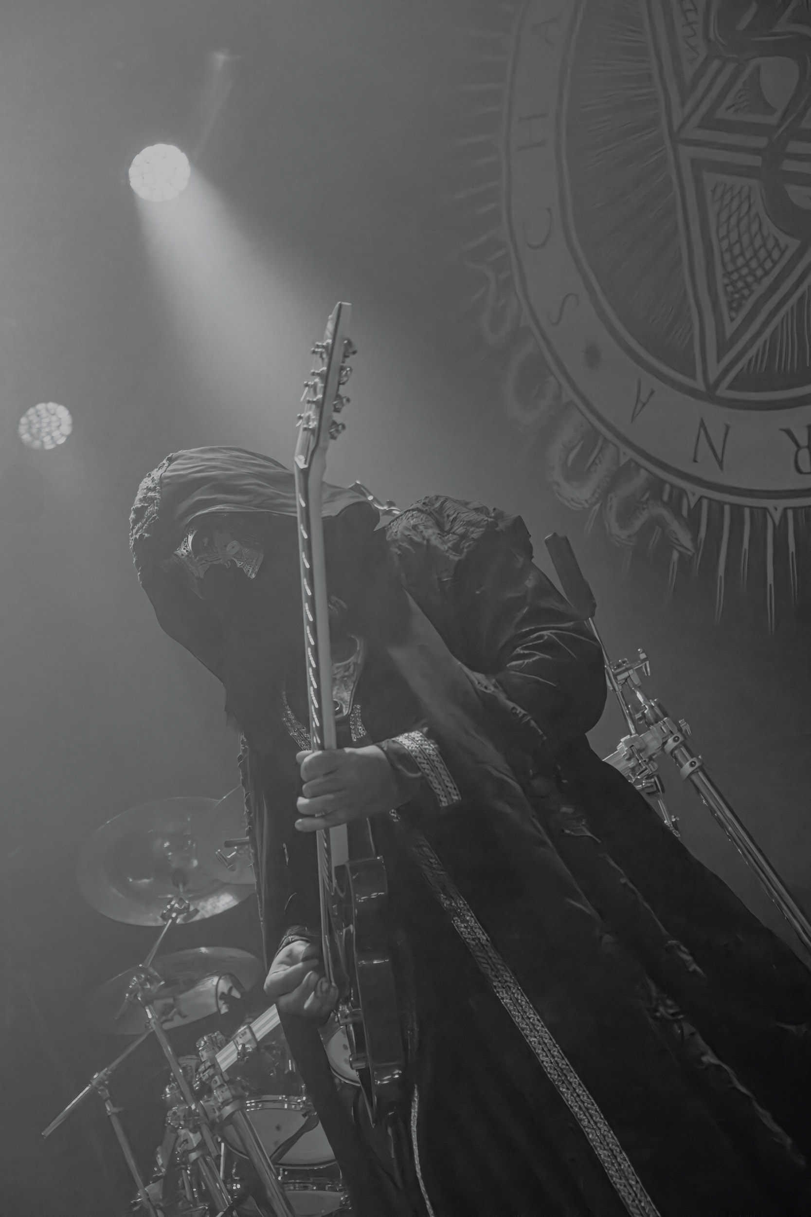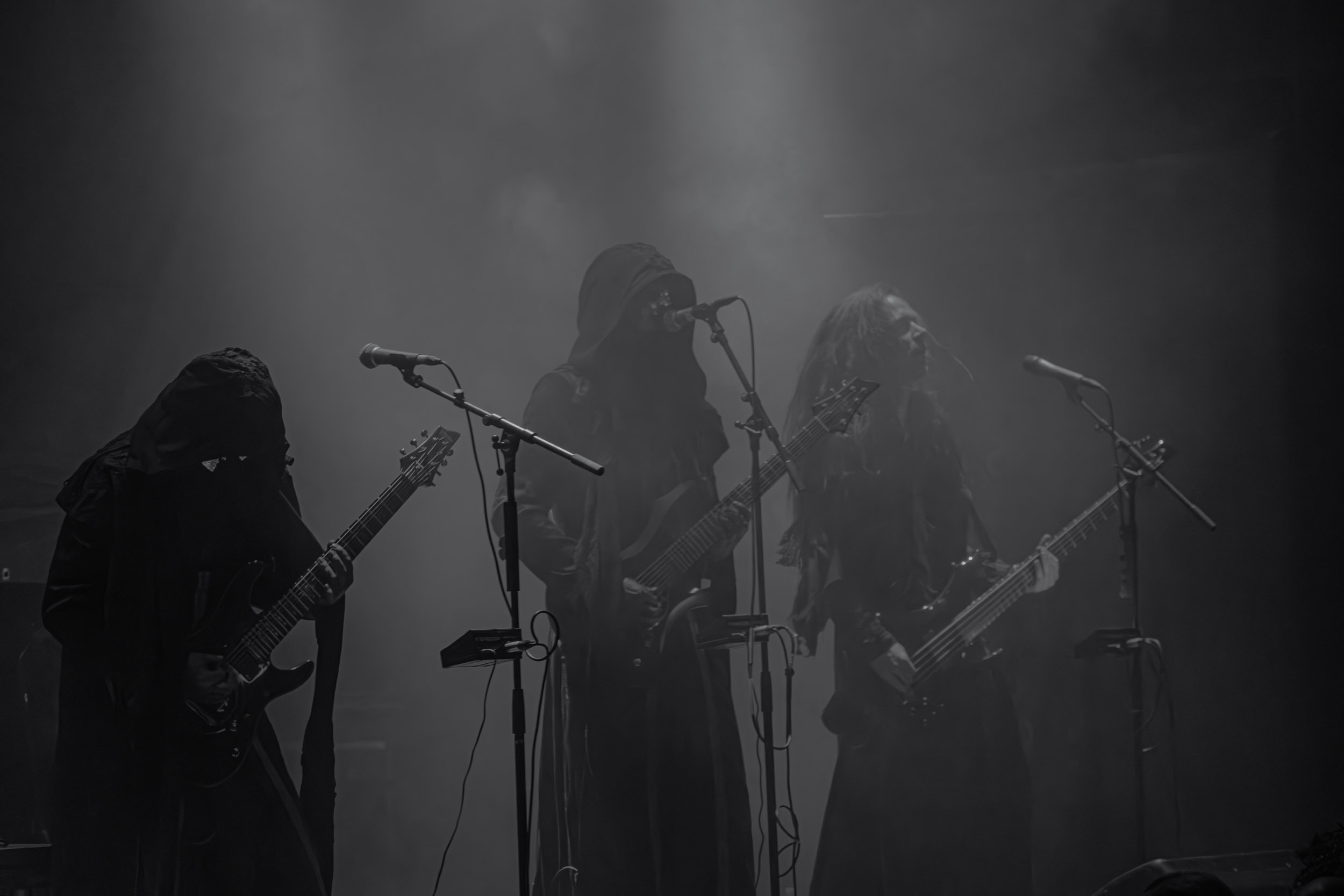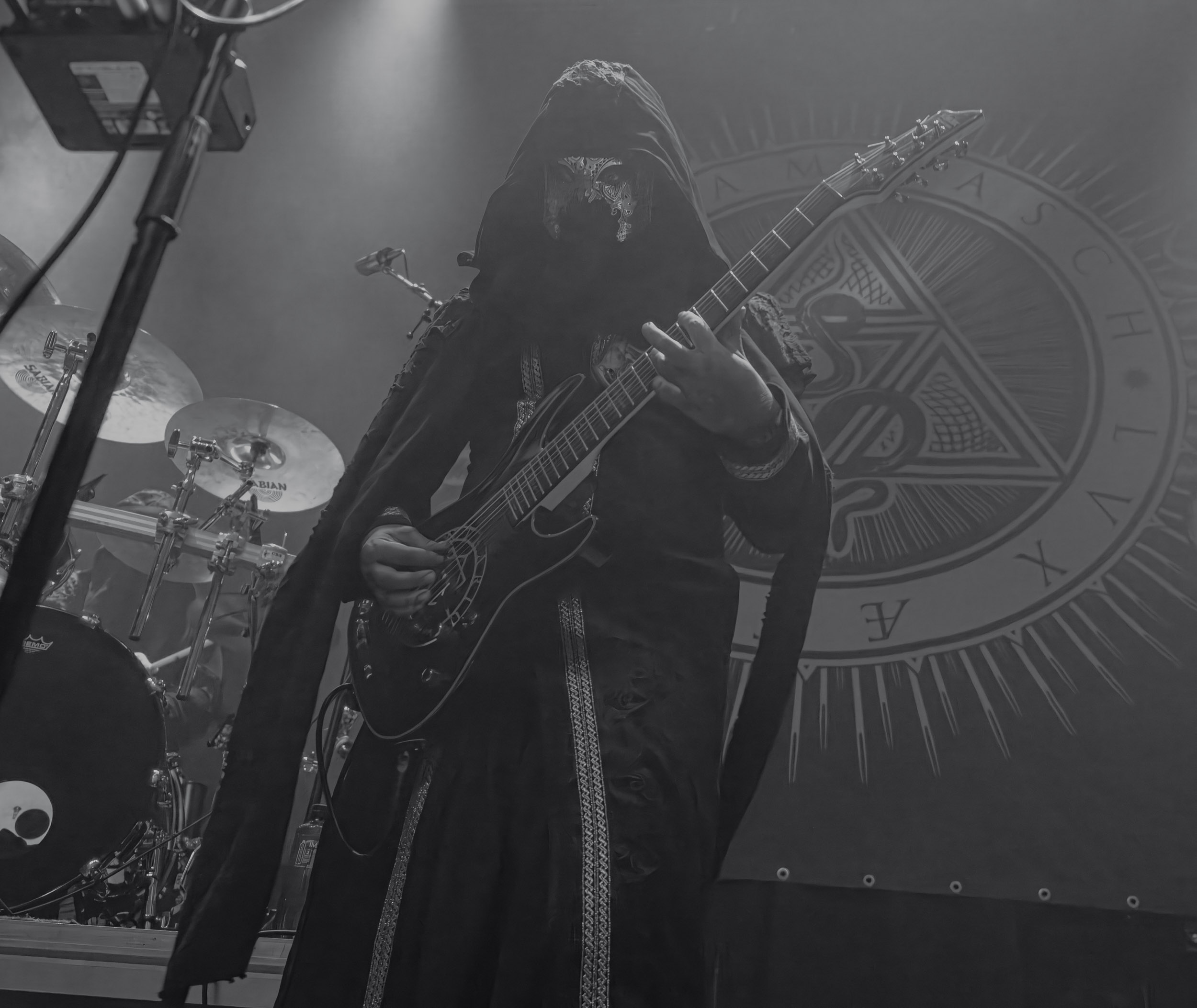 Schammasch : Schammasch comptait parmi les formations dont j’avais le plus hâte de découvrir la performance scénique à l’Inferno 2025, son écoute préparatoire ne m’ayant pas laissée indifférente. Coupons d’emblée court à tout suspense : mes premiers moments dans le pit, au plus près du groupe, me mènent à comprendre que je n’en sortirai pas indemne. Classable de prime abord dans la grande catégorie du « black metal encapuchonné avec masques en option », Schammasch n’a pas de mal à prouver qu’il est bien plus que cela. Revendiquant son appartenance à la branche avant-gardiste du genre, le quintet originaire de Bâle en Suisse allemande illustre son propos par un style musical qui, pour le résumer grossièrement et à défaut de meilleurs termes, semble issu d’une rencontre du troisième type entre black metal et Killing Joke, pour ne citer que la référence la plus prégnante. Le son est dense à l’extrême, courtoisie de trois guitares à huit cordes, dont la présence d’aucune n’est superflue, d’une basse qui en compte cinq, d’une batterie dont les vibrations se répandent dans le sol et de micros chargés en réverbération. Au-delà d’un simple concert, c’est à un véritable rituel cérémoniel qu’assiste le public de l’Inferno, dont l’atmosphère captive tout aussi bien qu’elle suscite une forme de malaise. Schammasch ouvre les portes vers une dimension parallèle sans pour autant prendre le public par la main pour lui en faciliter l’accès, et il apparaît clair qu’il faut s’accrocher à ce que l’on peut pour ne pas rester sur le carreau… y compris lorsque vient le moment du retour sur Terre. Une fois dans la dimension Schammasch, il devient en effet tout aussi compliqué de la quitter, et plus dure sera la chute à la sortie ! Un voyage qui prend de court et malmène ses passagers, mais en vaut plus que largement la chandelle.