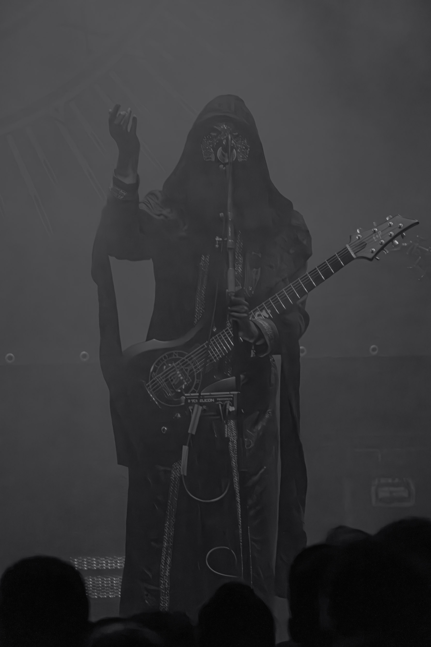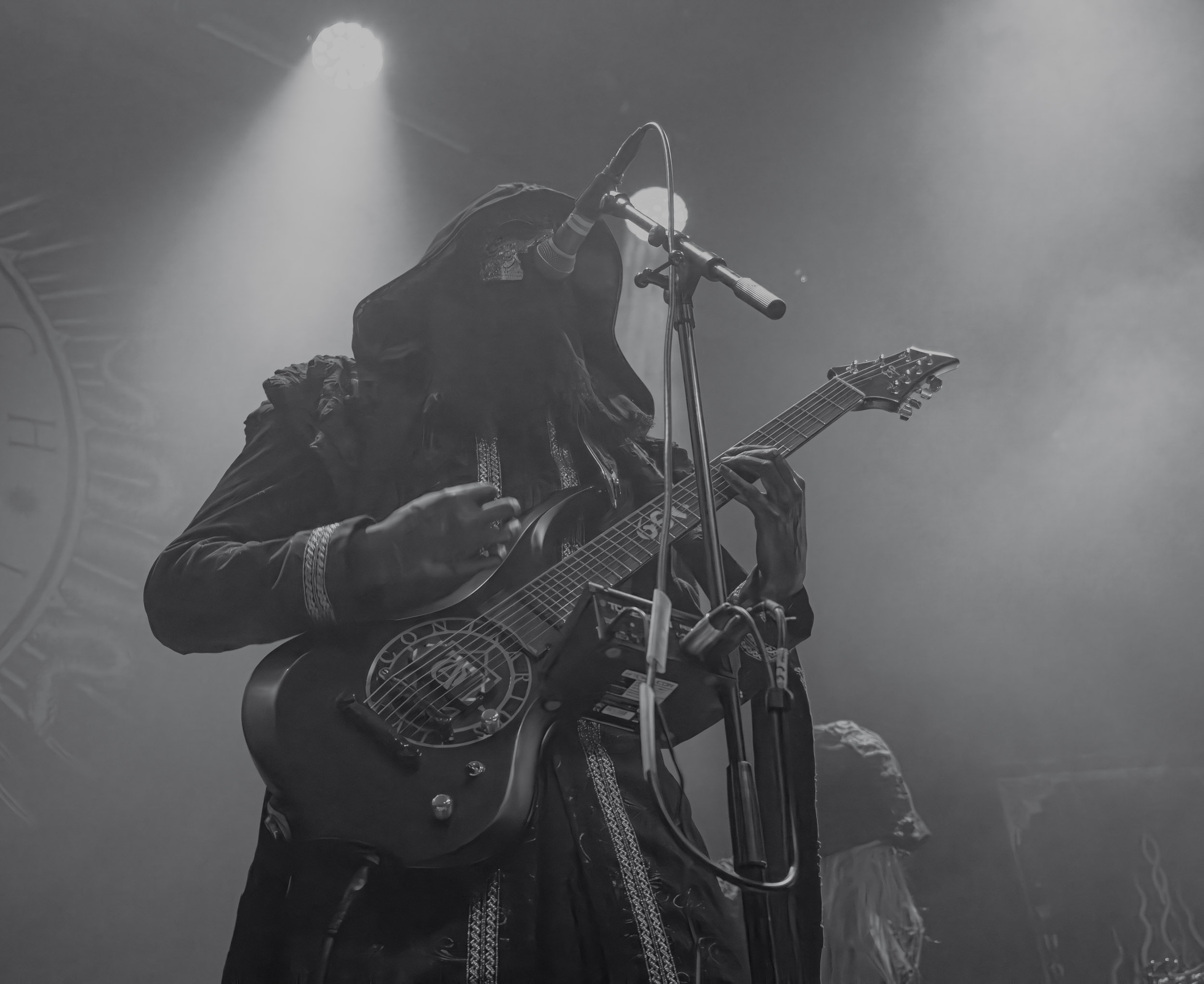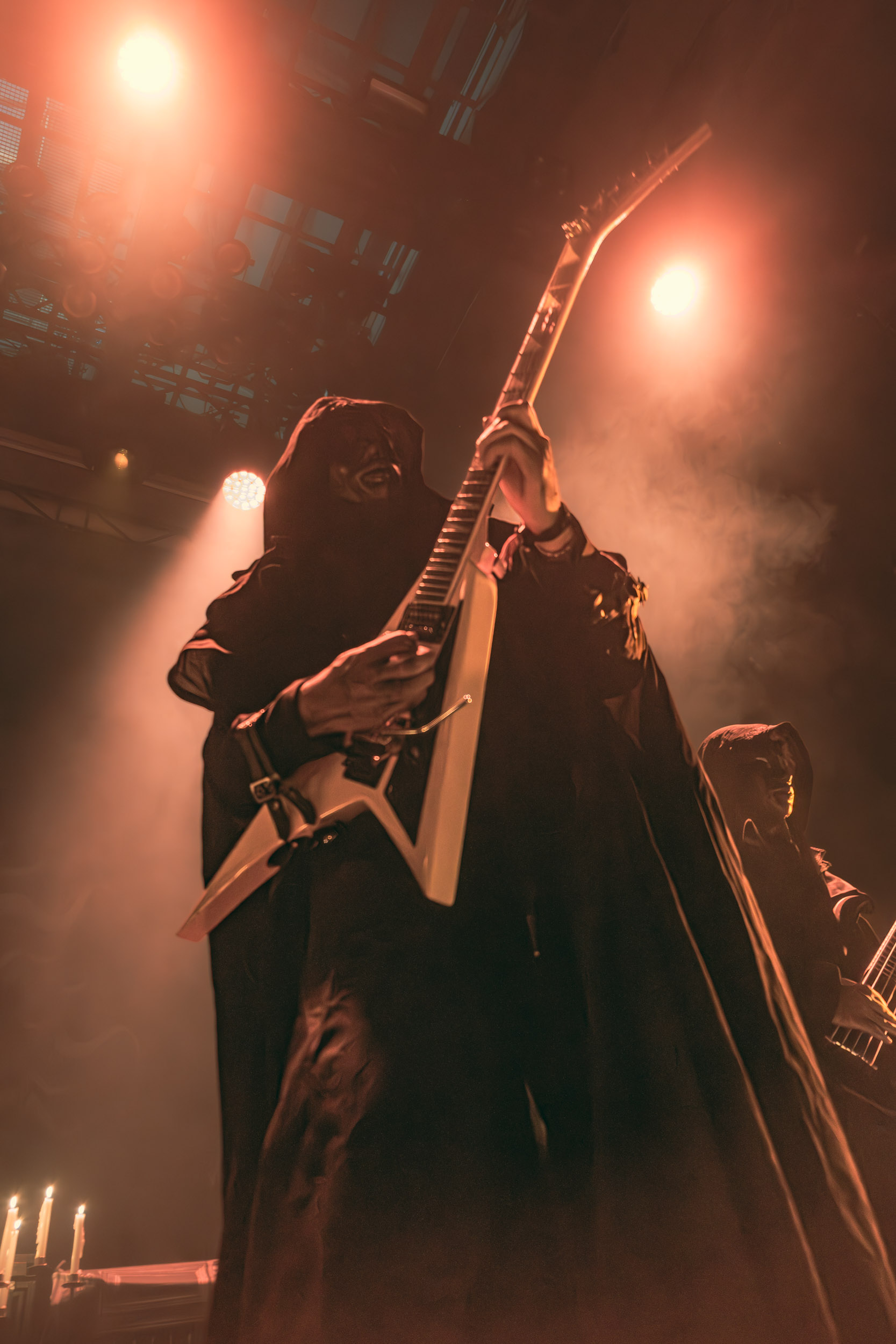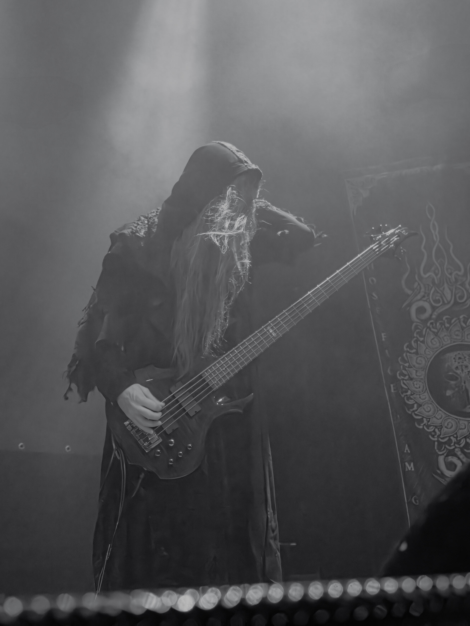 Schammasch : Schammasch comptait parmi les formations dont j’avais le plus hâte de découvrir la performance scénique à l’Inferno 2025, son écoute préparatoire ne m’ayant pas laissée indifférente. Coupons d’emblée court à tout suspense : mes premiers moments dans le pit, au plus près du groupe, me mènent à comprendre que je n’en sortirai pas indemne. Classable de prime abord dans la grande catégorie du « black metal encapuchonné avec masques en option », Schammasch n’a pas de mal à prouver qu’il est bien plus que cela. Revendiquant son appartenance à la branche avant-gardiste du genre, le quintet originaire de Bâle en Suisse allemande illustre son propos par un style musical qui, pour le résumer grossièrement et à défaut de meilleurs termes, semble issu d’une rencontre du troisième type entre black metal et Killing Joke, pour ne citer que la référence la plus prégnante. Le son est dense à l’extrême, courtoisie de trois guitares à huit cordes, dont la présence d’aucune n’est superflue, d’une basse qui en compte cinq, d’une batterie dont les vibrations se répandent dans le sol et de micros chargés en réverbération. Au-delà d’un simple concert, c’est à un véritable rituel cérémoniel qu’assiste le public de l’Inferno, dont l’atmosphère captive tout aussi bien qu’elle suscite une forme de malaise. Schammasch ouvre les portes vers une dimension parallèle sans pour autant prendre le public par la main pour lui en faciliter l’accès, et il apparaît clair qu’il faut s’accrocher à ce que l’on peut pour ne pas rester sur le carreau… y compris lorsque vient le moment du retour sur Terre. Une fois dans la dimension Schammasch, il devient en effet tout aussi compliqué de la quitter, et plus dure sera la chute à la sortie ! Un voyage qui prend de court et malmène ses passagers, mais en vaut plus que largement la chandelle.