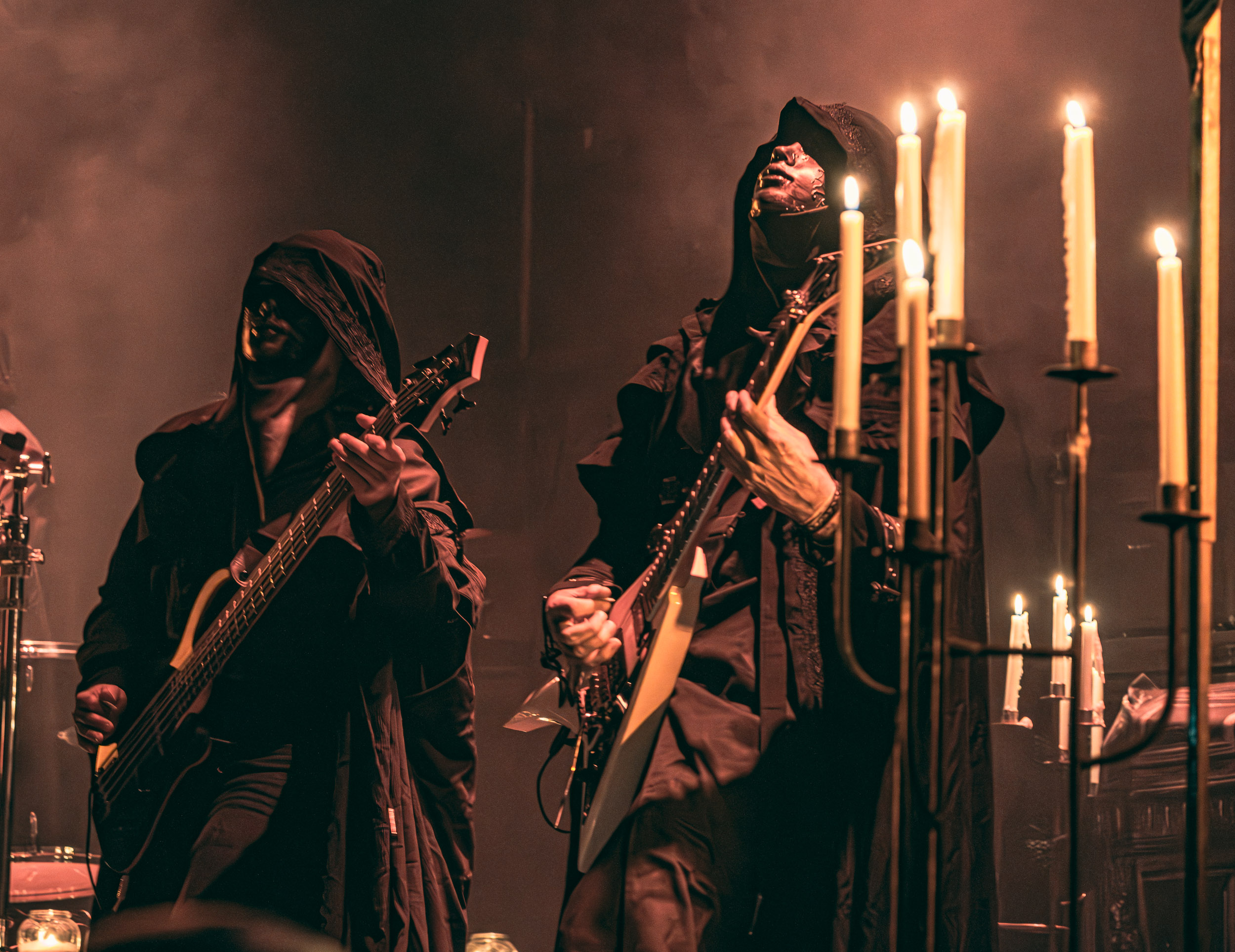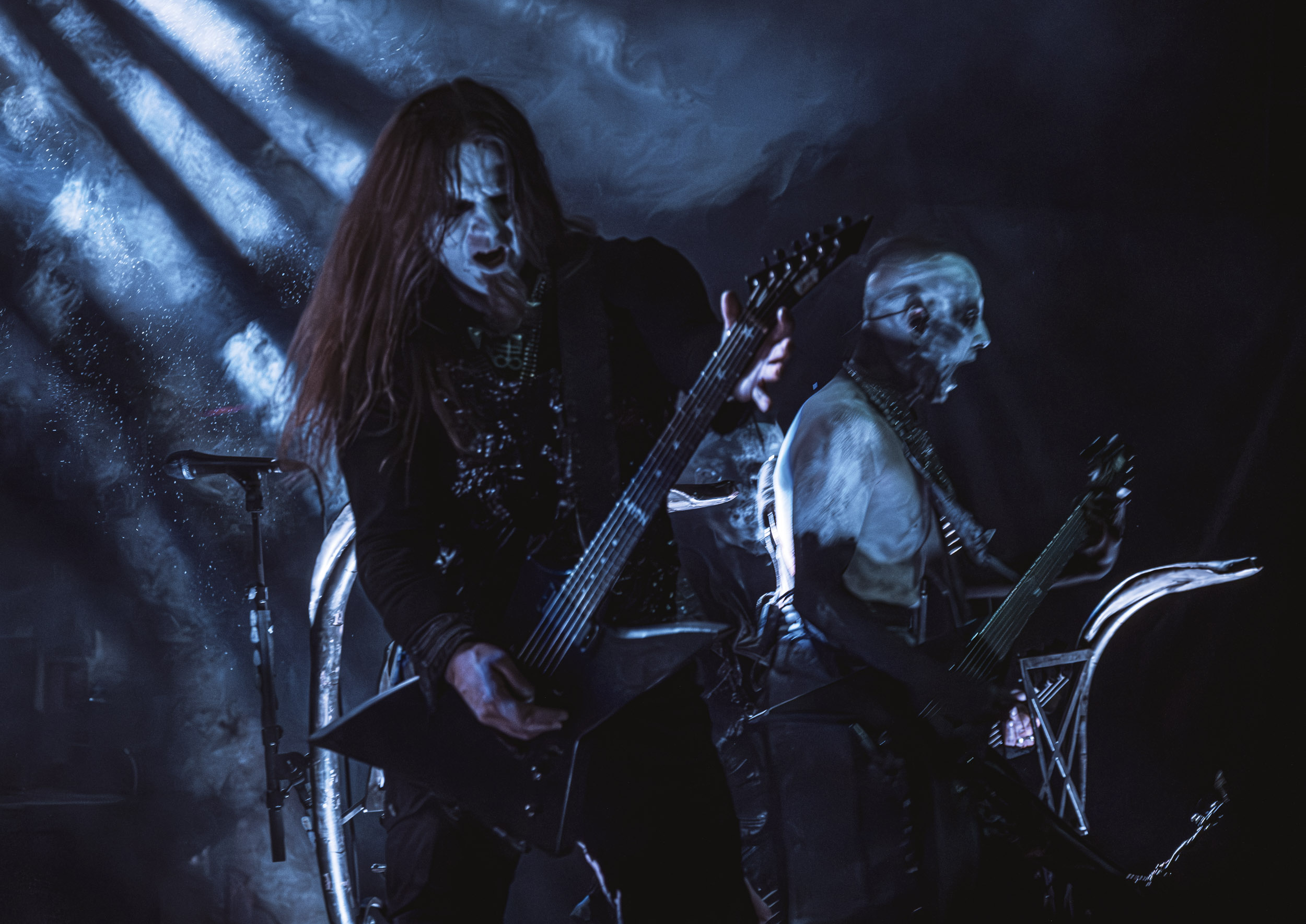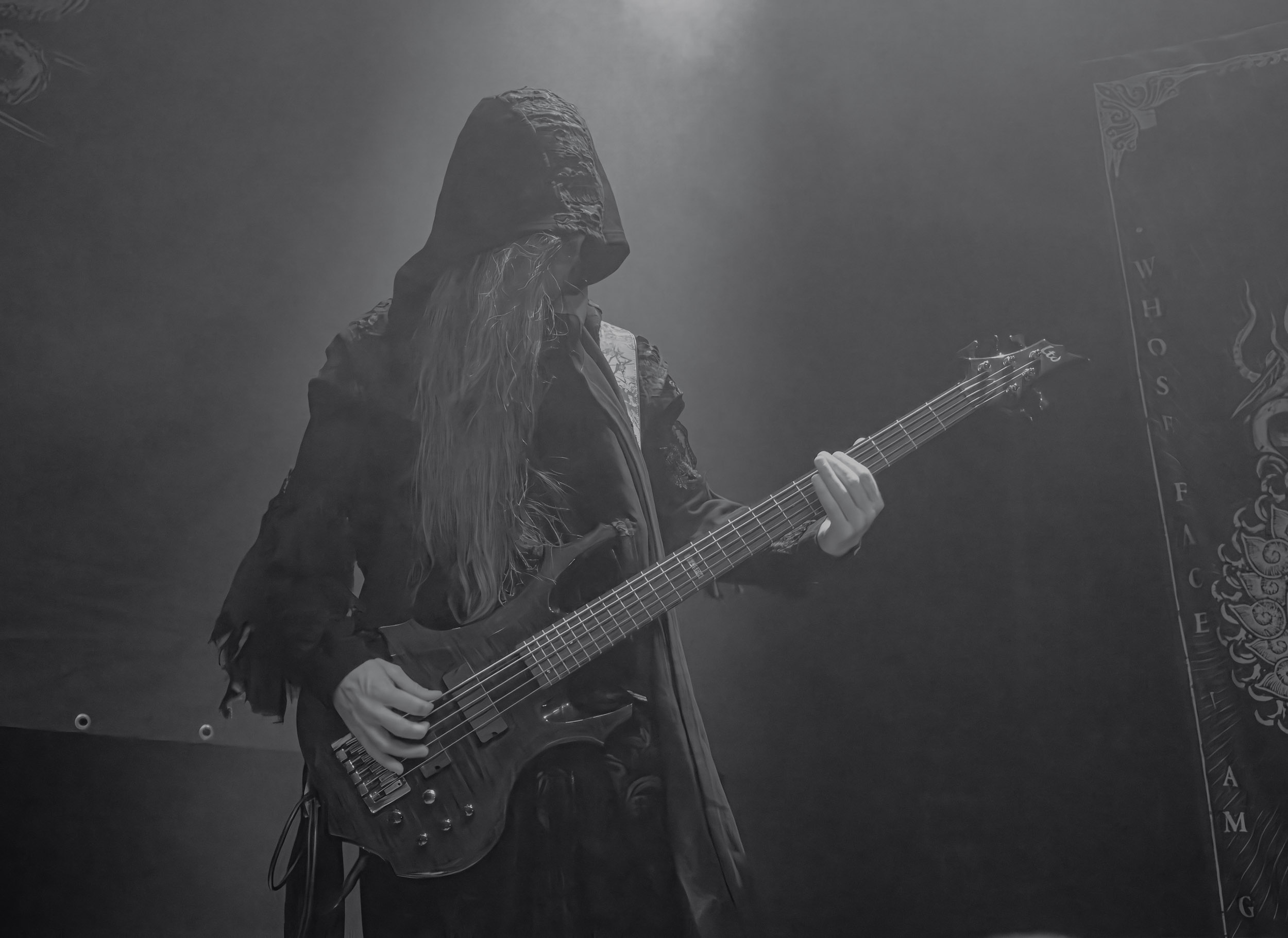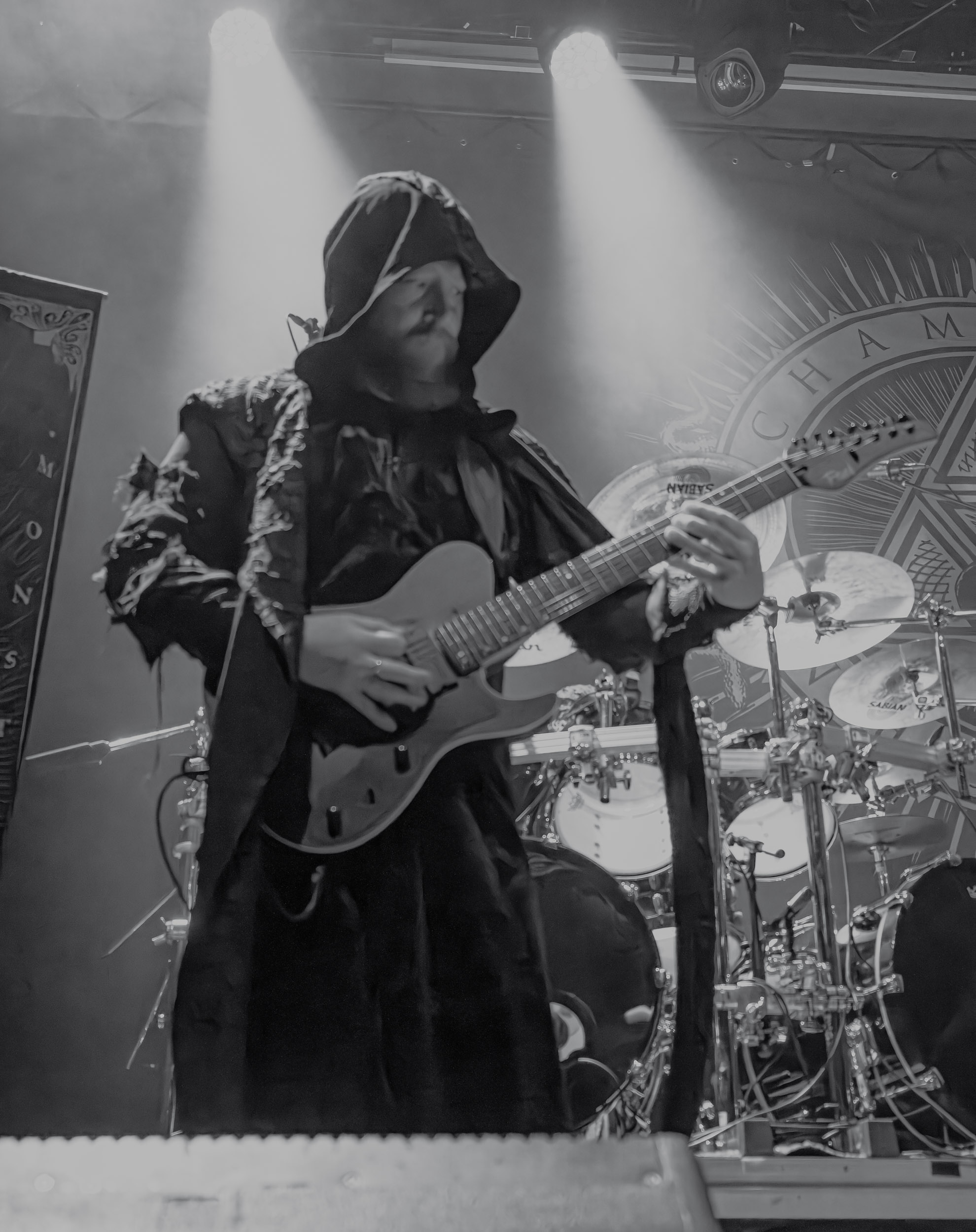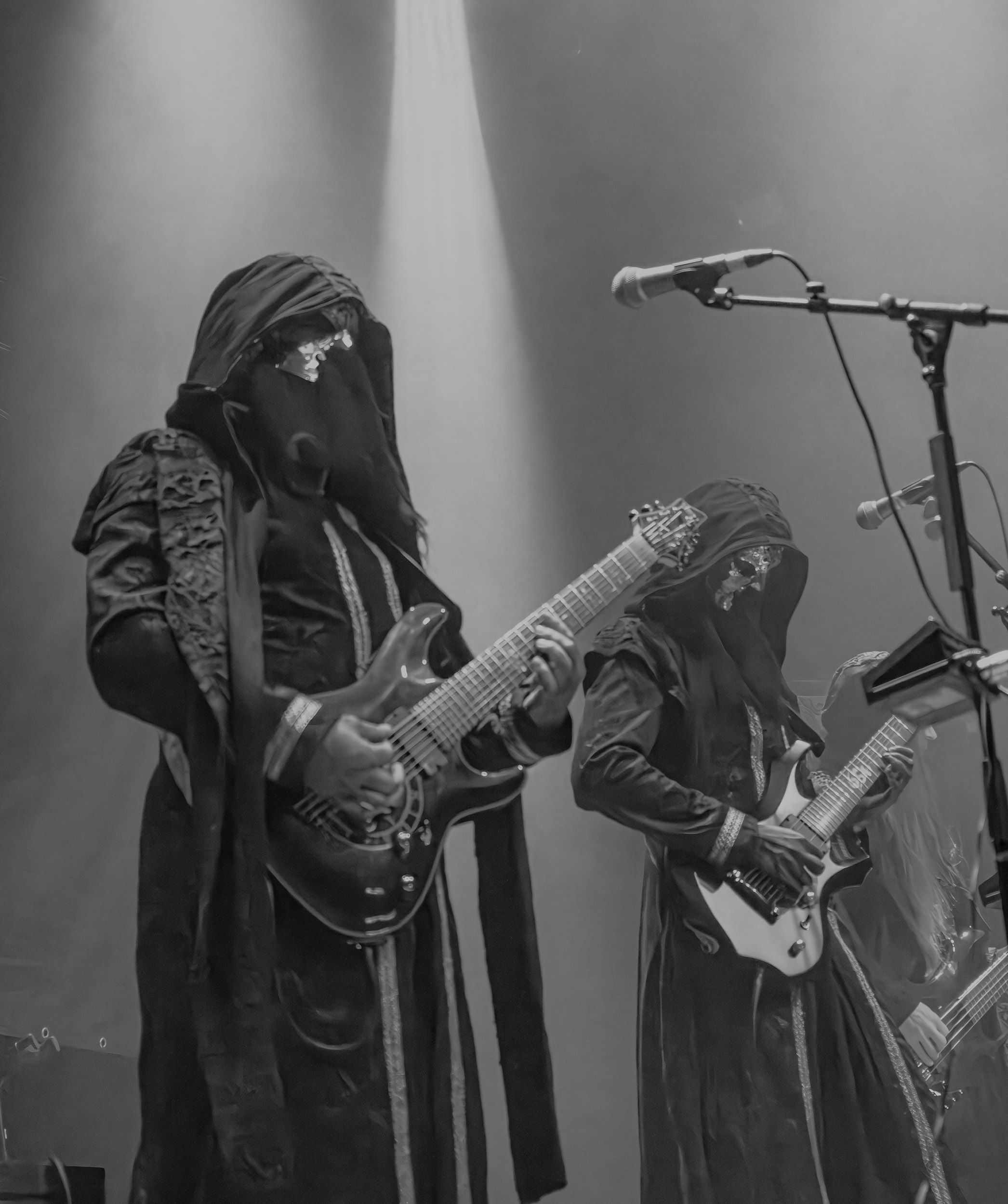Schammasch : Schammasch comptait parmi les formations dont j’avais le plus hâte de découvrir la performance scénique à l’Inferno 2025, son écoute préparatoire ne m’ayant pas laissée indifférente. Coupons d’emblée court à tout suspense : mes premiers moments dans le pit, au plus près du groupe, me mènent à comprendre que je n’en sortirai pas indemne. Classable de prime abord dans la grande catégorie du « black metal encapuchonné avec masques en option », Schammasch n’a pas de mal à prouver qu’il est bien plus que cela. Revendiquant son appartenance à la branche avant-gardiste du genre, le quintet originaire de Bâle en Suisse allemande illustre son propos par un style musical qui, pour le résumer grossièrement et à défaut de meilleurs termes, semble issu d’une rencontre du troisième type entre black metal et Killing Joke, pour ne citer que la référence la plus prégnante. Le son est dense à l’extrême, courtoisie de trois guitares à huit cordes, dont la présence d’aucune n’est superflue, d’une basse qui en compte cinq, d’une batterie dont les vibrations se répandent dans le sol et de micros chargés en réverbération. Au-delà d’un simple concert, c’est à un véritable rituel cérémoniel qu’assiste le public de l’Inferno, dont l’atmosphère captive tout aussi bien qu’elle suscite une forme de malaise. Schammasch ouvre les portes vers une dimension parallèle sans pour autant prendre le public par la main pour lui en faciliter l’accès, et il apparaît clair qu’il faut s’accrocher à ce que l’on peut pour ne pas rester sur le carreau… y compris lorsque vient le moment du retour sur Terre. Une fois dans la dimension Schammasch, il devient en effet tout aussi compliqué de la quitter, et plus dure sera la chute à la sortie ! Un voyage qui prend de court et malmène ses passagers, mais en vaut plus que largement la chandelle.