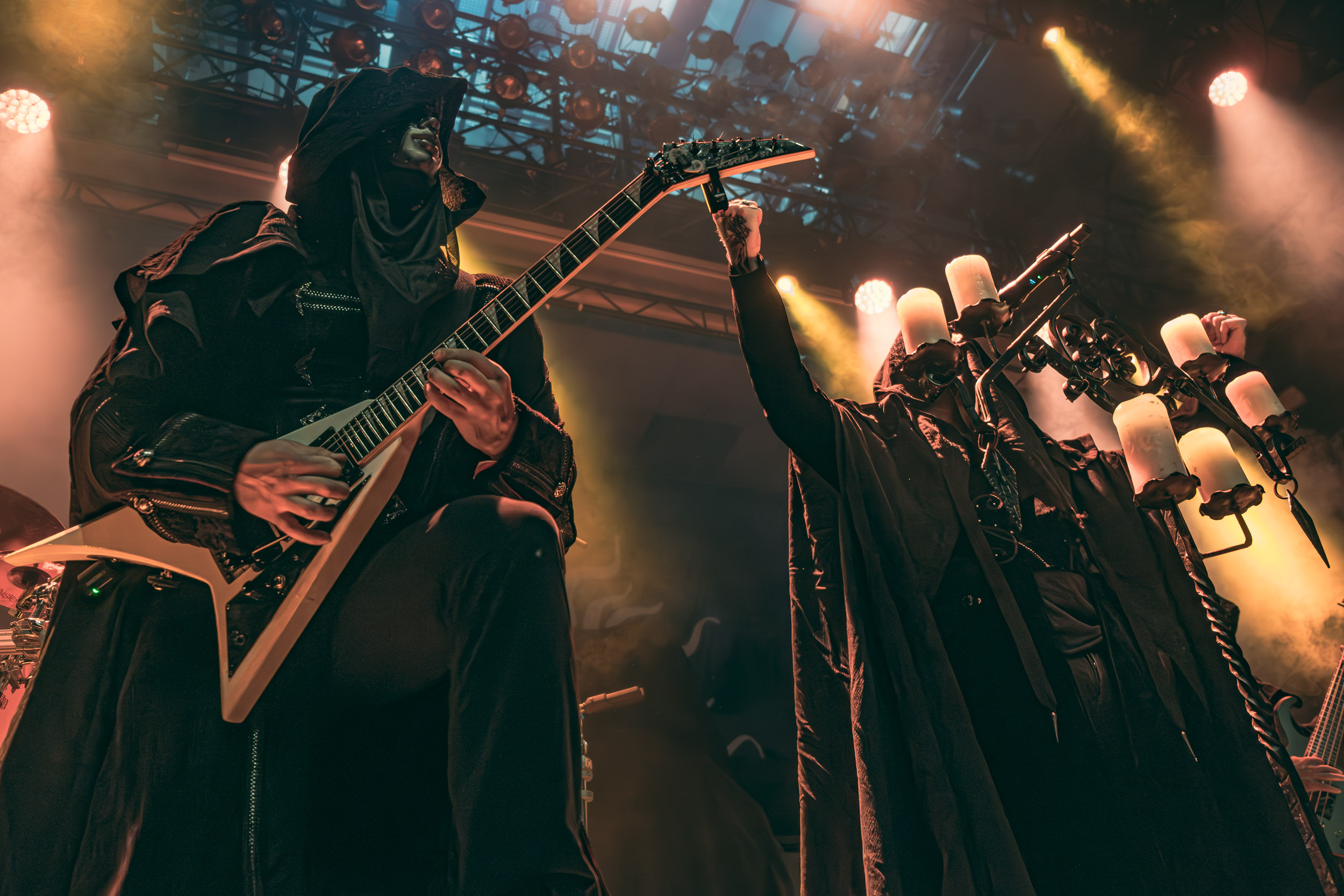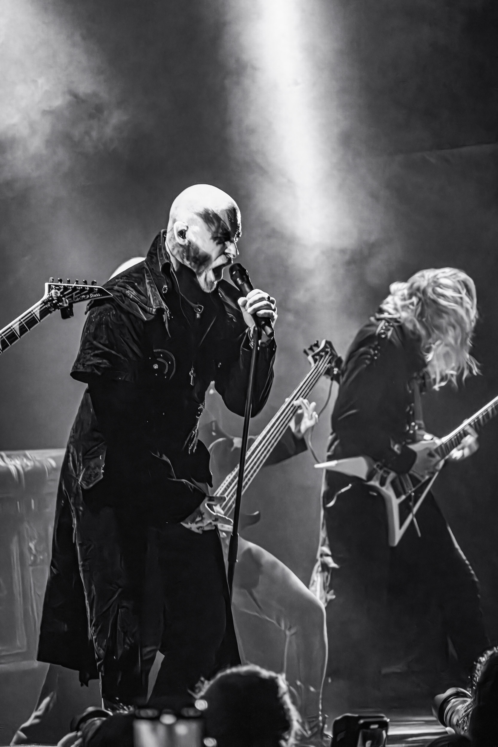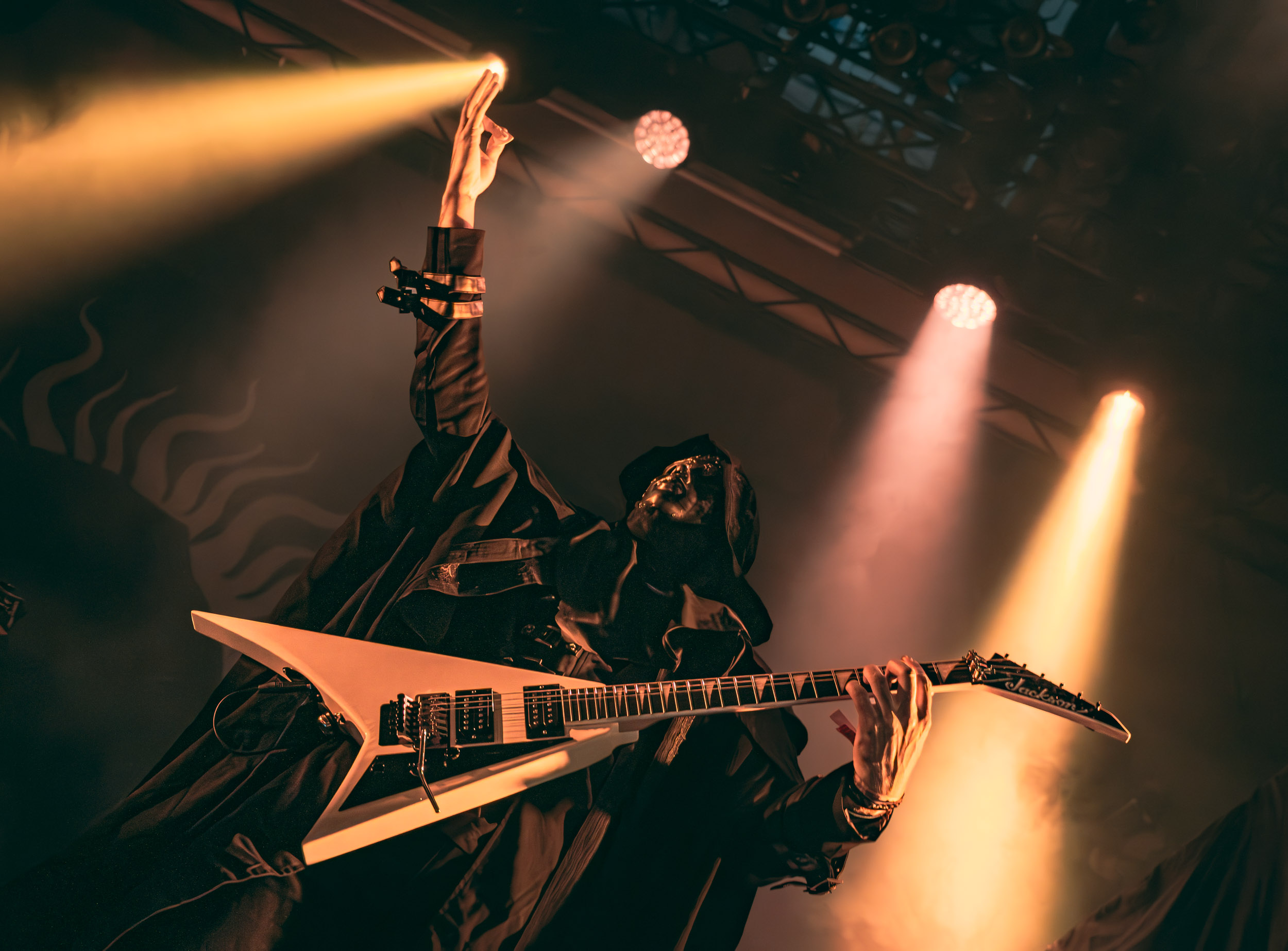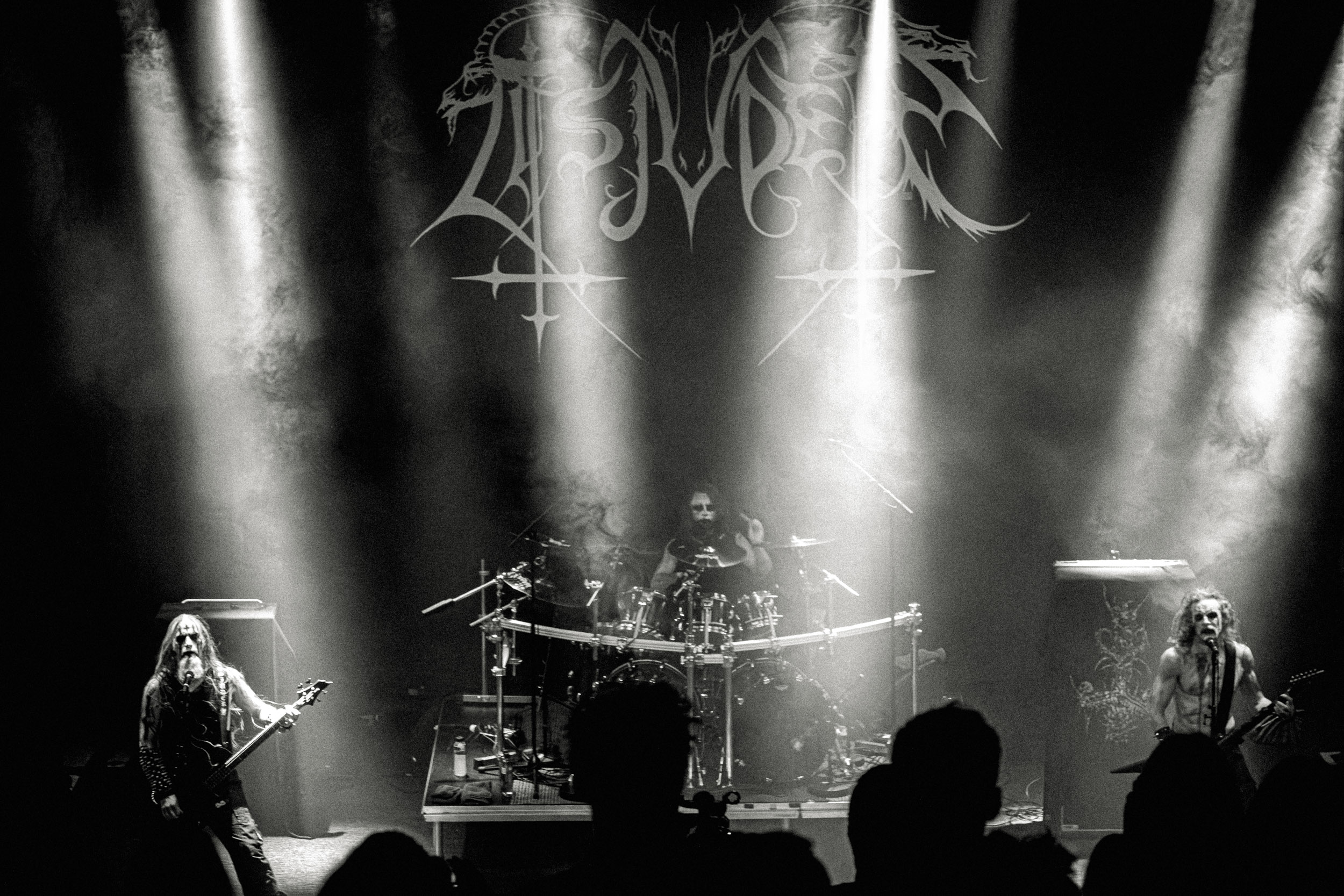Schammasch : Schammasch comptait parmi les formations dont j’avais le plus hâte de découvrir la performance scénique à l’Inferno 2025, son écoute préparatoire ne m’ayant pas laissée indifférente. Coupons d’emblée court à tout suspense : mes premiers moments dans le pit, au plus près du groupe, me mènent à comprendre que je n’en sortirai pas indemne. Classable de prime abord dans la grande catégorie du « black metal encapuchonné avec masques en option », Schammasch n’a pas de mal à prouver qu’il est bien plus que cela. Revendiquant son appartenance à la branche avant-gardiste du genre, le quintet originaire de Bâle en Suisse allemande illustre son propos par un style musical qui, pour le résumer grossièrement et à défaut de meilleurs termes, semble issu d’une rencontre du troisième type entre black metal et Killing Joke, pour ne citer que la référence la plus prégnante. Le son est dense à l’extrême, courtoisie de trois guitares à huit cordes, dont la présence d’aucune n’est superflue, d’une basse qui en compte cinq, d’une batterie dont les vibrations se répandent dans le sol et de micros chargés en réverbération. Au-delà d’un simple concert, c’est à un véritable rituel cérémoniel qu’assiste le public de l’Inferno, dont l’atmosphère captive tout aussi bien qu’elle suscite une forme de malaise. Schammasch ouvre les portes vers une dimension parallèle sans pour autant prendre le public par la main pour lui en faciliter l’accès, et il apparaît clair qu’il faut s’accrocher à ce que l’on peut pour ne pas rester sur le carreau… y compris lorsque vient le moment du retour sur Terre. Une fois dans la dimension Schammasch, il devient en effet tout aussi compliqué de la quitter, et plus dure sera la chute à la sortie ! Un voyage qui prend de court et malmène ses passagers, mais en vaut plus que largement la chandelle.