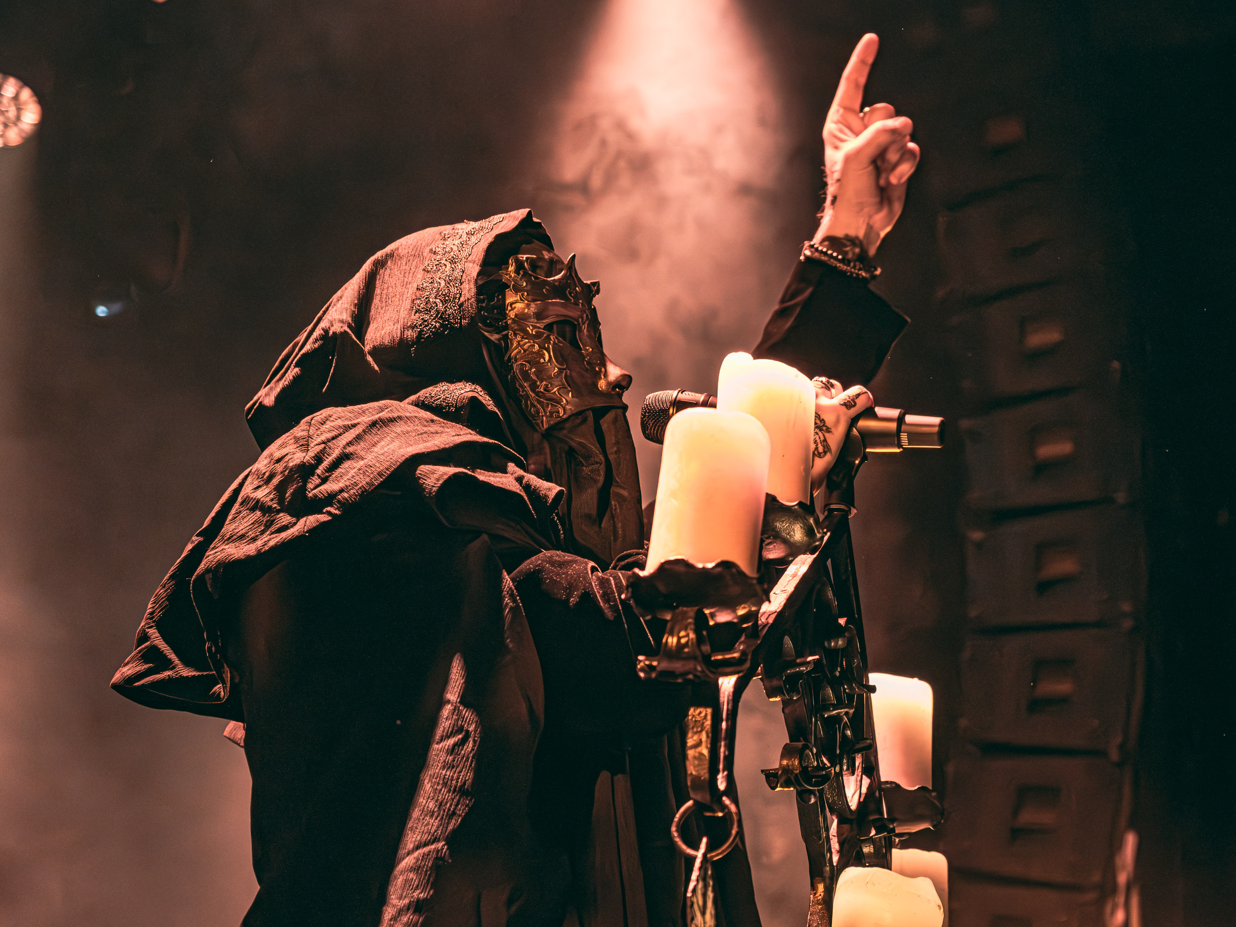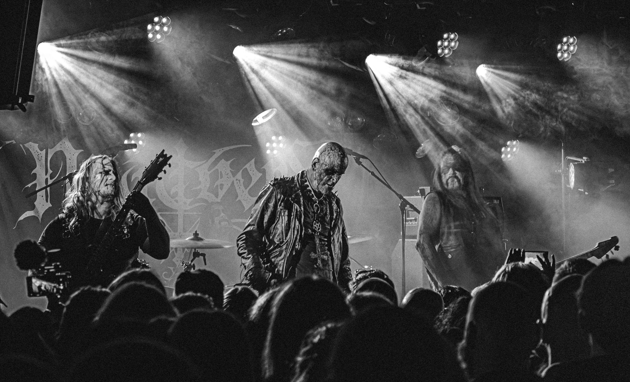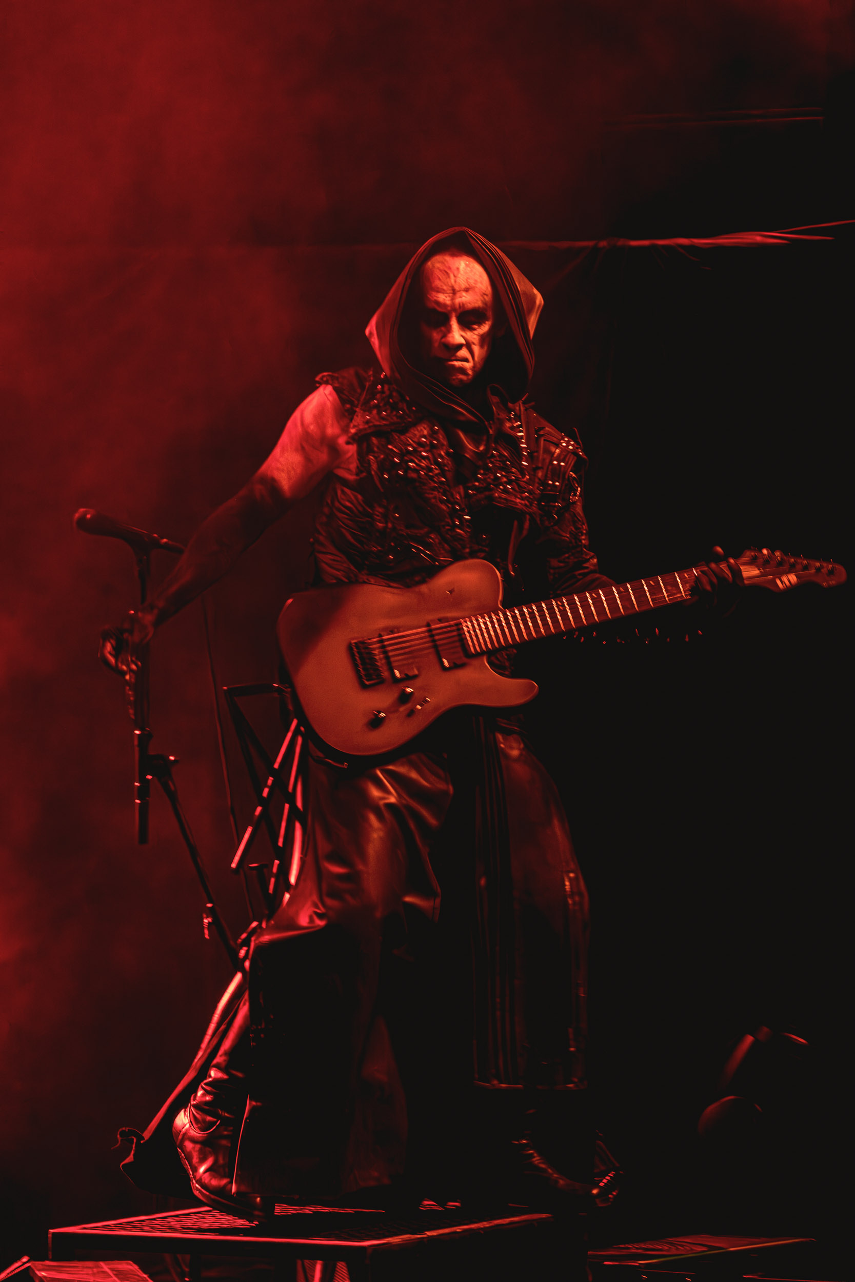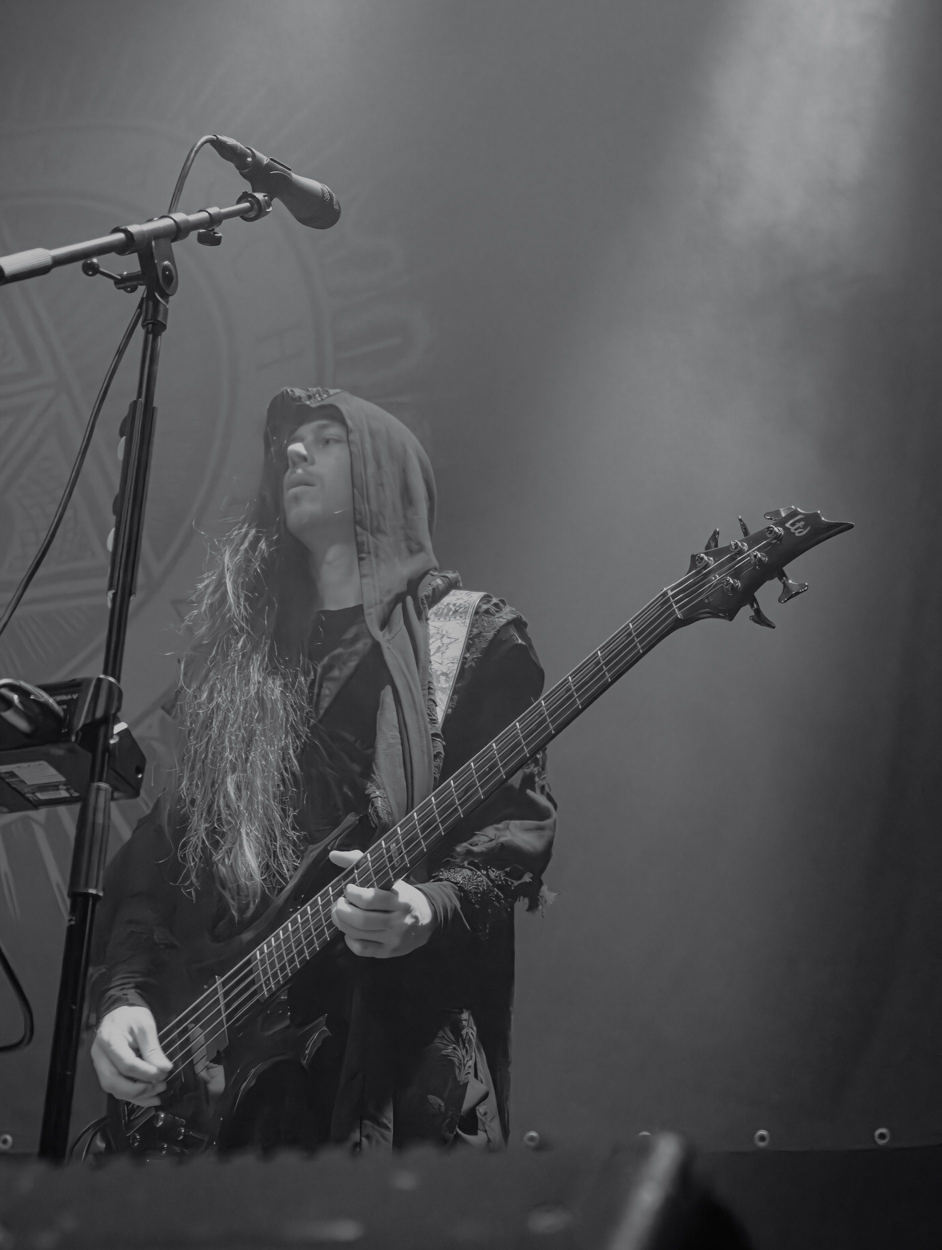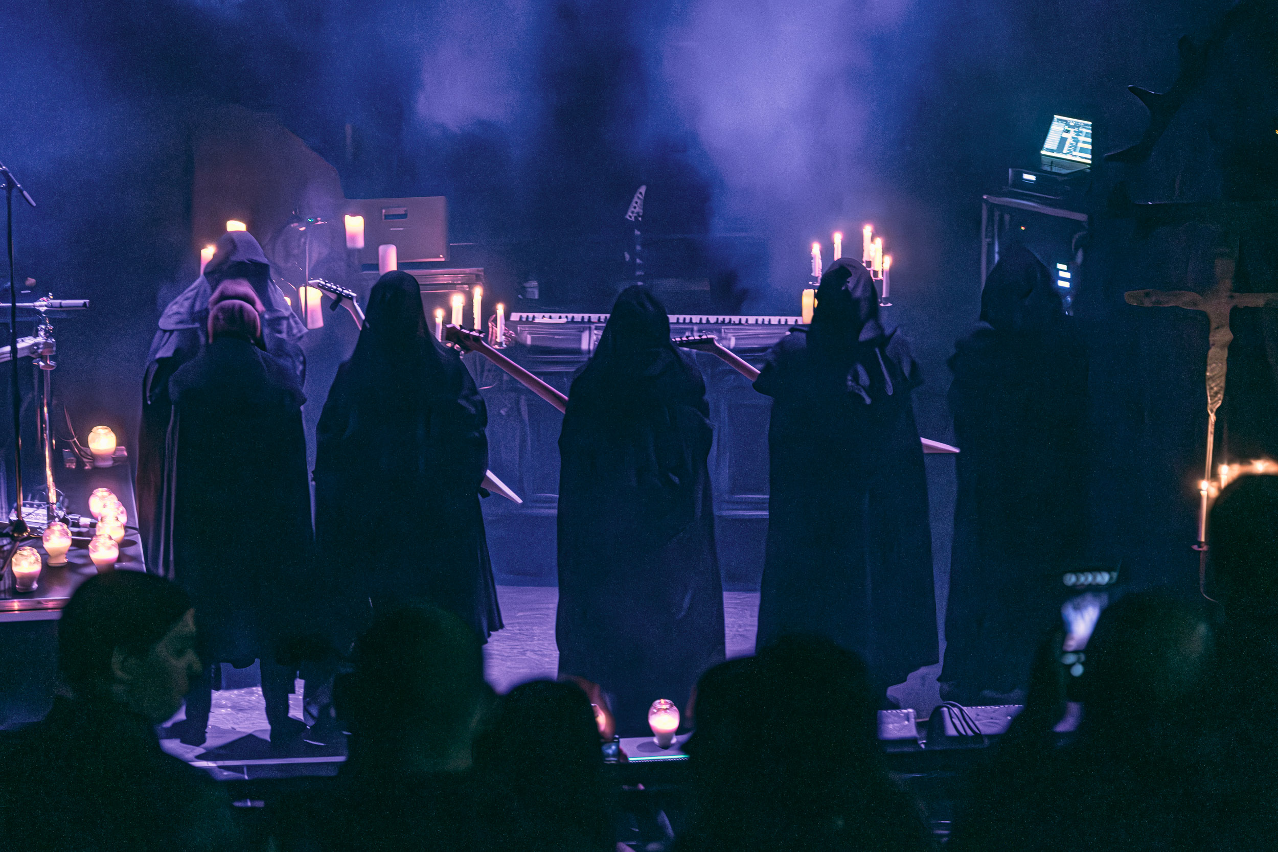 Schammasch : Schammasch comptait parmi les formations dont j’avais le plus hâte de découvrir la performance scénique à l’Inferno 2025, son écoute préparatoire ne m’ayant pas laissée indifférente. Coupons d’emblée court à tout suspense : mes premiers moments dans le pit, au plus près du groupe, me mènent à comprendre que je n’en sortirai pas indemne. Classable de prime abord dans la grande catégorie du « black metal encapuchonné avec masques en option », Schammasch n’a pas de mal à prouver qu’il est bien plus que cela. Revendiquant son appartenance à la branche avant-gardiste du genre, le quintet originaire de Bâle en Suisse allemande illustre son propos par un style musical qui, pour le résumer grossièrement et à défaut de meilleurs termes, semble issu d’une rencontre du troisième type entre black metal et Killing Joke, pour ne citer que la référence la plus prégnante. Le son est dense à l’extrême, courtoisie de trois guitares à huit cordes, dont la présence d’aucune n’est superflue, d’une basse qui en compte cinq, d’une batterie dont les vibrations se répandent dans le sol et de micros chargés en réverbération. Au-delà d’un simple concert, c’est à un véritable rituel cérémoniel qu’assiste le public de l’Inferno, dont l’atmosphère captive tout aussi bien qu’elle suscite une forme de malaise. Schammasch ouvre les portes vers une dimension parallèle sans pour autant prendre le public par la main pour lui en faciliter l’accès, et il apparaît clair qu’il faut s’accrocher à ce que l’on peut pour ne pas rester sur le carreau… y compris lorsque vient le moment du retour sur Terre. Une fois dans la dimension Schammasch, il devient en effet tout aussi compliqué de la quitter, et plus dure sera la chute à la sortie ! Un voyage qui prend de court et malmène ses passagers, mais en vaut plus que largement la chandelle.