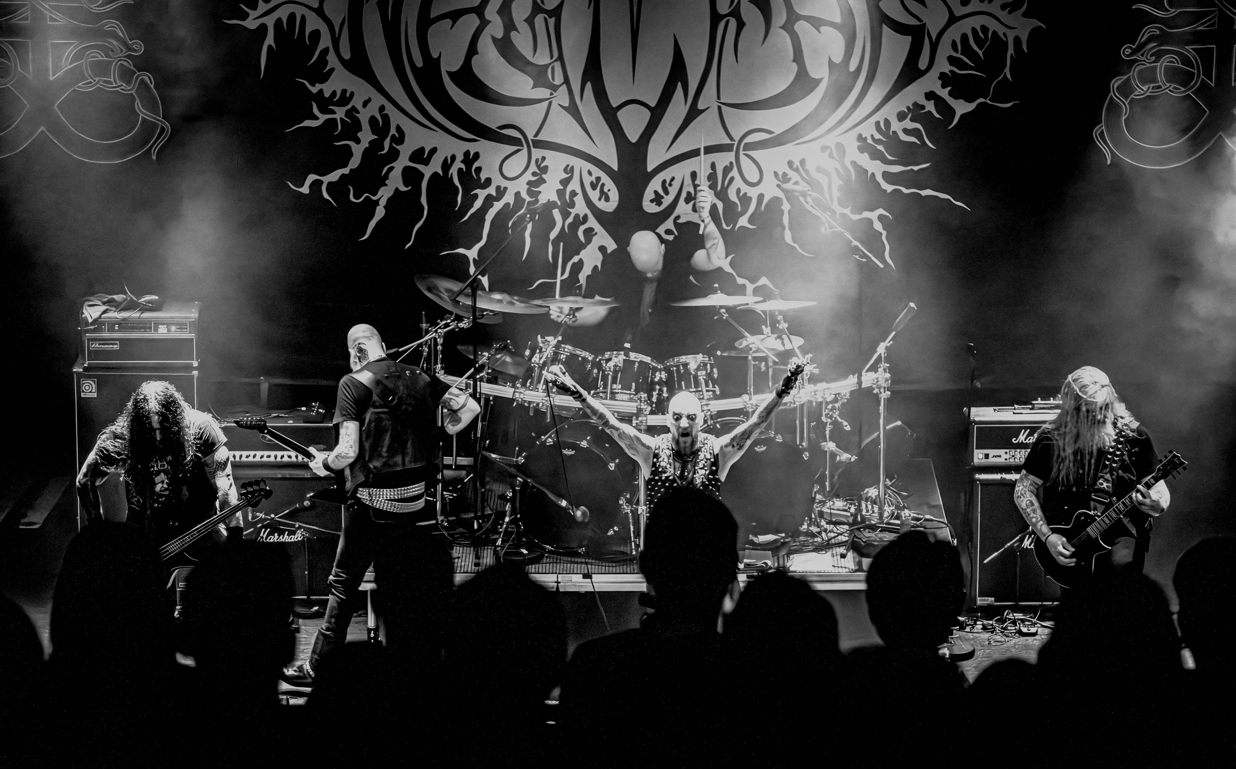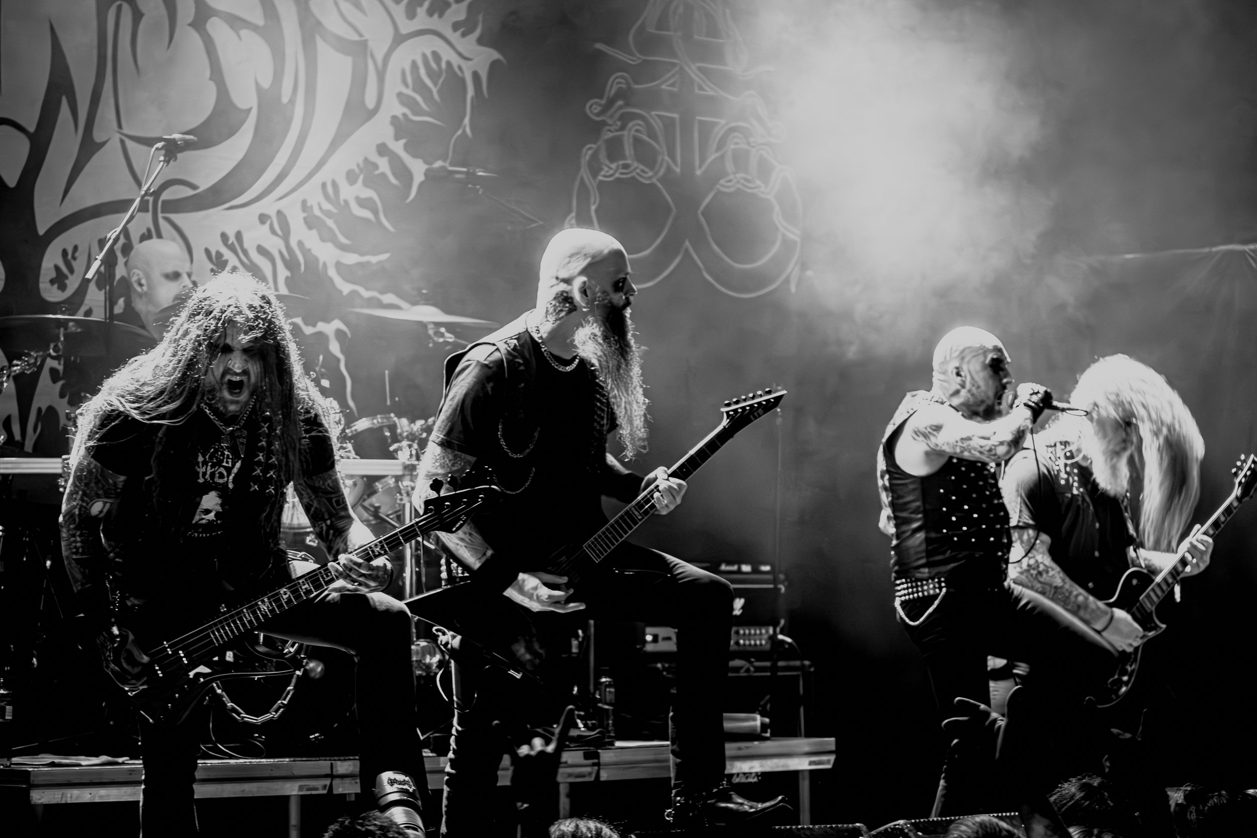 Bythos : Après le passage du rouleau compresseur Naglfar, le set de Bythos, qui suit du côté John Dee, prend l’allure d’une pause — presque — relaxante au milieu de cette dernière ligne droite au rythme en montagnes russes. Issu de la scène black metal finlandaise, le groupe lui fait honneur en interprétant une musique sombre, lourde et froide, qui s’apparente en bonne partie au doom/death mélodique portant les accents du pays. Les morceaux sont assez longs et le rythme globalement moyen, restant constant de l’un à l’autre, tout comme les structures et l’exécution… un peu trop constant, même, ce qui finit fatalement par donner l’impression d’avoir vite fait le tour de ce que le groupe a à proposer. Le son rêche des guitares désamorce heureusement quelque peu cette impression de linéarité, de même que la voix éraillée et basse du frontman M.S, plutôt atypique pour un groupe de black. En parlant de M.S, ce dernier livre une performance très investie qui passe par une gestuelle et des expressions marquées. Il en est de même pour ses comparses musiciens… du moins, de ce que je parviens à percevoir lors des quelques moments où leurs visages sont visibles ! Fait assez rare et amusant pour être souligné, Bythos peut se targuer d’être un groupe quasi-exclusivement composé d’hommes chauves, à un batteur près… Ce détail laissé de côté, sa prestation, malgré le professionnalisme et l’engagement des musiciens, ne me laisse pas un souvenir impérissable.