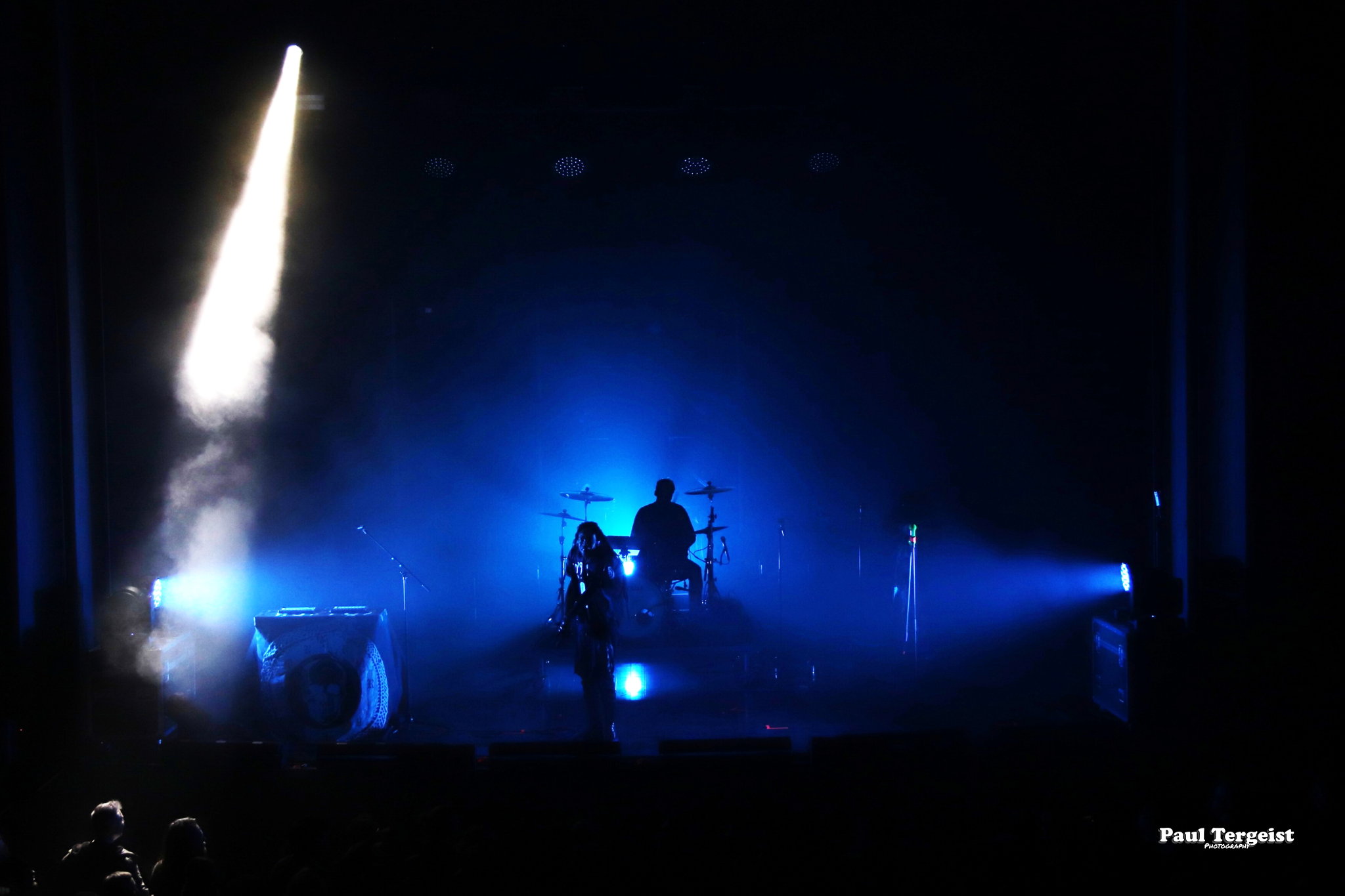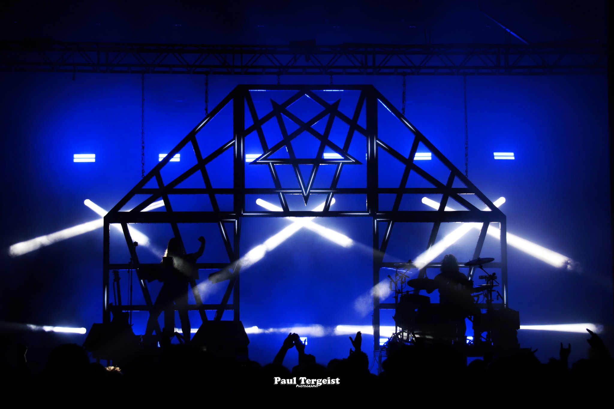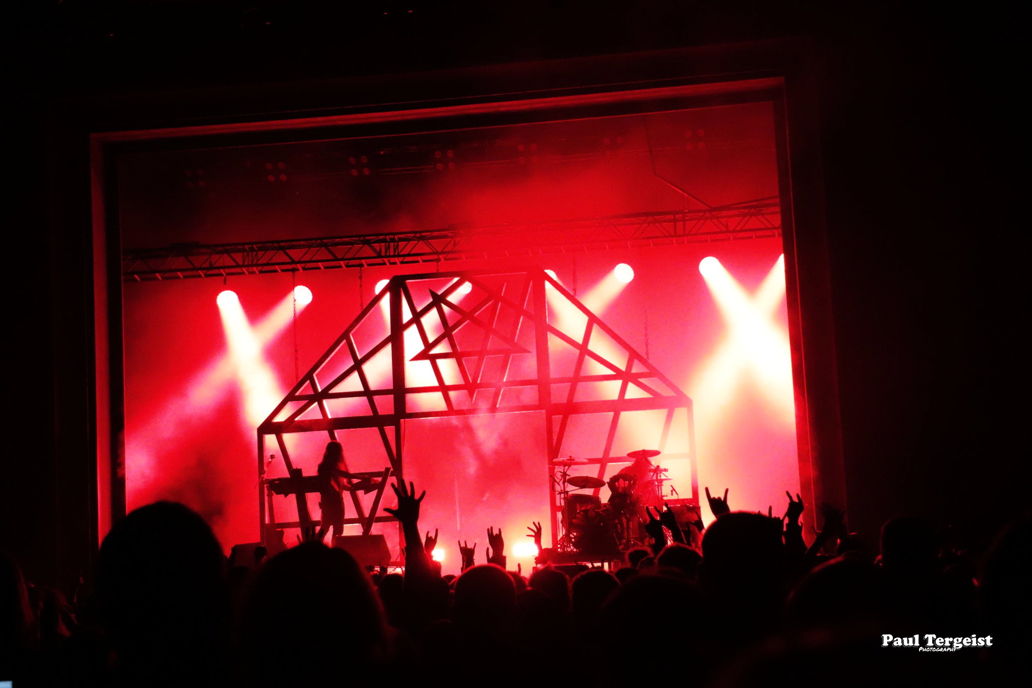« Attention ! Attention ! Pour des raisons techniques, veuillez quitter la salle par la sortie la plus proche. » Cette injonction sera lancée deux fois, sans provoquer la moindre réaction du public, et fera office d’intro un peu décalée au concert de Perturbator. James Kent, alias Perturbator, se produit simplement accompagné d’un batteur, et présente d’emblée un côté sombre, matérialisé par un décor de scène à la mode gothique/black metal, rappelant inévitablement ses débuts au sein de diverses formations black. Musicalement, le dernier album en date, Lustful Sacraments, à l’ambiance plus gothique/new-wave — en un mot, plus « dark » que les autres — installe l’atmosphère grâce à Excess, premier titre d’une setlist qui en comptera douze. Le noir restera momentanément la couleur prédominante, puis le set gagnera quelque peu en luminosité avec des titres certes loin de se rapprocher d’une pop mainstream, mais montrant un certain nombre de points communs avec ceux de Carpenter Brut. Au final, un bon concert sans points faibles, mais aussi sans moments réellement forts. Et, comme les autres groupes — c’est sans doute la coutume dans l’univers qui est le leur —, Perturbator s’en ira sans remercier ni saluer un public qui, de toute façon, n’en demandait pas tant et quittera la salle visiblement ravi.