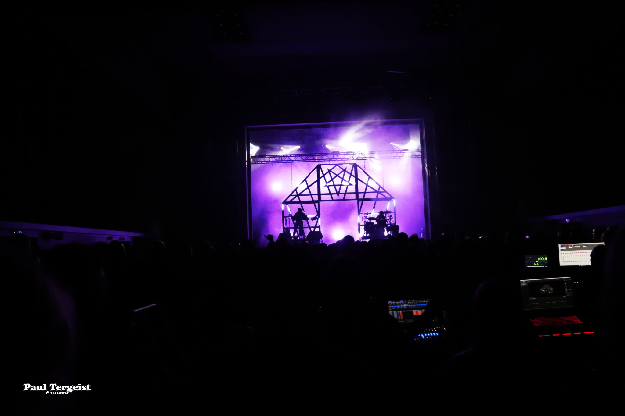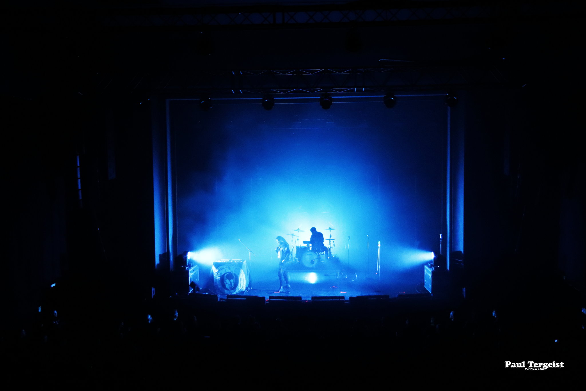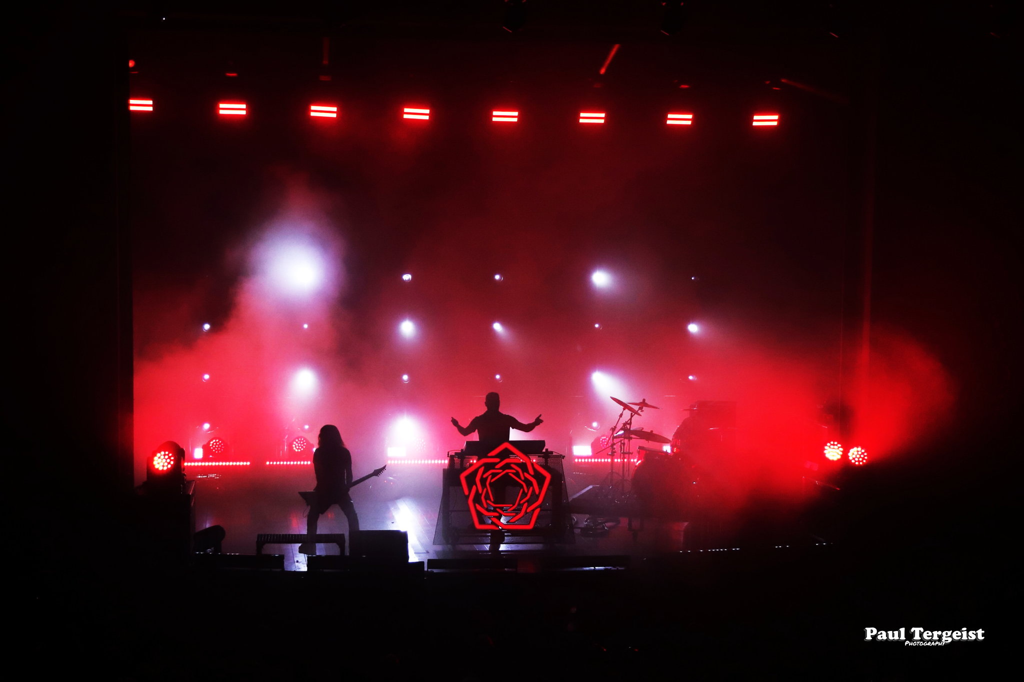 « Attention ! Attention ! Pour des raisons techniques, veuillez quitter la salle par la sortie la plus proche. » Cette injonction sera lancée deux fois, sans provoquer la moindre réaction du public, et fera office d’intro un peu décalée au concert de Perturbator. James Kent, alias Perturbator, se produit simplement accompagné d’un batteur, et présente d’emblée un côté sombre, matérialisé par un décor de scène à la mode gothique/black metal, rappelant inévitablement ses débuts au sein de diverses formations black. Musicalement, le dernier album en date, Lustful Sacraments, à l’ambiance plus gothique/new-wave — en un mot, plus « dark » que les autres — installe l’atmosphère grâce à Excess, premier titre d’une setlist qui en comptera douze. Le noir restera momentanément la couleur prédominante, puis le set gagnera quelque peu en luminosité avec des titres certes loin de se rapprocher d’une pop mainstream, mais montrant un certain nombre de points communs avec ceux de Carpenter Brut. Au final, un bon concert sans points faibles, mais aussi sans moments réellement forts. Et, comme les autres groupes — c’est sans doute la coutume dans l’univers qui est le leur —, Perturbator s’en ira sans remercier ni saluer un public qui, de toute façon, n’en demandait pas tant et quittera la salle visiblement ravi.