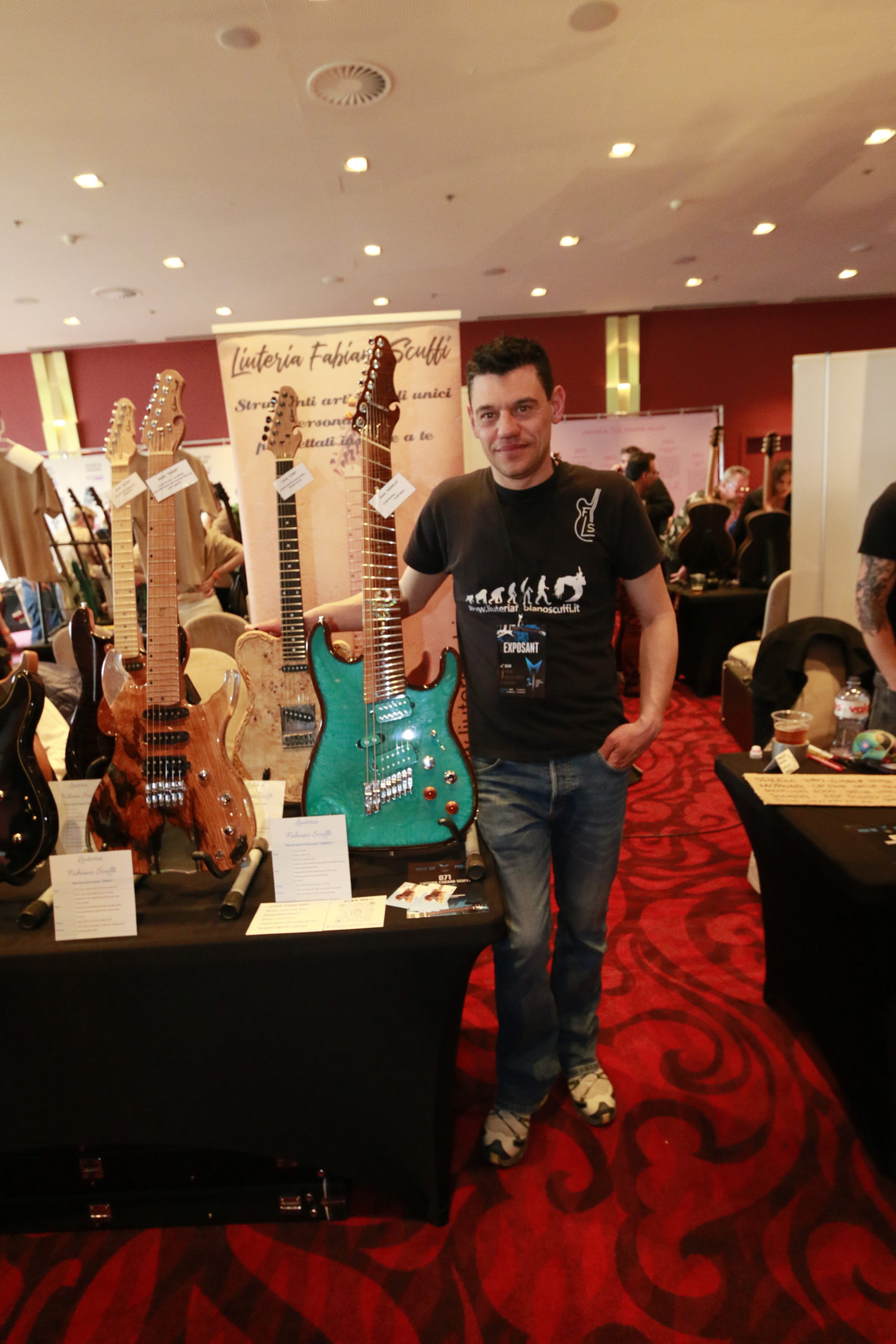 Nous nous sommes ensuite arrêtés au stand de pédales Scoville Effects, qui sont entièrement réalisées à la main, dans le canton de Fribourg, par un passionné de guitares dont ce n’est pas le métier, mais qui réalise des modèles très originaux, sur mesure, avec des designs uniques et de très grande qualités offrant de nombreuses possibilités. Nous flânons parmi les nombreux stands tous plus intéressants et beaux les uns que les autres, des luthiers de très haut de gamme aux conceptions vraiment très originales, nous en prenons plein les yeux, difficile de savoir où s’arrêter tant le choix est vaste. Parmi tous ces stands, nous avons été immédiatement attirés par une incroyable guitare du luthier italien Fabiano Scuffi, une très belle guitare turquoise dont la particularité est d’avoir été réalisée avec des cordes de basse d’un côté et des cordes de guitare de l’autre, tout cela construit dans le même manche. Une idée géniale pour un instrument vraiment unique qui vous permet de jouer aussi bien de la guitare que de la basse sur le même instrument. Magnifique.