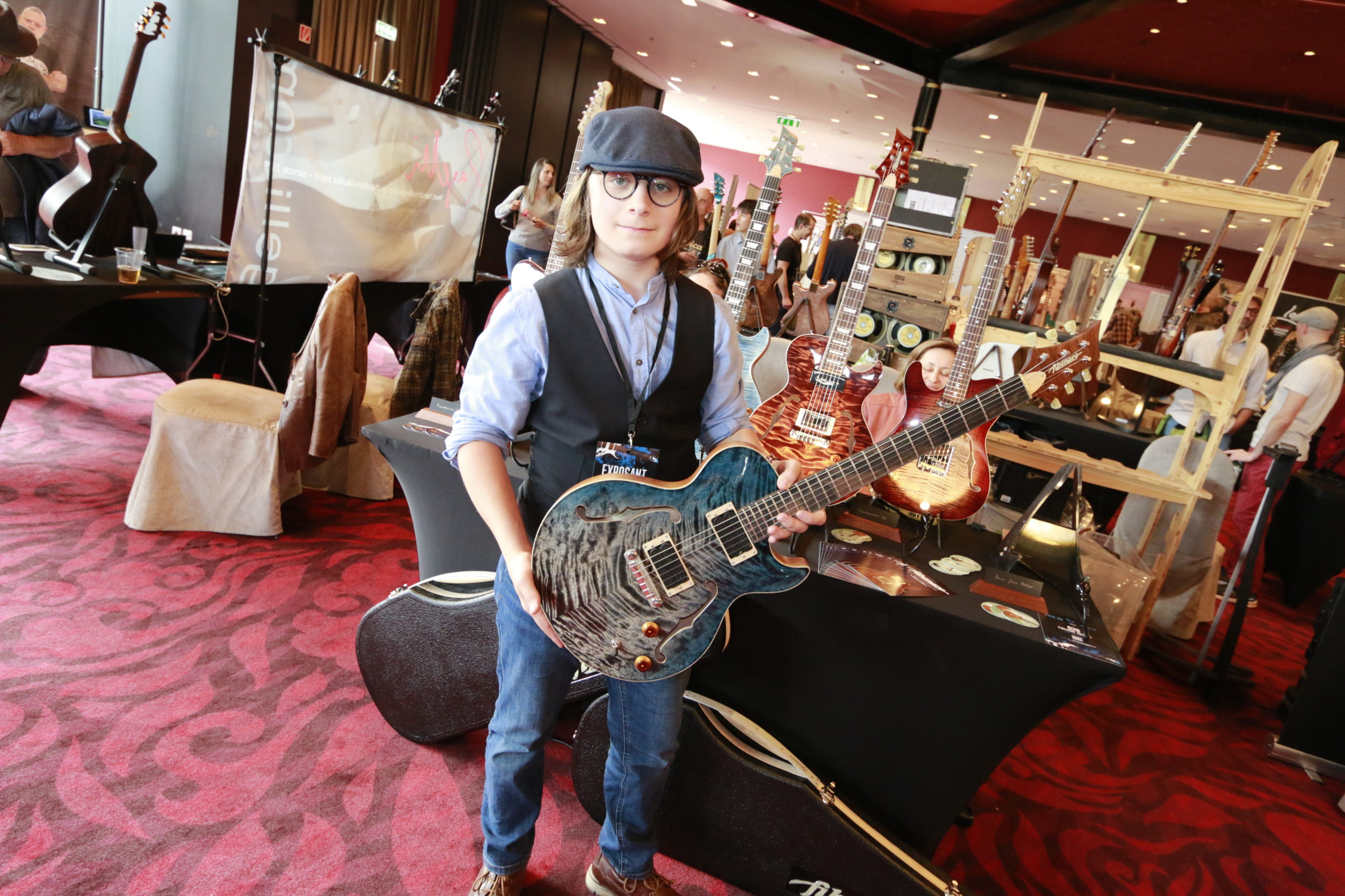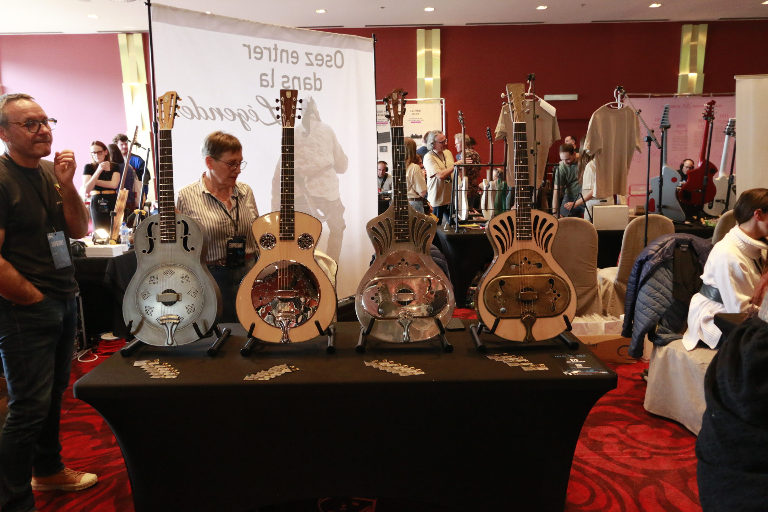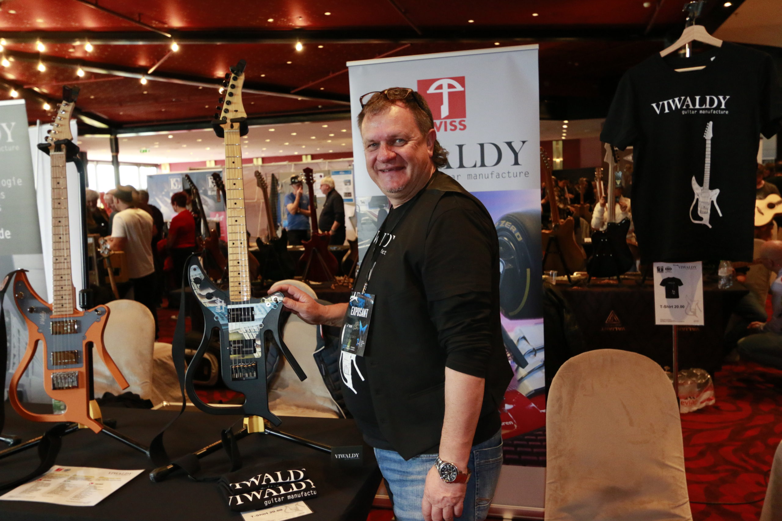 Nous avons retrouvé avec beaucoup de plaisir des exposants de la précédente édition et nous avons découvert de magnifiques instruments. Un autre stand nous a interpellés, celui du luthier vaudois Jérôme Skadarka qui nous vient d’Etoy et qui nous a séduits par ses guitares très originales dont La singulière Tribale, une guitare avec un visage gravé sur de l’érable. Toutes ses guitares sont faites à la main et il propose également aux néophytes des stages d’initiation à la lutherie, afin de pouvoir construire soi-même son propre instrument de A à Z. Nous avons également retrouvé avec beaucoup de plaisir le luthier bernois Viwaldy, qui a présenté cette année son tout nouveau modèle. Ses guitares sont un mélange d’aluminium et de bois précieux, elles ont des formes singulières et sont toutes estampillées « Swiss Made ». À noter cette petite anecdote : les trois modèles de guitares Viwaldy portent le nom de ses trois petits-fils.