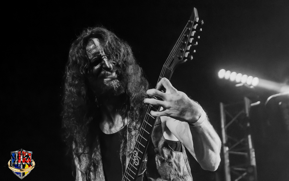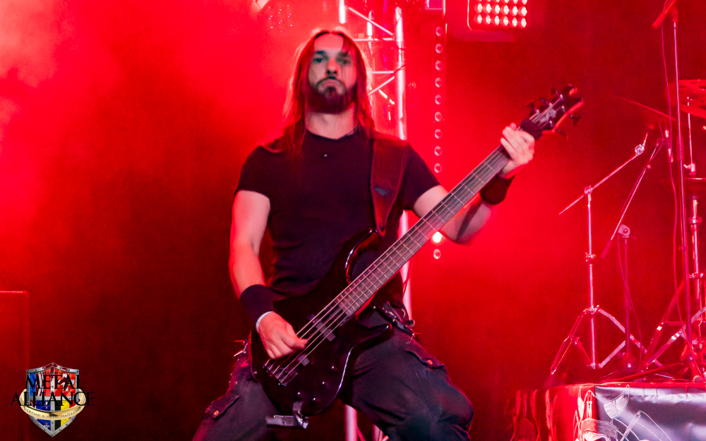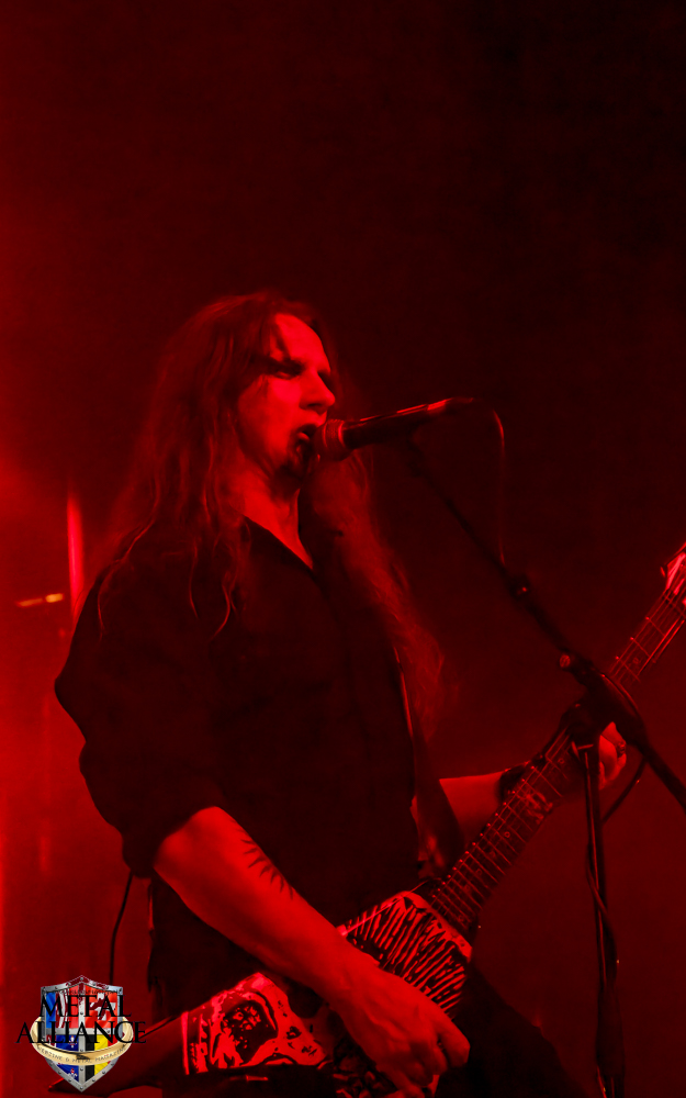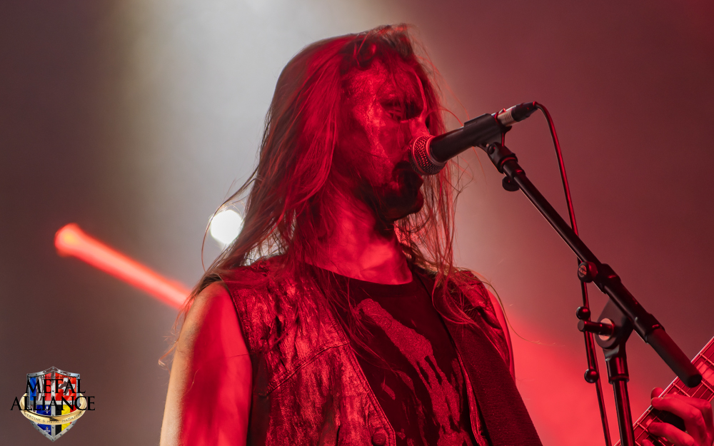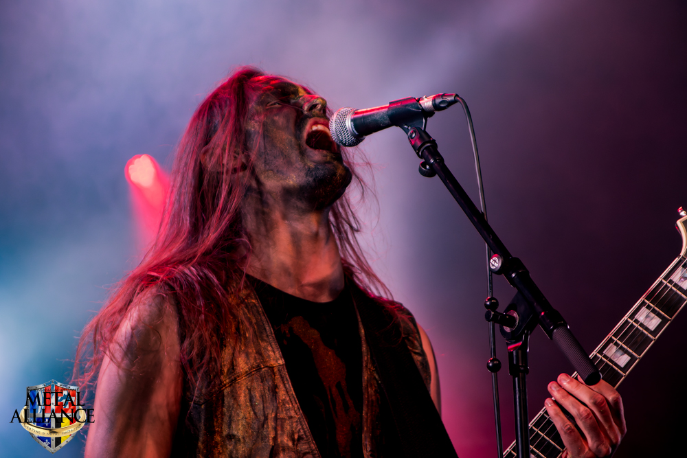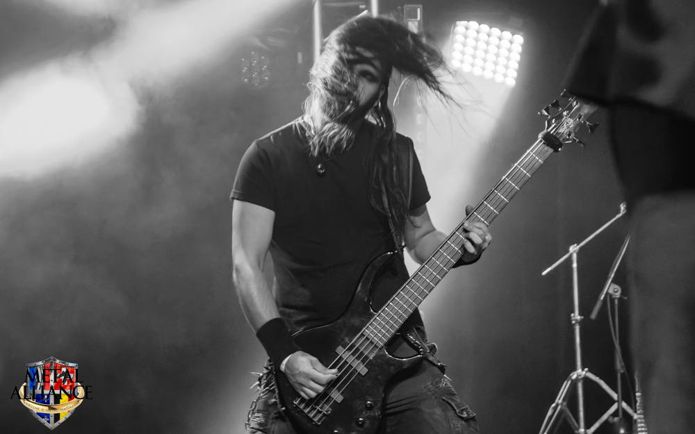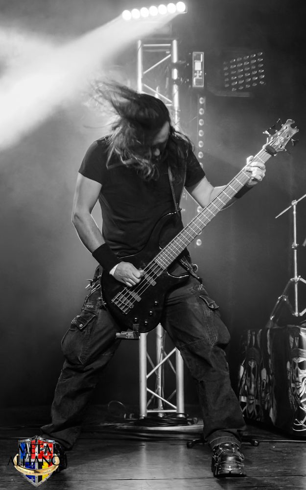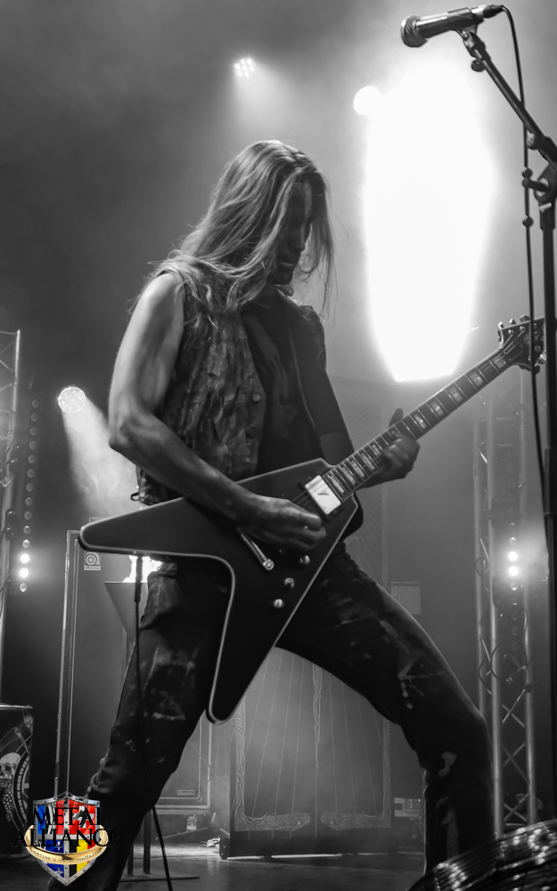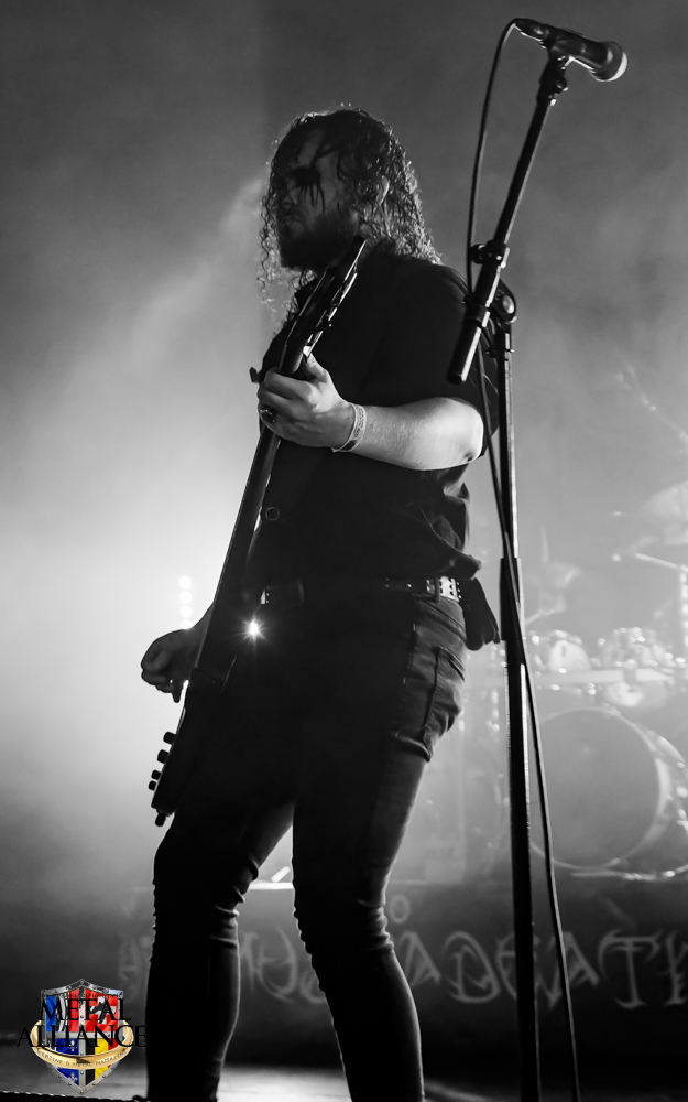 Tiermes, le bassiste, harangue le public, ça y est ! C’est parti ! La batterie tabasse, vive la maîtrise de la double pédale et l’année 1983, année de la naissance de celle-ci, c’est bon, appuyé par la basse. Tiermes maîtrise ses cordes qui résonnent dans la salle. Adam the First Sinner, statique derrière son micro, nous balance une voix sortie des entrailles, de ses entrailles, de la profondeur de son âme. Domin ne démérite pas. En effet, le niveau est allé crescendo. Un bon set, le public est là pour le groupe qui le lui rend bien. Franchement, la première journée du Muscadeath nous donne une bonne dose de son. Vivement la confirmation demain !