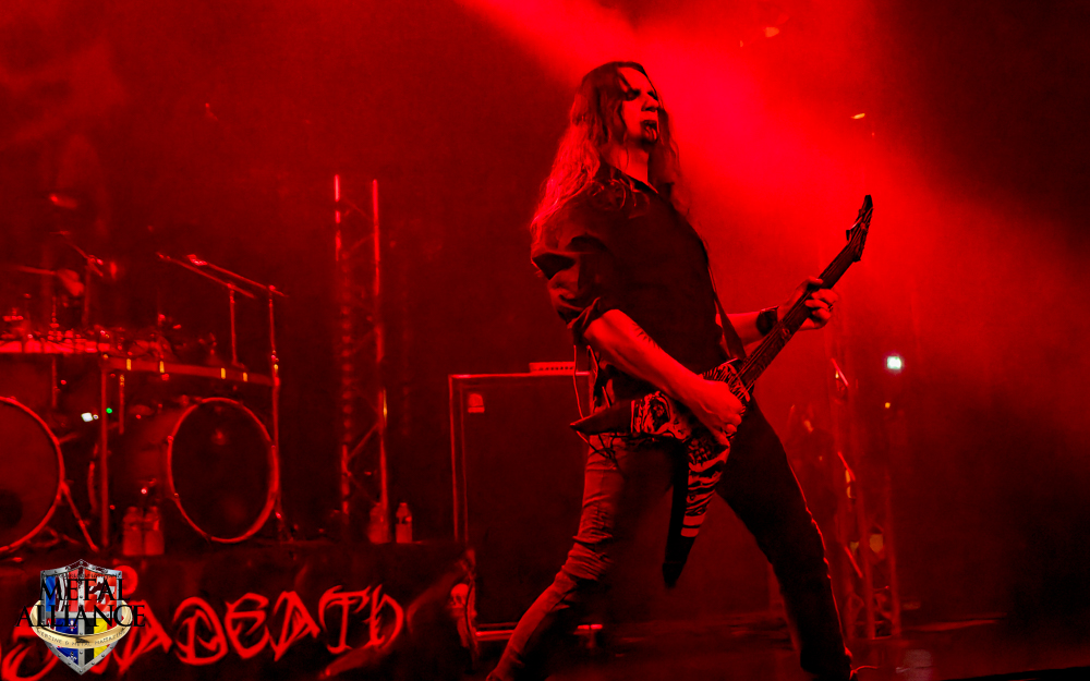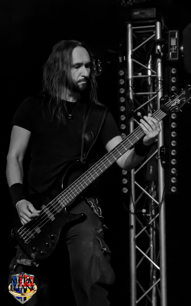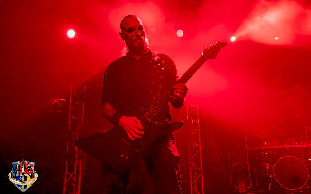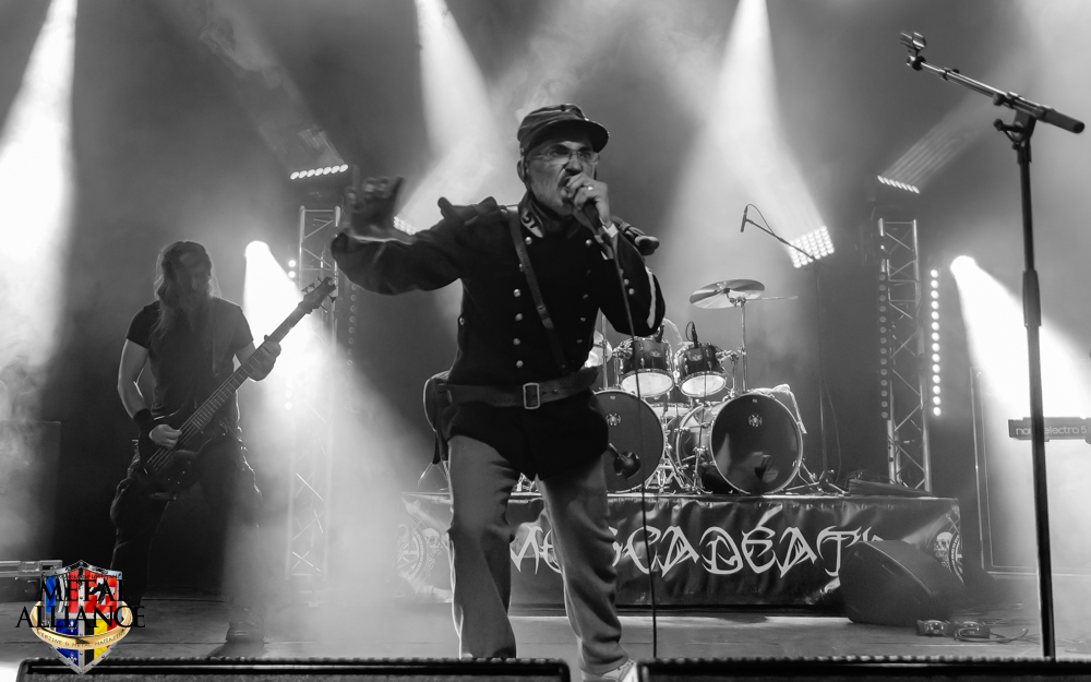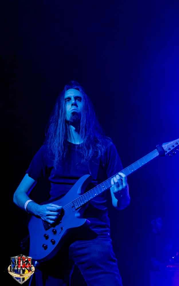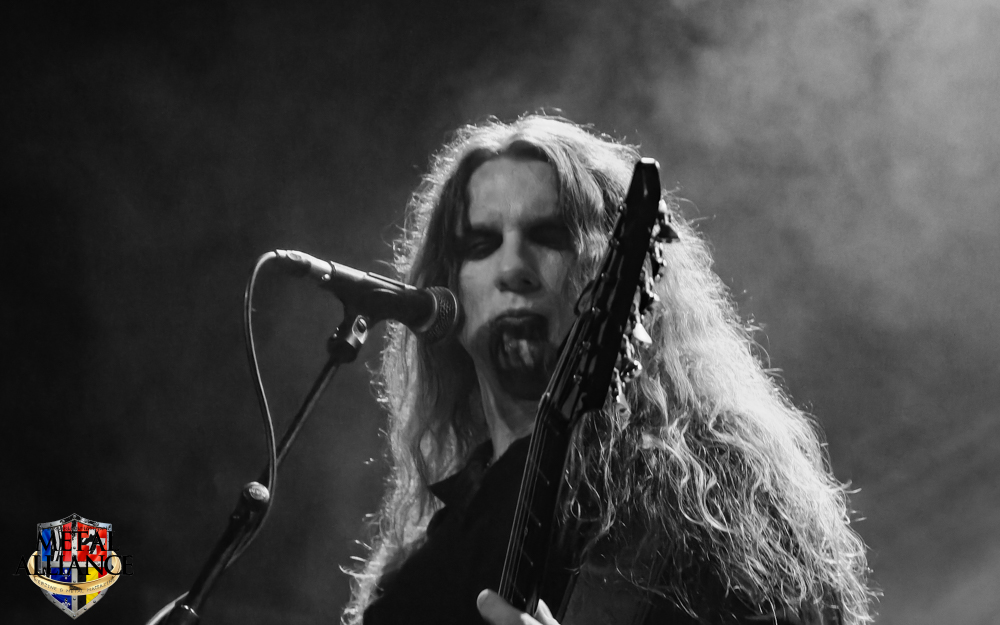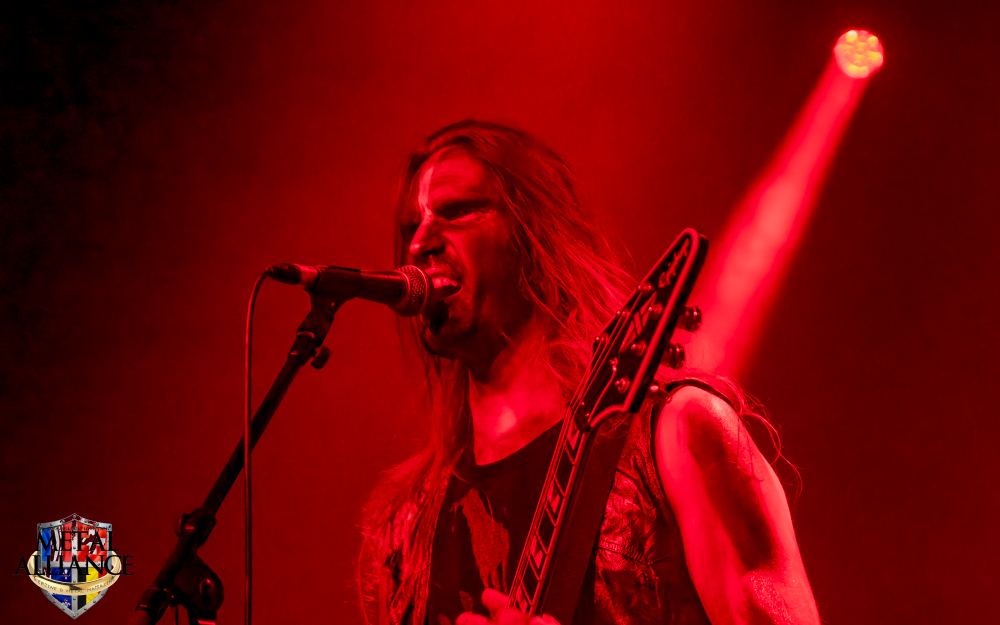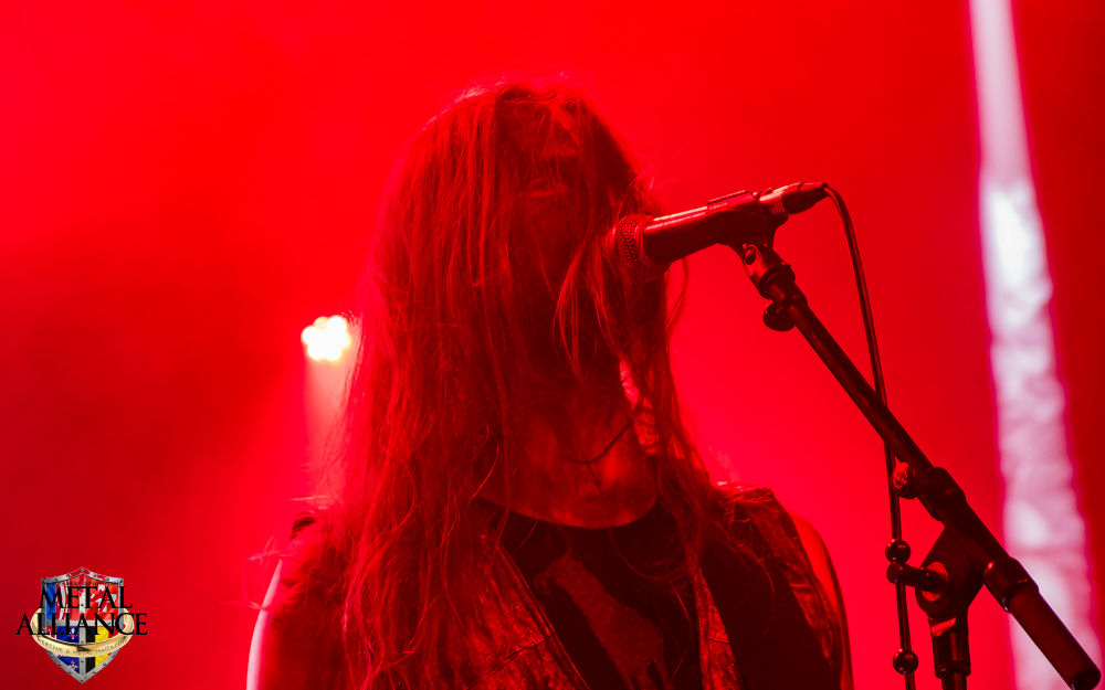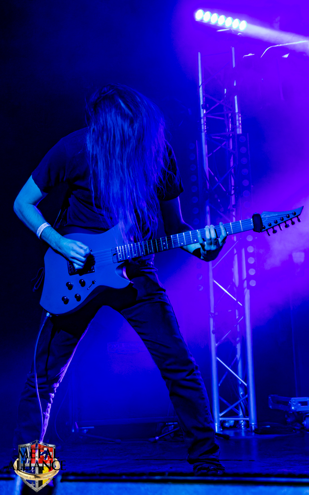 Tiermes, le bassiste, harangue le public, ça y est ! C’est parti ! La batterie tabasse, vive la maîtrise de la double pédale et l’année 1983, année de la naissance de celle-ci, c’est bon, appuyé par la basse. Tiermes maîtrise ses cordes qui résonnent dans la salle. Adam the First Sinner, statique derrière son micro, nous balance une voix sortie des entrailles, de ses entrailles, de la profondeur de son âme. Domin ne démérite pas. En effet, le niveau est allé crescendo. Un bon set, le public est là pour le groupe qui le lui rend bien. Franchement, la première journée du Muscadeath nous donne une bonne dose de son. Vivement la confirmation demain !