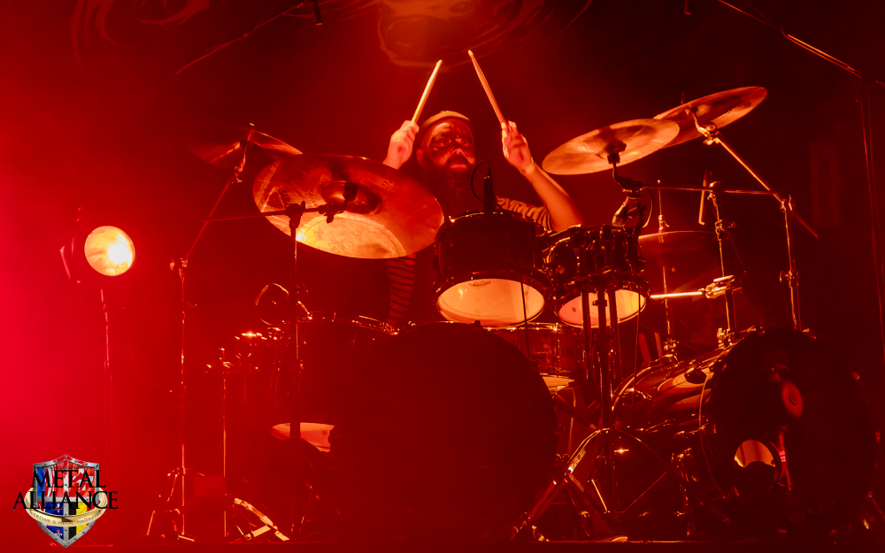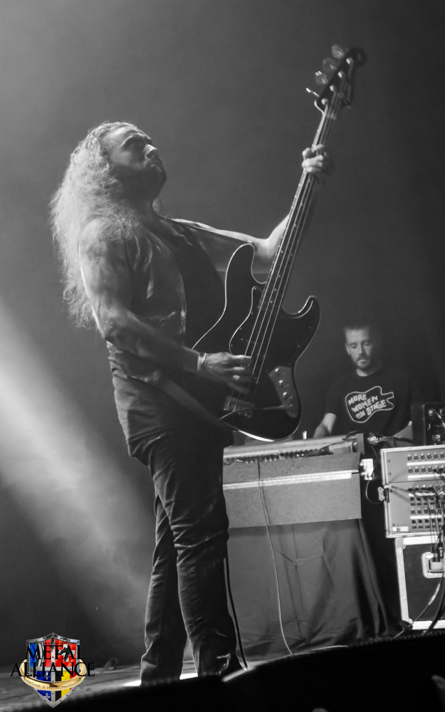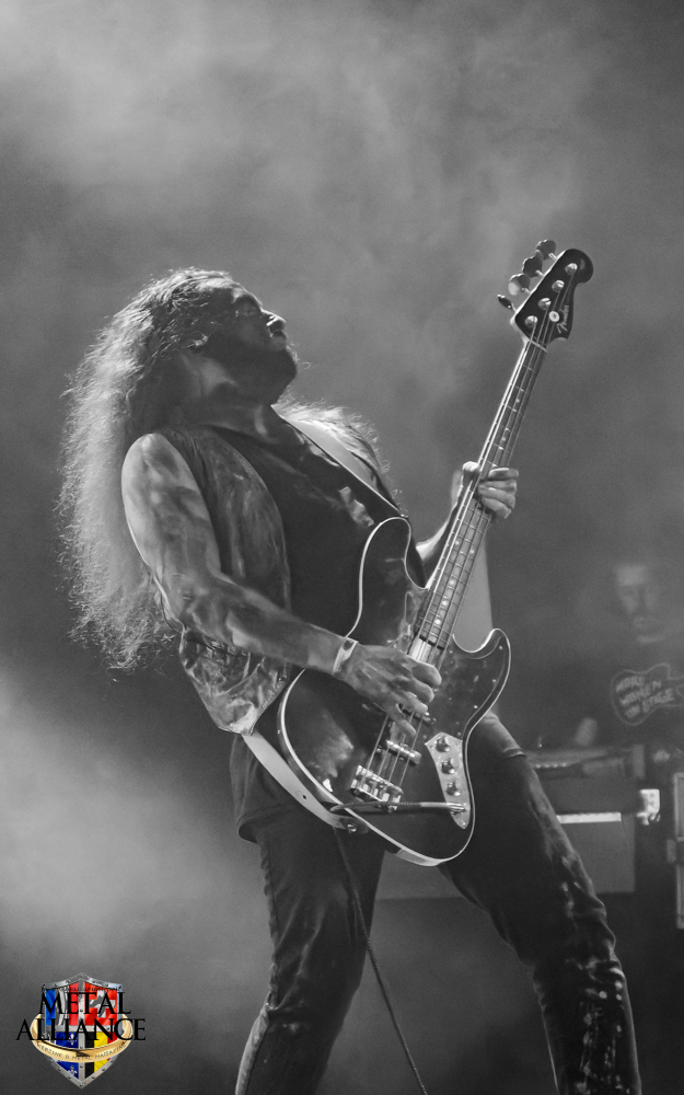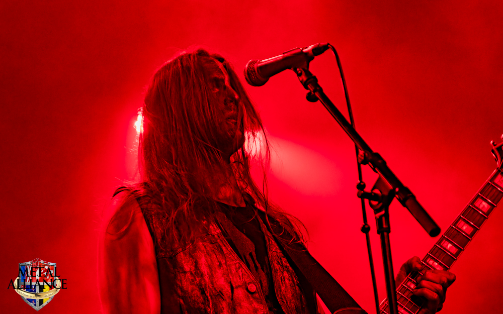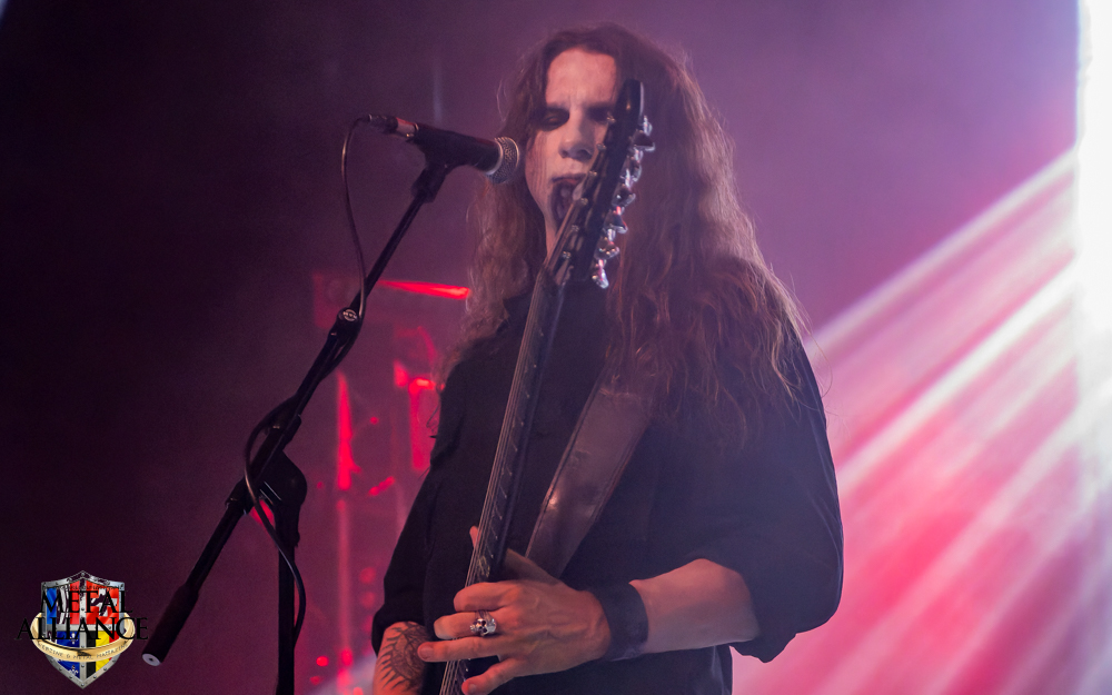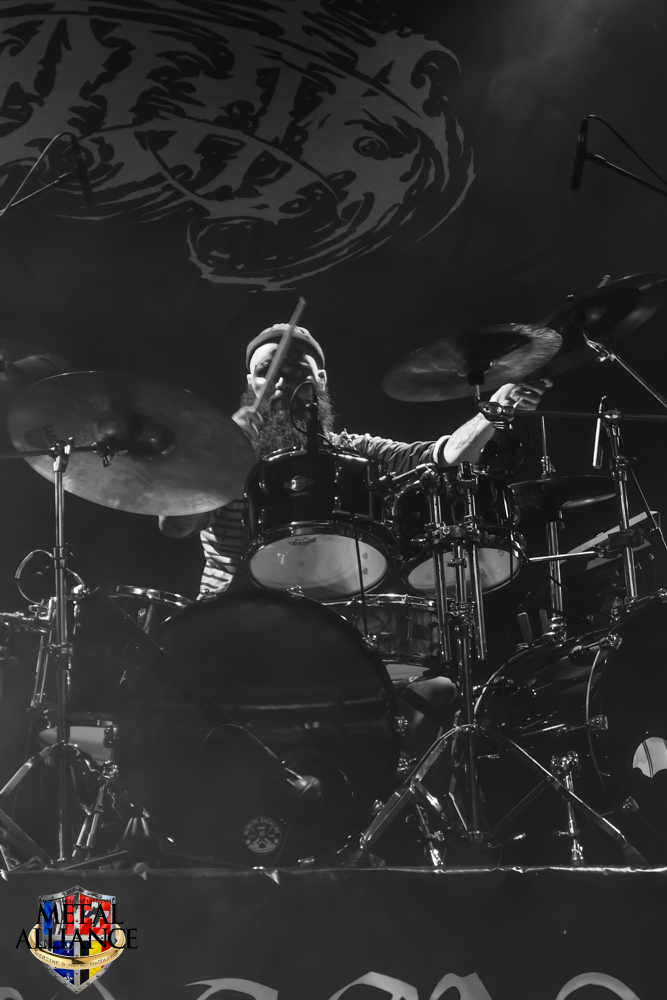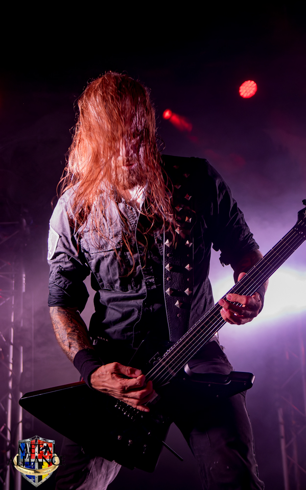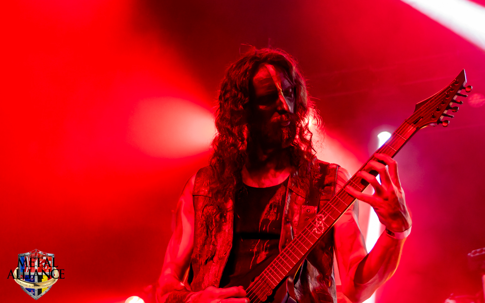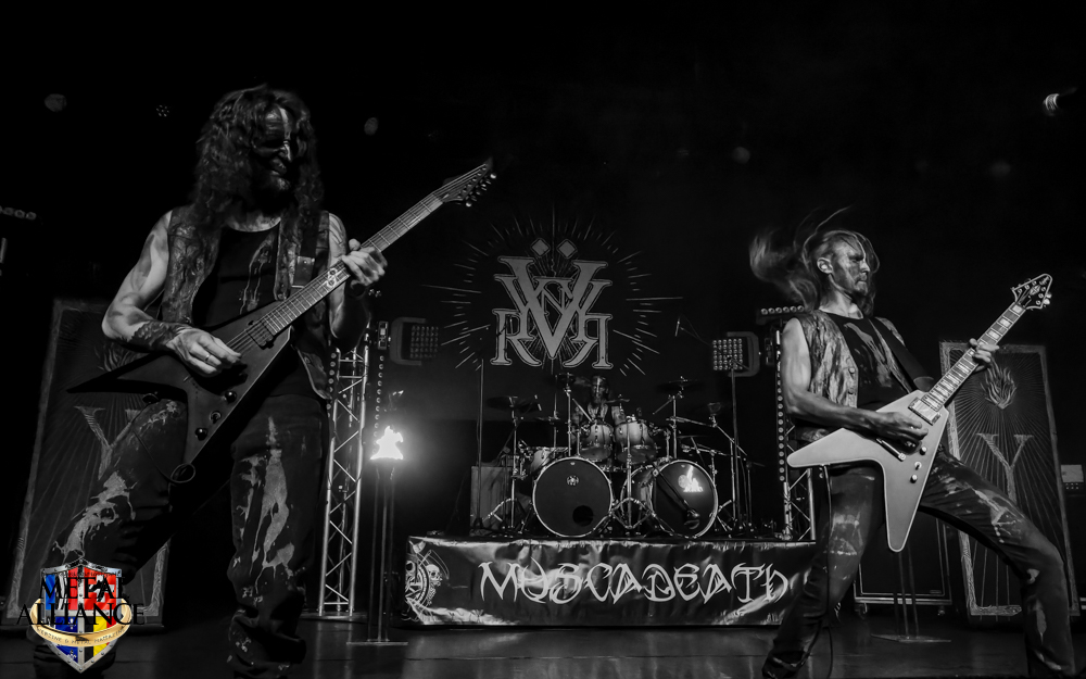 Tiermes, le bassiste, harangue le public, ça y est ! C’est parti ! La batterie tabasse, vive la maîtrise de la double pédale et l’année 1983, année de la naissance de celle-ci, c’est bon, appuyé par la basse. Tiermes maîtrise ses cordes qui résonnent dans la salle. Adam the First Sinner, statique derrière son micro, nous balance une voix sortie des entrailles, de ses entrailles, de la profondeur de son âme. Domin ne démérite pas. En effet, le niveau est allé crescendo. Un bon set, le public est là pour le groupe qui le lui rend bien. Franchement, la première journée du Muscadeath nous donne une bonne dose de son. Vivement la confirmation demain !
