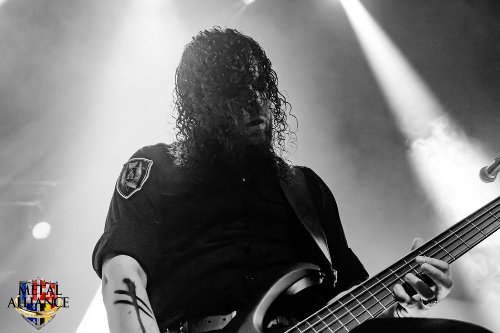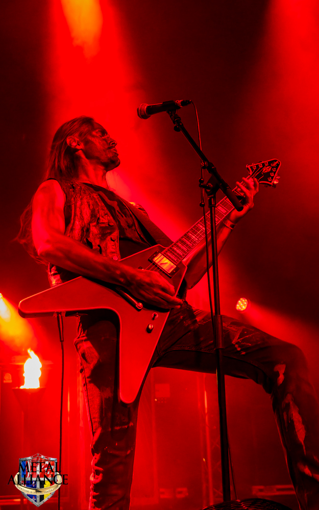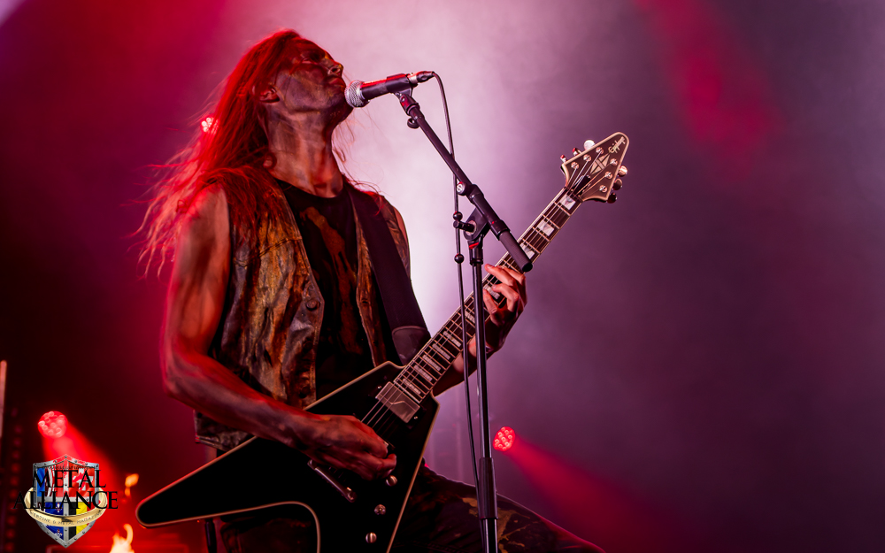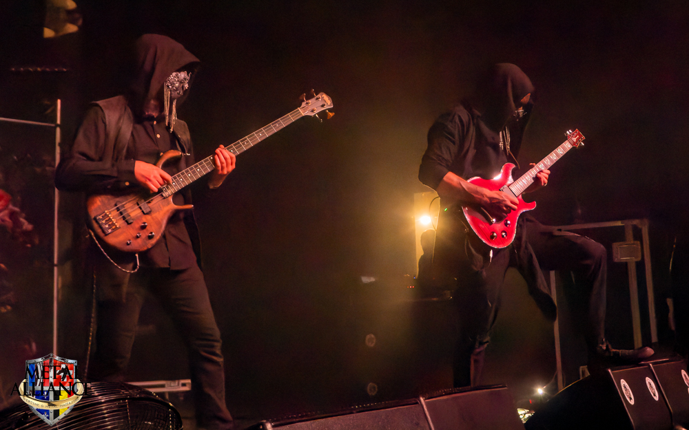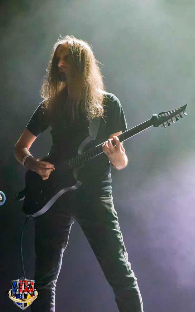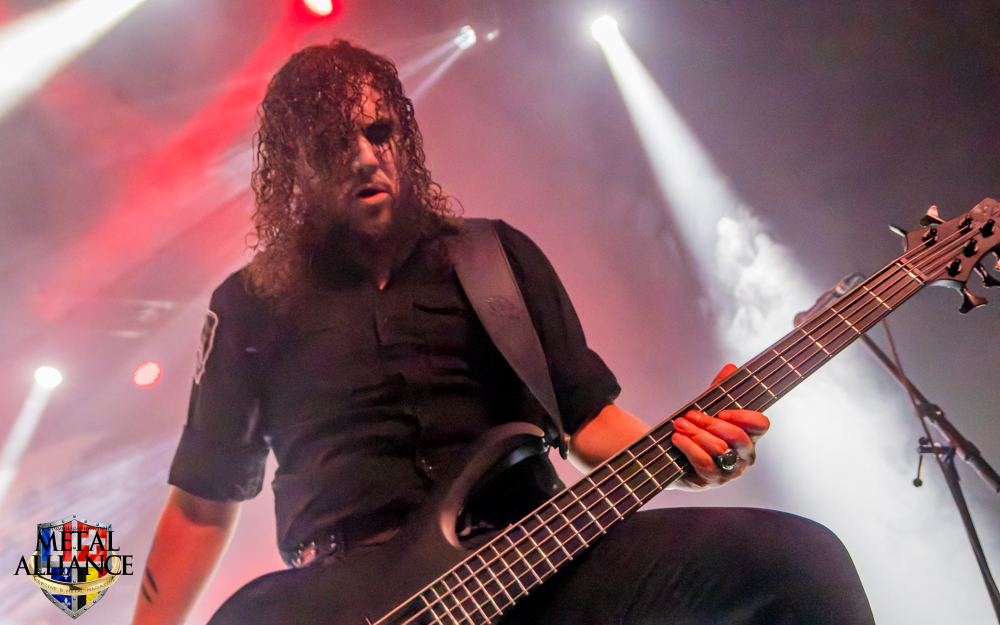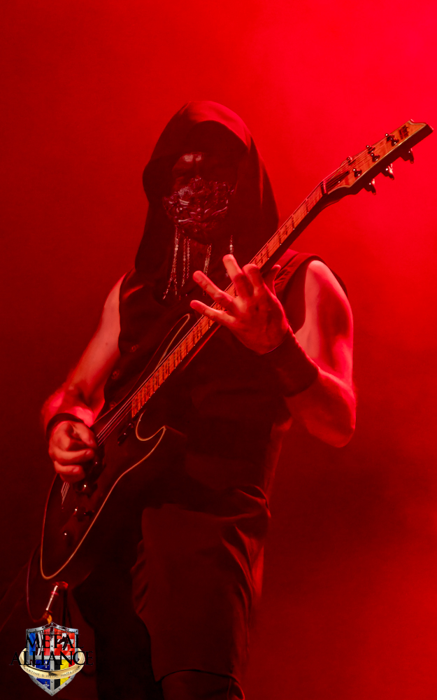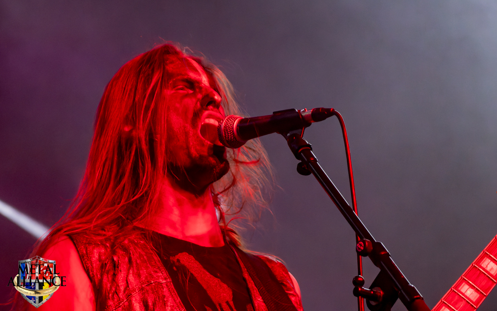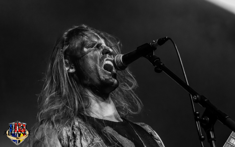 Tiermes, le bassiste, harangue le public, ça y est ! C’est parti ! La batterie tabasse, vive la maîtrise de la double pédale et l’année 1983, année de la naissance de celle-ci, c’est bon, appuyé par la basse. Tiermes maîtrise ses cordes qui résonnent dans la salle. Adam the First Sinner, statique derrière son micro, nous balance une voix sortie des entrailles, de ses entrailles, de la profondeur de son âme. Domin ne démérite pas. En effet, le niveau est allé crescendo. Un bon set, le public est là pour le groupe qui le lui rend bien. Franchement, la première journée du Muscadeath nous donne une bonne dose de son. Vivement la confirmation demain !