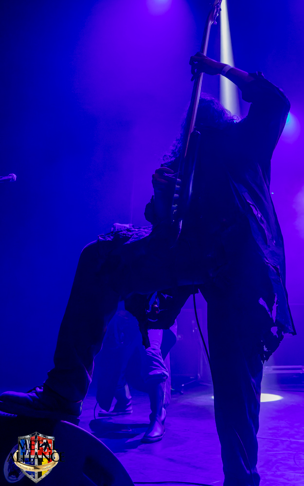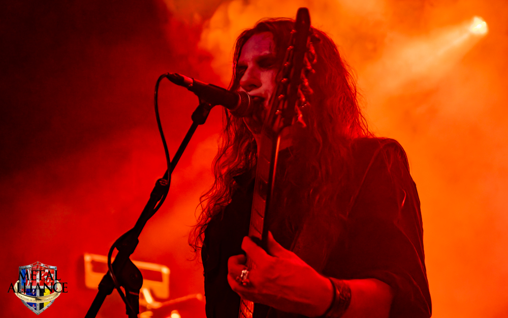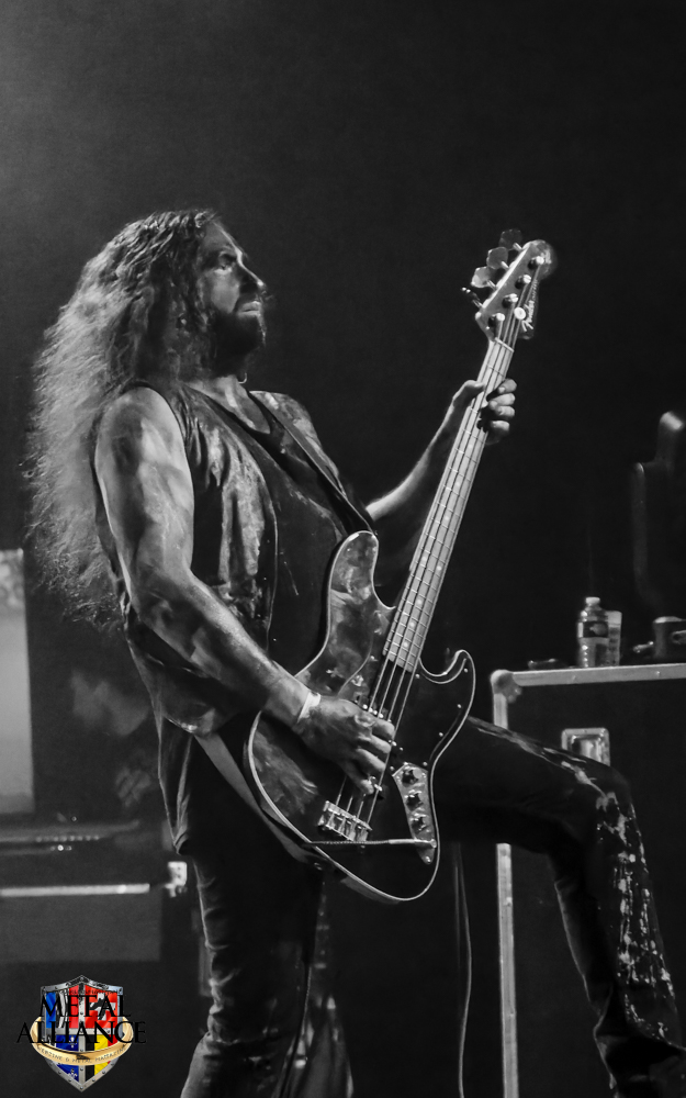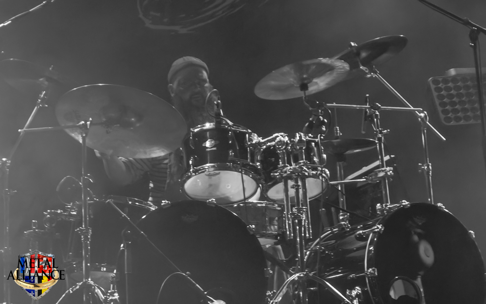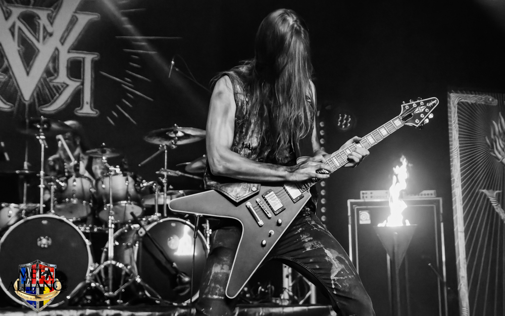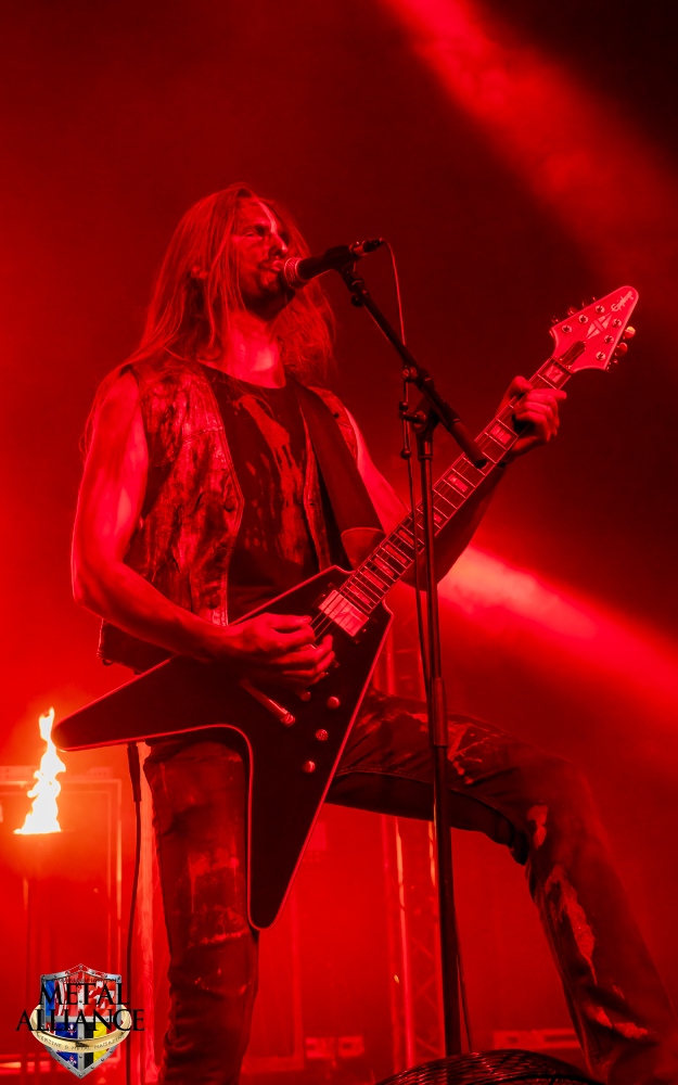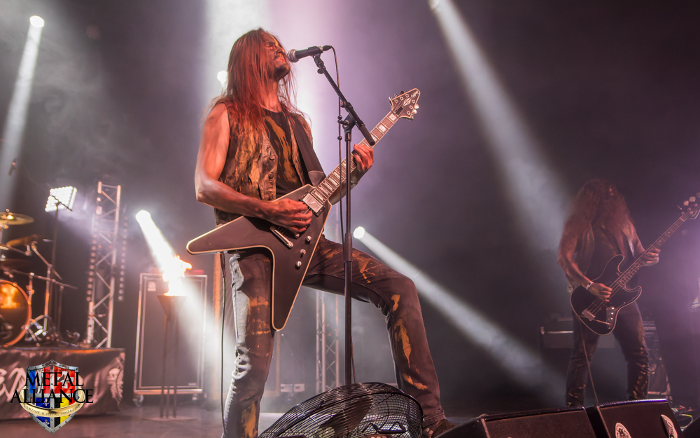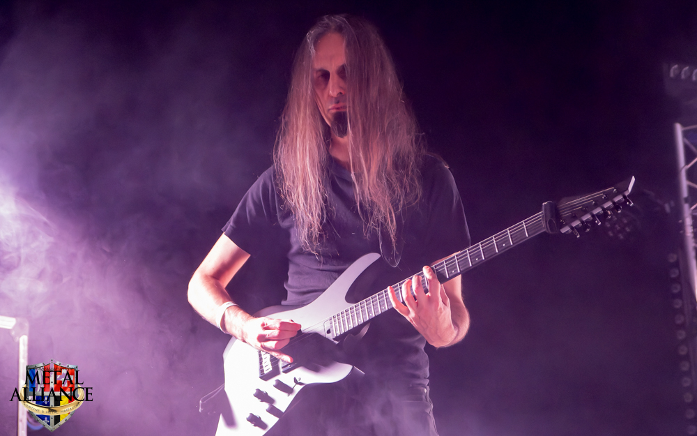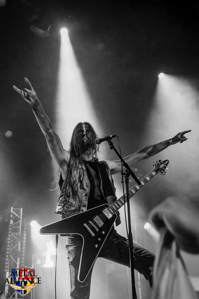 Tiermes, le bassiste, harangue le public, ça y est ! C’est parti ! La batterie tabasse, vive la maîtrise de la double pédale et l’année 1983, année de la naissance de celle-ci, c’est bon, appuyé par la basse. Tiermes maîtrise ses cordes qui résonnent dans la salle. Adam the First Sinner, statique derrière son micro, nous balance une voix sortie des entrailles, de ses entrailles, de la profondeur de son âme. Domin ne démérite pas. En effet, le niveau est allé crescendo. Un bon set, le public est là pour le groupe qui le lui rend bien. Franchement, la première journée du Muscadeath nous donne une bonne dose de son. Vivement la confirmation demain !