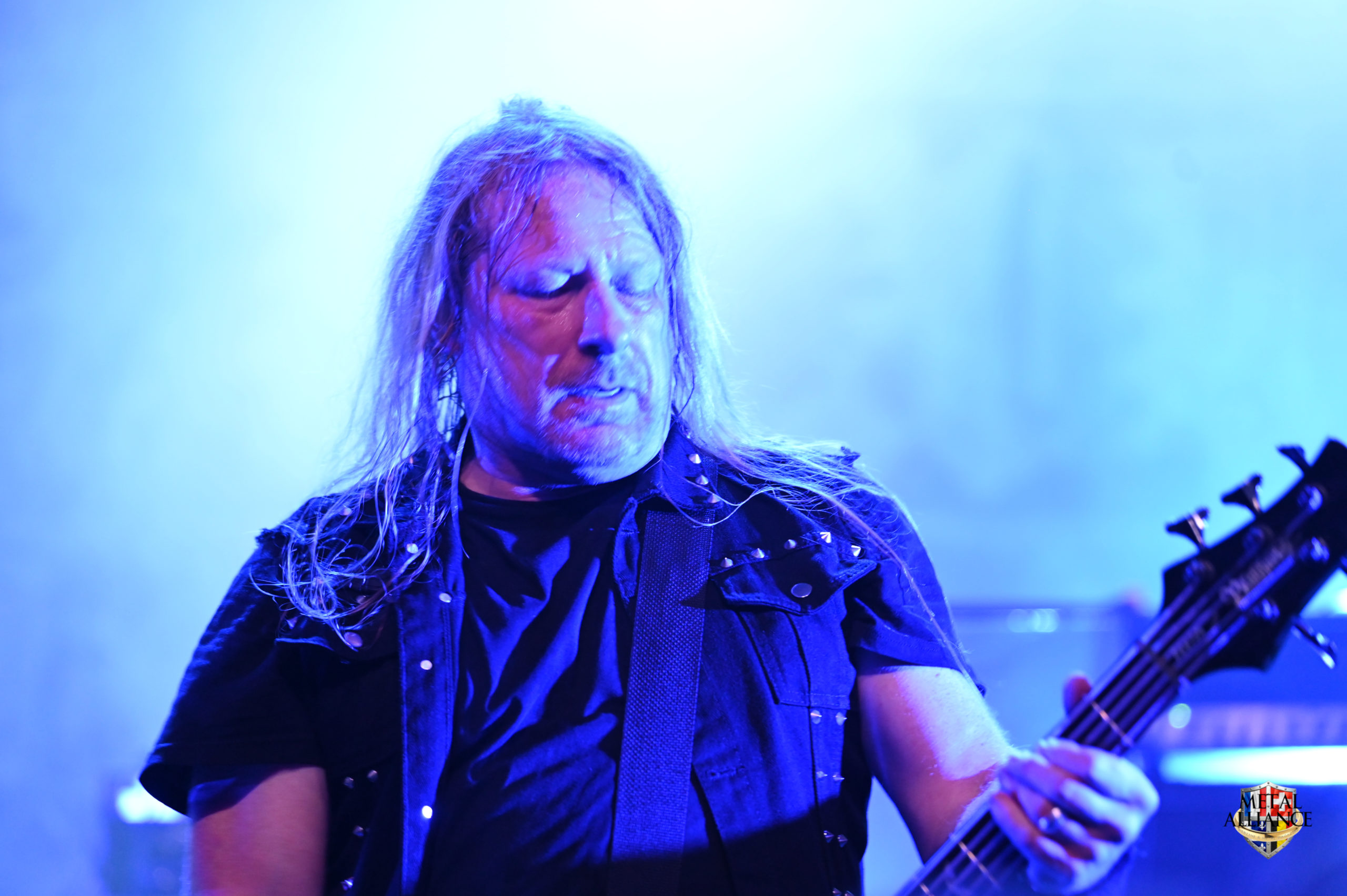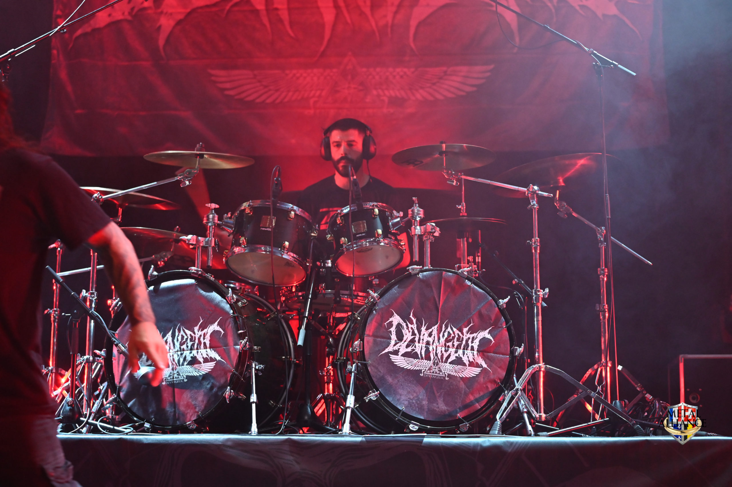 Si on s’est envolé avec Massacra Legacy, autant vous dire que Demonical nous fait redescendre. Charlie Fryksell a une profondeur de voix qui nous emmène dans les méandres de la terre mais avec une rapidité due à la mélodie infernale. Ronnie Bergerstål donne de la double pédale bien lourde et les cordes d’Eki Kumpulainen s’usent dans des allers-retours rapides. Ça tabasse. On notera que leur fond de scène occupe tout le mur derrière eux, ce qui donne une sacrée impression de vertige, et qu’ils sont équipés d’un rétro projo. Martin Schulman, le bassiste, n’est pas en reste, il chante en duo ou en appui du chanteur.