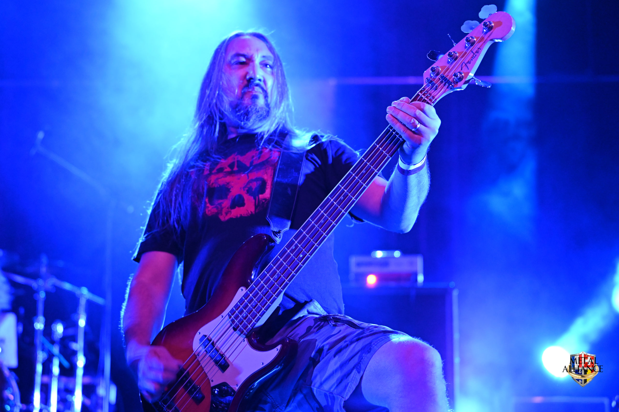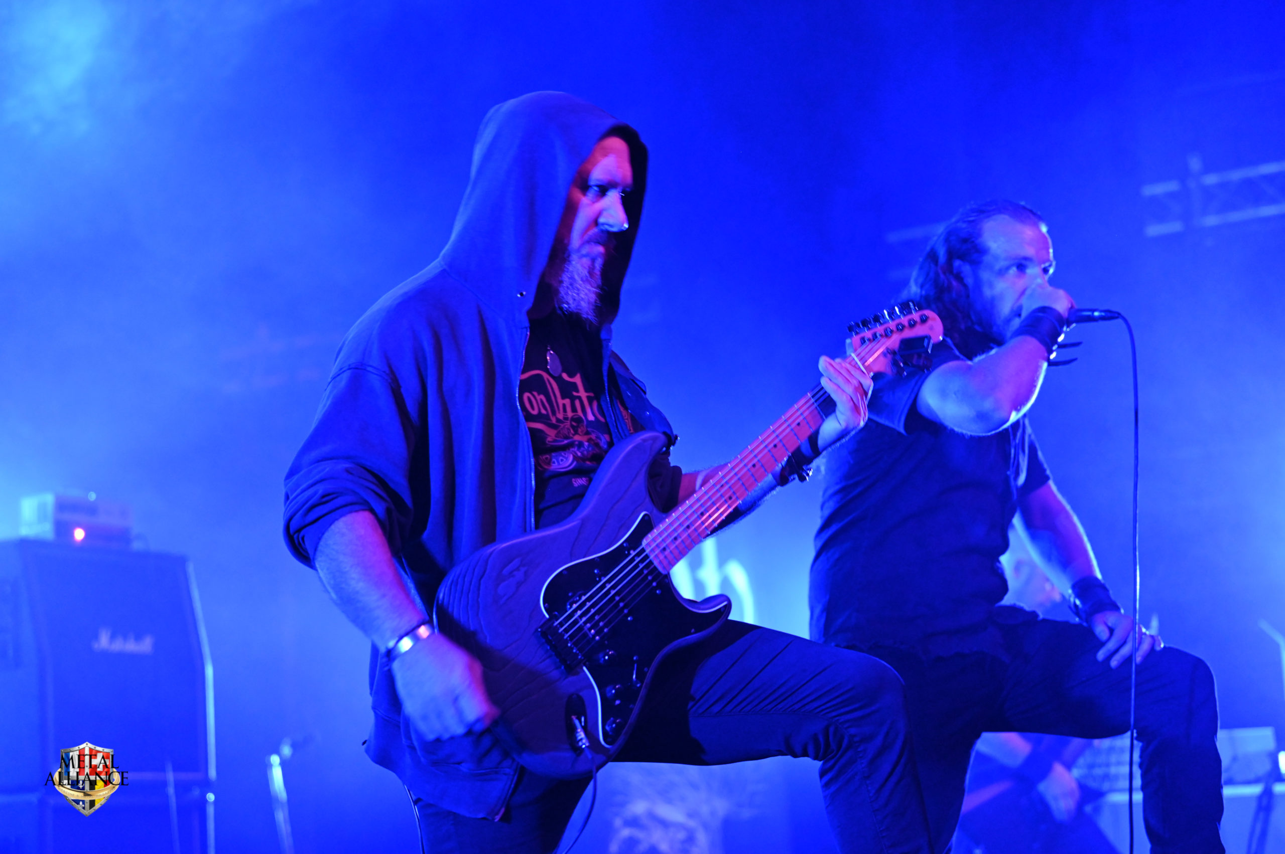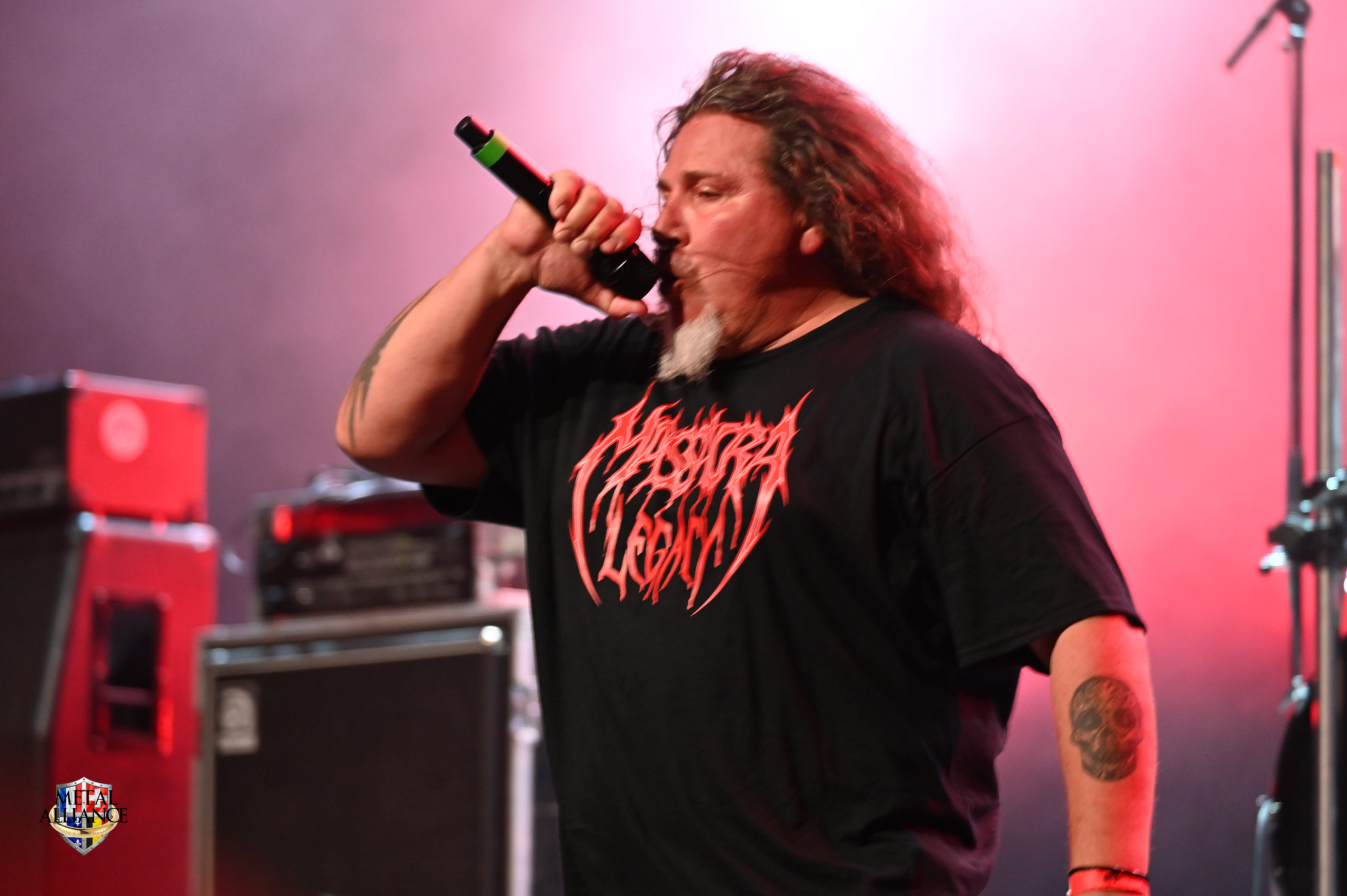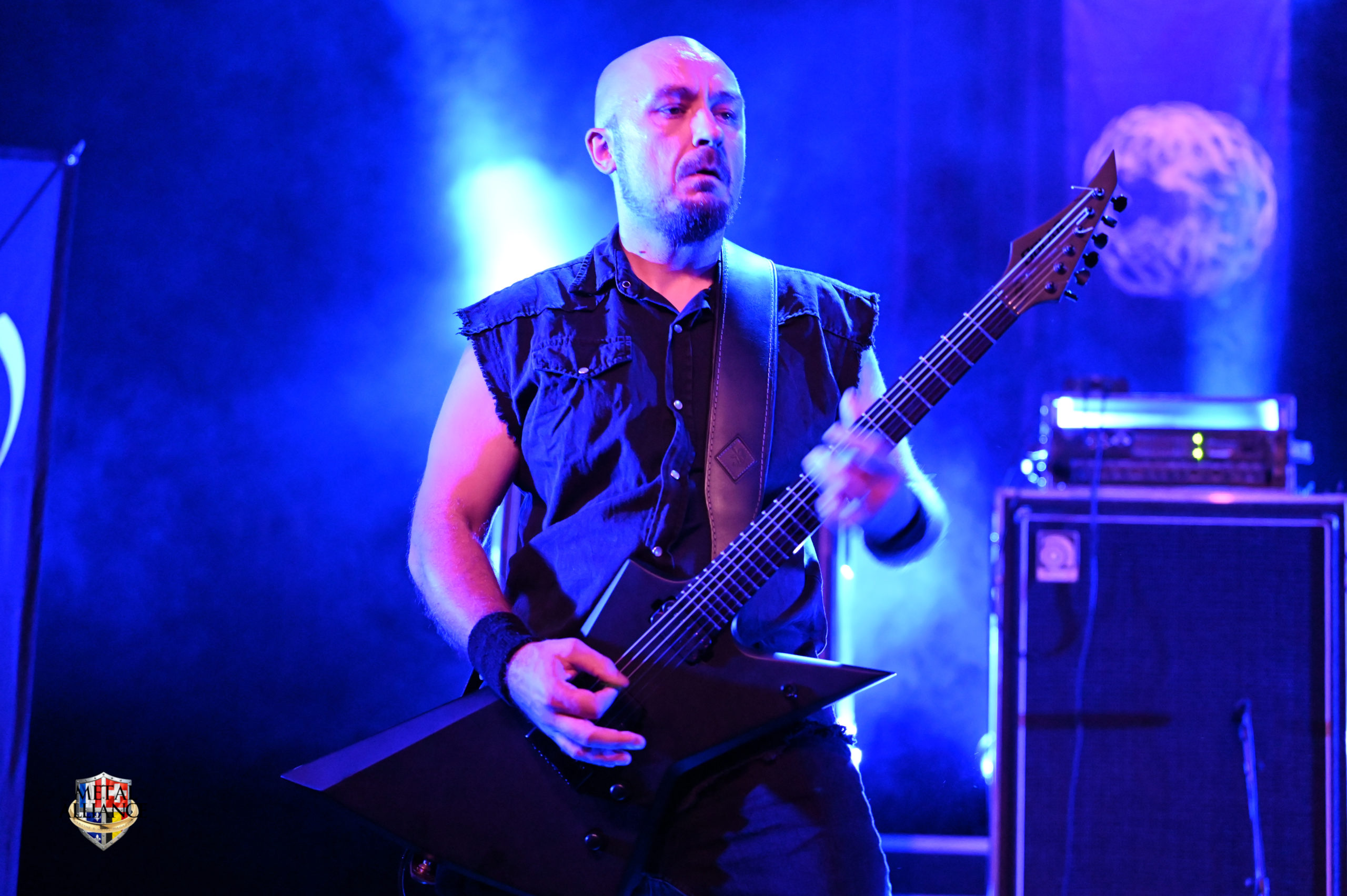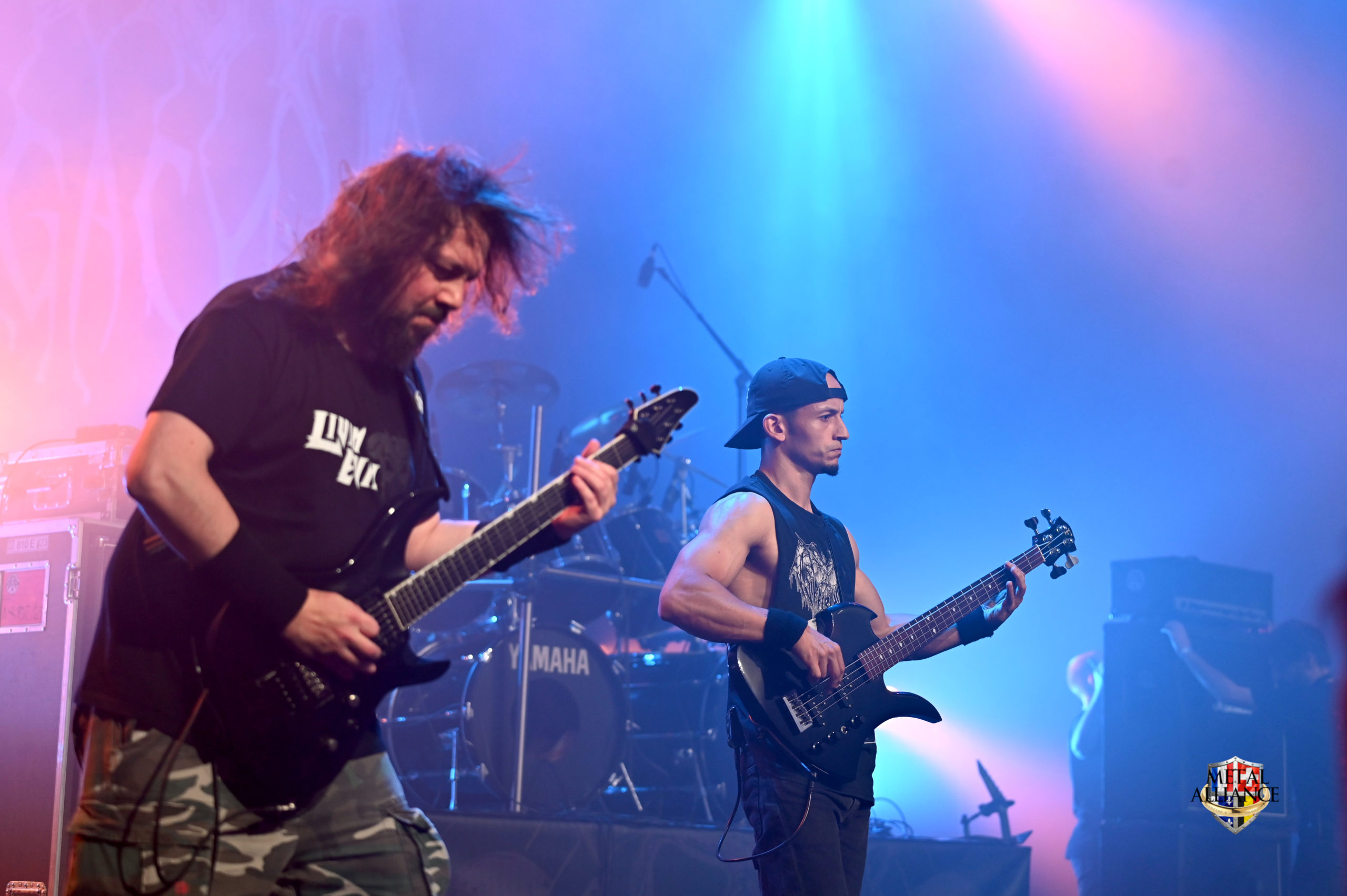 Enfin Massacra Legacy ! Je suis tellement heureuse après cette superbe interview, j’attendais les membres du groupe avec encore plus d’impatience. À l’image de Kronos il y a 2 ans, la nostalgie m’envahit mais toujours avec le sourire. Quelle bonne idée, Chris ! Merci à toi et ton nouveau line up plein de talent. Un problème technique côté guitare pour Don Brutal, sur le premier titre Enjoy the Violence, car les aléas de la scène n’épargnent personne, mais comme les musiciens sont déjà bien aguerris, tout le monde continue. Moreno Grosso ne s’arrête pas de chanter et heureusement car une redistribution des rôles a eu lieu. En effet, il prend à son compte les deux voix originales, ce qui démontre une maîtrise certaine de son organe. Spéciale dédicace à Nabil Rafiq, un bassiste qui joue aussi vite que les guitaristes pour doubler leurs lignes, ça se savoure. Que vous dire de plus ? Ils enchaînent, ce sont des pros et entre le revival préparé, l’attente des vieux métalleux/ses nostalgiques et la découverte par les plus jeunes, l’ambiance est magnifiquement détonante. Chris, batteur et membre fondateur de Massacra, nous explique qu’ils sont là pour faire revivre le triptyque constitué des premiers albums de Massacra (les plus violents) à l’image des morceaux comme : Final Holocaust, titre éponyme de l’album sorti en 1990. The Day of Massacra a pour intro la voix de Fred, décédé en 1997, et un hommage est aussi rendu à Mathias Slimmer. Eh bien, les gars, c’est un revival réussi ! Vivement les compositions à venir !