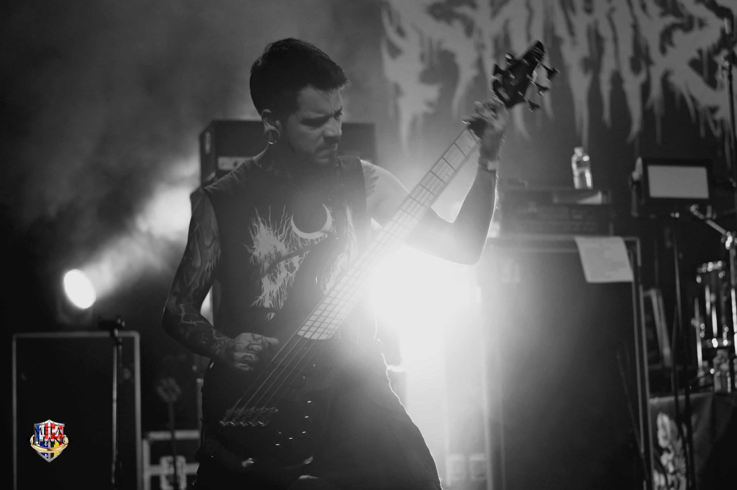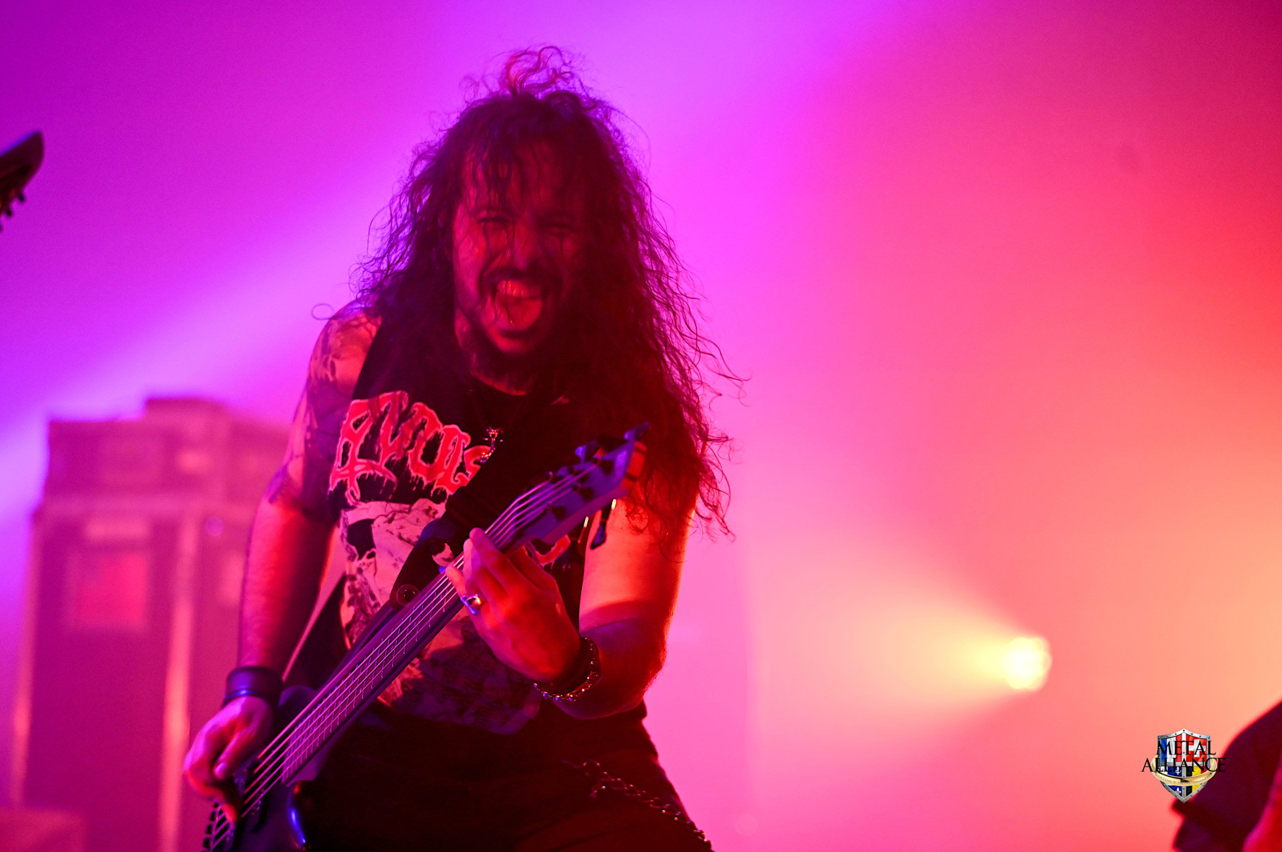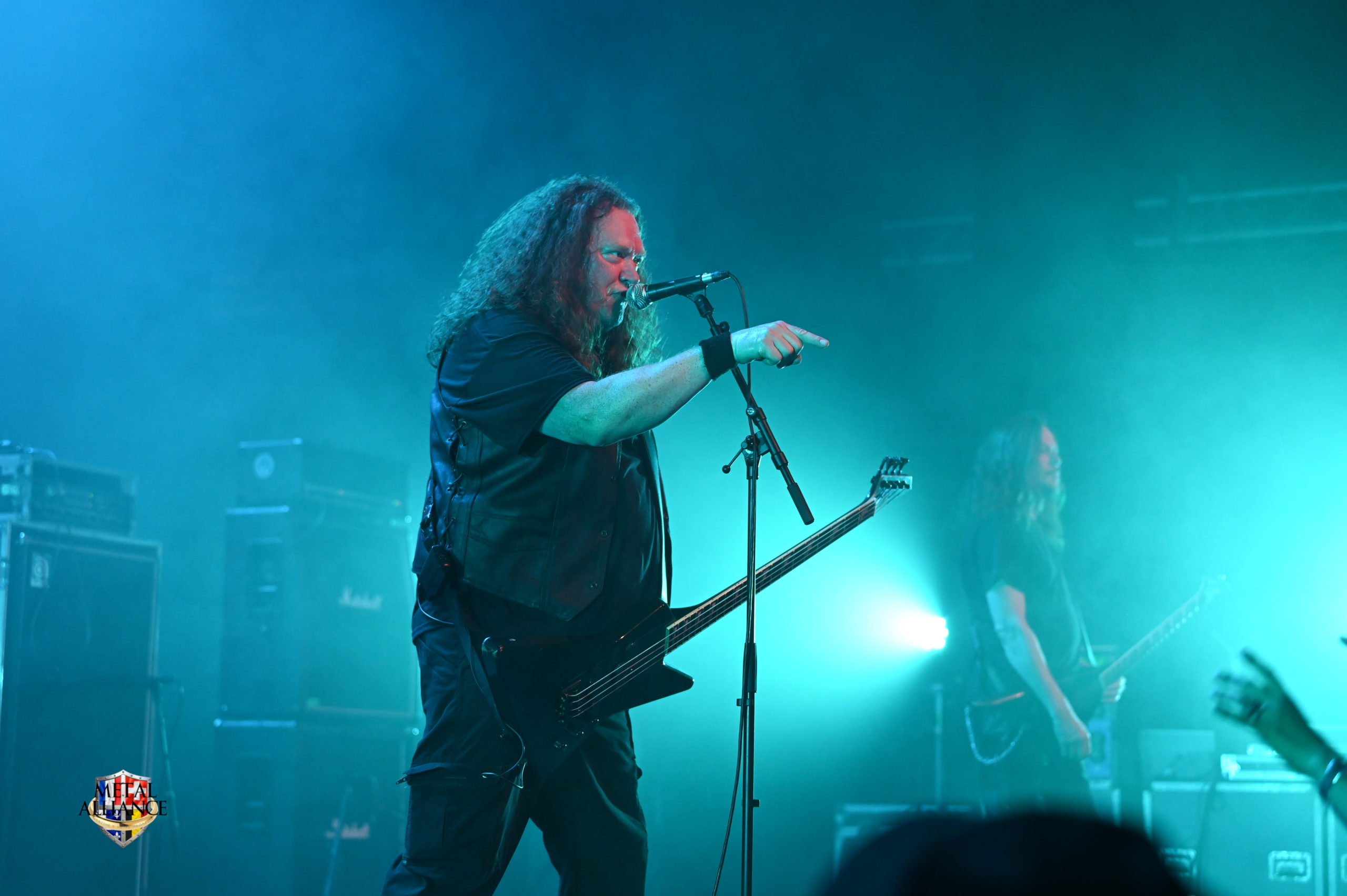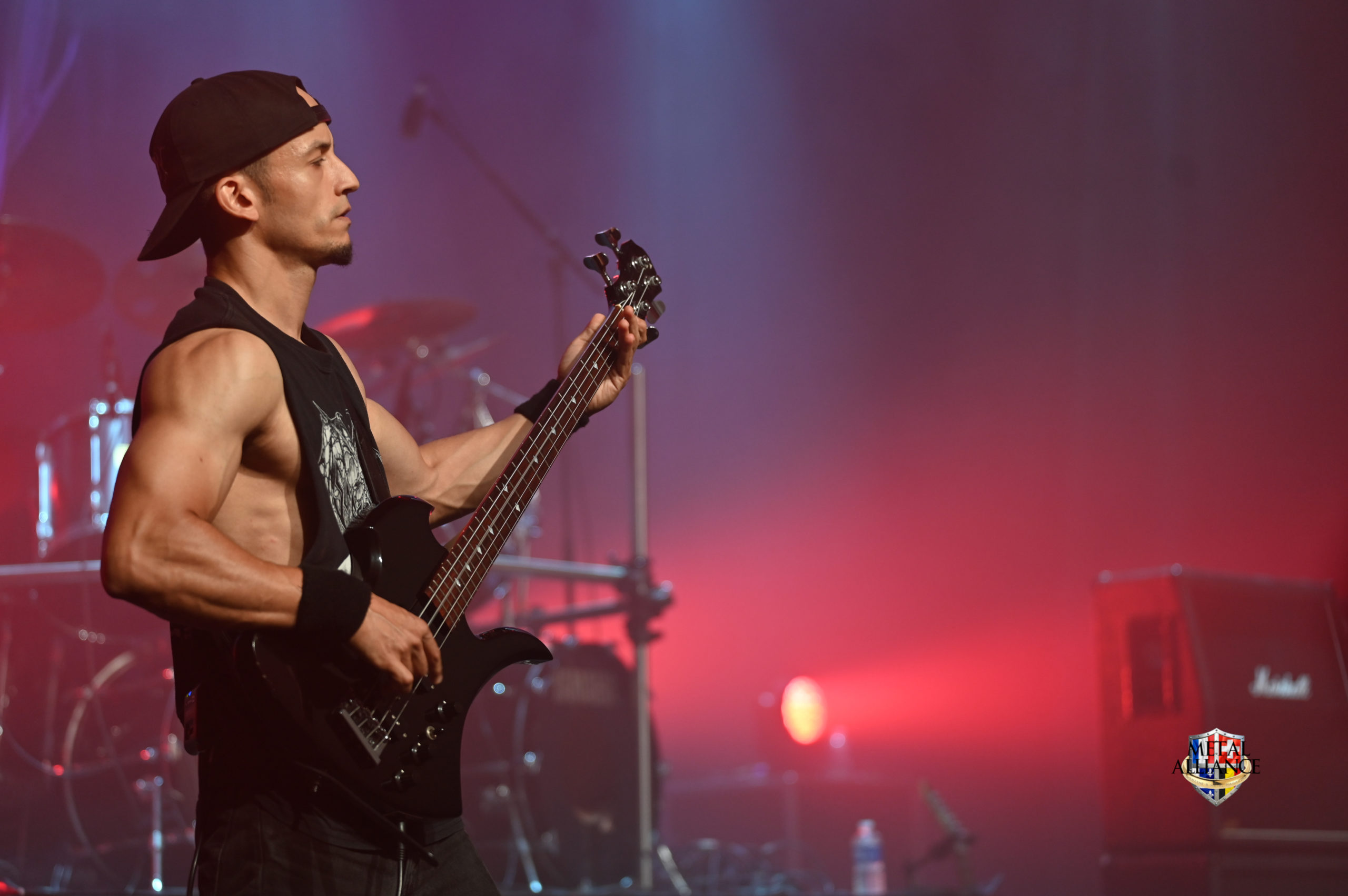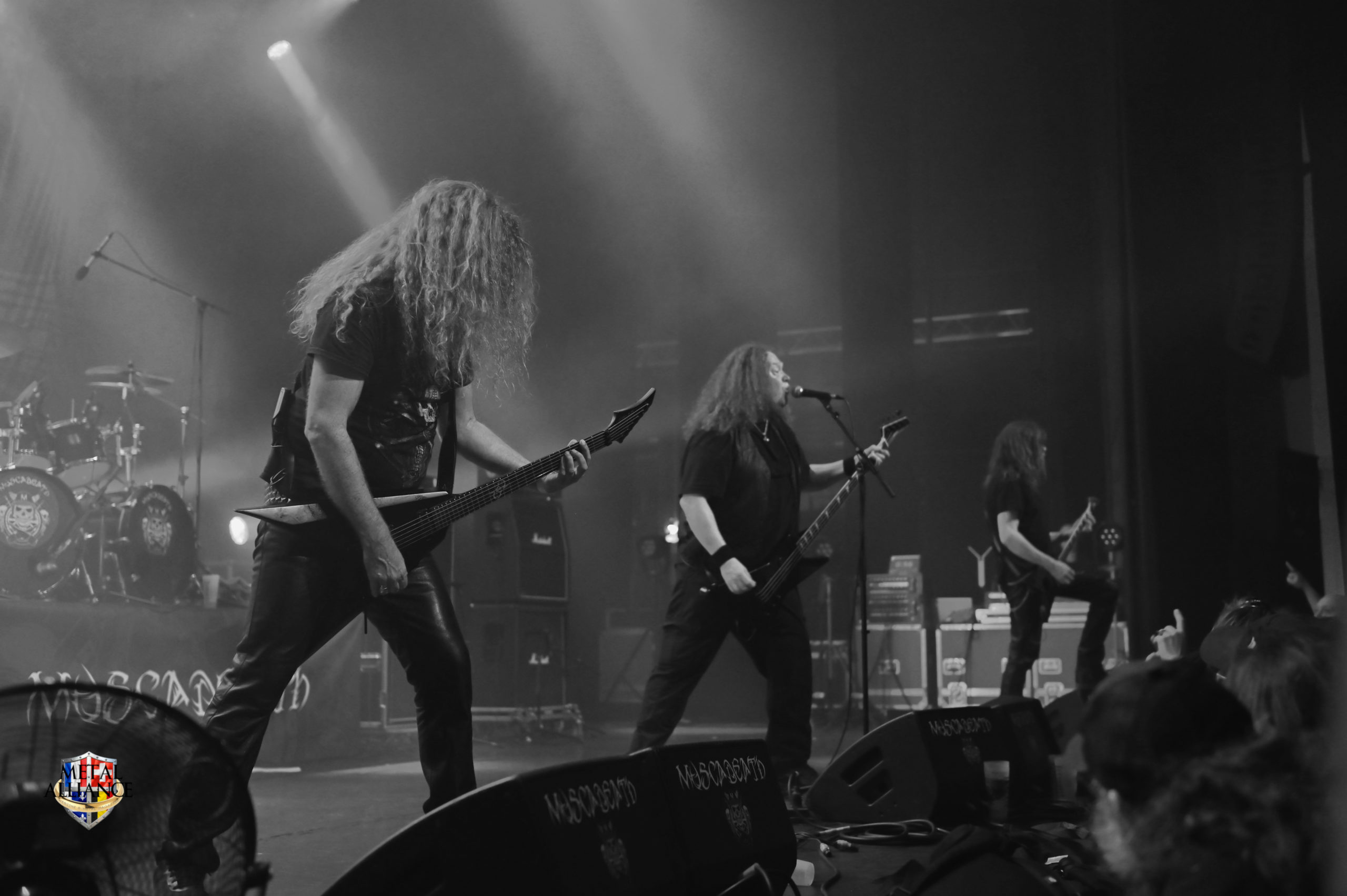 Enfin Massacra Legacy ! Je suis tellement heureuse après cette superbe interview, j’attendais les membres du groupe avec encore plus d’impatience. À l’image de Kronos il y a 2 ans, la nostalgie m’envahit mais toujours avec le sourire. Quelle bonne idée, Chris ! Merci à toi et ton nouveau line up plein de talent. Un problème technique côté guitare pour Don Brutal, sur le premier titre Enjoy the Violence, car les aléas de la scène n’épargnent personne, mais comme les musiciens sont déjà bien aguerris, tout le monde continue. Moreno Grosso ne s’arrête pas de chanter et heureusement car une redistribution des rôles a eu lieu. En effet, il prend à son compte les deux voix originales, ce qui démontre une maîtrise certaine de son organe. Spéciale dédicace à Nabil Rafiq, un bassiste qui joue aussi vite que les guitaristes pour doubler leurs lignes, ça se savoure. Que vous dire de plus ? Ils enchaînent, ce sont des pros et entre le revival préparé, l’attente des vieux métalleux/ses nostalgiques et la découverte par les plus jeunes, l’ambiance est magnifiquement détonante. Chris, batteur et membre fondateur de Massacra, nous explique qu’ils sont là pour faire revivre le triptyque constitué des premiers albums de Massacra (les plus violents) à l’image des morceaux comme : Final Holocaust, titre éponyme de l’album sorti en 1990. The Day of Massacra a pour intro la voix de Fred, décédé en 1997, et un hommage est aussi rendu à Mathias Slimmer. Eh bien, les gars, c’est un revival réussi ! Vivement les compositions à venir !