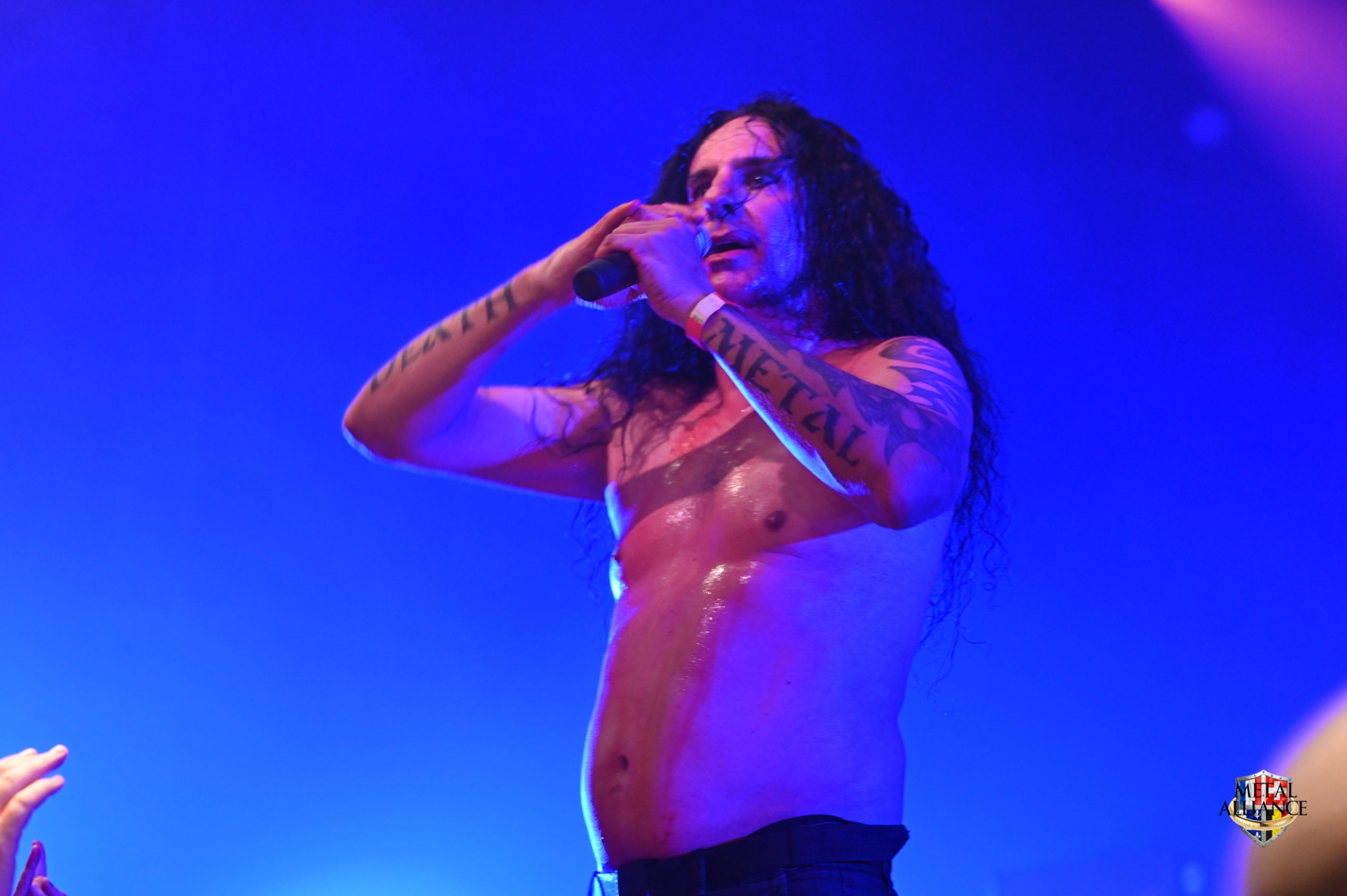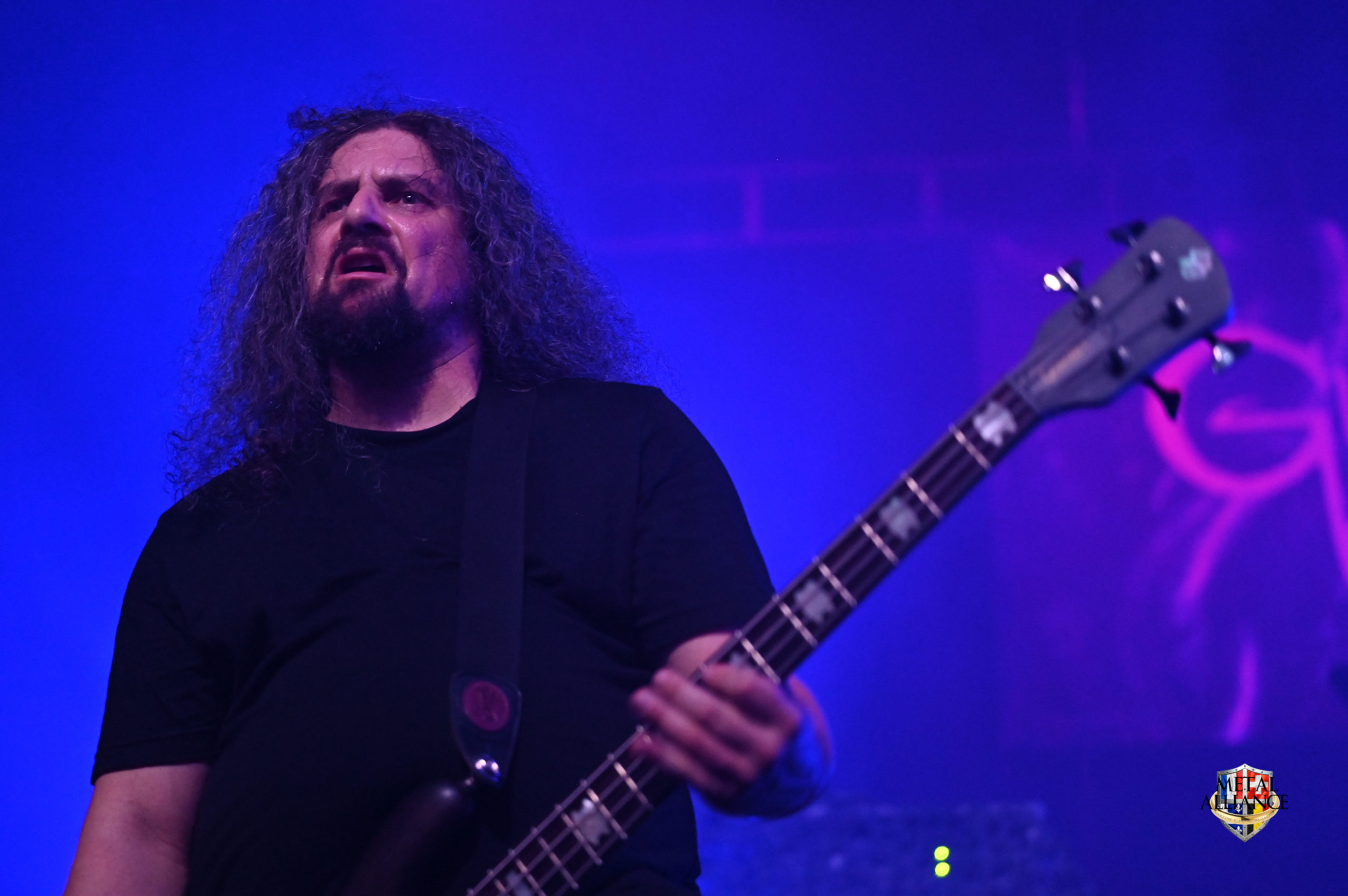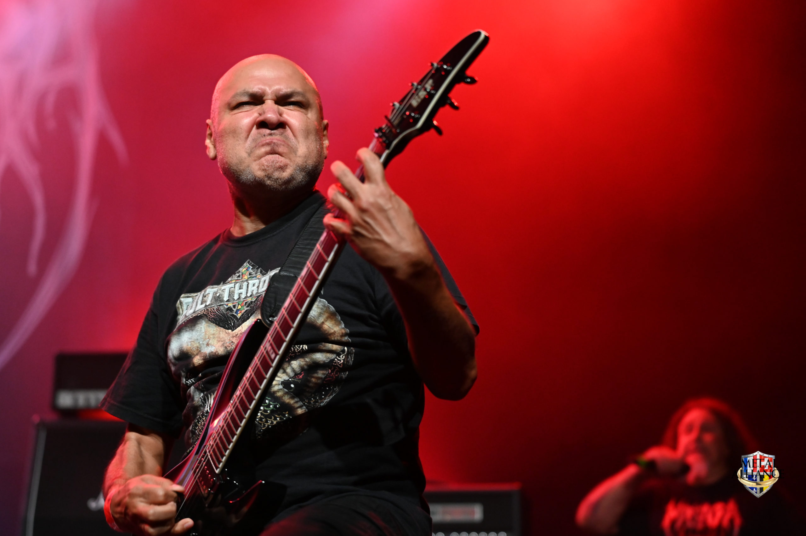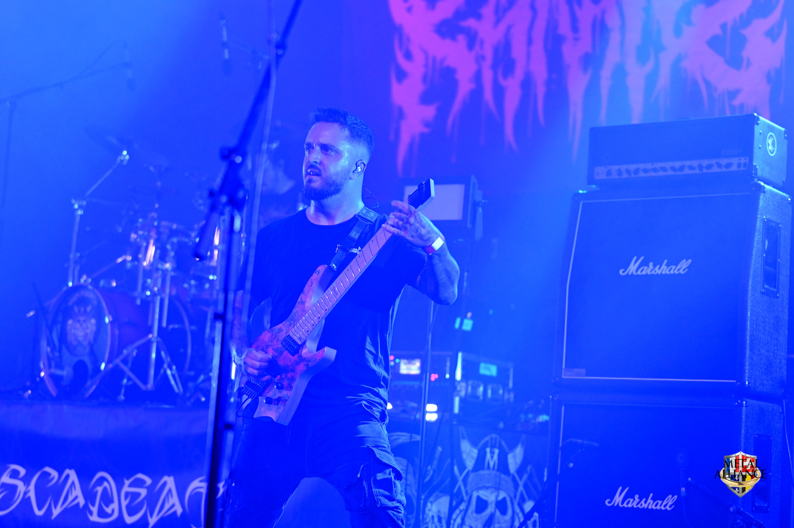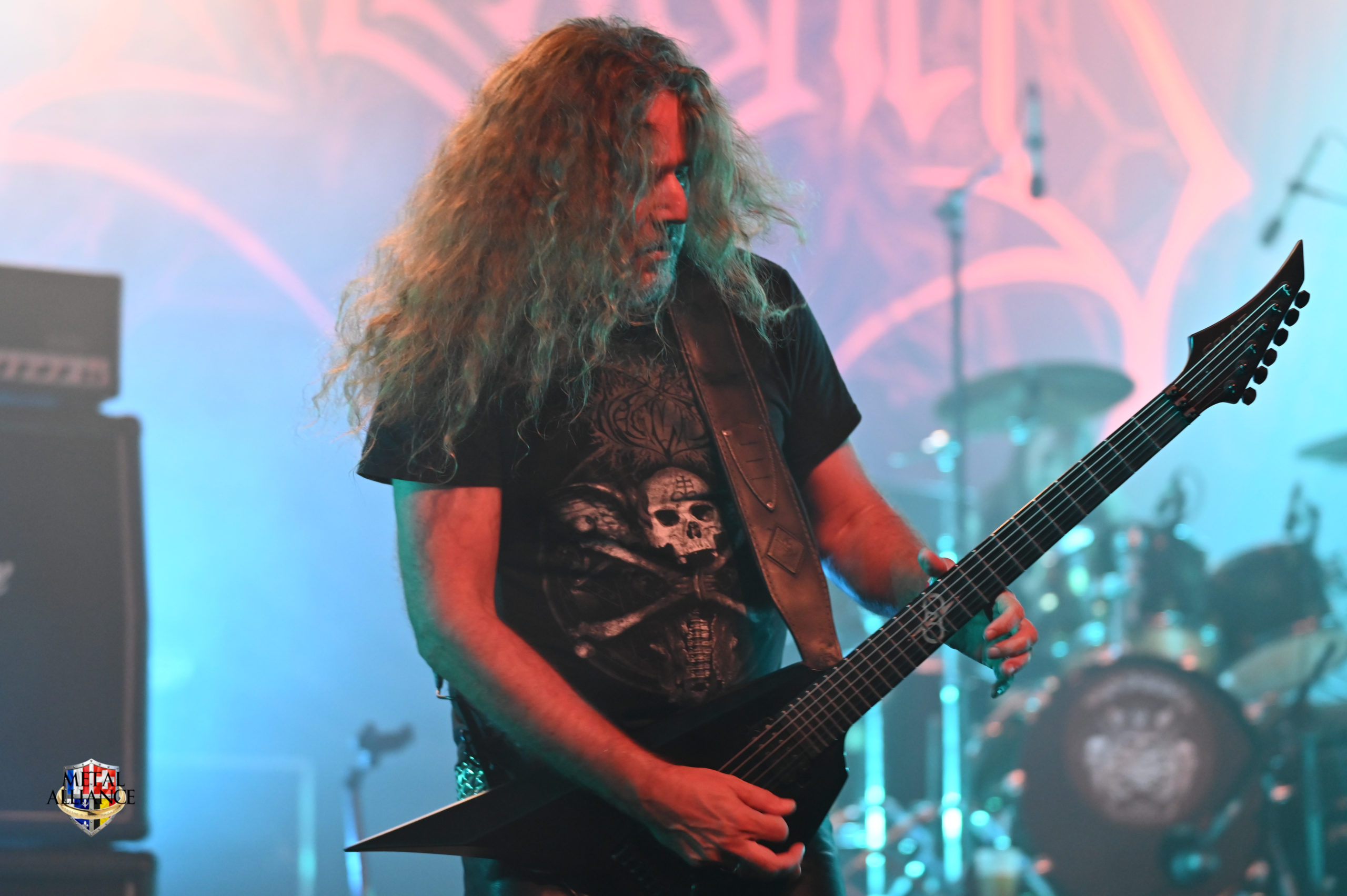 Enfin Massacra Legacy ! Je suis tellement heureuse après cette superbe interview, j’attendais les membres du groupe avec encore plus d’impatience. À l’image de Kronos il y a 2 ans, la nostalgie m’envahit mais toujours avec le sourire. Quelle bonne idée, Chris ! Merci à toi et ton nouveau line up plein de talent. Un problème technique côté guitare pour Don Brutal, sur le premier titre Enjoy the Violence, car les aléas de la scène n’épargnent personne, mais comme les musiciens sont déjà bien aguerris, tout le monde continue. Moreno Grosso ne s’arrête pas de chanter et heureusement car une redistribution des rôles a eu lieu. En effet, il prend à son compte les deux voix originales, ce qui démontre une maîtrise certaine de son organe. Spéciale dédicace à Nabil Rafiq, un bassiste qui joue aussi vite que les guitaristes pour doubler leurs lignes, ça se savoure. Que vous dire de plus ? Ils enchaînent, ce sont des pros et entre le revival préparé, l’attente des vieux métalleux/ses nostalgiques et la découverte par les plus jeunes, l’ambiance est magnifiquement détonante. Chris, batteur et membre fondateur de Massacra, nous explique qu’ils sont là pour faire revivre le triptyque constitué des premiers albums de Massacra (les plus violents) à l’image des morceaux comme : Final Holocaust, titre éponyme de l’album sorti en 1990. The Day of Massacra a pour intro la voix de Fred, décédé en 1997, et un hommage est aussi rendu à Mathias Slimmer. Eh bien, les gars, c’est un revival réussi ! Vivement les compositions à venir !