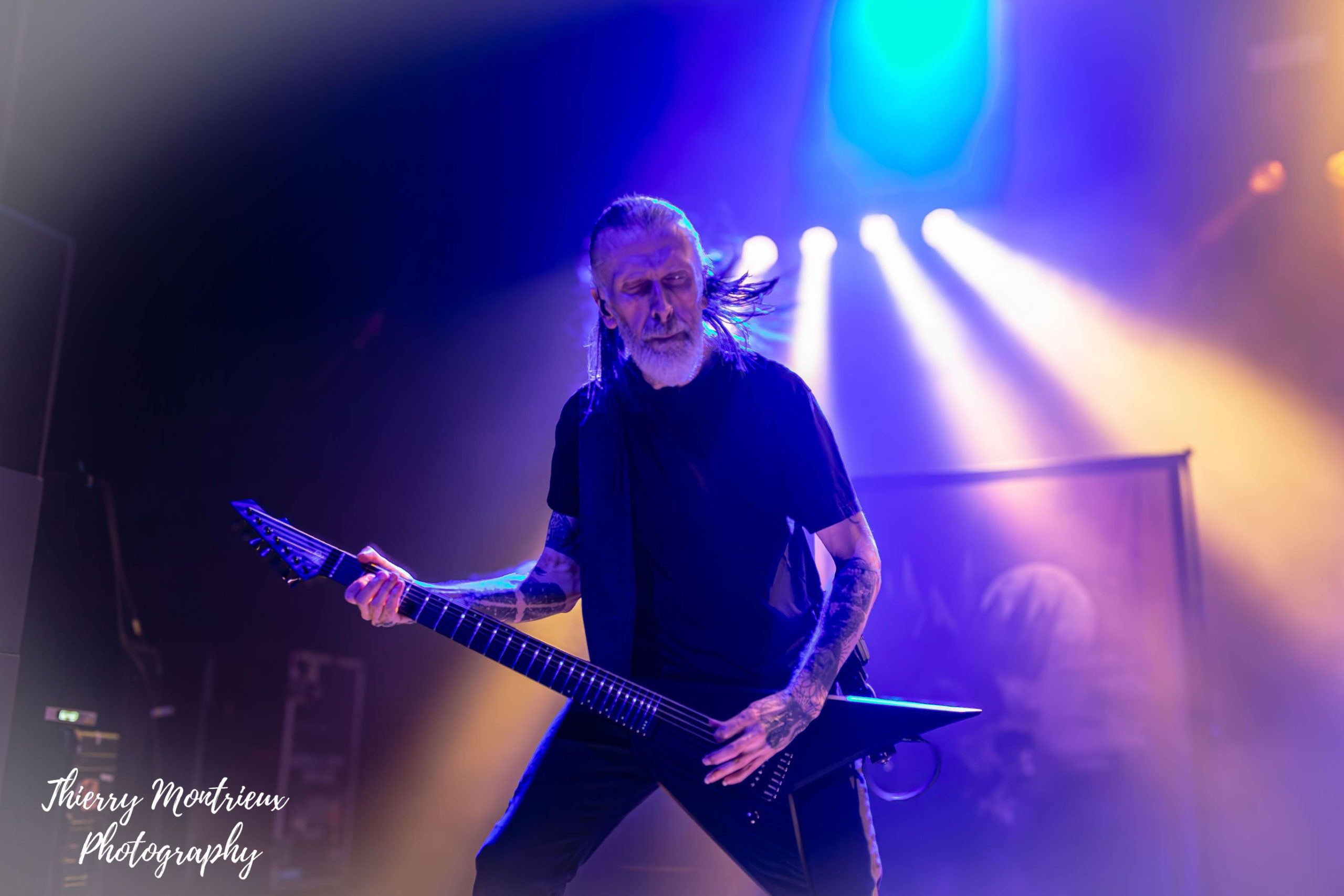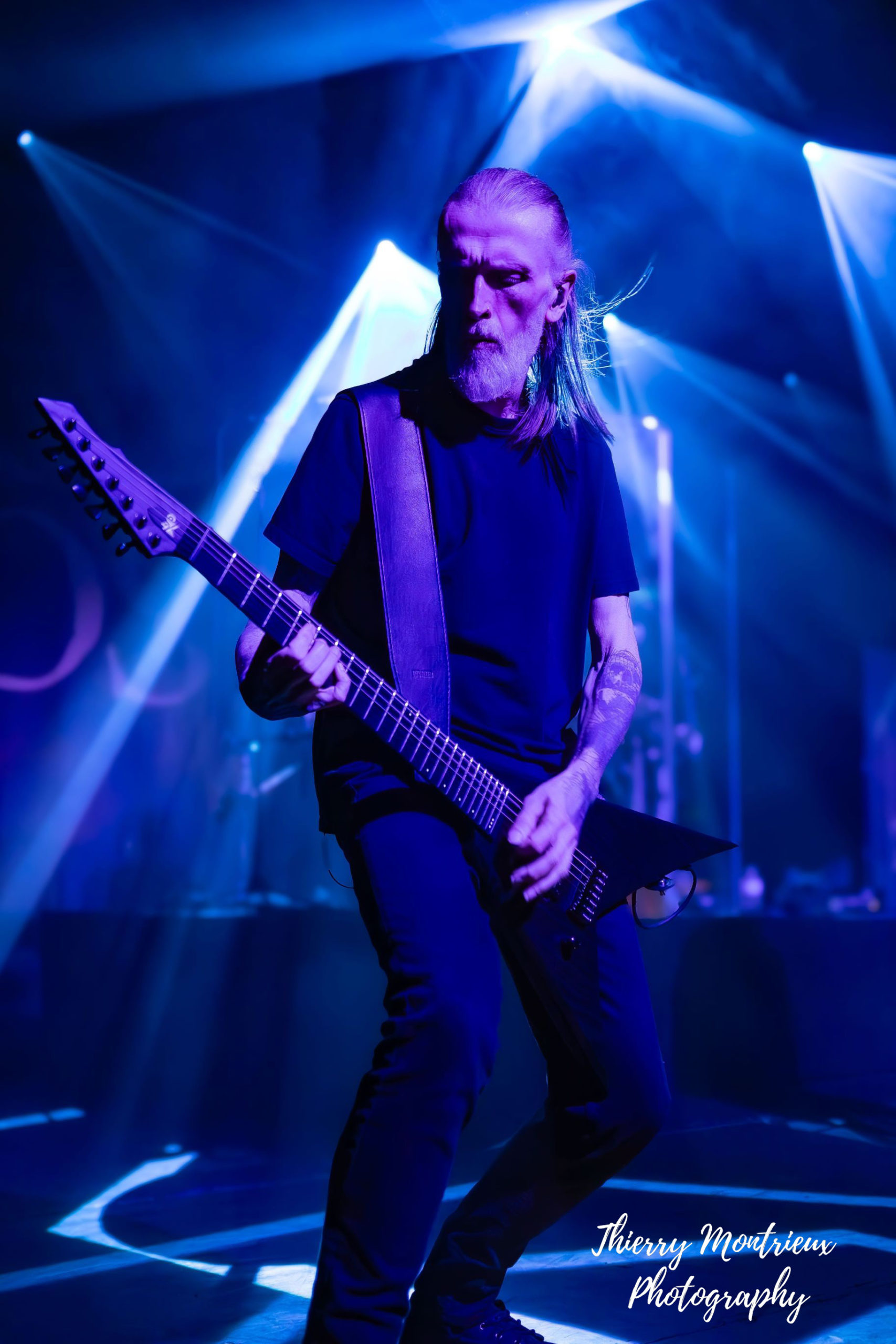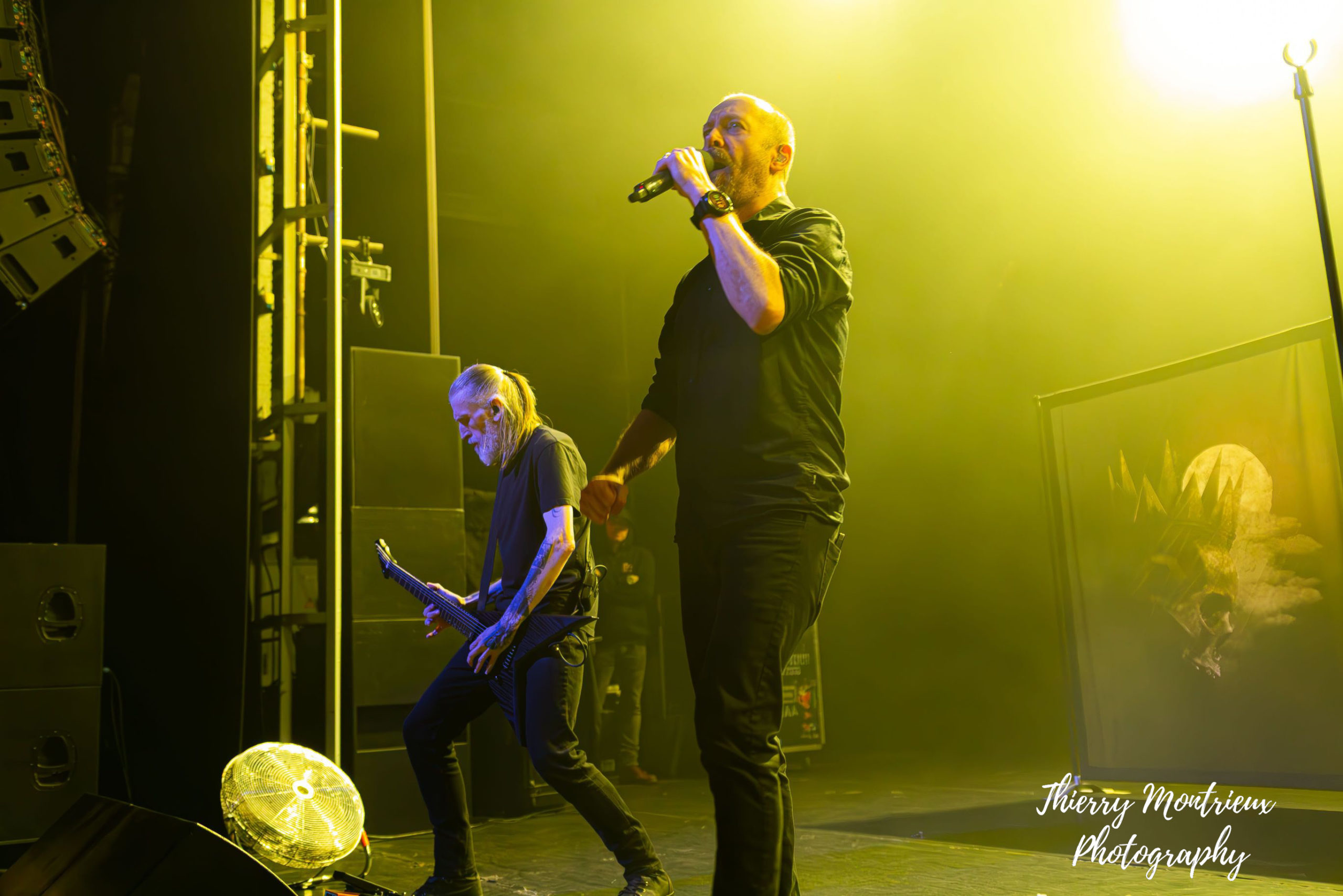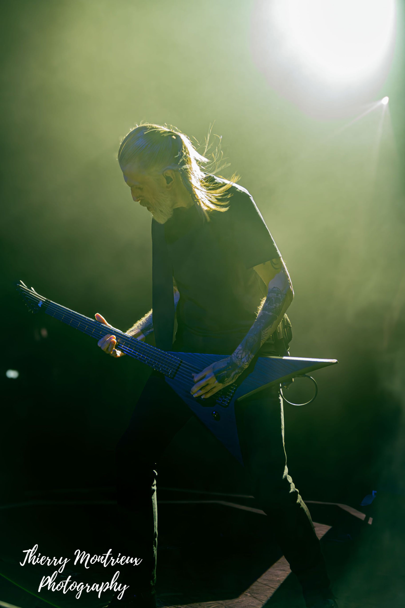 En tête d’affiche, Paradise Lost déroule un show dense et élégant, calibré pour célébrer sa période emblématique tout en ancrant la nouvelle ère Ascension. Du dernier album, ils joueront trois titres : Serpent on the Cross, Silence Like the Grave et Tyrants Serenade. Charisme sobre au chant de Nick Holmes, guitares enlacées avec précision, rythmique chirurgicale – l’ensemble respire une maturité scénique impressionnante, qu’on soit à Londres, Paris, Vienne ou Padoue. Les titres récents s’imbriquent naturellement aux classiques (treize titres qui passent toute leur carrière en revue), l’écriture mélodique et les contrastes goth/doom s’additionnant pour construire un vrai récit de concert : tension, relâchement, climax final. Au fil des morceaux, on sent la montée en régime : la salle est sold-out et le public embarqué. Grande soirée, grand groupe, net et sans bavure.