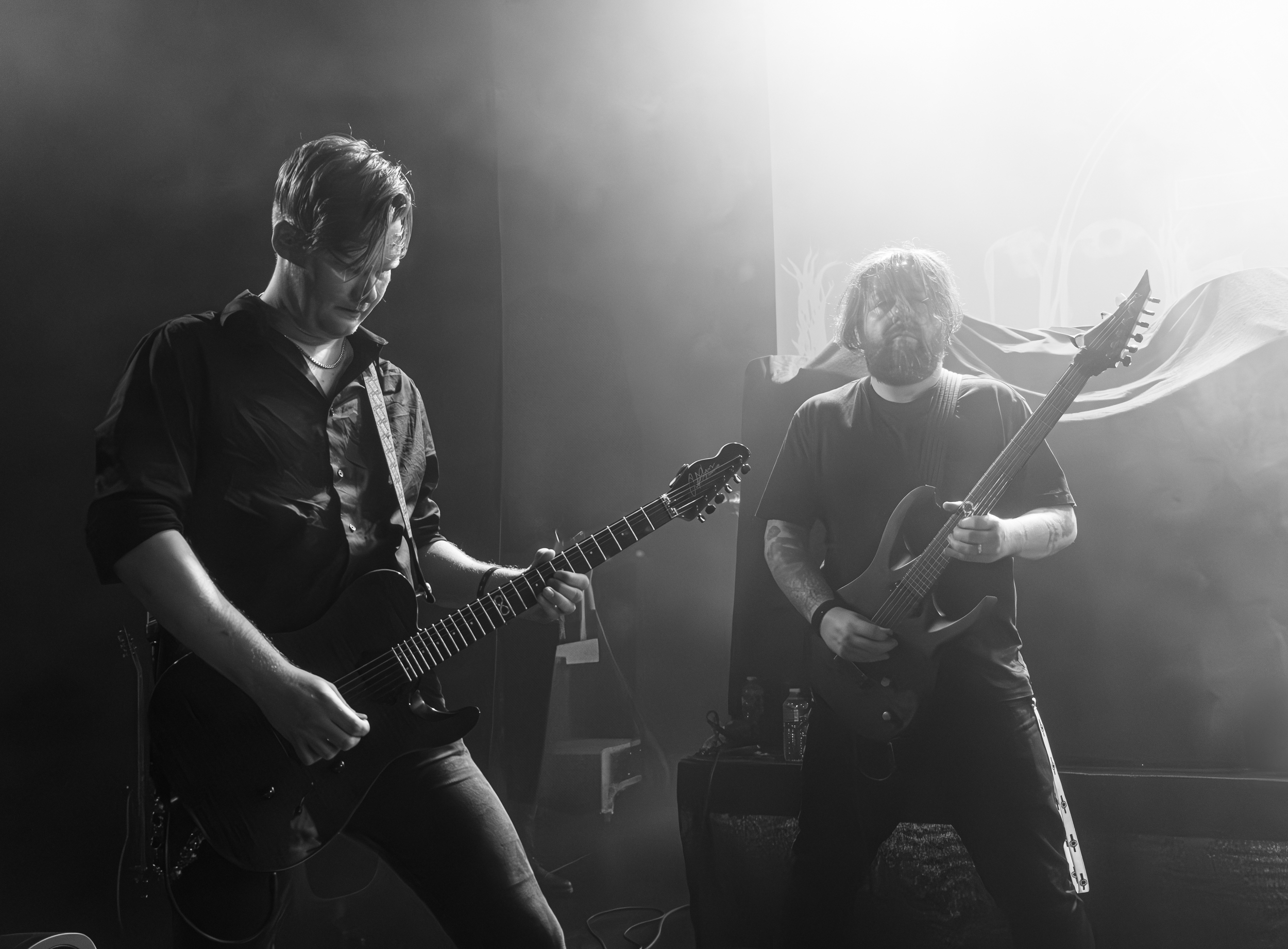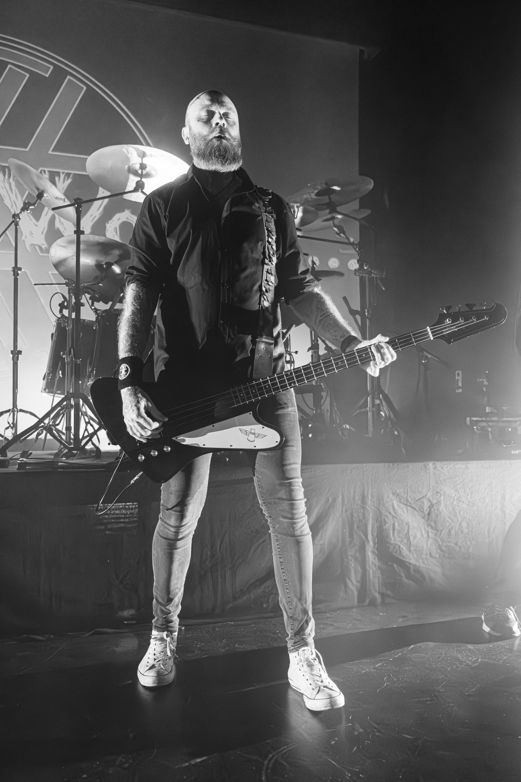 À peine plus d’une semaine après avoir découvert In the Woods… sur une scène de l’Inferno Festival 2025, je retrouve le groupe norvégien dans ma ville — pour mon plus grand plaisir, ayant déjà bien apprécié la prestation. Après un check de rigueur entre les musiciens que j’observe d’un coup d’œil furtif derrière les rideaux, ces derniers ouvrent le set sur Heart of the Ages, hommage aux débuts du groupe dans les années 90. « On essaie de jouer les gros durs, mais on n’y arrive jamais ! » plaisante ensuite le frontman Bernt Fjellestad, ceci alors que quelques spectateurs s’amusent à faire les marioles. Suit The Coward’s Way, extrait de l’album Diversum sorti en 2022. À l’instar de la tête d’affiche de ce soir, In the Woods… vient avec un nouvel album à promouvoir, Otra, tout fraîchement sorti le 17 avril dernier, — soit dix jours avant le concert de ce soir —, comme le rappelle Bernt Fjellestad. S’ensuit un premier extrait de l’album en question, The Crimson Crown. Le morceau est bien catchy et sonne presque pop, en dépit de son refrain jouant sur le switch vocal entre chant clair et saturé, qui donne au frontman l’occasion de montrer son excellence dans le domaine ; malheureusement, de près, le chant black est moins audible. De manière générale, In the Woods… joue sur son style hybride entre black metal et le mélange entre metal gothique et progressif qui a donné un second souffle à sa carrière dans les années 2010. Un tel style n’est pas voué à faire l’unanimité — comme me le démontreront certains camarades de concert de ce soir qui me diront ne pas avoir accroché —, toutefois le cœur que le groupe met à l’ouvrage se voit et se salue bien bas.