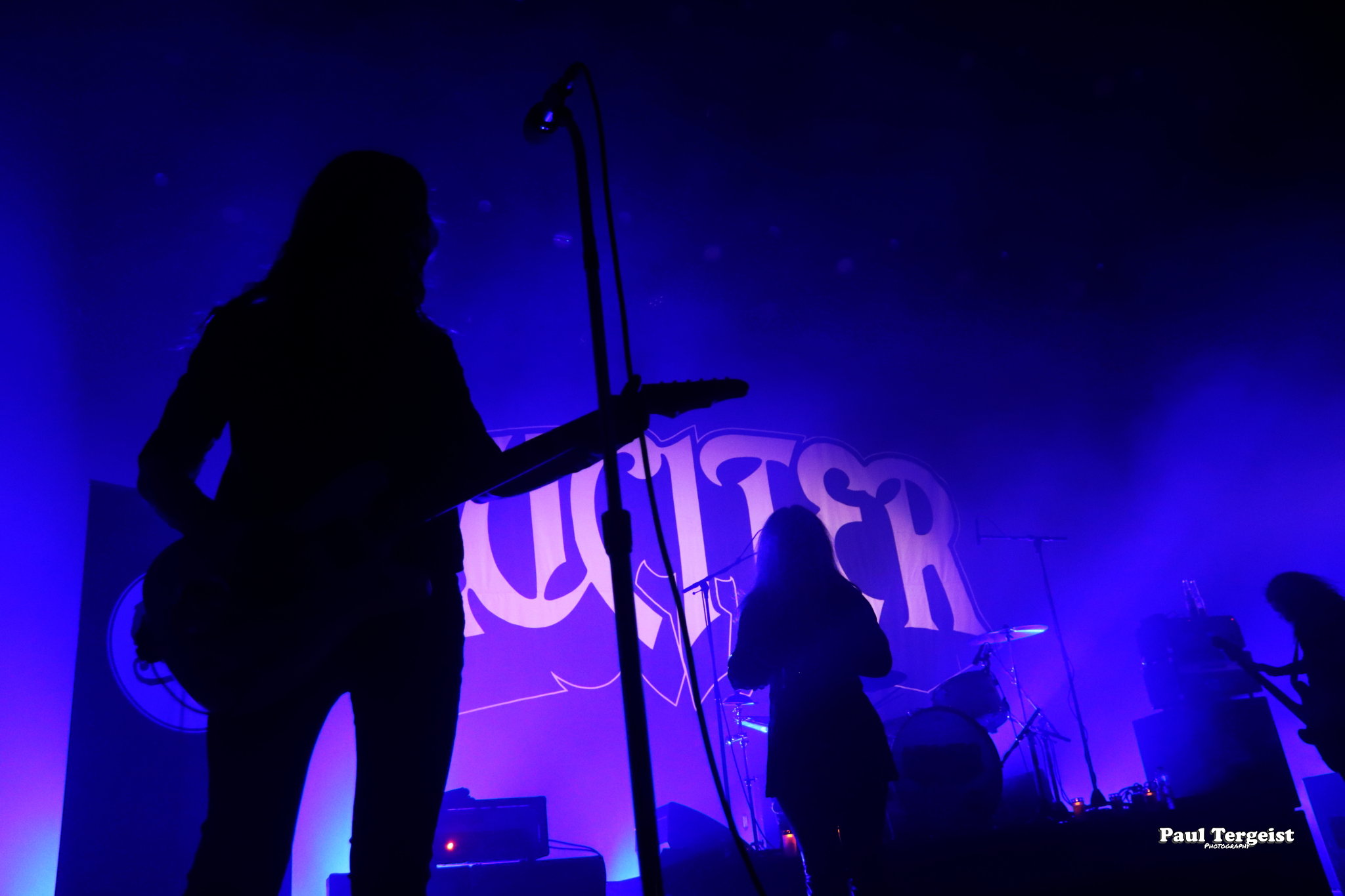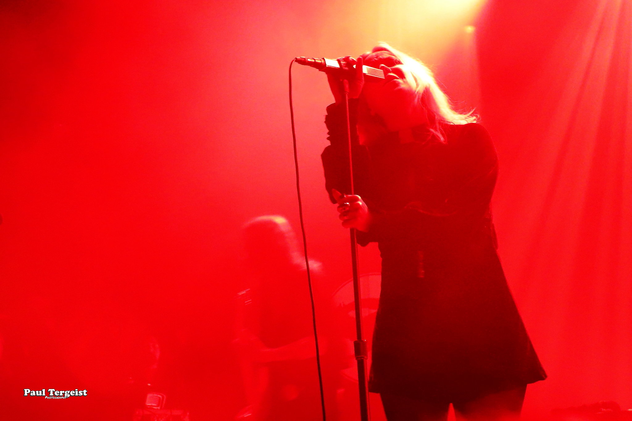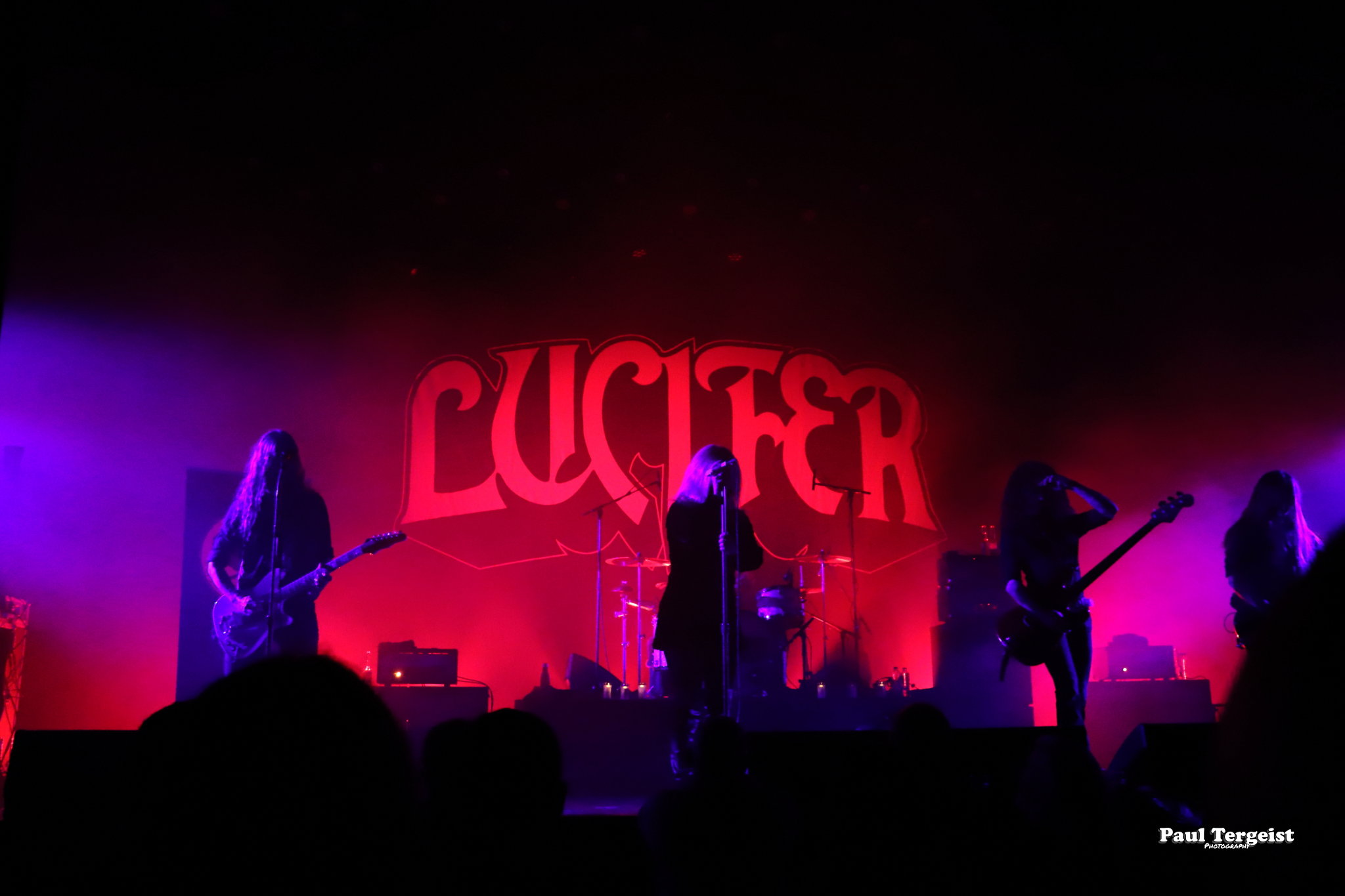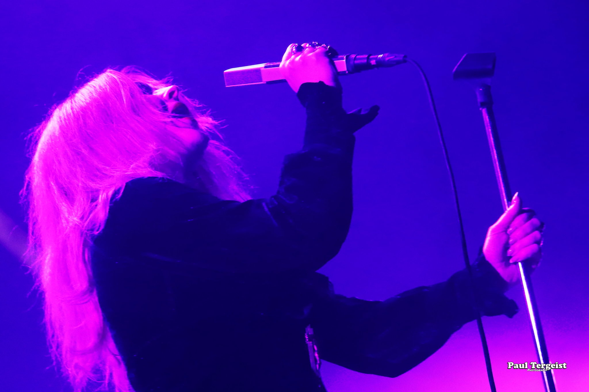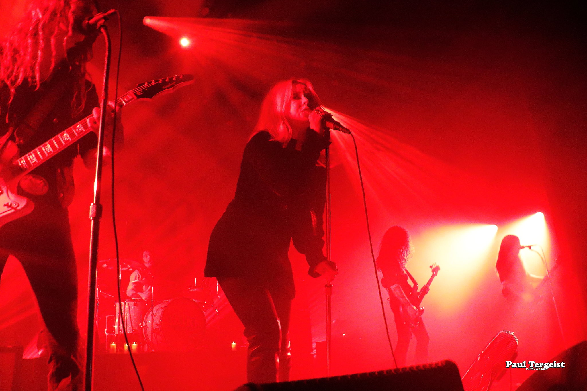 Juste avant l’entrée en scène de Lucifer, la tête d’affiche de cette tournée, se met en place un autre décor, bien plus simple cette fois-ci, composé d’un cercueil et de quelques bougies dans des verres ; simple, mais amplement suffisant à représenter sa direction artistique façon romantisme noir et qui s’assortit bien à l’introduction acoustique sur laquelle les musiciens entrent en scène avant d’embrayer sur Ghosts. Au cours des dix ans écoulés depuis sa formation à Berlin, le groupe mené par Johanna Platow Andersson a parcouru du chemin dans tous les sens de l’expression, entre son déménagement à Stockholm et la sortie de ses cinq albums tous éponymes, dont le dernier, paru à peine quelques semaines plus tôt, le 26 janvier, et déjà très bien reçu ; de quoi promettre un show empreint de la diversité et de l’expérience qui en découlent… Musiciens et chanteuse ont en tout cas tôt fait de démontrer que sur le second point, ils sont au top, en servant au public de La Vapeur un rock heavy et doom qui évoque les grands du genre Black Sabbath sur bien des aspects, comme la basse bien présente façon blues et la voix de Johanna Andersson plus mélodieuse qu’agressive et appuyée par des backing vocals solides assurés par les musiciens. Tout est très propre, carré et calibré… peut-être un peu trop, justement, et c’est là que le bât blesse. Si l’expérience de Lucifer se fait ressentir tout au long du set, la diversité manque à ce dernier, autant dans sa structure même que dans la gestuelle des musiciens, qui, l’une comme l’autre, semblent se contenter de suivre des patterns pré-établis. Parmi les plus notables, je pense aux quatre membres mobiles effectuant les mêmes déplacements en boucle, notamment Johanna qui ne cesse d’avancer et reculer, ainsi qu’à l’époux de cette dernière, Nicke Andersson, qui bat un tempo variant globalement autour du mid… Cela dit, la setlist a pour elle le mérite d’être très équilibrée, regroupant des morceaux issus de toute la discographie de Lucifer — hormis le premier album, laissé de côté —, tous interprétés avec la rigueur qui leur est due. Une bonne place est tout de même accordée aux extraits du petit dernier en date, Lucifer V, parmi lesquels le romantique et lancinant A Slow Dance in a Crypt, qui colle à l’ambiance du 14 février… À ce sujet, j’observe depuis le fond de la salle quelques spectateurs du premier rang danser en se tenant par l’épaule ; aucune agitation, en revanche, n’est à relever. Le public se montre, à l’image du show, plutôt calme et posé. Lorsque Lucifer s’éclipse après Bring Me His Head, ce n’est que pour mieux revenir sous les applaudissements pour un finale de trois titres qui se révèle être le moment le meilleur et le plus intéressant du show, où tout le monde en profite pour se lâcher et s’amuser une ultime fois avant de rentrer…