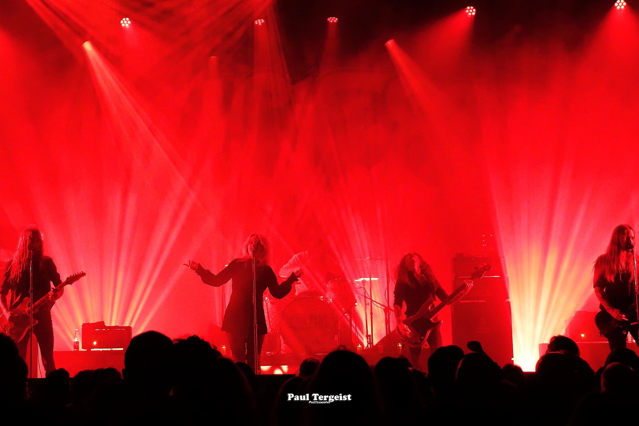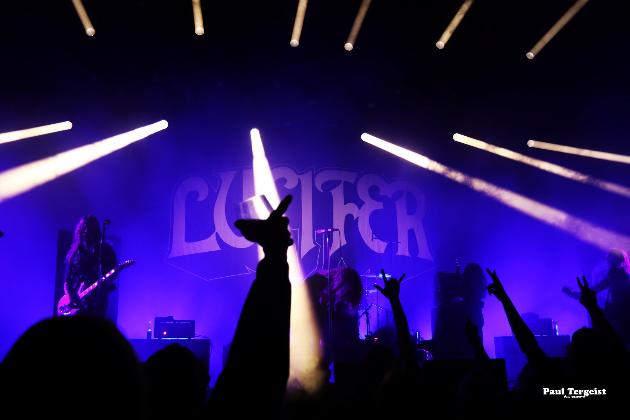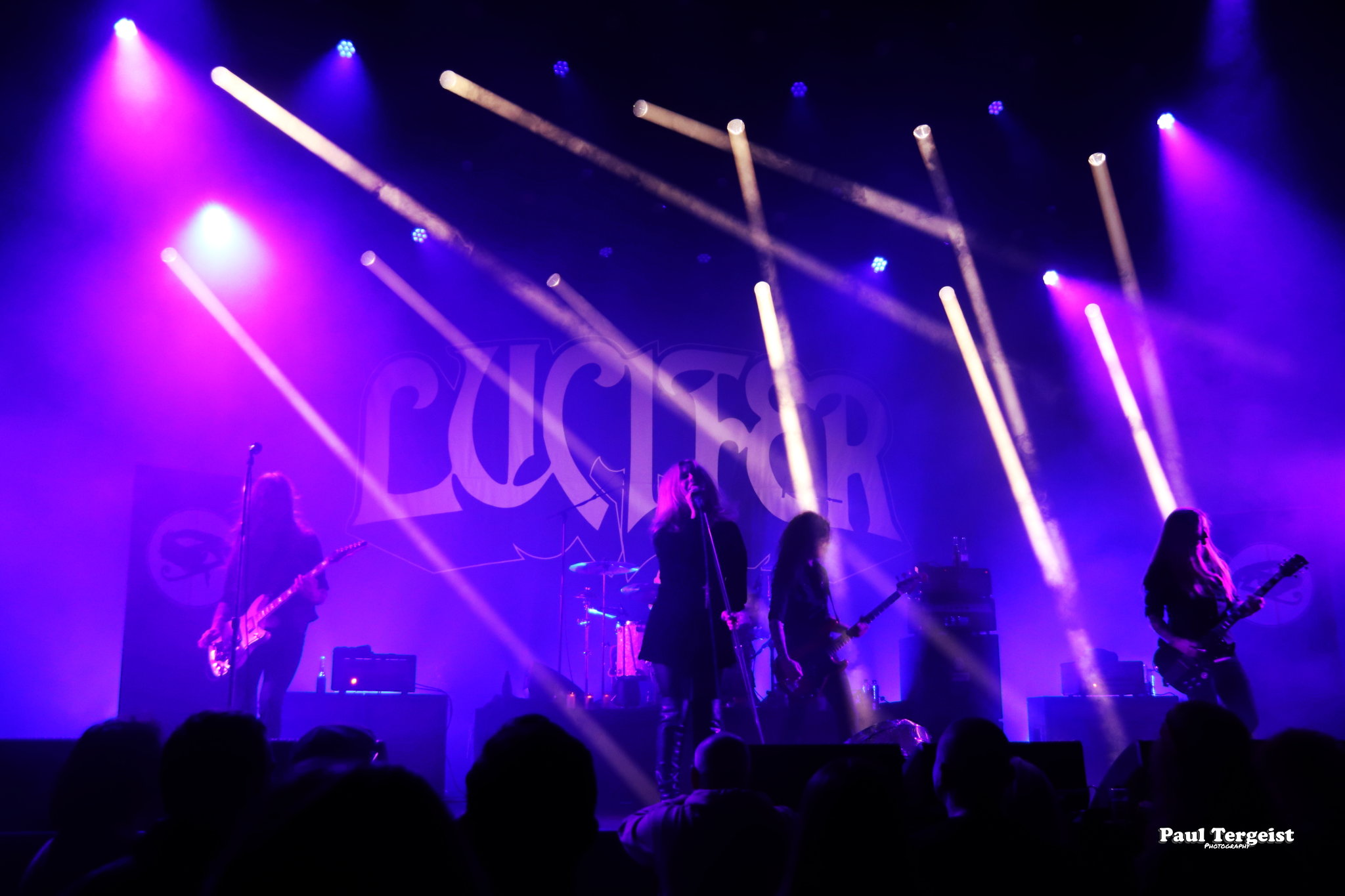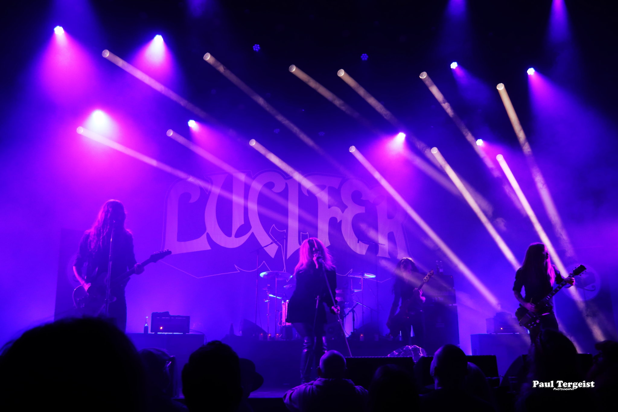 Juste avant l’entrée en scène de Lucifer, la tête d’affiche de cette tournée, se met en place un autre décor, bien plus simple cette fois-ci, composé d’un cercueil et de quelques bougies dans des verres ; simple, mais amplement suffisant à représenter sa direction artistique façon romantisme noir et qui s’assortit bien à l’introduction acoustique sur laquelle les musiciens entrent en scène avant d’embrayer sur Ghosts. Au cours des dix ans écoulés depuis sa formation à Berlin, le groupe mené par Johanna Platow Andersson a parcouru du chemin dans tous les sens de l’expression, entre son déménagement à Stockholm et la sortie de ses cinq albums tous éponymes, dont le dernier, paru à peine quelques semaines plus tôt, le 26 janvier, et déjà très bien reçu ; de quoi promettre un show empreint de la diversité et de l’expérience qui en découlent… Musiciens et chanteuse ont en tout cas tôt fait de démontrer que sur le second point, ils sont au top, en servant au public de La Vapeur un rock heavy et doom qui évoque les grands du genre Black Sabbath sur bien des aspects, comme la basse bien présente façon blues et la voix de Johanna Andersson plus mélodieuse qu’agressive et appuyée par des backing vocals solides assurés par les musiciens. Tout est très propre, carré et calibré… peut-être un peu trop, justement, et c’est là que le bât blesse. Si l’expérience de Lucifer se fait ressentir tout au long du set, la diversité manque à ce dernier, autant dans sa structure même que dans la gestuelle des musiciens, qui, l’une comme l’autre, semblent se contenter de suivre des patterns pré-établis. Parmi les plus notables, je pense aux quatre membres mobiles effectuant les mêmes déplacements en boucle, notamment Johanna qui ne cesse d’avancer et reculer, ainsi qu’à l’époux de cette dernière, Nicke Andersson, qui bat un tempo variant globalement autour du mid… Cela dit, la setlist a pour elle le mérite d’être très équilibrée, regroupant des morceaux issus de toute la discographie de Lucifer — hormis le premier album, laissé de côté —, tous interprétés avec la rigueur qui leur est due. Une bonne place est tout de même accordée aux extraits du petit dernier en date, Lucifer V, parmi lesquels le romantique et lancinant A Slow Dance in a Crypt, qui colle à l’ambiance du 14 février… À ce sujet, j’observe depuis le fond de la salle quelques spectateurs du premier rang danser en se tenant par l’épaule ; aucune agitation, en revanche, n’est à relever. Le public se montre, à l’image du show, plutôt calme et posé. Lorsque Lucifer s’éclipse après Bring Me His Head, ce n’est que pour mieux revenir sous les applaudissements pour un finale de trois titres qui se révèle être le moment le meilleur et le plus intéressant du show, où tout le monde en profite pour se lâcher et s’amuser une ultime fois avant de rentrer…