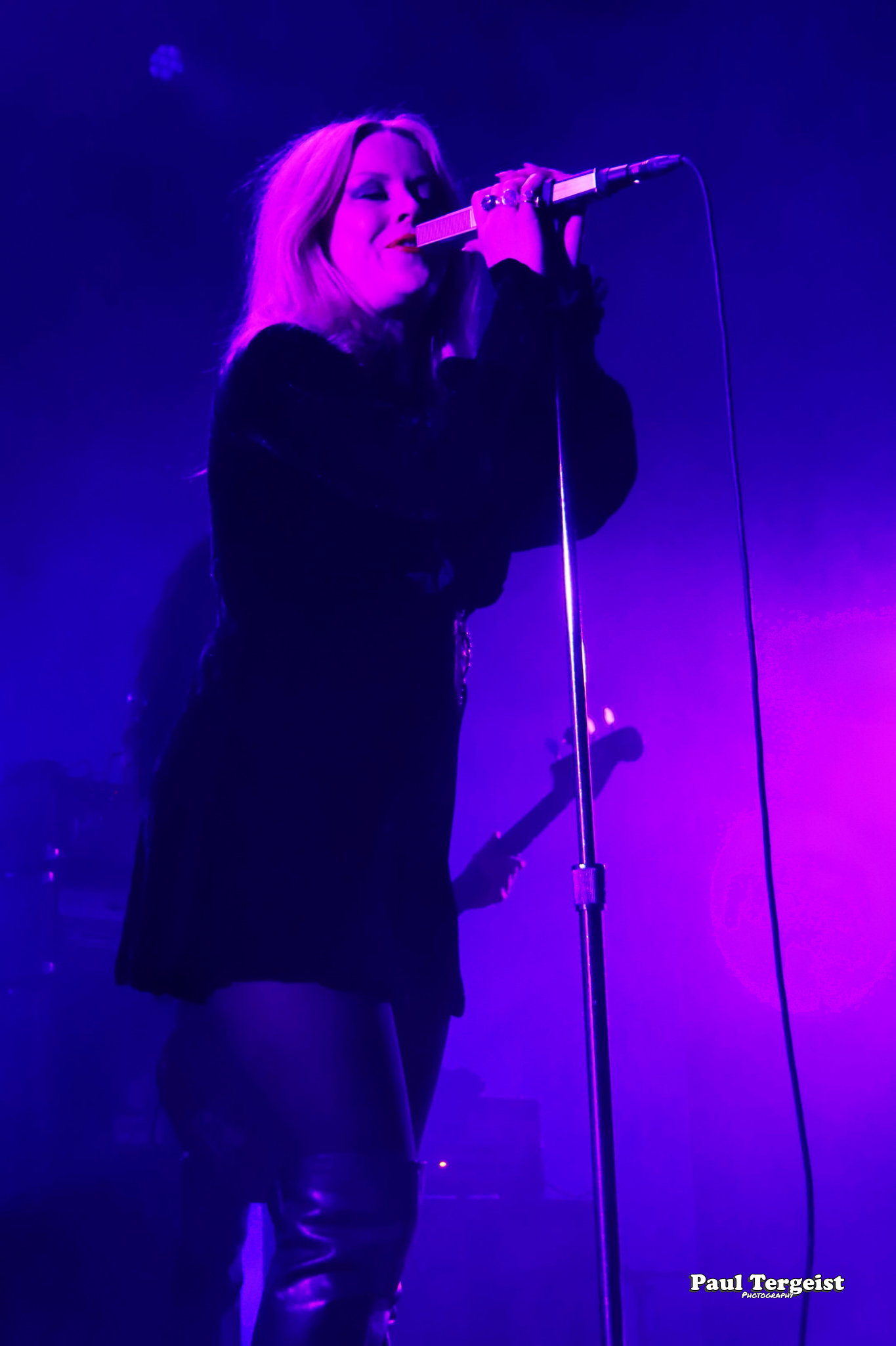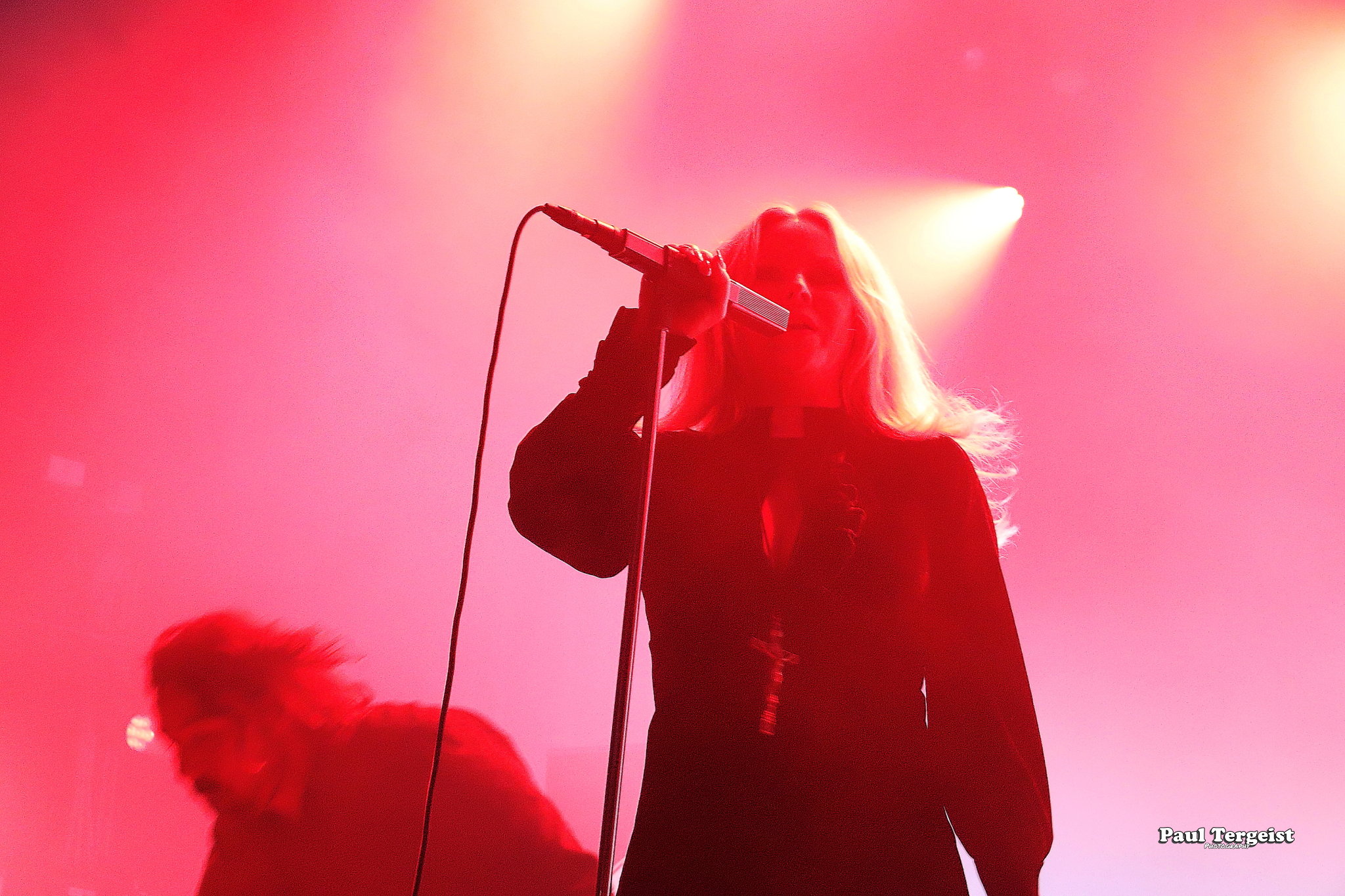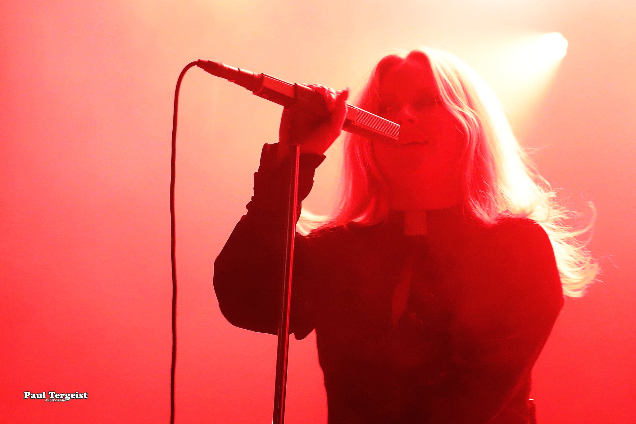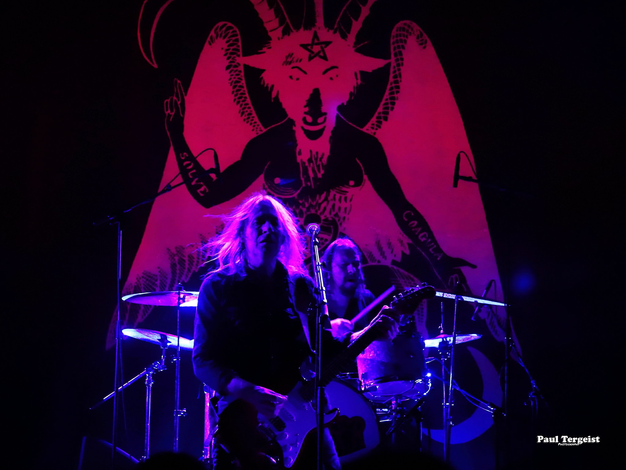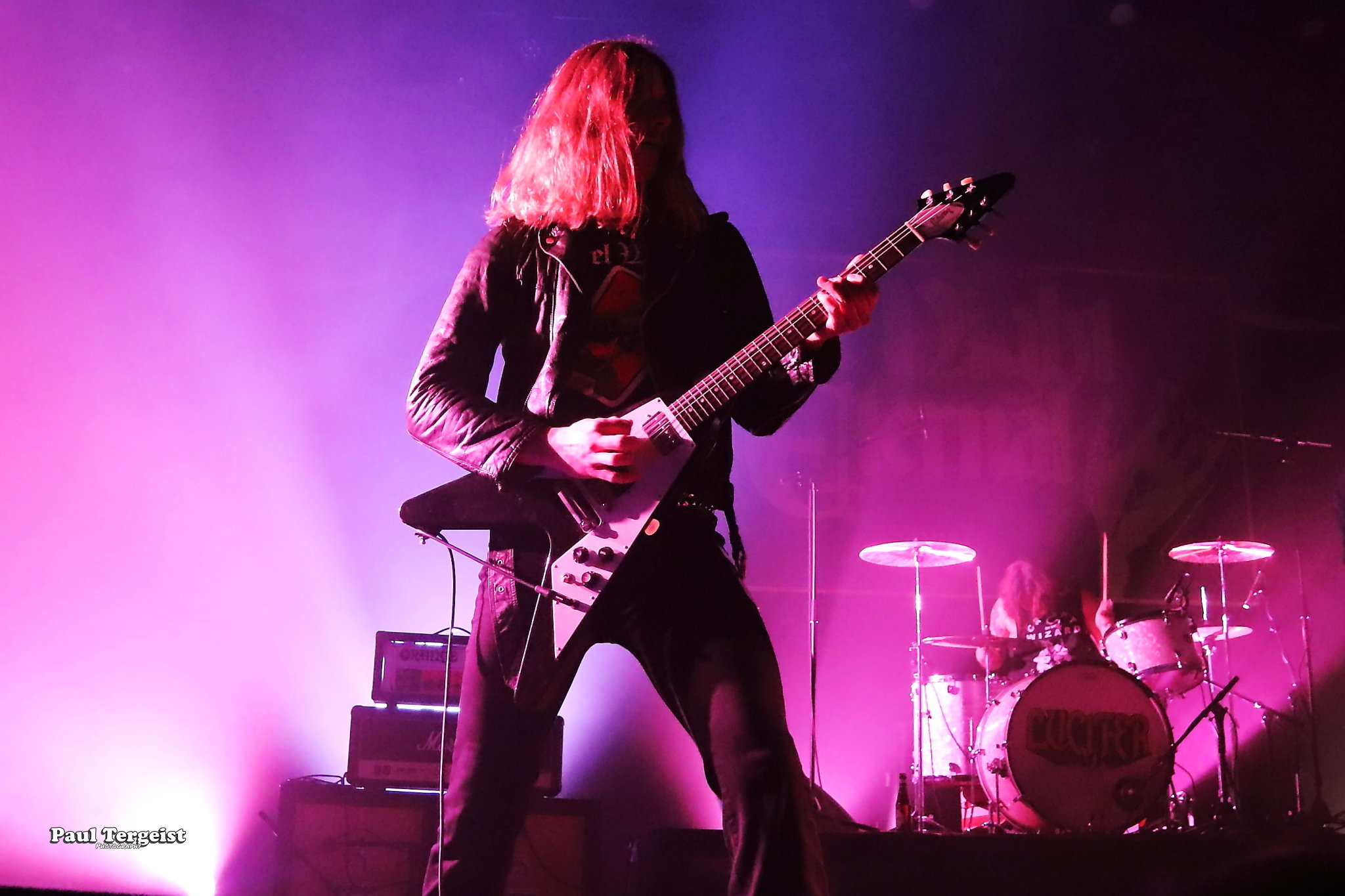 Juste avant l’entrée en scène de Lucifer, la tête d’affiche de cette tournée, se met en place un autre décor, bien plus simple cette fois-ci, composé d’un cercueil et de quelques bougies dans des verres ; simple, mais amplement suffisant à représenter sa direction artistique façon romantisme noir et qui s’assortit bien à l’introduction acoustique sur laquelle les musiciens entrent en scène avant d’embrayer sur Ghosts. Au cours des dix ans écoulés depuis sa formation à Berlin, le groupe mené par Johanna Platow Andersson a parcouru du chemin dans tous les sens de l’expression, entre son déménagement à Stockholm et la sortie de ses cinq albums tous éponymes, dont le dernier, paru à peine quelques semaines plus tôt, le 26 janvier, et déjà très bien reçu ; de quoi promettre un show empreint de la diversité et de l’expérience qui en découlent… Musiciens et chanteuse ont en tout cas tôt fait de démontrer que sur le second point, ils sont au top, en servant au public de La Vapeur un rock heavy et doom qui évoque les grands du genre Black Sabbath sur bien des aspects, comme la basse bien présente façon blues et la voix de Johanna Andersson plus mélodieuse qu’agressive et appuyée par des backing vocals solides assurés par les musiciens. Tout est très propre, carré et calibré… peut-être un peu trop, justement, et c’est là que le bât blesse. Si l’expérience de Lucifer se fait ressentir tout au long du set, la diversité manque à ce dernier, autant dans sa structure même que dans la gestuelle des musiciens, qui, l’une comme l’autre, semblent se contenter de suivre des patterns pré-établis. Parmi les plus notables, je pense aux quatre membres mobiles effectuant les mêmes déplacements en boucle, notamment Johanna qui ne cesse d’avancer et reculer, ainsi qu’à l’époux de cette dernière, Nicke Andersson, qui bat un tempo variant globalement autour du mid… Cela dit, la setlist a pour elle le mérite d’être très équilibrée, regroupant des morceaux issus de toute la discographie de Lucifer — hormis le premier album, laissé de côté —, tous interprétés avec la rigueur qui leur est due. Une bonne place est tout de même accordée aux extraits du petit dernier en date, Lucifer V, parmi lesquels le romantique et lancinant A Slow Dance in a Crypt, qui colle à l’ambiance du 14 février… À ce sujet, j’observe depuis le fond de la salle quelques spectateurs du premier rang danser en se tenant par l’épaule ; aucune agitation, en revanche, n’est à relever. Le public se montre, à l’image du show, plutôt calme et posé. Lorsque Lucifer s’éclipse après Bring Me His Head, ce n’est que pour mieux revenir sous les applaudissements pour un finale de trois titres qui se révèle être le moment le meilleur et le plus intéressant du show, où tout le monde en profite pour se lâcher et s’amuser une ultime fois avant de rentrer…