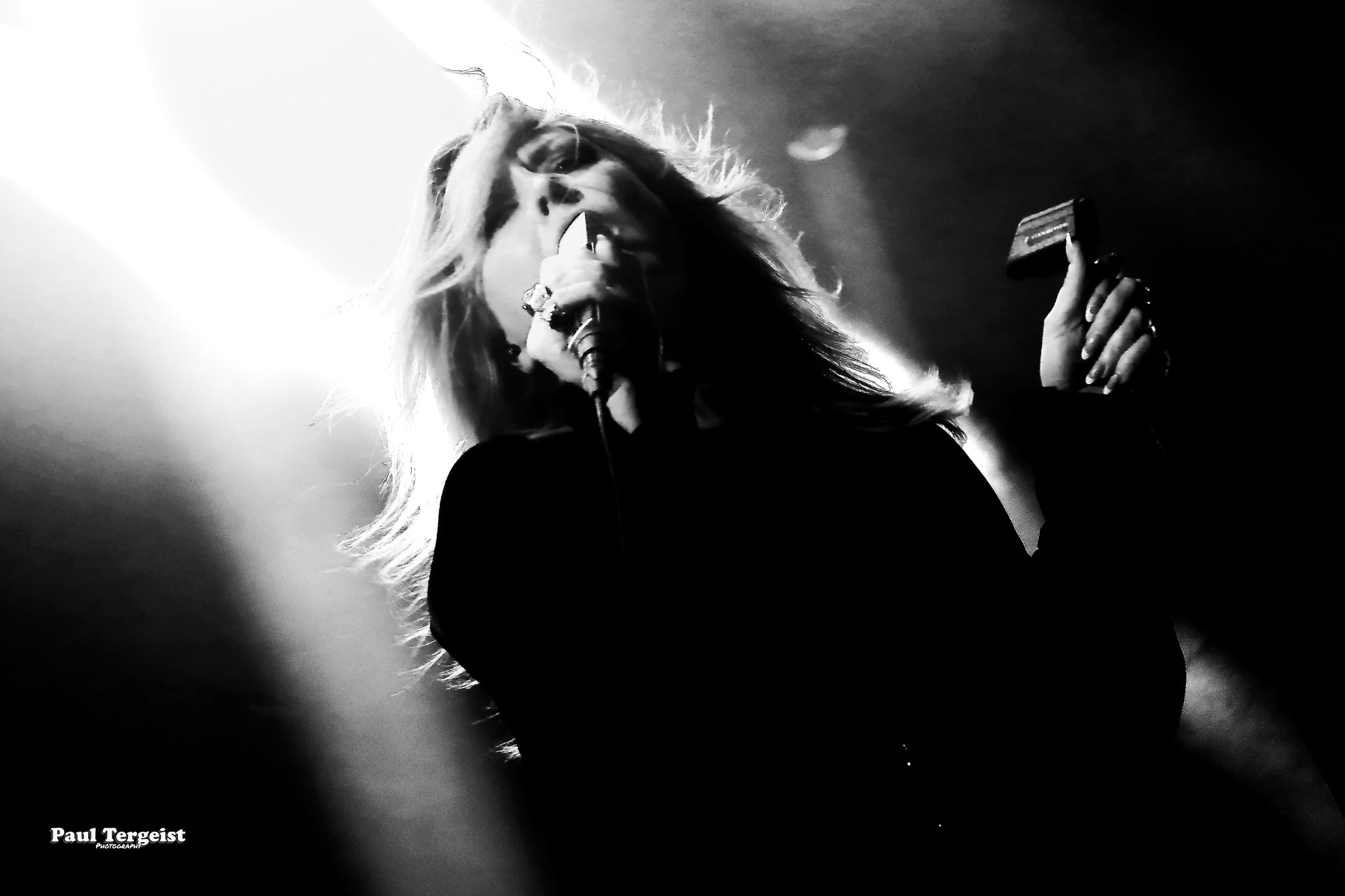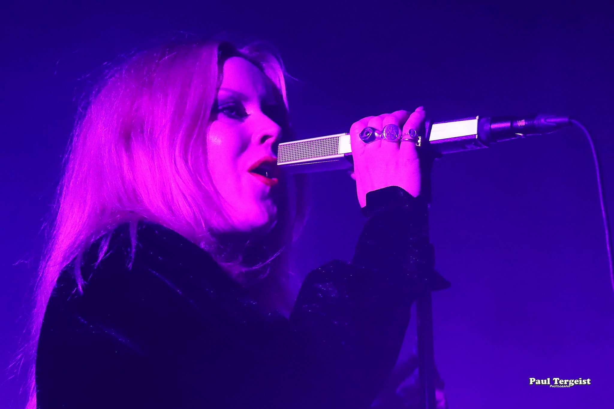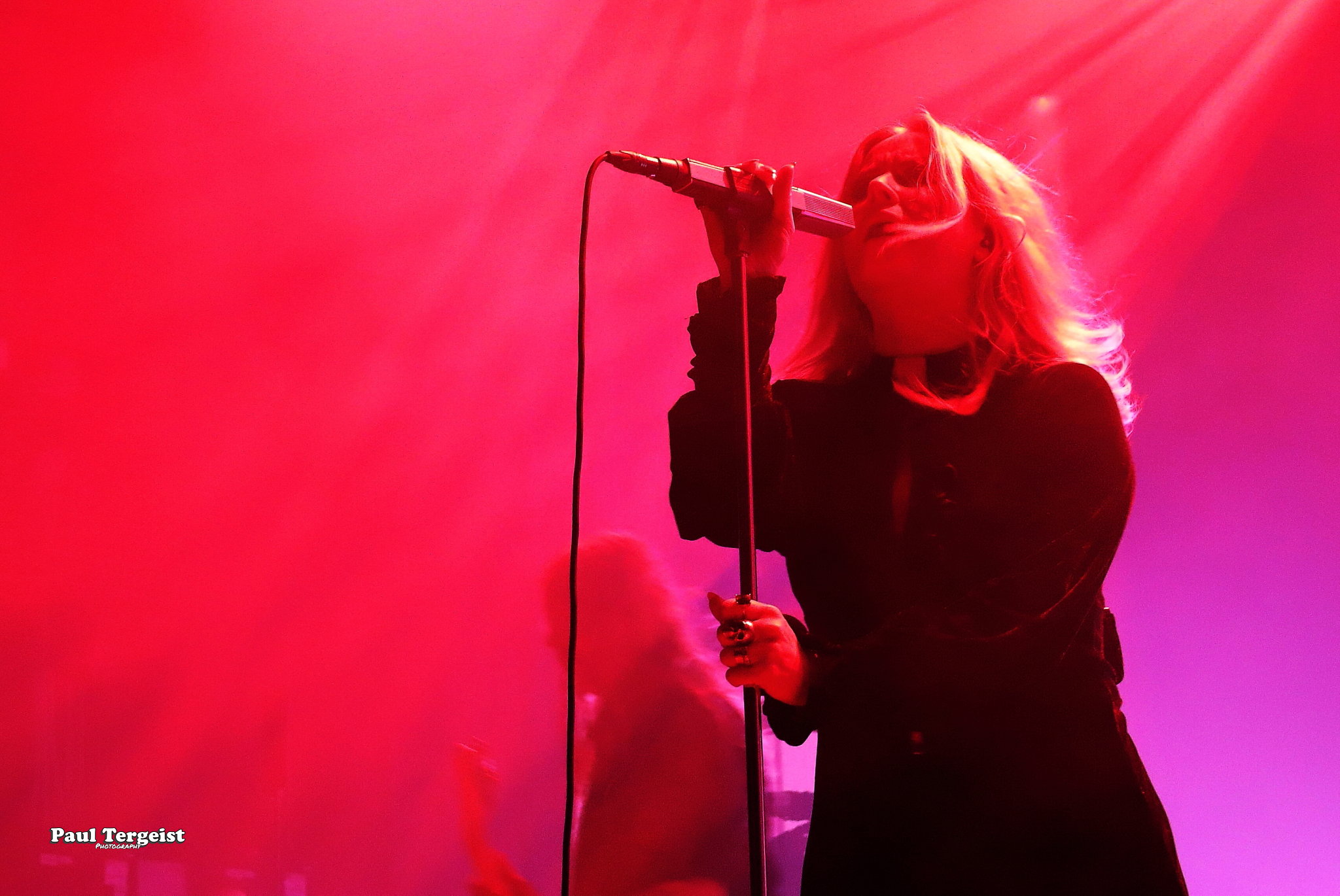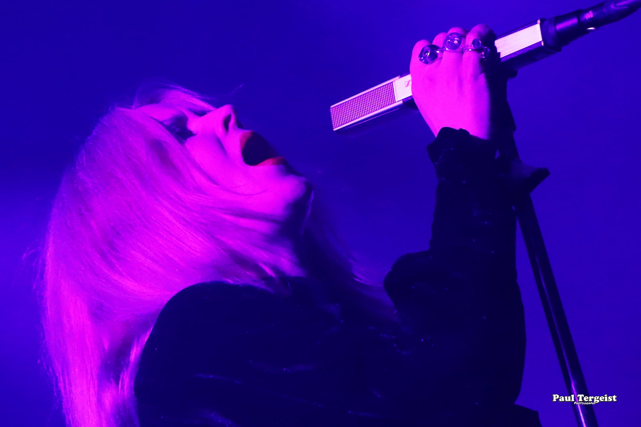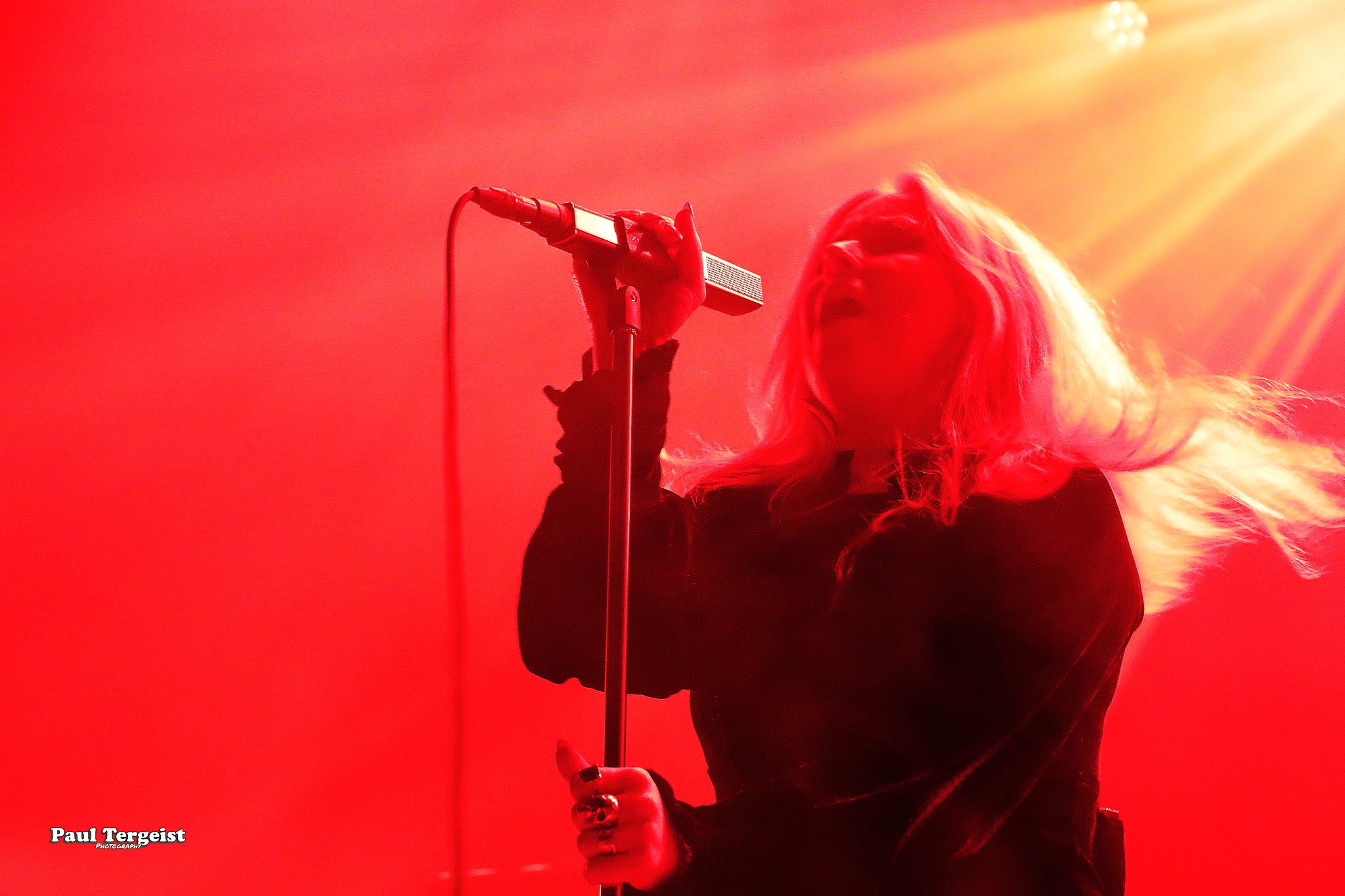 Juste avant l’entrée en scène de Lucifer, la tête d’affiche de cette tournée, se met en place un autre décor, bien plus simple cette fois-ci, composé d’un cercueil et de quelques bougies dans des verres ; simple, mais amplement suffisant à représenter sa direction artistique façon romantisme noir et qui s’assortit bien à l’introduction acoustique sur laquelle les musiciens entrent en scène avant d’embrayer sur Ghosts. Au cours des dix ans écoulés depuis sa formation à Berlin, le groupe mené par Johanna Platow Andersson a parcouru du chemin dans tous les sens de l’expression, entre son déménagement à Stockholm et la sortie de ses cinq albums tous éponymes, dont le dernier, paru à peine quelques semaines plus tôt, le 26 janvier, et déjà très bien reçu ; de quoi promettre un show empreint de la diversité et de l’expérience qui en découlent… Musiciens et chanteuse ont en tout cas tôt fait de démontrer que sur le second point, ils sont au top, en servant au public de La Vapeur un rock heavy et doom qui évoque les grands du genre Black Sabbath sur bien des aspects, comme la basse bien présente façon blues et la voix de Johanna Andersson plus mélodieuse qu’agressive et appuyée par des backing vocals solides assurés par les musiciens. Tout est très propre, carré et calibré… peut-être un peu trop, justement, et c’est là que le bât blesse. Si l’expérience de Lucifer se fait ressentir tout au long du set, la diversité manque à ce dernier, autant dans sa structure même que dans la gestuelle des musiciens, qui, l’une comme l’autre, semblent se contenter de suivre des patterns pré-établis. Parmi les plus notables, je pense aux quatre membres mobiles effectuant les mêmes déplacements en boucle, notamment Johanna qui ne cesse d’avancer et reculer, ainsi qu’à l’époux de cette dernière, Nicke Andersson, qui bat un tempo variant globalement autour du mid… Cela dit, la setlist a pour elle le mérite d’être très équilibrée, regroupant des morceaux issus de toute la discographie de Lucifer — hormis le premier album, laissé de côté —, tous interprétés avec la rigueur qui leur est due. Une bonne place est tout de même accordée aux extraits du petit dernier en date, Lucifer V, parmi lesquels le romantique et lancinant A Slow Dance in a Crypt, qui colle à l’ambiance du 14 février… À ce sujet, j’observe depuis le fond de la salle quelques spectateurs du premier rang danser en se tenant par l’épaule ; aucune agitation, en revanche, n’est à relever. Le public se montre, à l’image du show, plutôt calme et posé. Lorsque Lucifer s’éclipse après Bring Me His Head, ce n’est que pour mieux revenir sous les applaudissements pour un finale de trois titres qui se révèle être le moment le meilleur et le plus intéressant du show, où tout le monde en profite pour se lâcher et s’amuser une ultime fois avant de rentrer…
