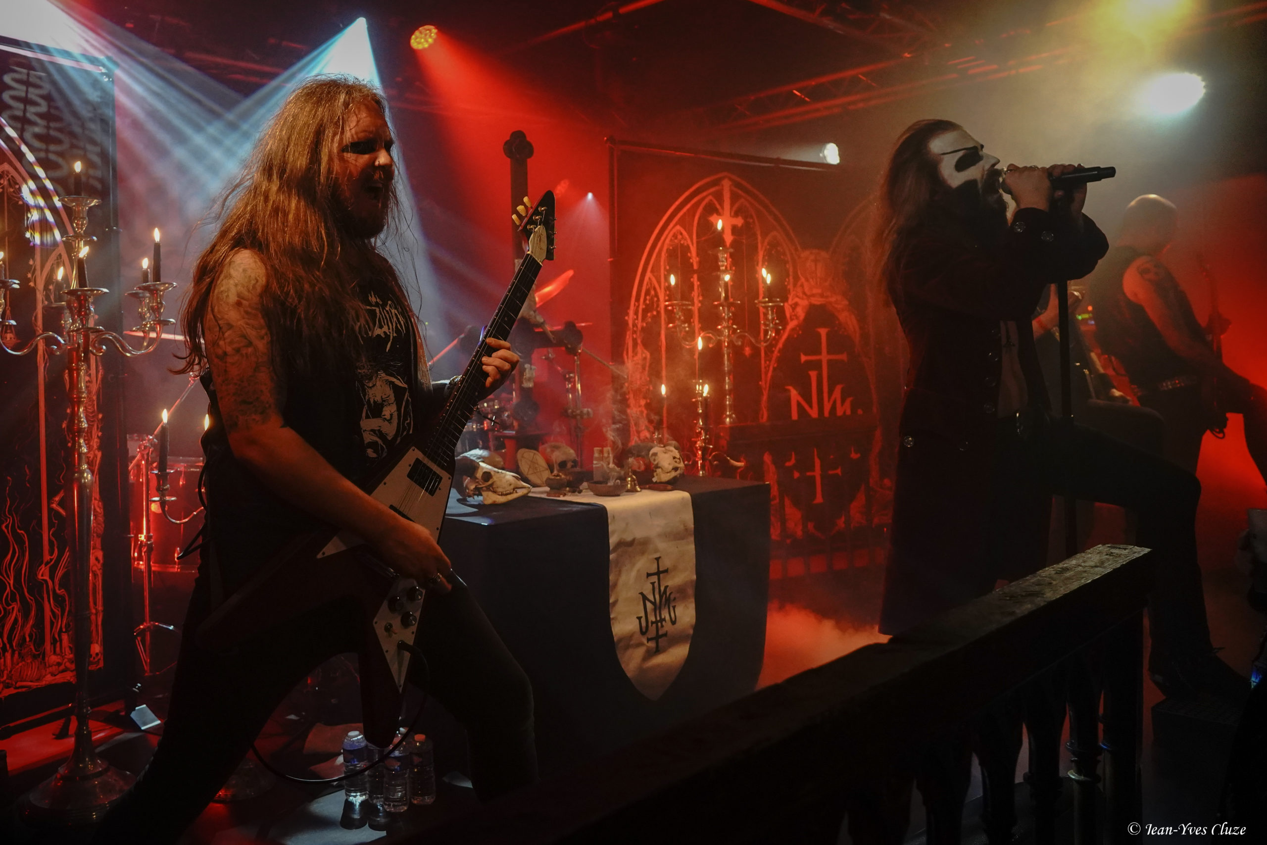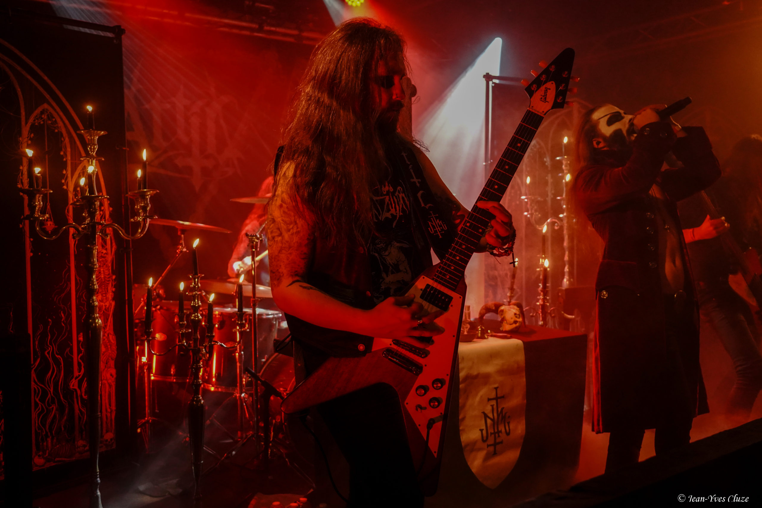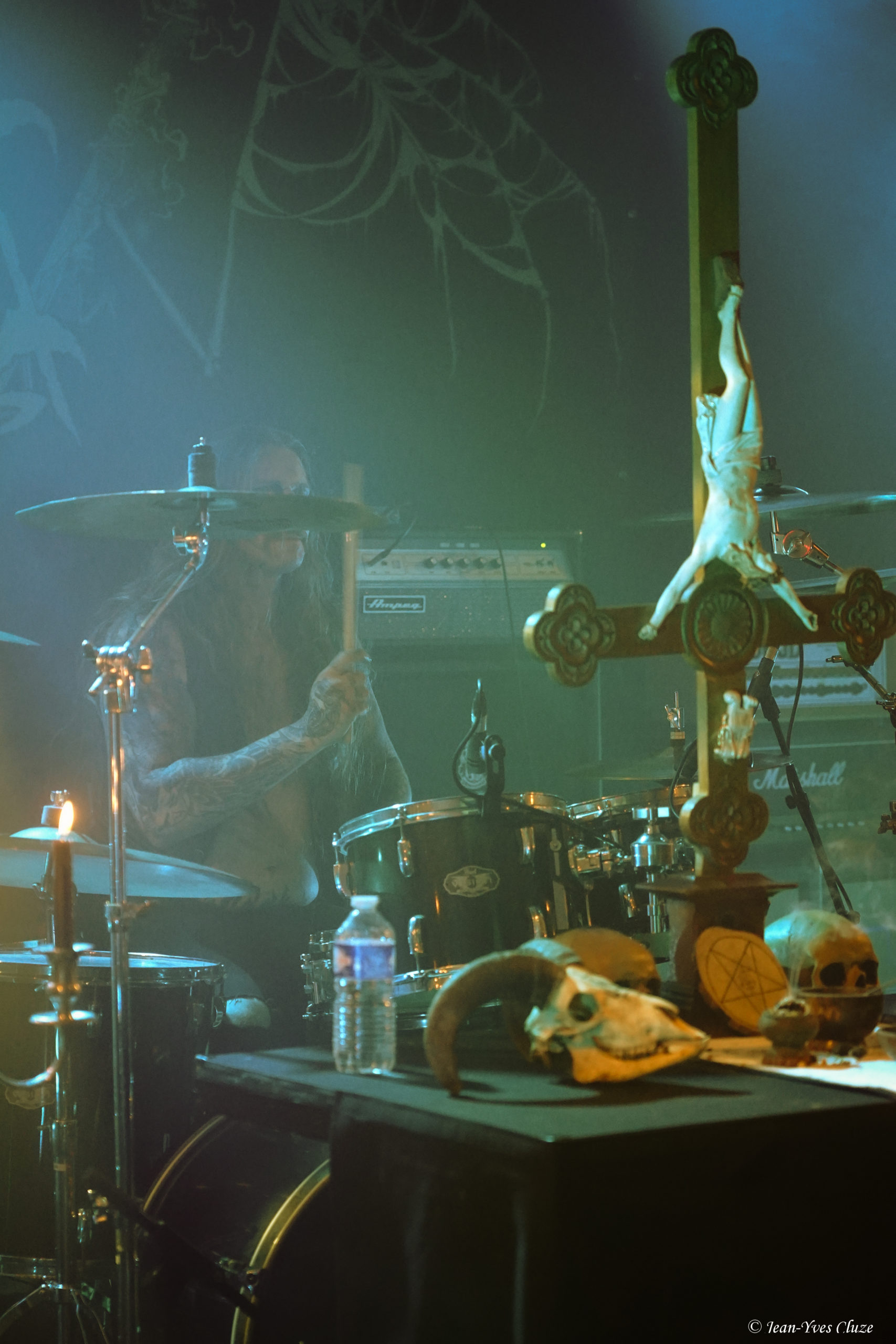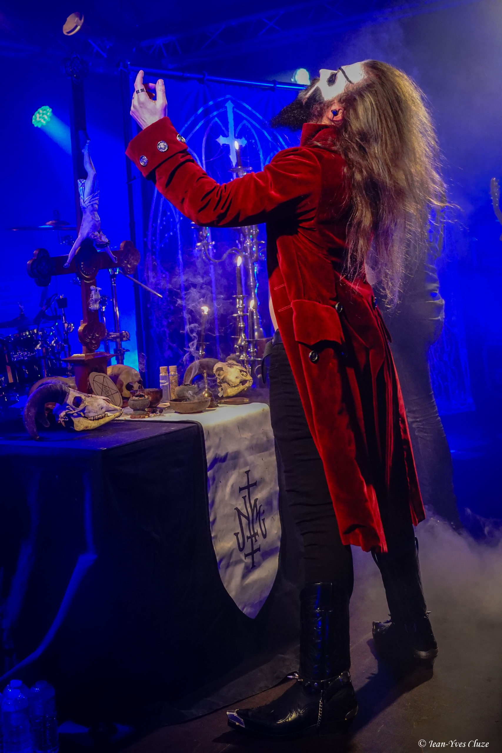 À défaut de quitter la scène dans l’immédiat, les membres de The Night Eternal — entre autres Ricardo, qui trouve là un nouveau moyen de canaliser son énergie débordante — rangent leur matériel tout en aidant ceux d’Attic avec le leur ; une aide loin d’être malvenue au vu du nombre d’éléments de décor à mettre en place et de bougies à allumer. Ainsi, lorsque le groupe arrive sur une scène à peine éclairée par ces dernières et quelques spotlights sur fond de l’intro instrumentale The Covenant, l’ambiance est telle que l’on se croirait dans un concert de Behemoth ou de Corpus Diavolis — impression d’autant plus renforcée par l’élégante veste de velours rouge qu’arbore le frontman Meister Cagliostro. D’un point de vue musical, nous sommes toutefois bien loin du rythme lancinant des cantiques sataniques du groupe black metal marseillais. Les cinq hommes fardés de blanc et aux yeux maquillés de noir offrent au public de La Vapeur une musique aussi contrastée que leur maquillage, dont les riffs entraînants et la rythmique galopante qui semblent tout droit sortis d’un album d’Helloween côtoient les longues durées des morceaux et les effets de reverb marqués à l’excès sur le micro et les guitares faisant l’effet de l’acoustique d’une église, issus du « funeral » qu’ils accolent au nom du groupe sur les réseaux sociaux. Le mélange fonctionne à la fois du tonnerre de Dieu et du feu du diable ; l’on comprend alors l’utilité de l’extincteur qu’une membre de Phoenix Rising a sorti de derrière une porte au préalable ! Ces mêmes feu et tonnerre circulent en tout cas dans les veines des cinq membres d’Attic, tous possédés par une performance endiablée et interagissant autant avec le décor que l’auditoire. Les deux guitaristes, Tim « Katte » Katteluhn et Max Povver, aiment notamment beaucoup prendre de la hauteur sur les coffres à l’avant de la scène, surtout le second. Meister Cagliostro, lui, fait montre d’autant de verve dans ses modulations vocales façon voix de fausset que dans ses interactions, notamment lorsqu’il fait vivement interrompre une piste audio lancée par erreur avant Return of the Witchfinder. Du côté du public, le courant circule aussi, et les plus déchaînés se permettent quelques blagues dont je ne me permettrai pas de juger le goût, les uns en entonnant du Rammstein en chœur pour la référence allemande, un autre en hurlant « Sataaaaaaaaaaan ! » à pleins poumons… Encore une fois, le show se déroule à vitesse grand V, jusqu’à ce que la piste audio The Hidden Grave soit relancée pour annoncer les deux derniers titres, Funeral in the Woods et The Headless Horseman, pour un finale magistral !