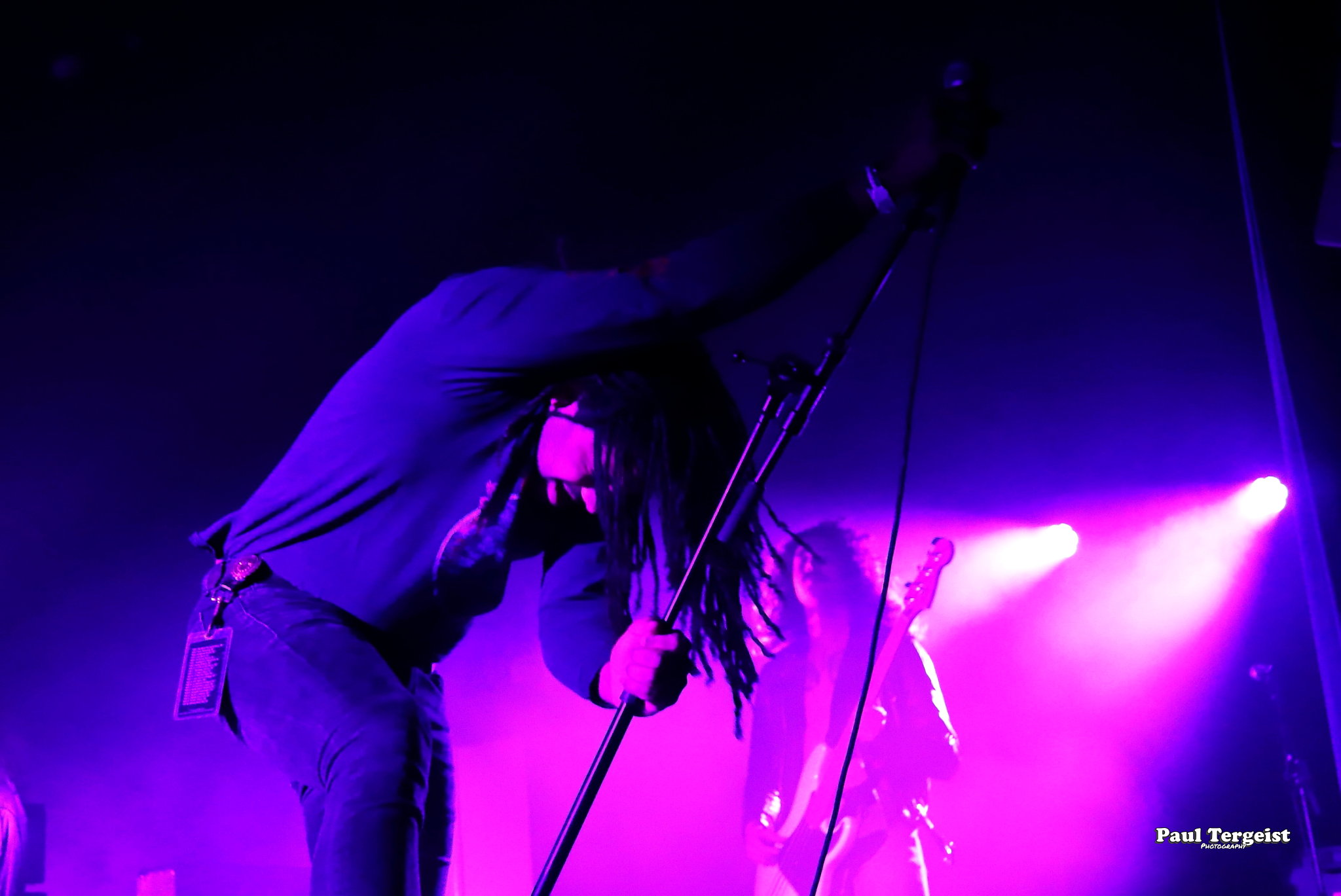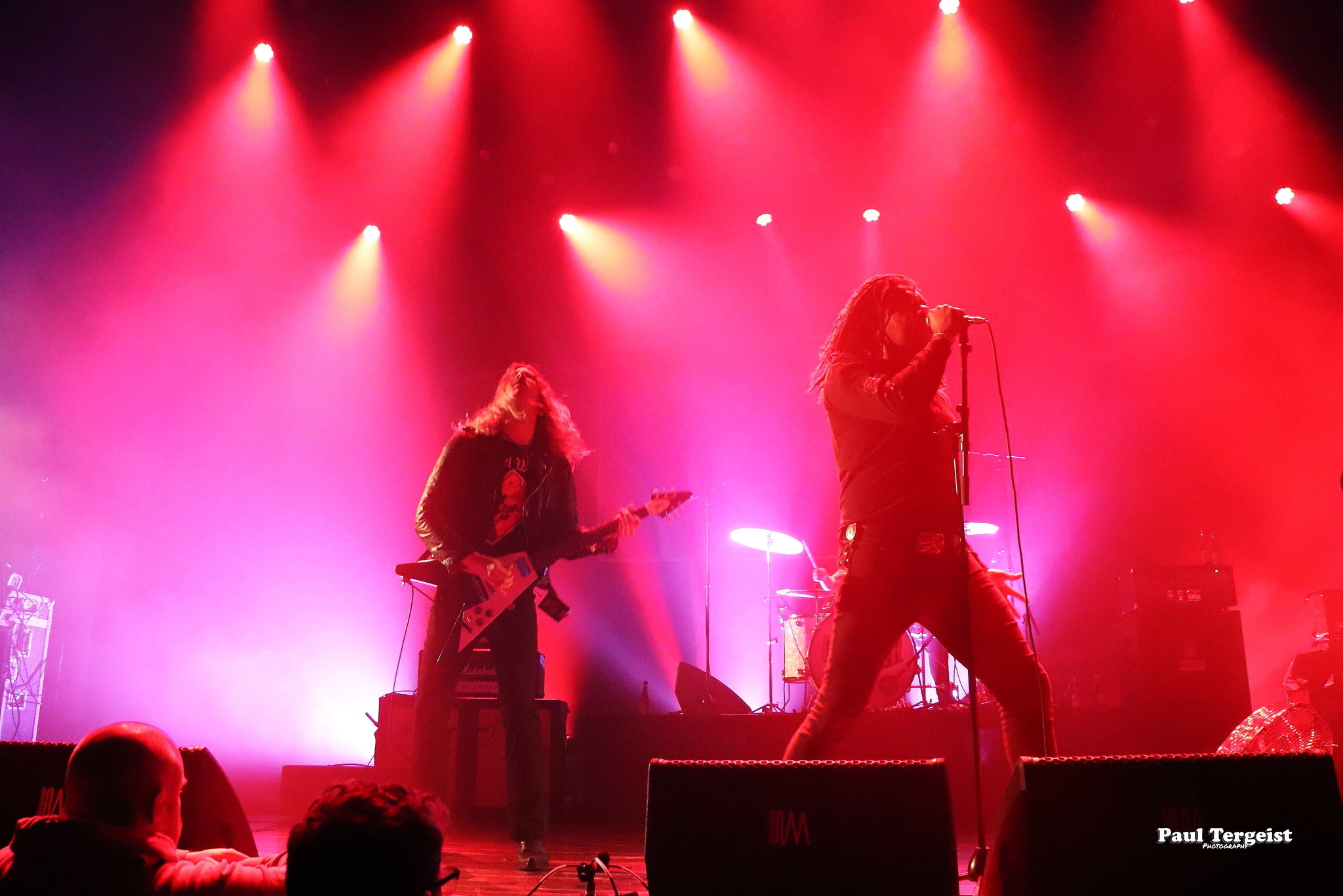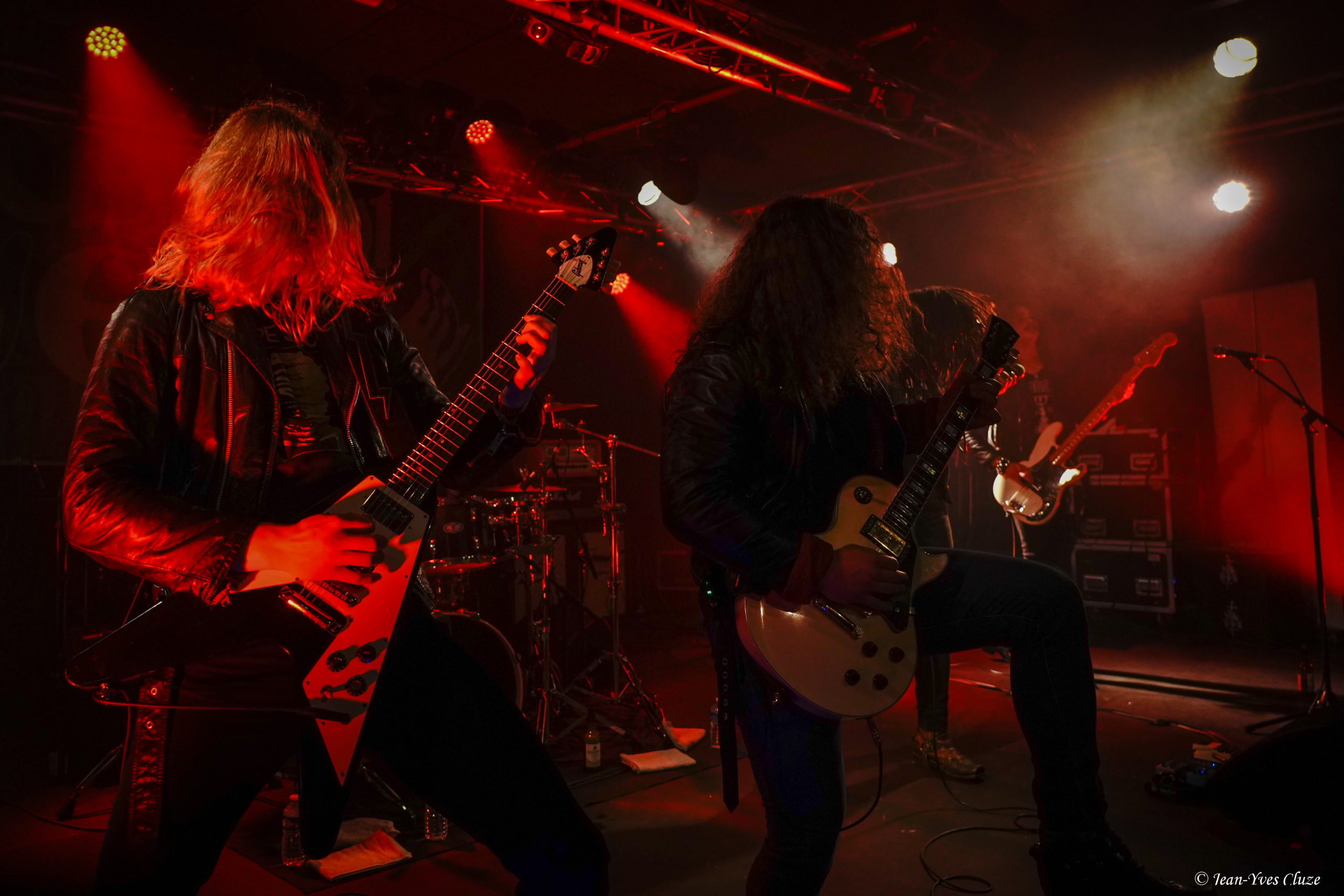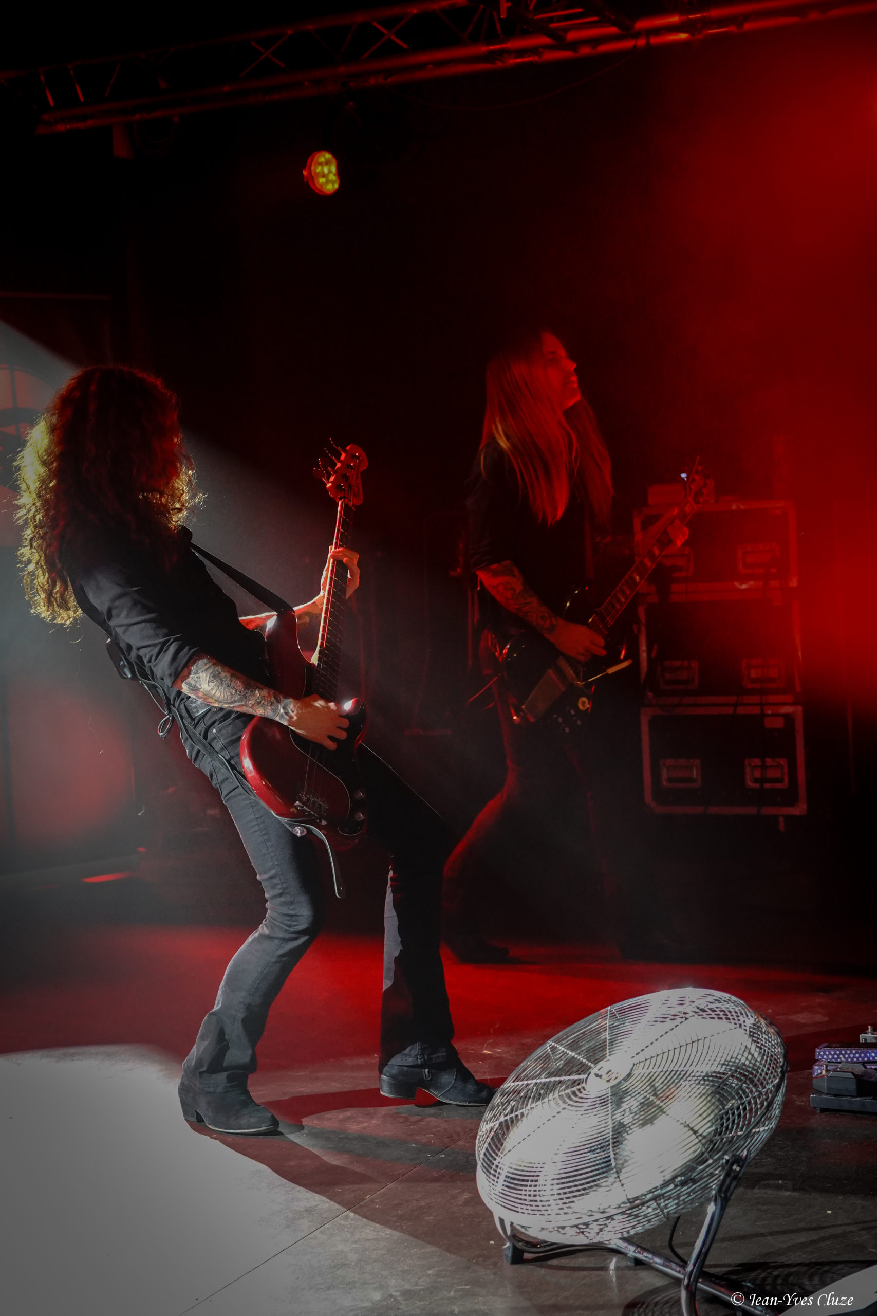 Ne connaissant rien de The Night Eternal, nous démarrons la soirée curieux de voir ce que ce jeune groupe a à offrir. Pour le moment, l’heure n’est en tout cas pas aux excentricités scéniques, puisque c’est munis de leurs seuls look du quotidien et instruments que les cinq Allemands débarquent sur scène. Bien loin de la noirceur que son nom laisse imaginer, le groupe joue une musique haute en couleur, faite d’un mélange de riffs péchus et de nombreuses mélodies, ainsi que d’une rythmique prenante, mais aussi teintée de la bonne humeur et de l’énergie électrisante de ses interprètes. Le rythme dans la peau, ils ne tiennent pas une seconde en place et manifestent leur joie d’être présents à grand renfort de secousses de tête dans tous les sens et de sourires jusqu’à la moustache que tous les cinq arborent non sans fierté telle une signature. Jannik Stüber, intégré très récemment en tant que bassiste de live, se balade au sens propre comme au figuré en dépit de cette petite expérience, tandis que les guitaristes Henry Käseberg et Rob Richter déclament les paroles des refrains en surarticulant tels des choristes sans micro tout en passant faire un coucou à leur collègue batteur Aleister Präkelt de temps à autre. Parmi eux, Rob Richter révèle, en plus de l’excellence de son jeu de guitare lead, celle de son claqué de talon… Celui qui se distingue par sa fougue et son impétuosité reste tout de même le frontman Ricardo Baum. Par-delà son allure de fan de reggae à dreads, le jeune chanteur dévoile une personnalité pleine de fougue présente dans son jeu scénique que dans sa voix au timbre particulier, pas forcément attendu dans ce style musical et parfois criard, tout cela apportant un petit grain de folie qui contribue à la fraîcheur de l’ensemble. The Night Eternal investit chaque minute et seconde de la courte demi-heure de set qui lui est accordée pour consacrer son culte aux figures ténébreuses d’ici et d’au-delà, qui prend lors du troisième morceau la forme d’un vibrant hommage à Ozzy Osbourne sous le titre Prince of Darkness. Une demi-heure de set qui passe ainsi comme une lettre à la poste — bien qu’un peu entachée par le son grésillant de la guitare rythmique — ; un peu trop vite au goût de spectateurs excités comme des puces qui en redemandent ! De quoi donner envie de découvrir les deux albums du groupe, et ceux à venir…