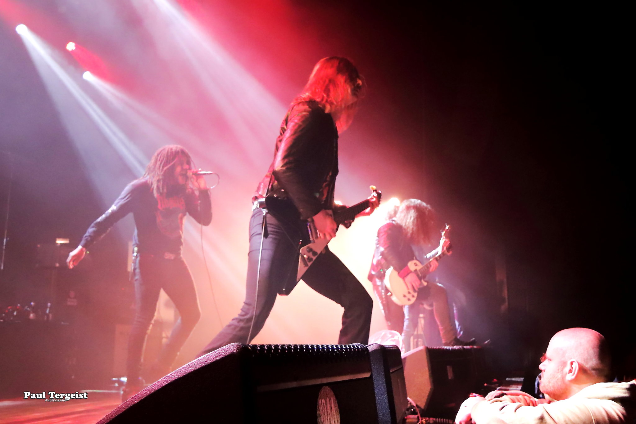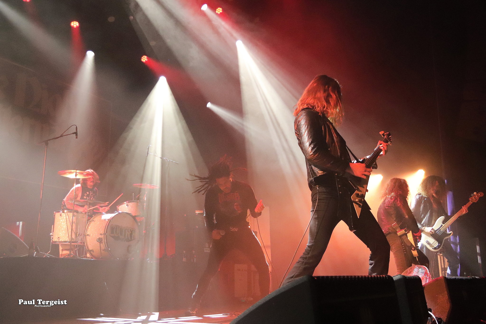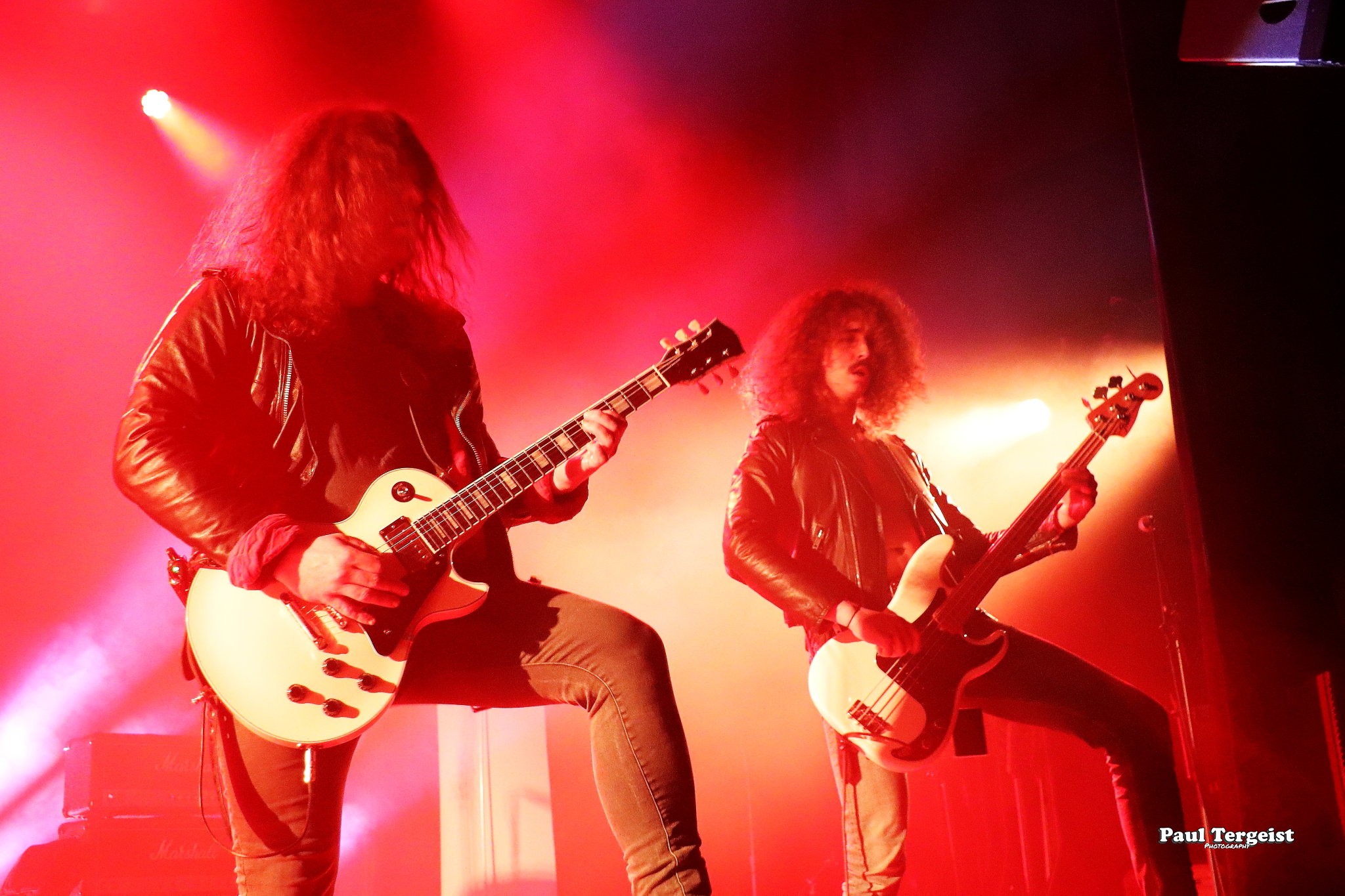 Ne connaissant rien de The Night Eternal, nous démarrons la soirée curieux de voir ce que ce jeune groupe a à offrir. Pour le moment, l’heure n’est en tout cas pas aux excentricités scéniques, puisque c’est munis de leurs seuls look du quotidien et instruments que les cinq Allemands débarquent sur scène. Bien loin de la noirceur que son nom laisse imaginer, le groupe joue une musique haute en couleur, faite d’un mélange de riffs péchus et de nombreuses mélodies, ainsi que d’une rythmique prenante, mais aussi teintée de la bonne humeur et de l’énergie électrisante de ses interprètes. Le rythme dans la peau, ils ne tiennent pas une seconde en place et manifestent leur joie d’être présents à grand renfort de secousses de tête dans tous les sens et de sourires jusqu’à la moustache que tous les cinq arborent non sans fierté telle une signature. Jannik Stüber, intégré très récemment en tant que bassiste de live, se balade au sens propre comme au figuré en dépit de cette petite expérience, tandis que les guitaristes Henry Käseberg et Rob Richter déclament les paroles des refrains en surarticulant tels des choristes sans micro tout en passant faire un coucou à leur collègue batteur Aleister Präkelt de temps à autre. Parmi eux, Rob Richter révèle, en plus de l’excellence de son jeu de guitare lead, celle de son claqué de talon… Celui qui se distingue par sa fougue et son impétuosité reste tout de même le frontman Ricardo Baum. Par-delà son allure de fan de reggae à dreads, le jeune chanteur dévoile une personnalité pleine de fougue présente dans son jeu scénique que dans sa voix au timbre particulier, pas forcément attendu dans ce style musical et parfois criard, tout cela apportant un petit grain de folie qui contribue à la fraîcheur de l’ensemble. The Night Eternal investit chaque minute et seconde de la courte demi-heure de set qui lui est accordée pour consacrer son culte aux figures ténébreuses d’ici et d’au-delà, qui prend lors du troisième morceau la forme d’un vibrant hommage à Ozzy Osbourne sous le titre Prince of Darkness. Une demi-heure de set qui passe ainsi comme une lettre à la poste — bien qu’un peu entachée par le son grésillant de la guitare rythmique — ; un peu trop vite au goût de spectateurs excités comme des puces qui en redemandent ! De quoi donner envie de découvrir les deux albums du groupe, et ceux à venir…
