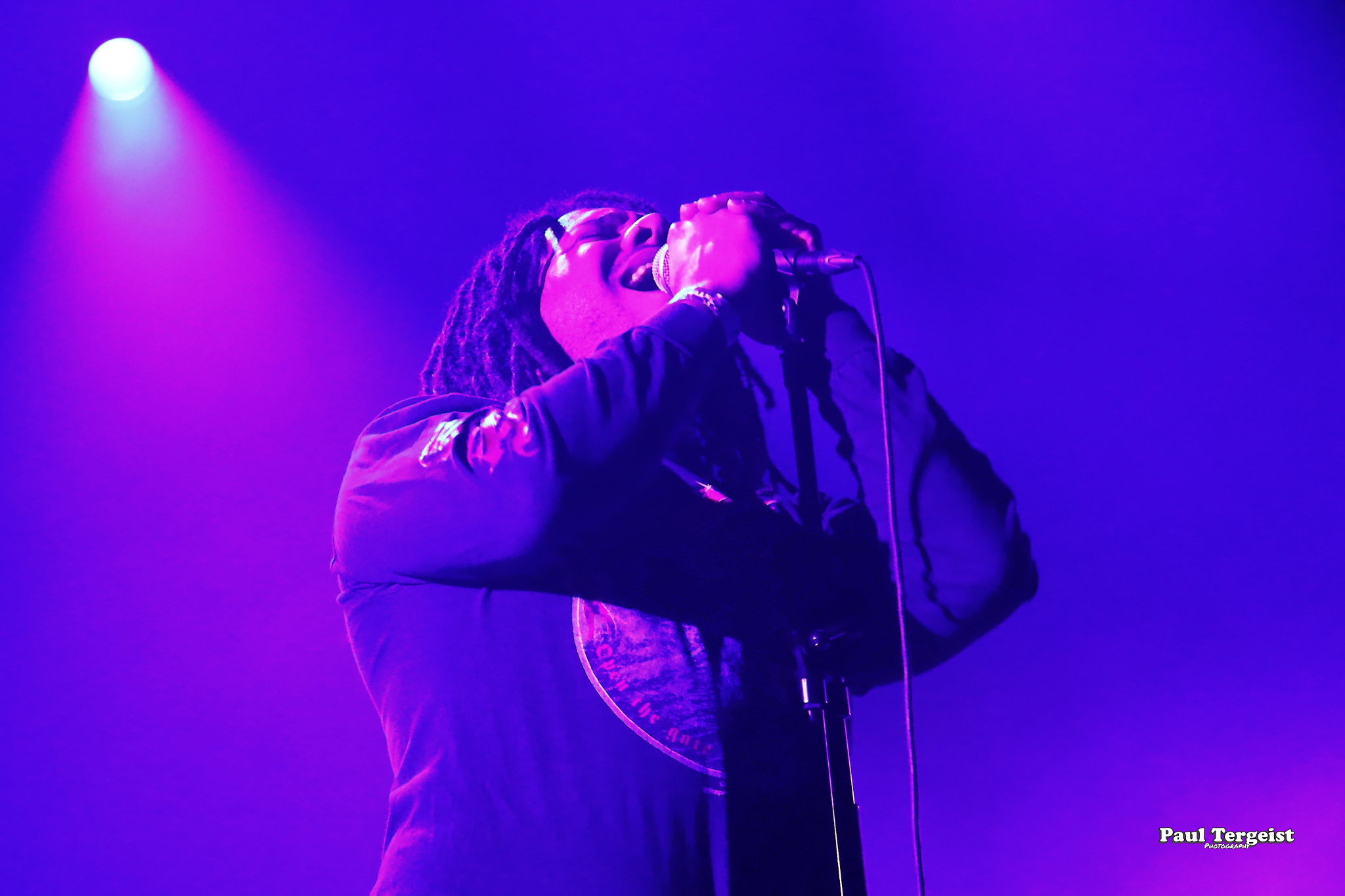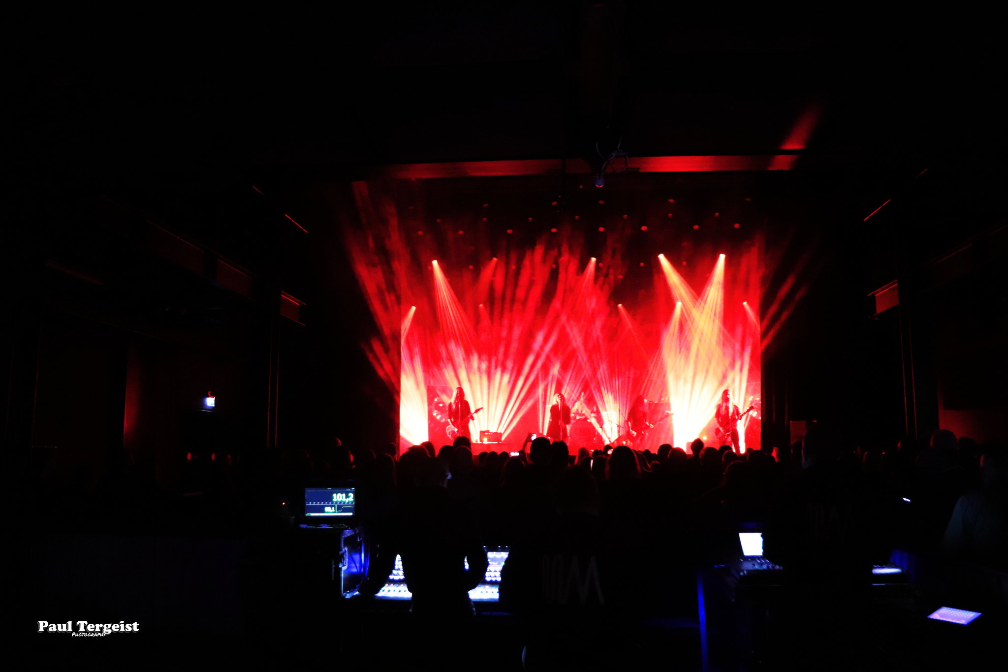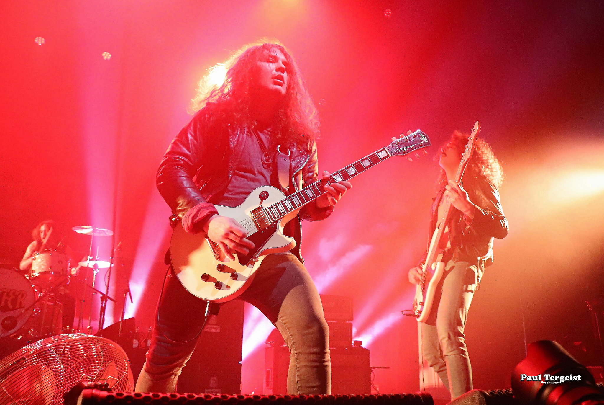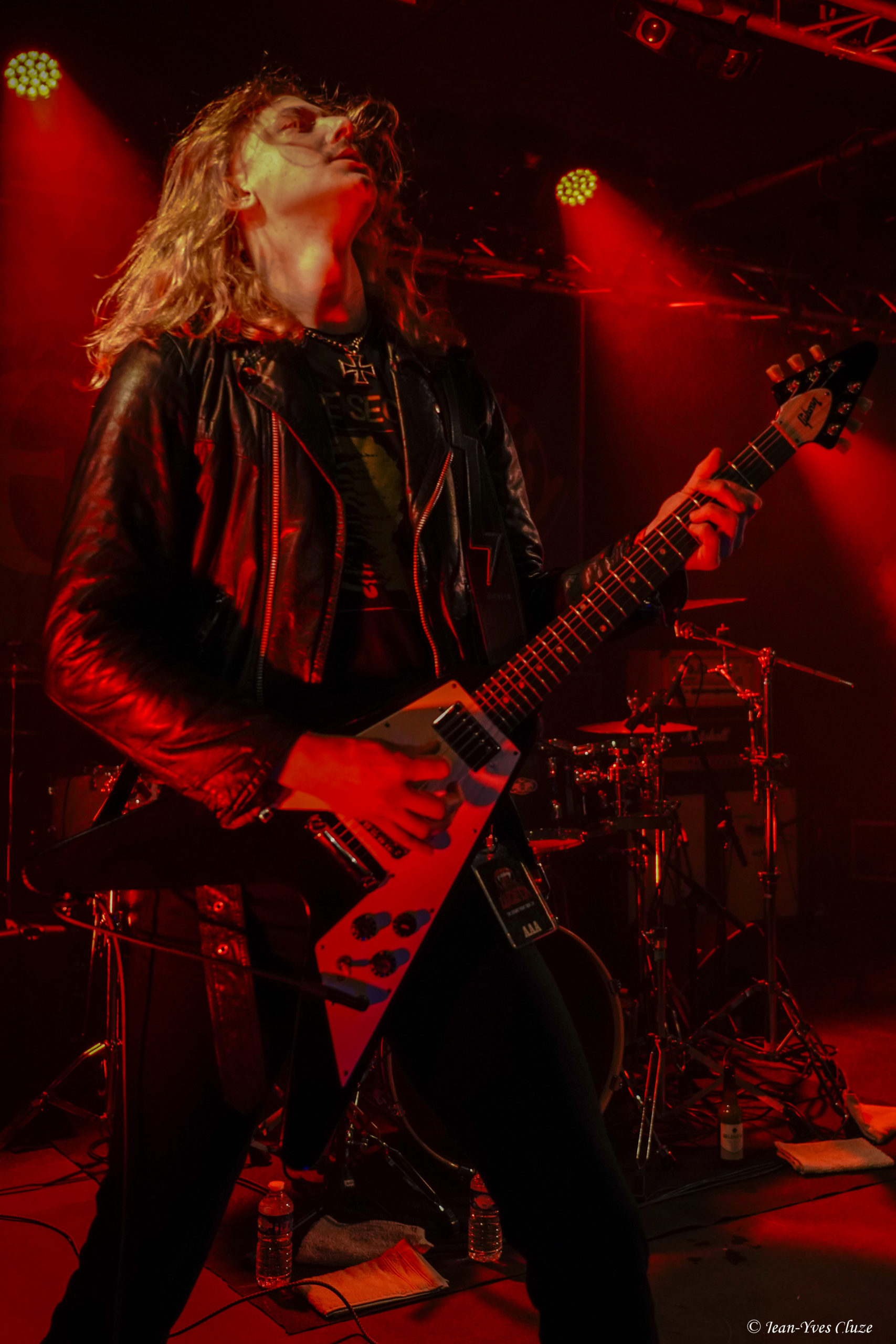 Ne connaissant rien de The Night Eternal, nous démarrons la soirée curieux de voir ce que ce jeune groupe a à offrir. Pour le moment, l’heure n’est en tout cas pas aux excentricités scéniques, puisque c’est munis de leurs seuls look du quotidien et instruments que les cinq Allemands débarquent sur scène. Bien loin de la noirceur que son nom laisse imaginer, le groupe joue une musique haute en couleur, faite d’un mélange de riffs péchus et de nombreuses mélodies, ainsi que d’une rythmique prenante, mais aussi teintée de la bonne humeur et de l’énergie électrisante de ses interprètes. Le rythme dans la peau, ils ne tiennent pas une seconde en place et manifestent leur joie d’être présents à grand renfort de secousses de tête dans tous les sens et de sourires jusqu’à la moustache que tous les cinq arborent non sans fierté telle une signature. Jannik Stüber, intégré très récemment en tant que bassiste de live, se balade au sens propre comme au figuré en dépit de cette petite expérience, tandis que les guitaristes Henry Käseberg et Rob Richter déclament les paroles des refrains en surarticulant tels des choristes sans micro tout en passant faire un coucou à leur collègue batteur Aleister Präkelt de temps à autre. Parmi eux, Rob Richter révèle, en plus de l’excellence de son jeu de guitare lead, celle de son claqué de talon… Celui qui se distingue par sa fougue et son impétuosité reste tout de même le frontman Ricardo Baum. Par-delà son allure de fan de reggae à dreads, le jeune chanteur dévoile une personnalité pleine de fougue présente dans son jeu scénique que dans sa voix au timbre particulier, pas forcément attendu dans ce style musical et parfois criard, tout cela apportant un petit grain de folie qui contribue à la fraîcheur de l’ensemble. The Night Eternal investit chaque minute et seconde de la courte demi-heure de set qui lui est accordée pour consacrer son culte aux figures ténébreuses d’ici et d’au-delà, qui prend lors du troisième morceau la forme d’un vibrant hommage à Ozzy Osbourne sous le titre Prince of Darkness. Une demi-heure de set qui passe ainsi comme une lettre à la poste — bien qu’un peu entachée par le son grésillant de la guitare rythmique — ; un peu trop vite au goût de spectateurs excités comme des puces qui en redemandent ! De quoi donner envie de découvrir les deux albums du groupe, et ceux à venir…
