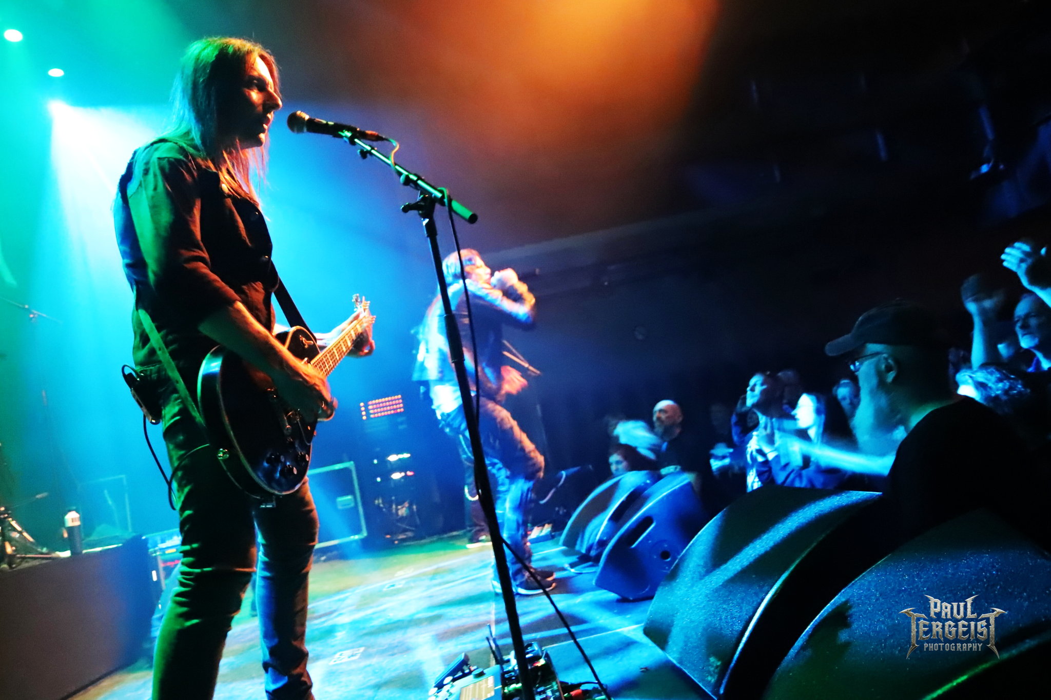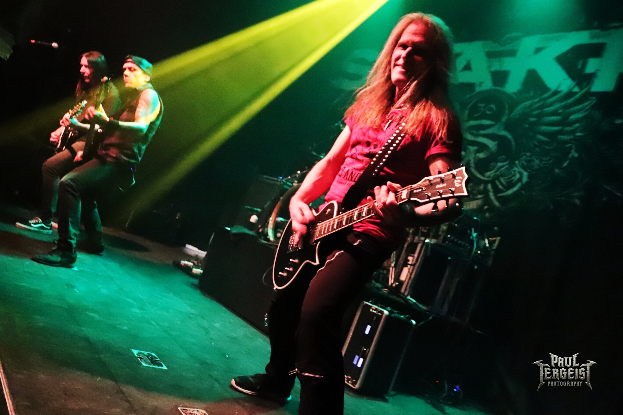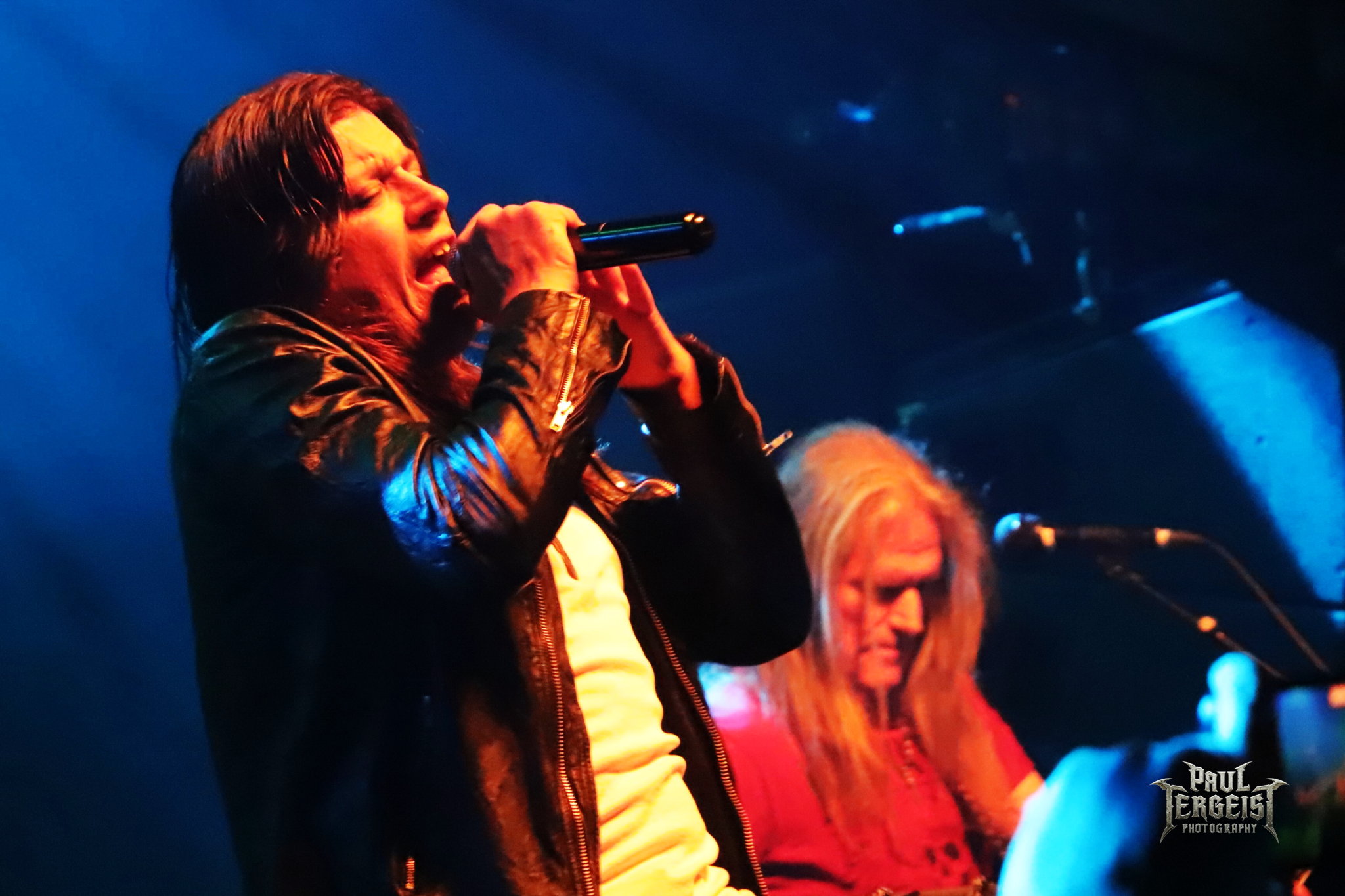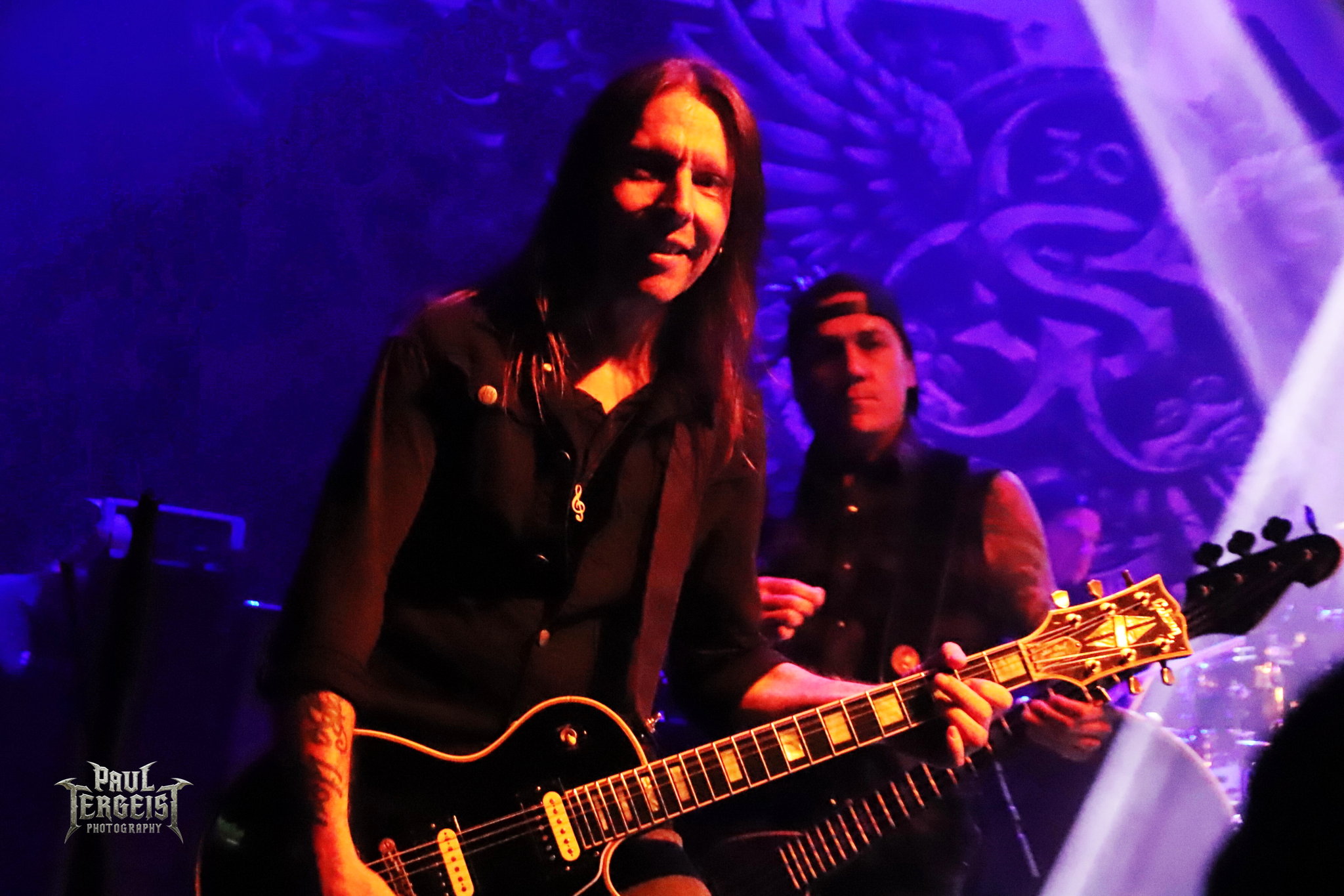 Mark Fox s’adresse au public après le troisième titre, mais chacune de ses interventions se fera en allemand. Certes, nous ne sommes pas loin de la frontière germano-néerlandaise et les spectateurs sont peut-être majoritairement allemands, alors tant pis pour les autres. Mais nous comprendrons quand même — bien que nous le sachions déjà, et le backdrop l’indique aussi —, que le groupe célèbre ses trente ans. Mark annonce le prochain titre et la machine repart de plus belle.
