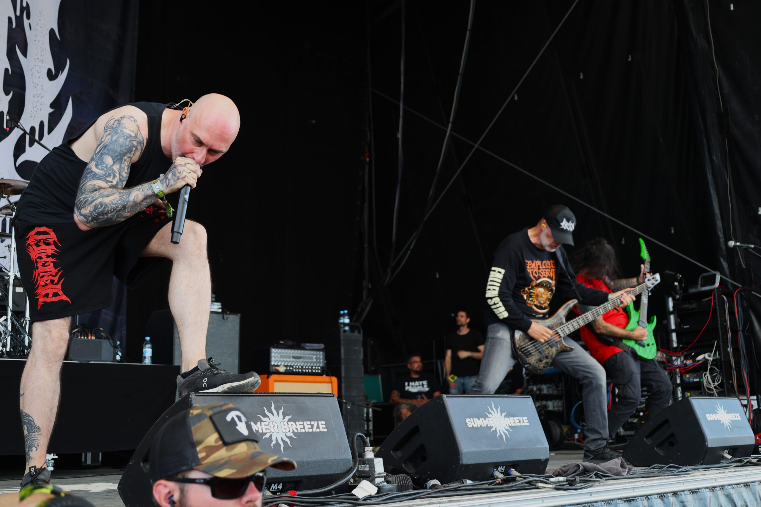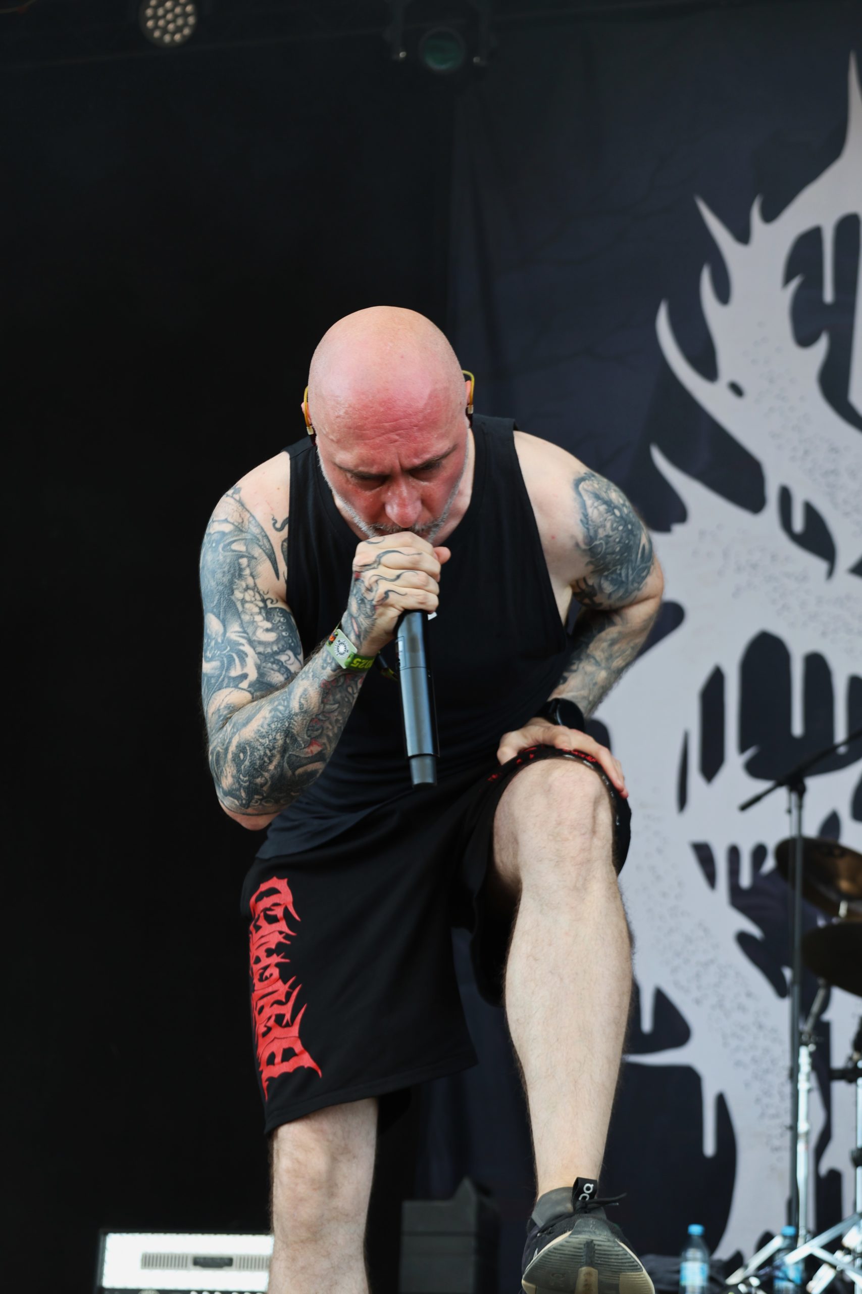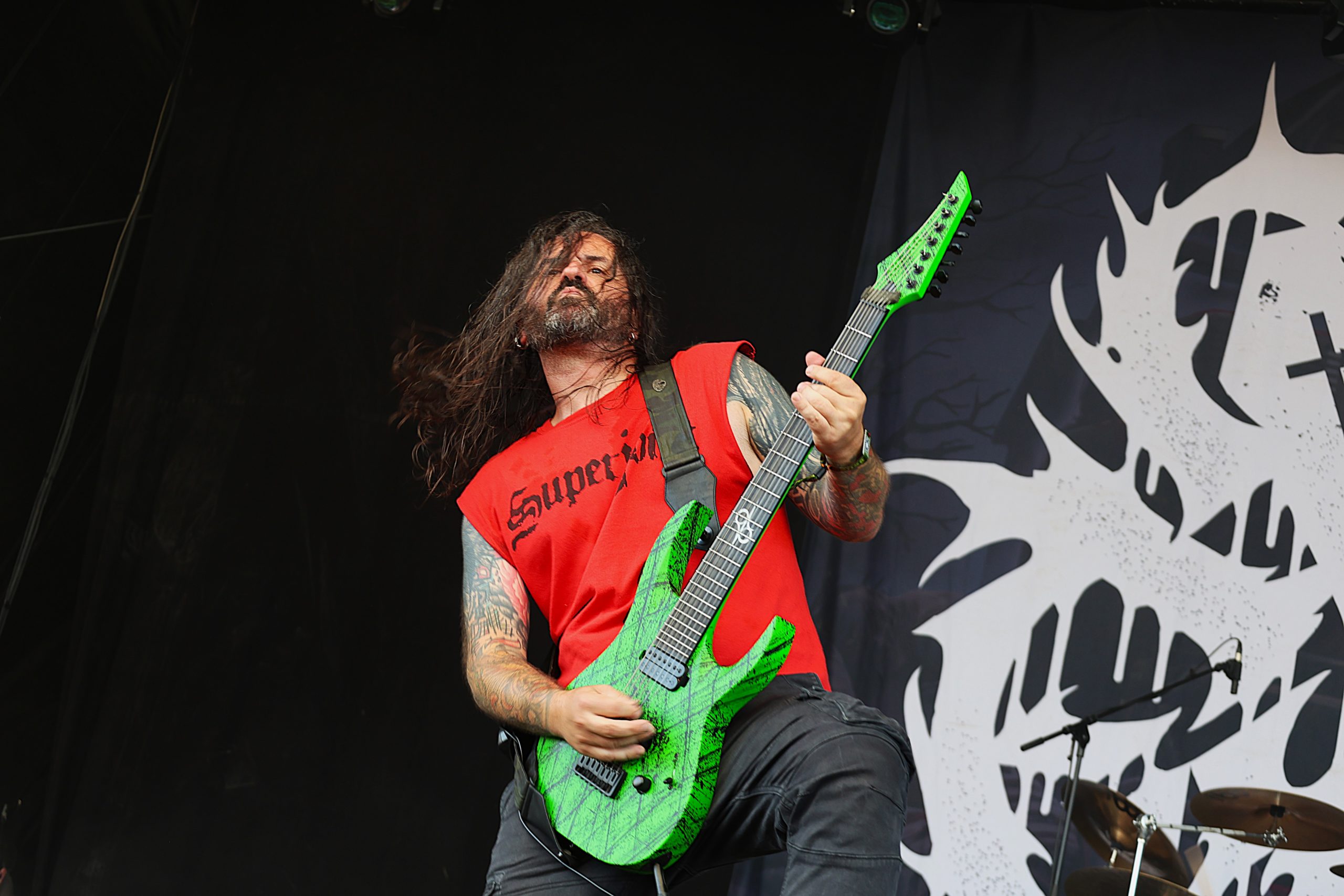 Je restai sur cette scène pour un groupe totalement différent : Suffocation. Communément qualifiés comme inventeurs du brutal/tech death et du riff de slam, les New-Yorkais ont délivré une véritable masterclass. Revigoré par la venue en 2019 d’un nouveau chanteur, Ricky Myers, mais toujours sous l’égide des membres de longue date Terrance Hobbs et Derek Boyer, le groupe se fit une deuxième jeunesse avec Hymns from the Apocrypha, le dernier album en date sorti en 2023 et dont furent joués 3 morceaux (Seraphim Enslavement, Perpetual Deception ainsi que le titre éponyme). Cependant, Suffocation proposa un set assez old-school, avec des classiques comme Pierced from Within, Effigy of the Forgotten et le légendaire Infecting the Crypts. Ricky Myers présenta ainsi une des chansons : « Ok ce prochain morceau parle de trouver l’amour et de vivre heureux pour le reste de votre vie. Mais non je déconne, on s’en fout. Ce morceau parle de tuer des gens et il s’appelle Thrones of Blood« . J’avoue avoir beaucoup ri. Mais trêve de plaisanteries, Suffocation est un groupe très précis en live, je fus grandement impressionné par le jeu de Terrance Hobbs et ses solos de shredder. Très heureux d’avoir pu voir un tel groupe de légende !