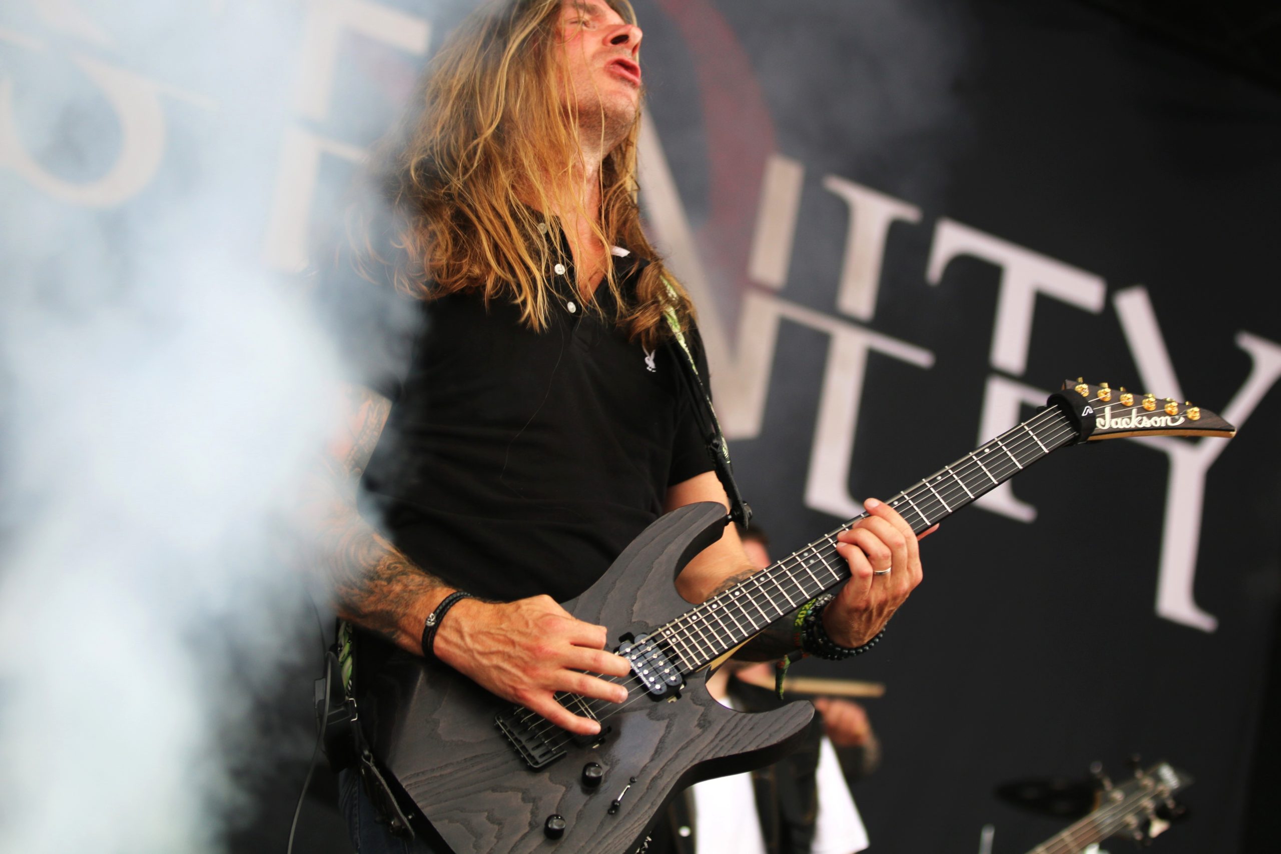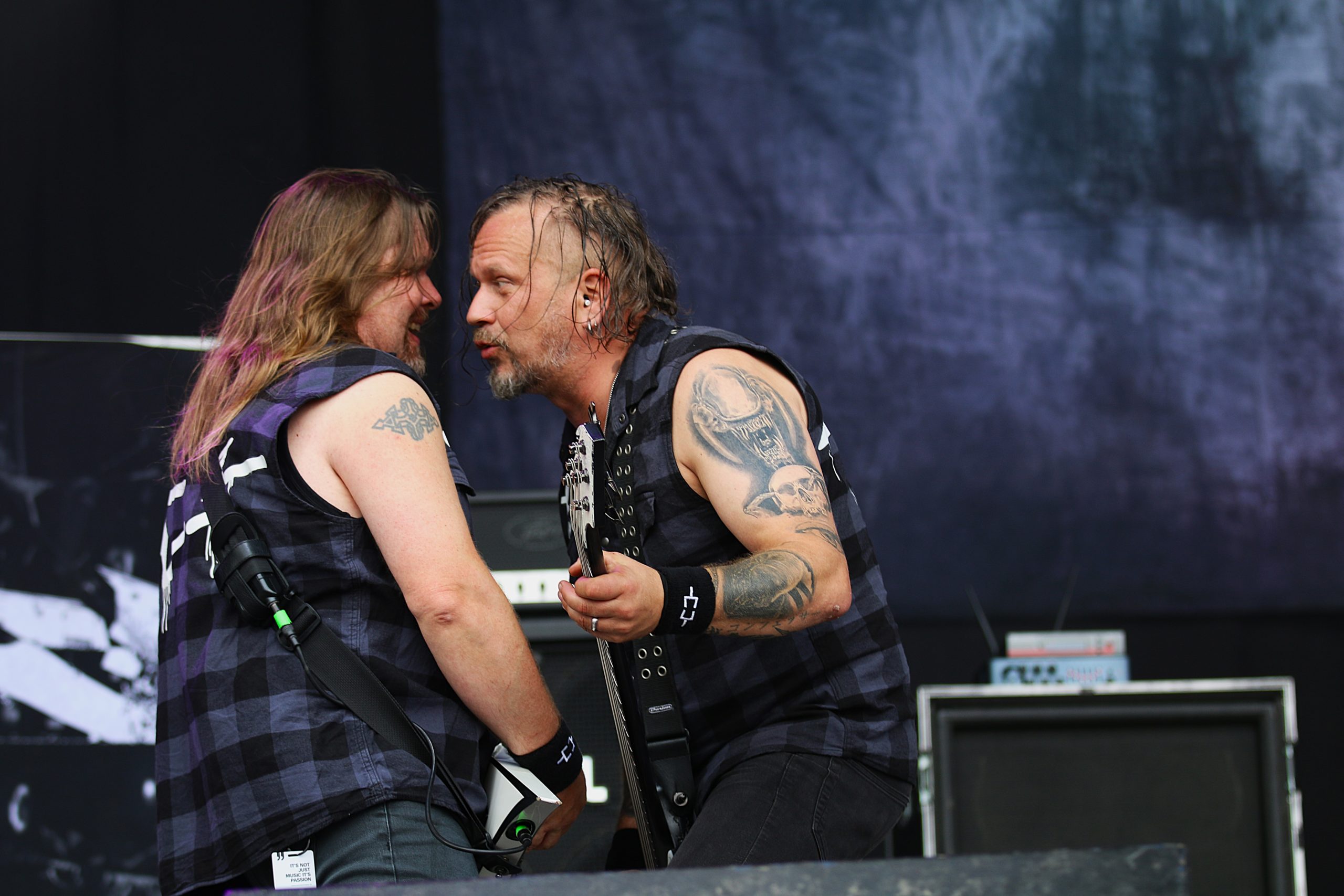 Je me rendis ensuite à la T-Stage pour voir la deuxième moitié du concert d’Omnium Gatherum, vétérans du melodeath finlandais. Leur musique, combinée aux synthétiseurs ainsi qu’à l’humeur en live du chanteur Jukka Pelkonen, sonne presque joyeuse, surtout avec des morceaux comme The Last Hero et My Pain (qu’ils jouèrent pour la première fois), tous 2 issus de leur nouvel album qui sort en novembre de cette année. Le set remonta le temps jusqu’en 2011 avec Soul Journeys de l’opus New World Shadows. Même si je ne connaissais pas très bien la discographie d’Omnium Gatherum, j’ai beaucoup apprécié l’énergie que le groupe délivrait sur scène, ça changeait des groupes statiques dont on a l’habitude.